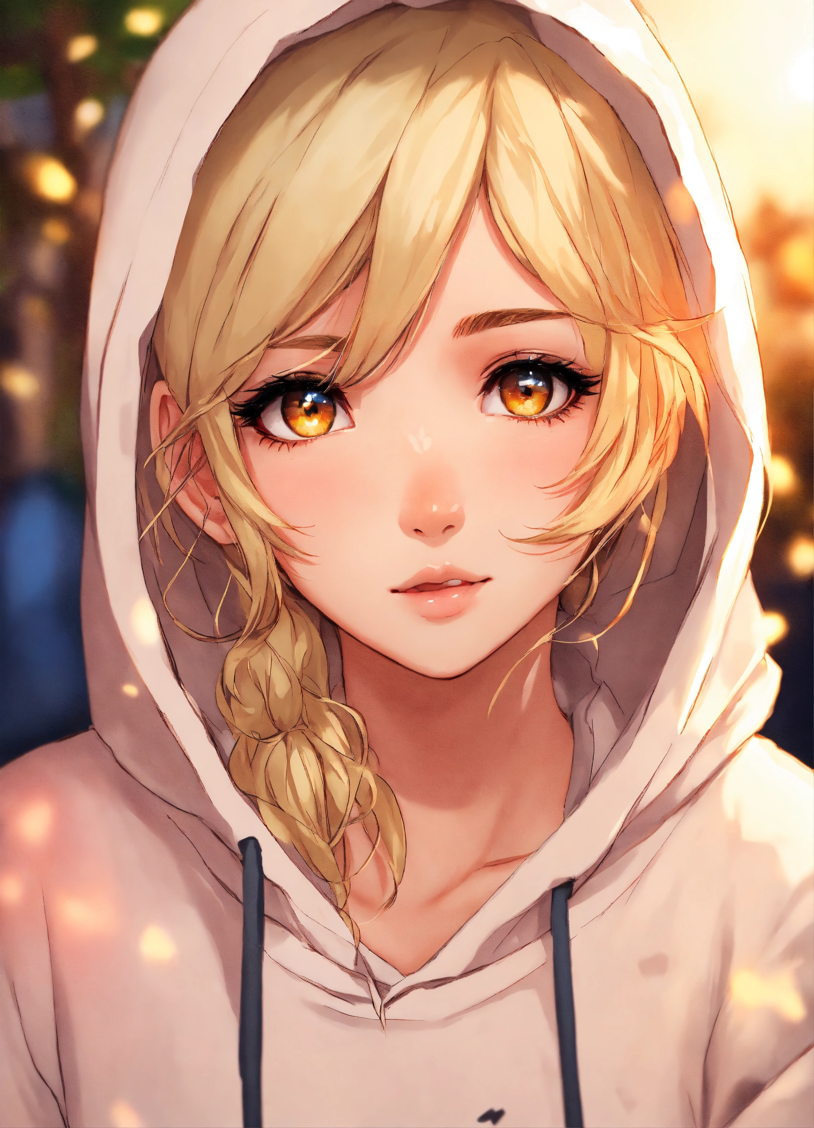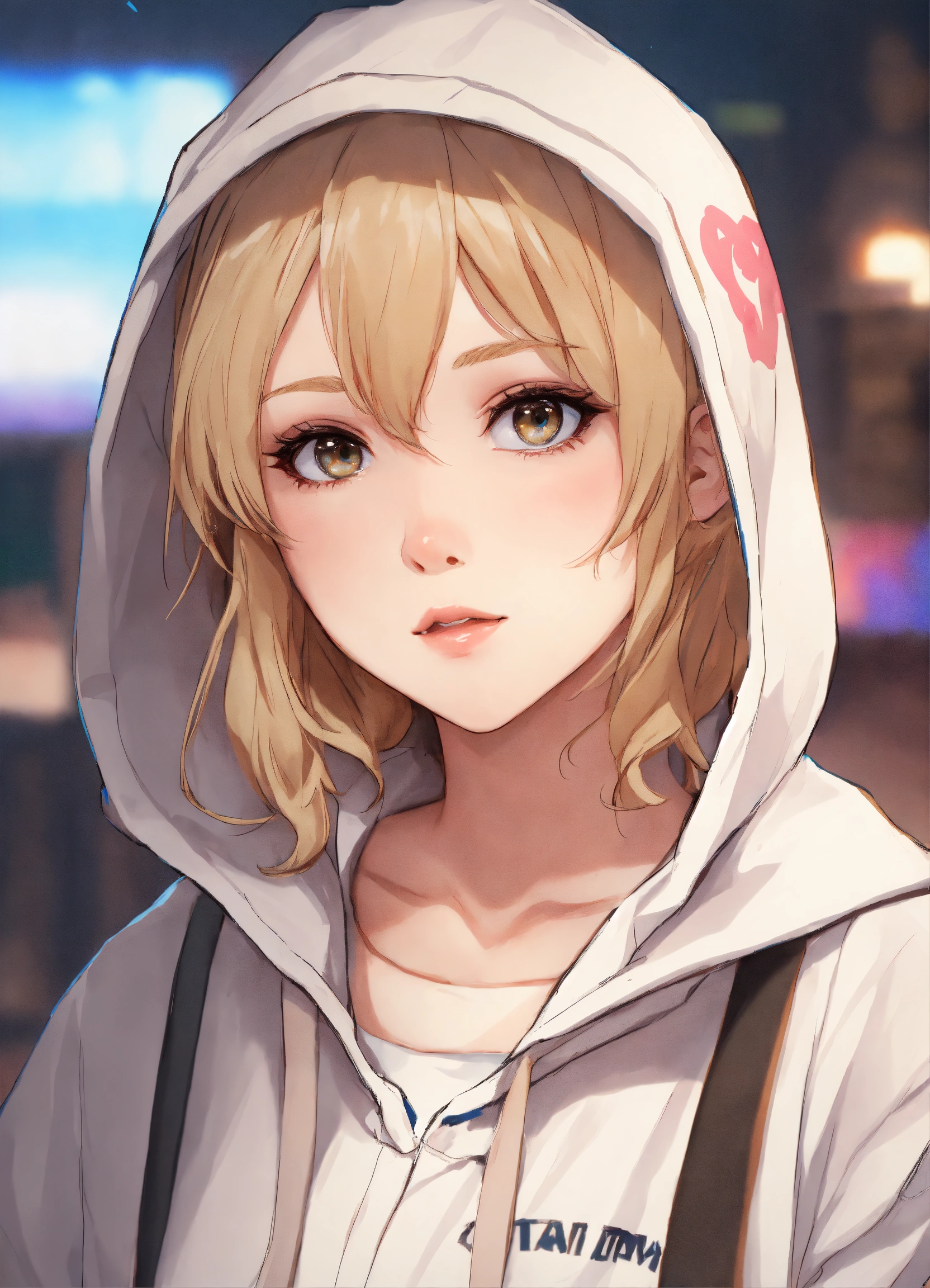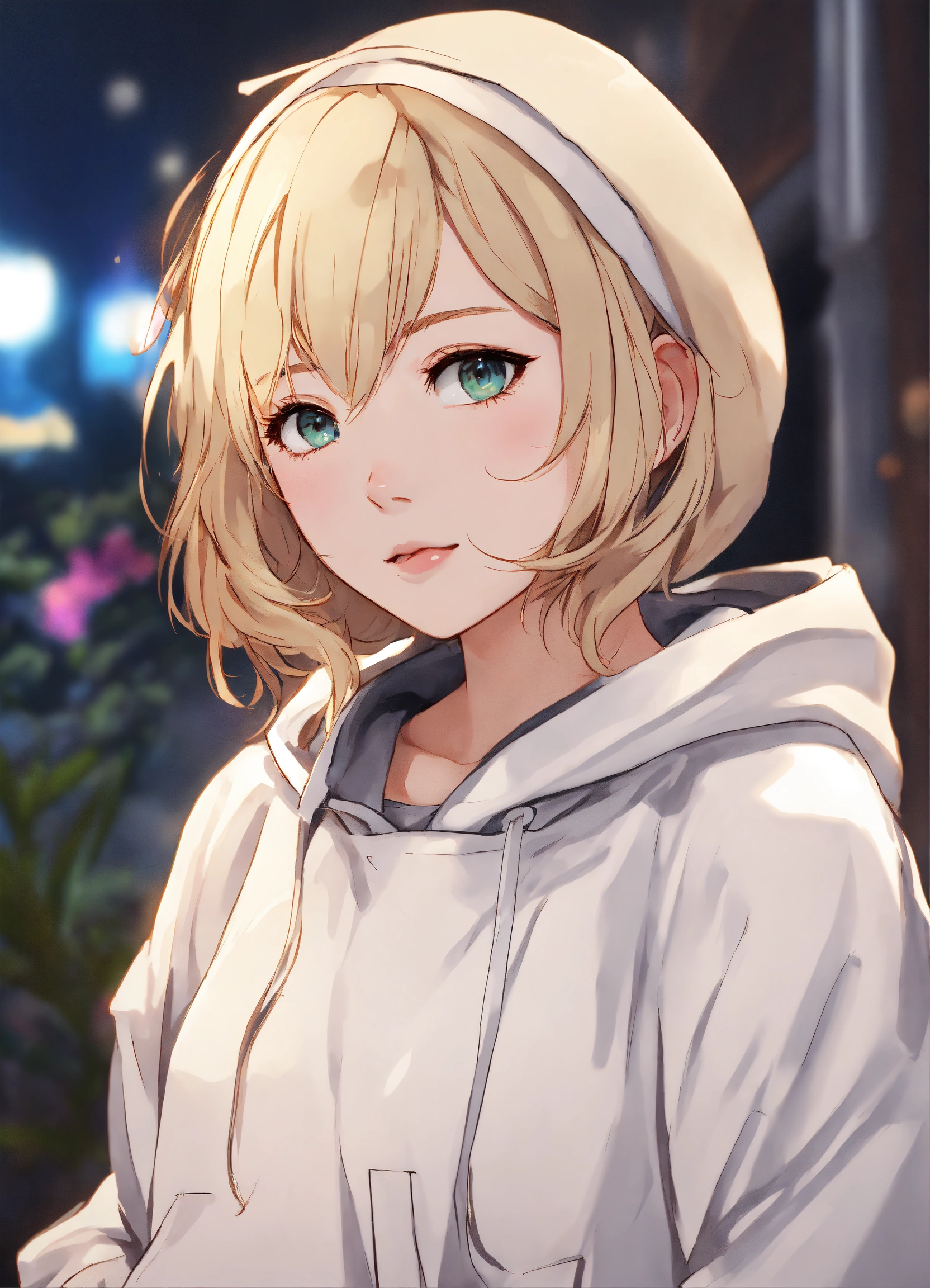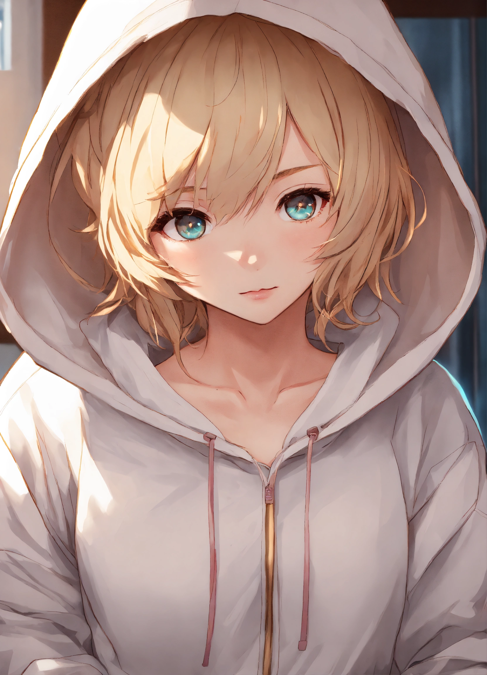 Short white female, short dirty blonde hair, beautiful eyes, rosy cheeks, thick eyeliner, white hoodie, pj pants, anime