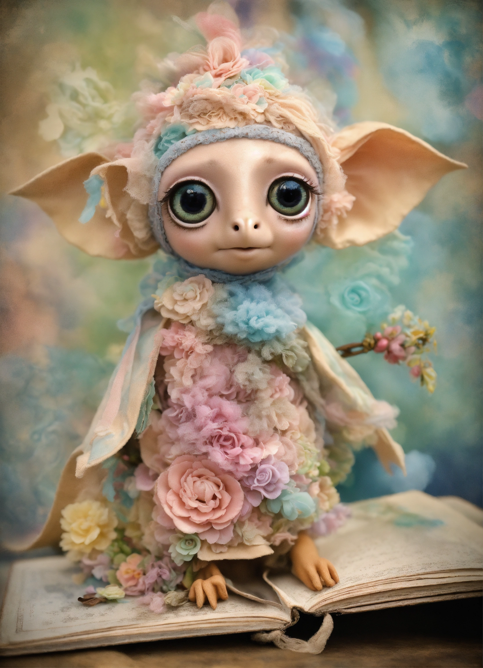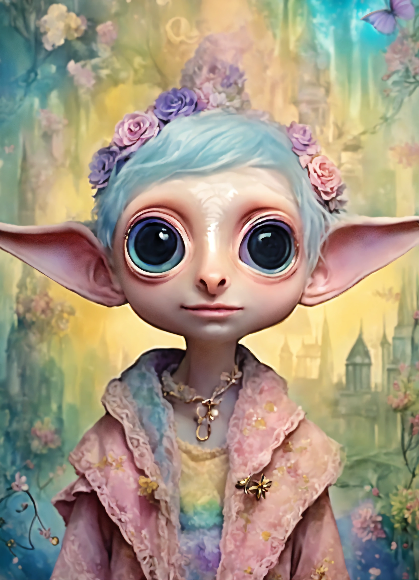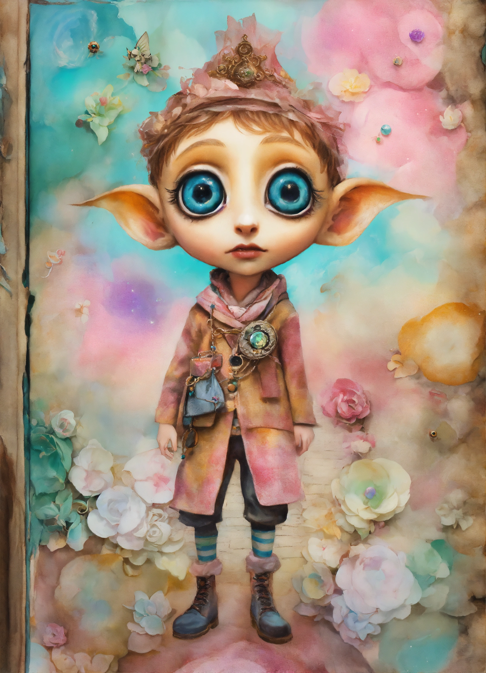 Shabby chic dreamy mist pastel junk journals whimsical cute quirky harry potter style "husalf dobby" with big eyes in odd clothings, tamara laporte style, swirling magical fairytale abstract art style