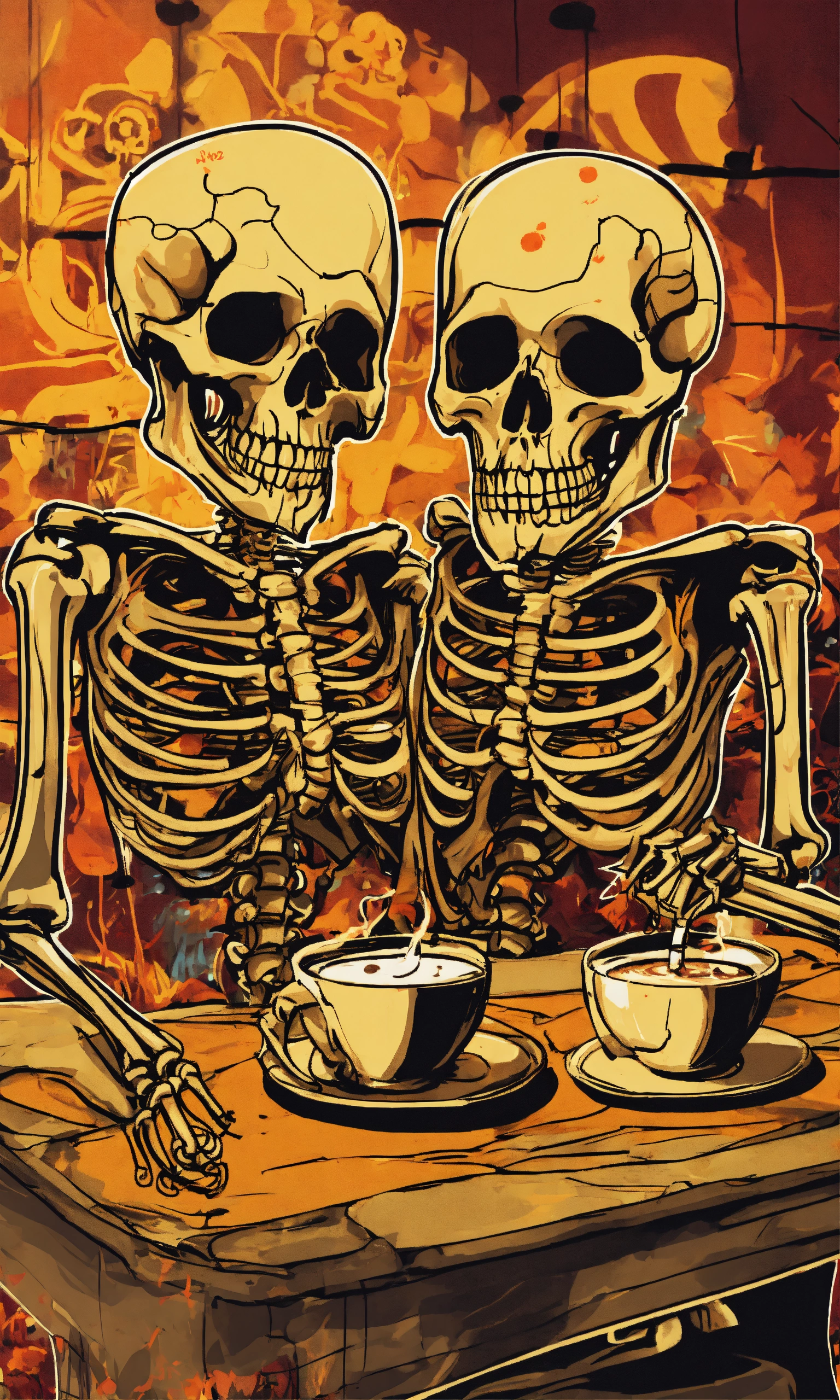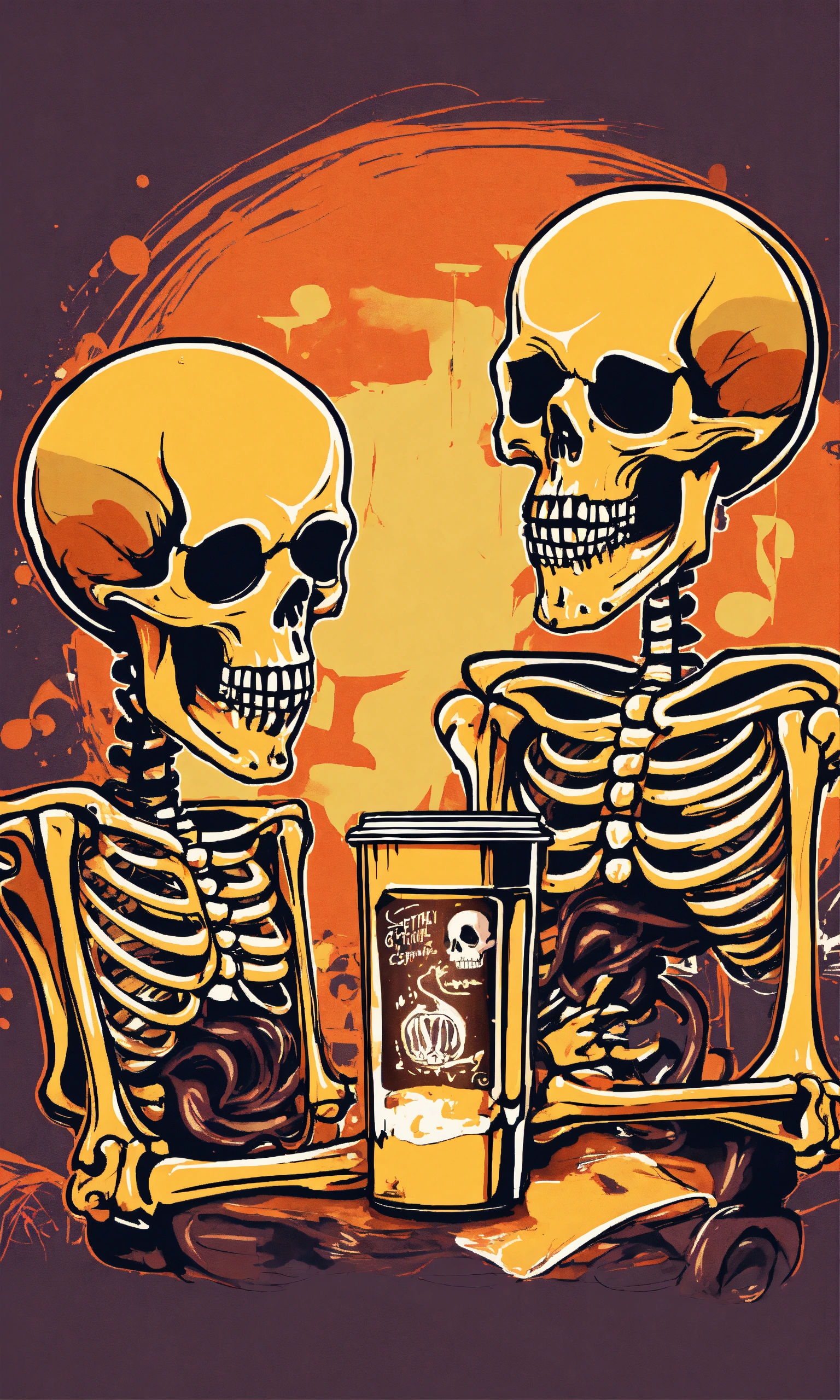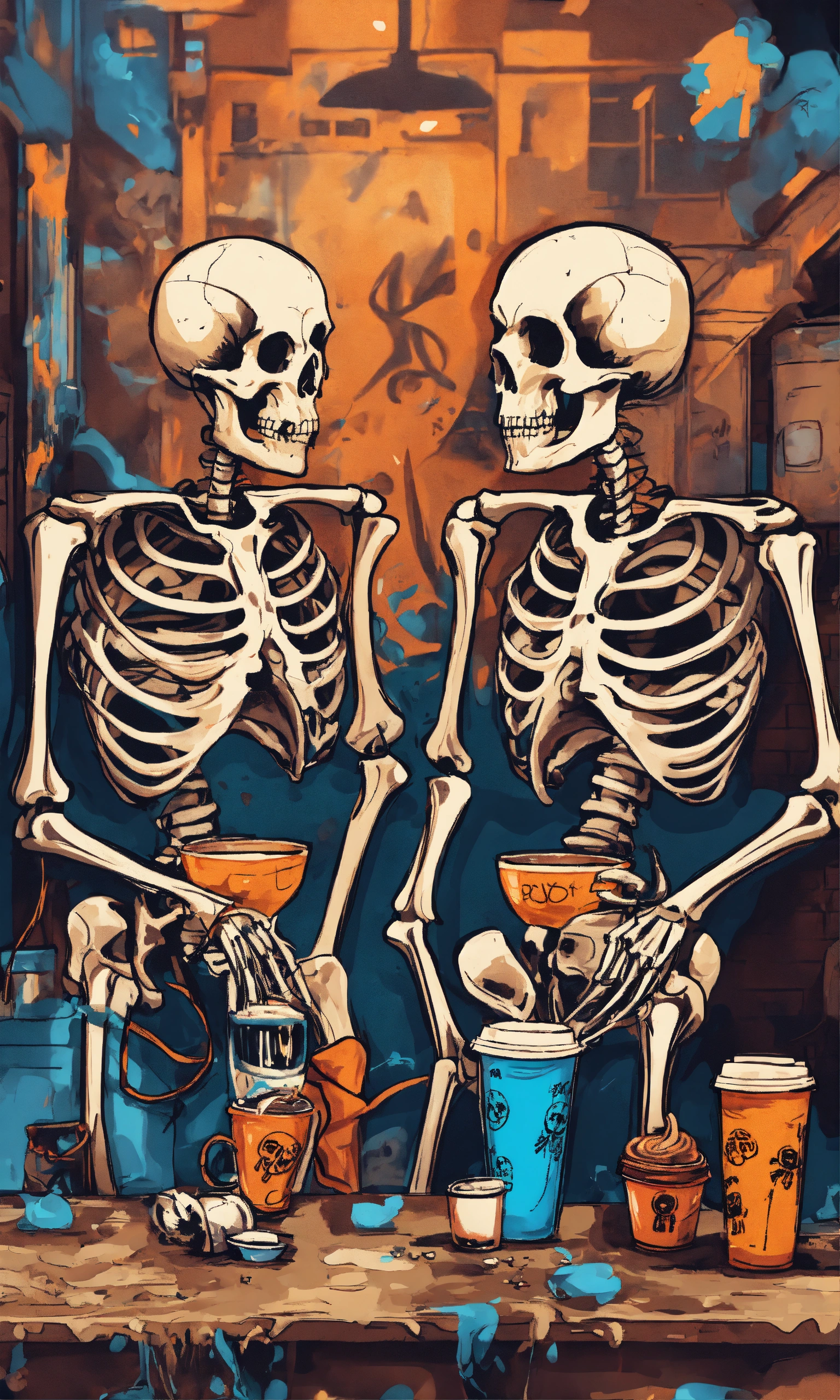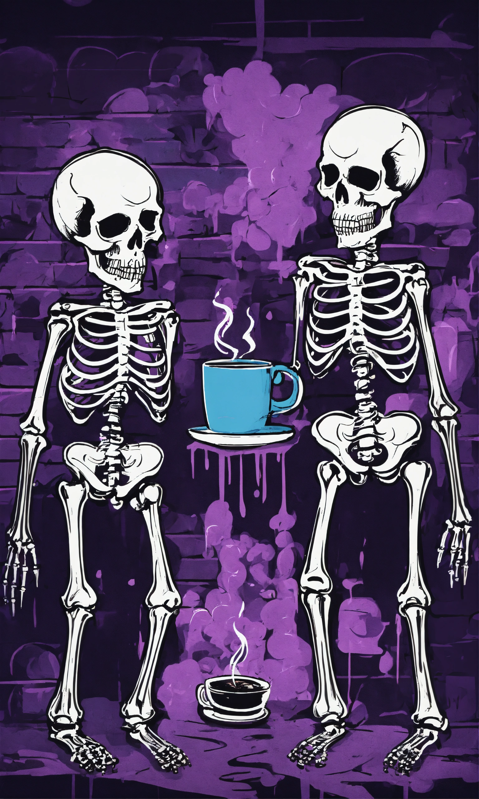 Graffiti template of two skeletons addicted to caffeine