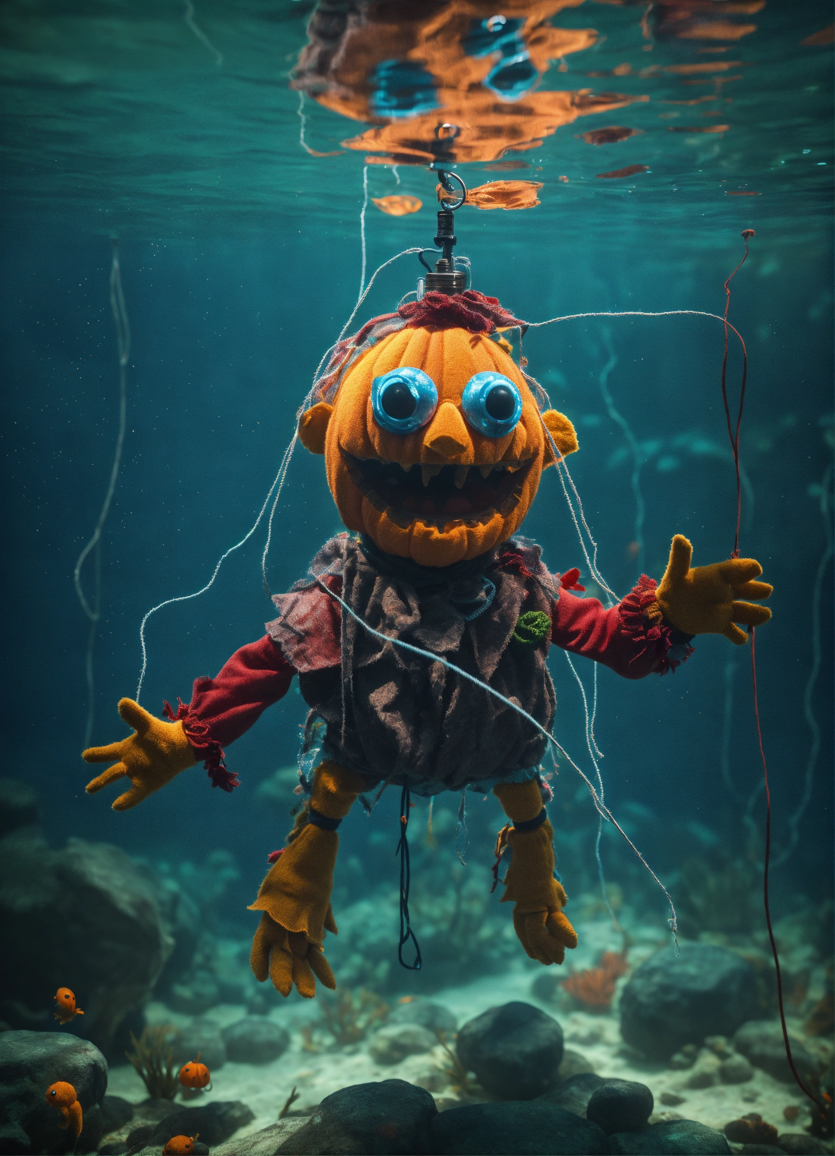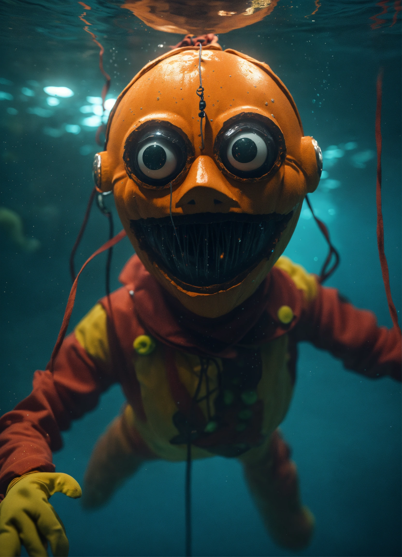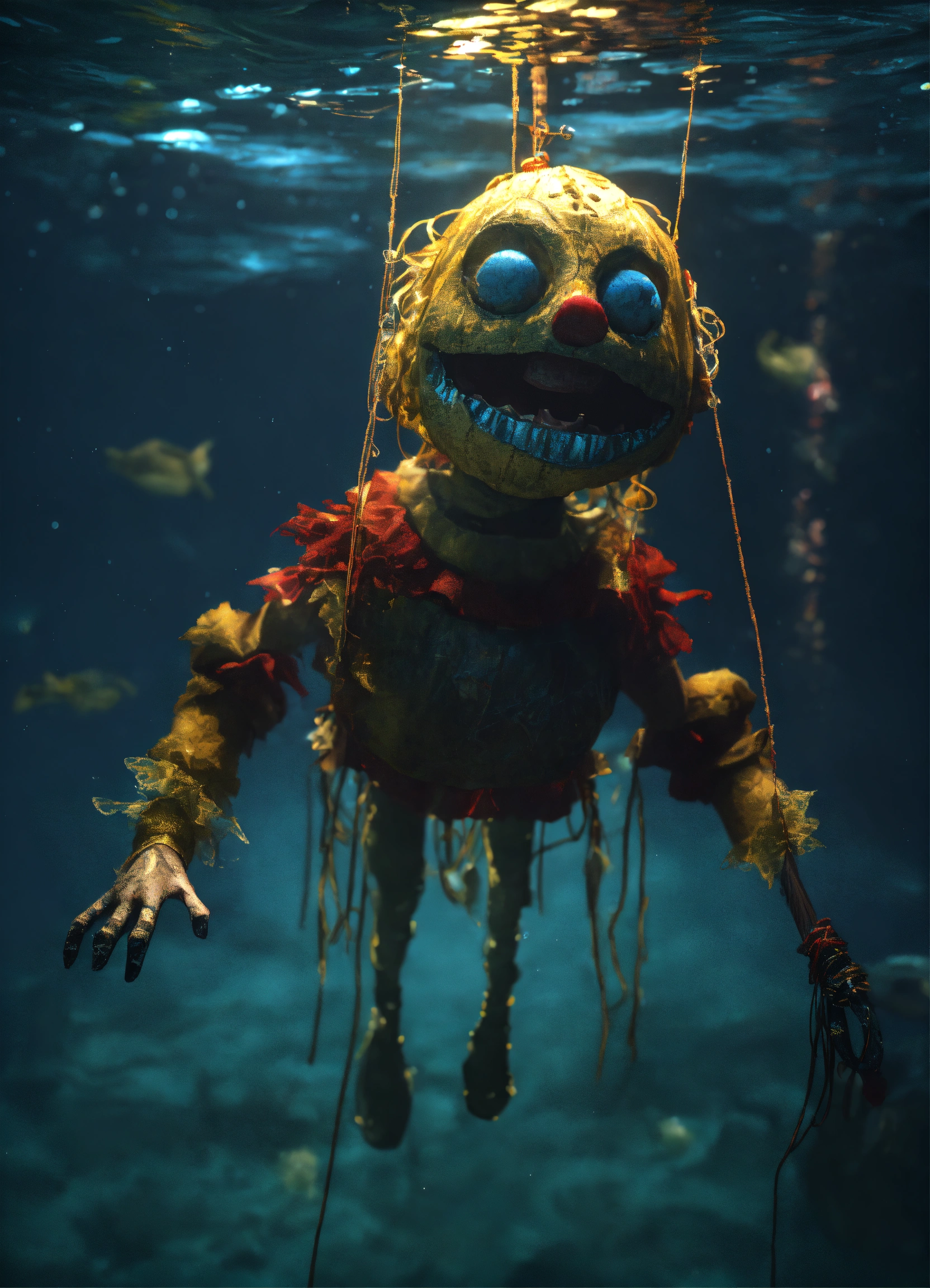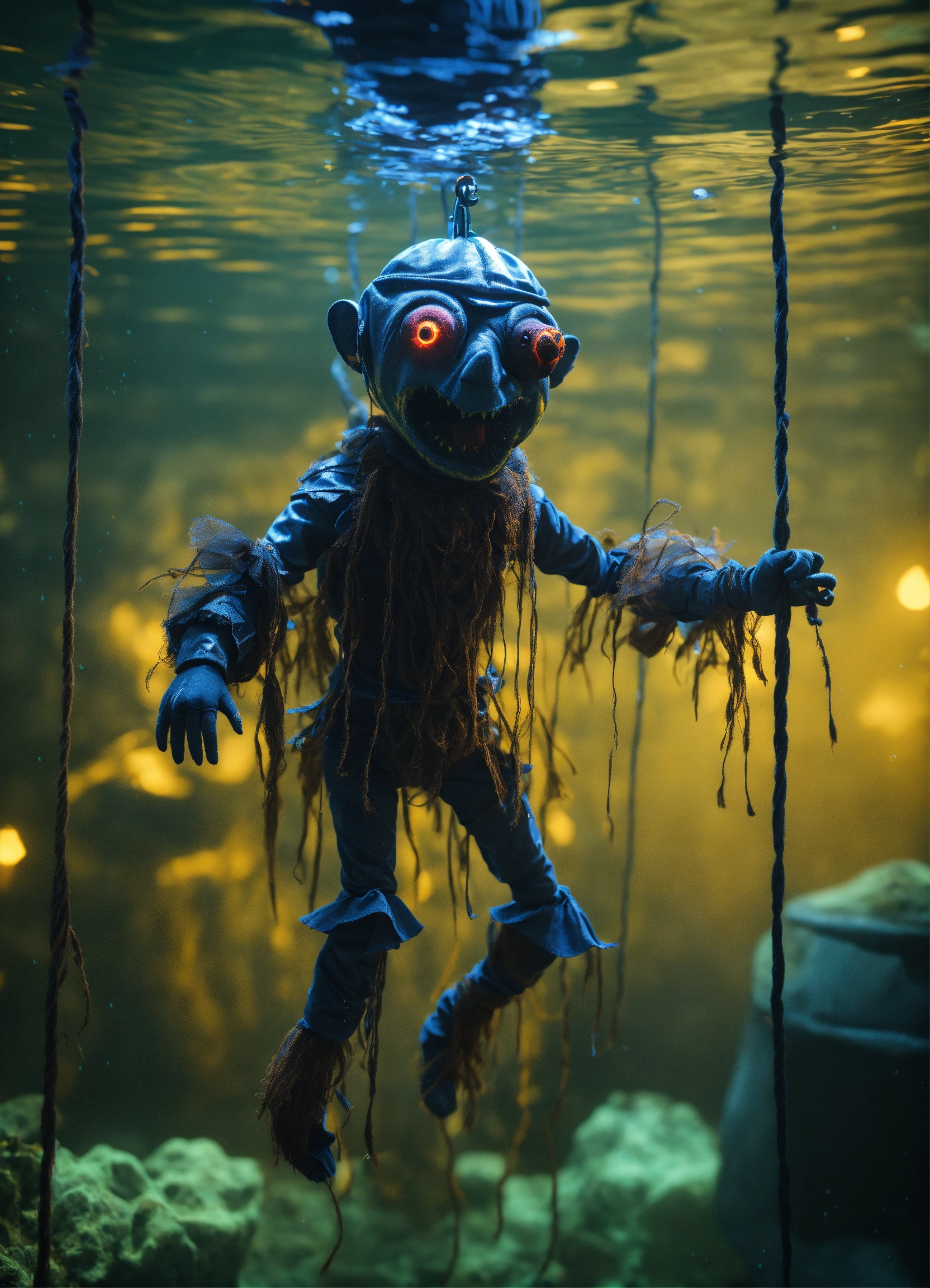 Scary puppet on a string under water, halloween, unreal engine render, 8k, extremely detailed, realistic photo, 4k realistic photo.
