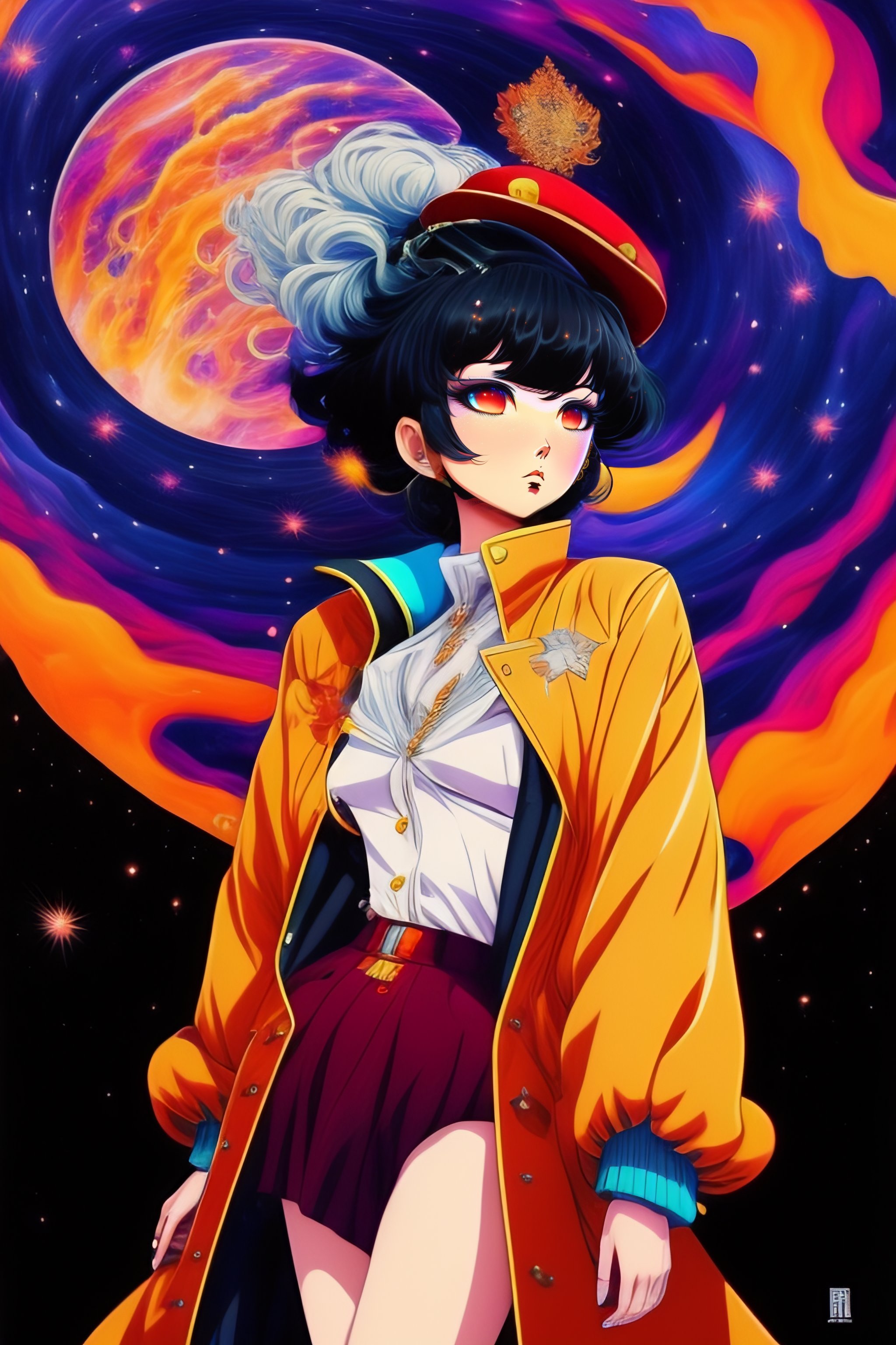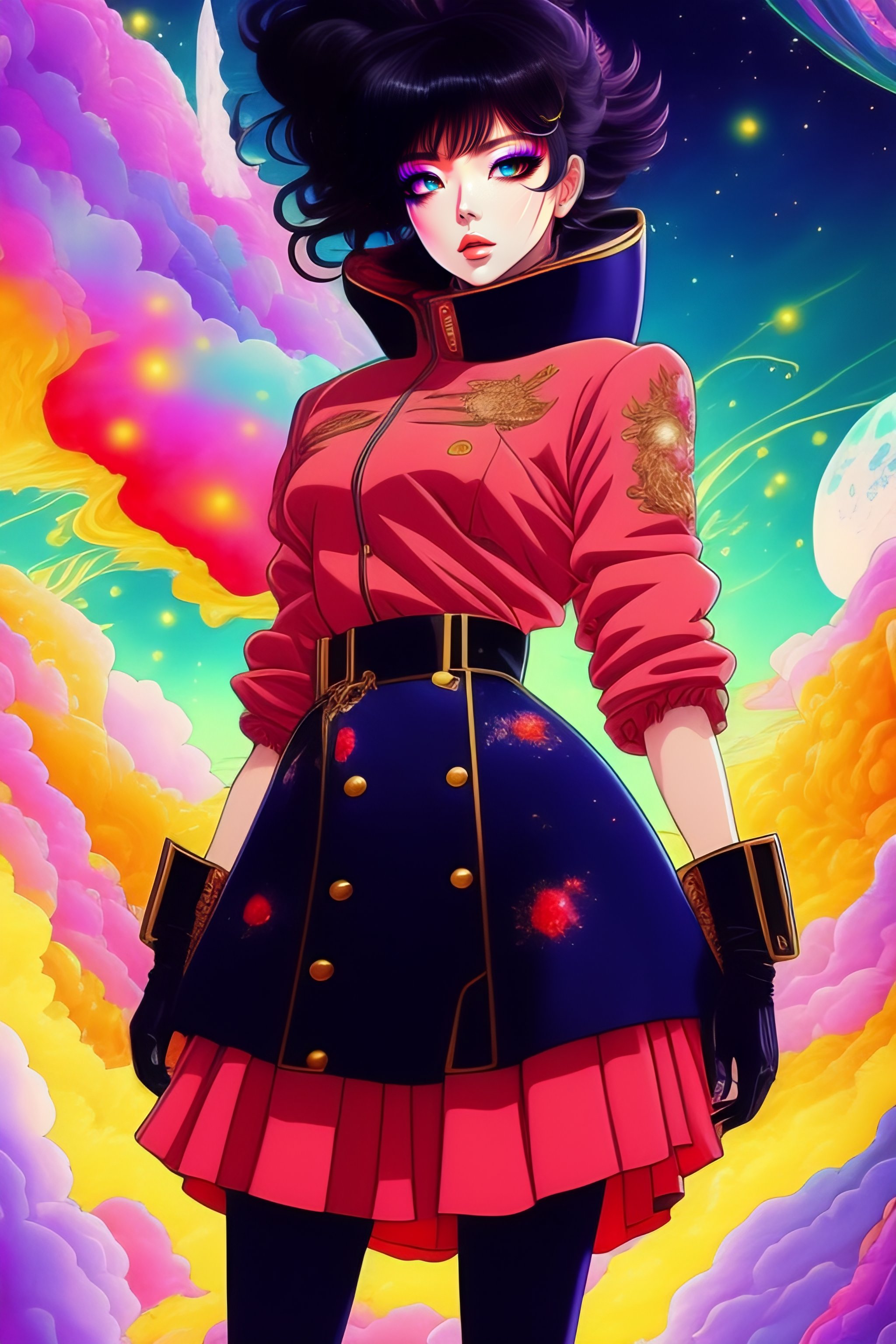 Stylish haute couture outfit in the style of 90's vintage anime, surrealism, akira style. detailed line art. fine details. inside an exploding nebula
