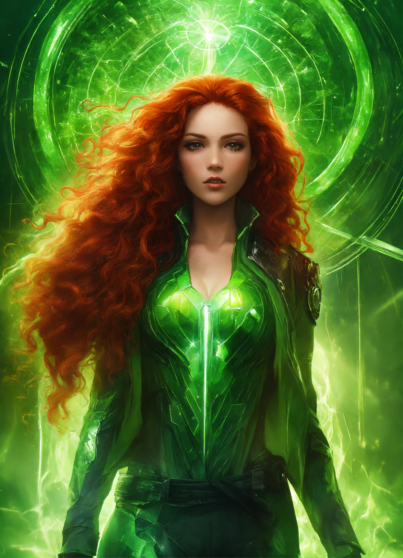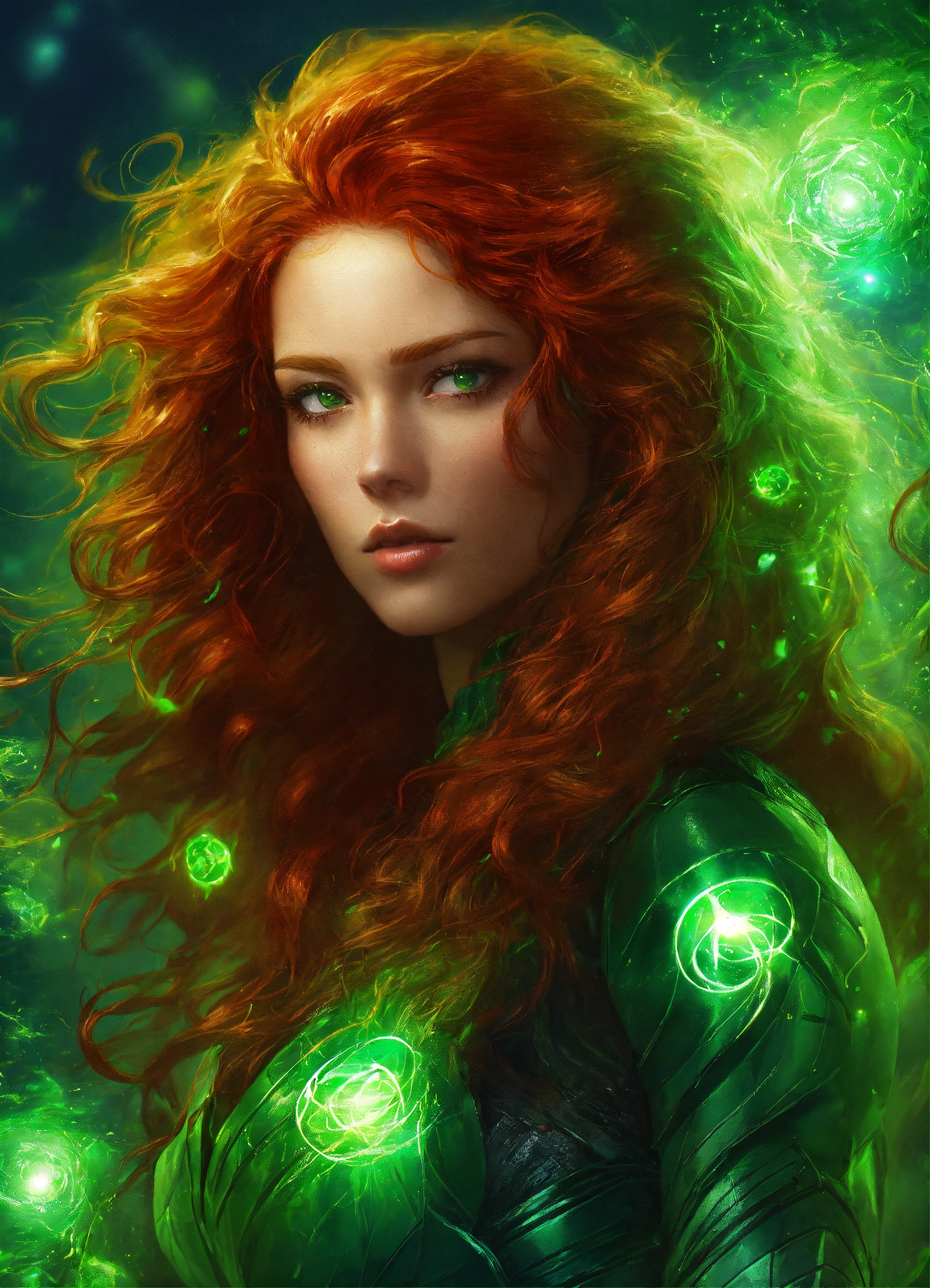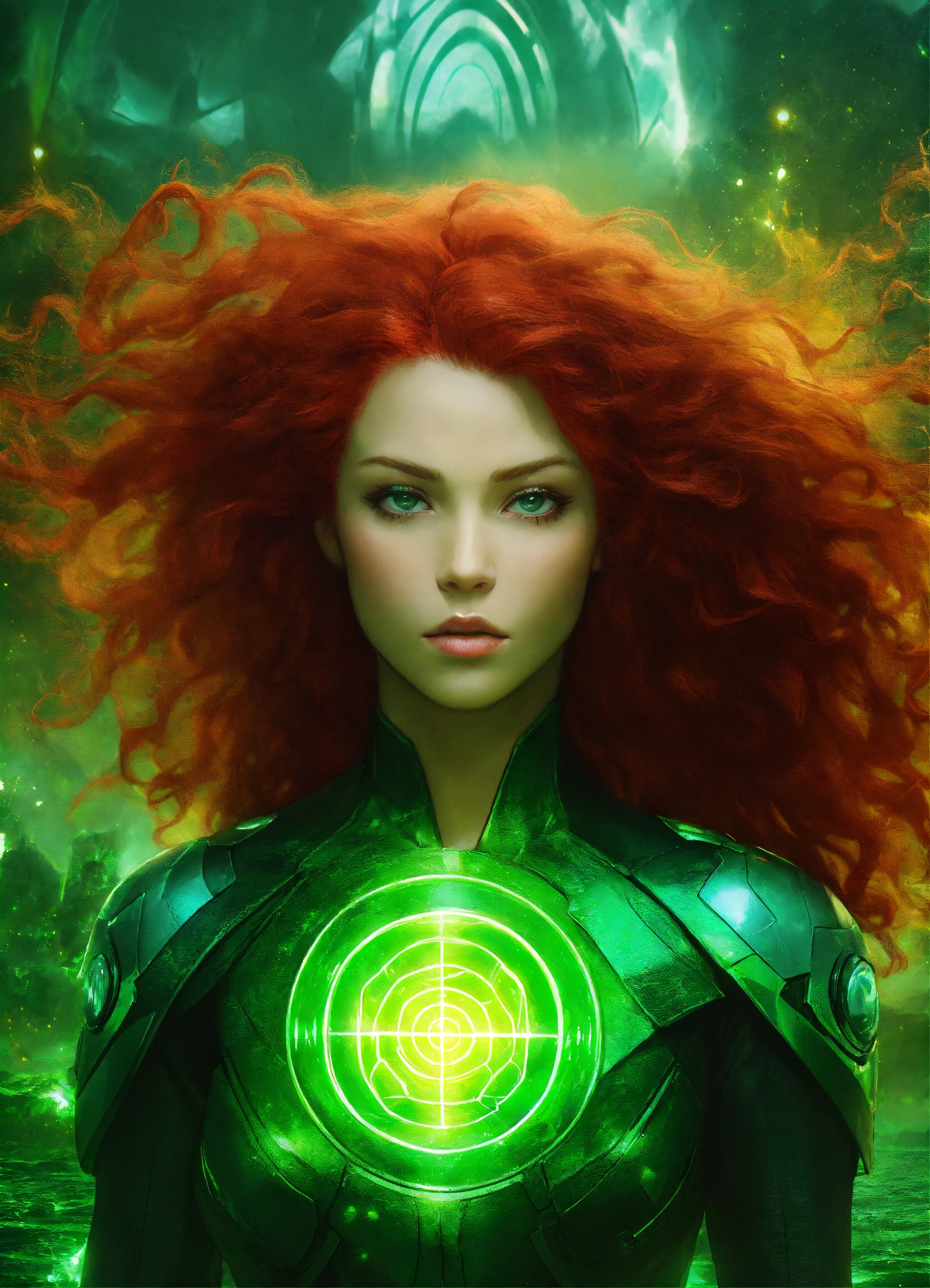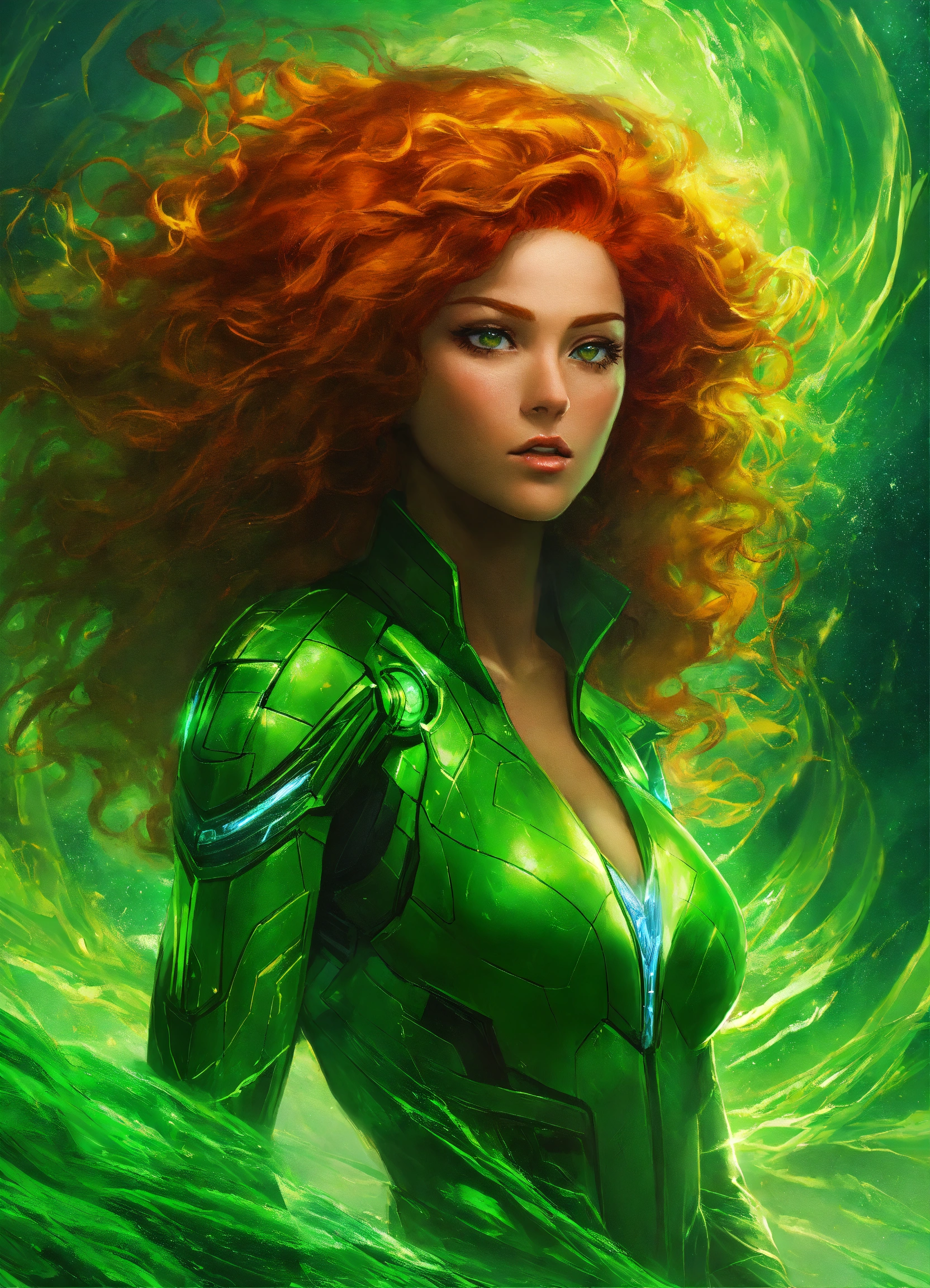 "starfire covered in green energy", psionic energy, waves, dramatic, head and shoulders portrait, massive curly red hair