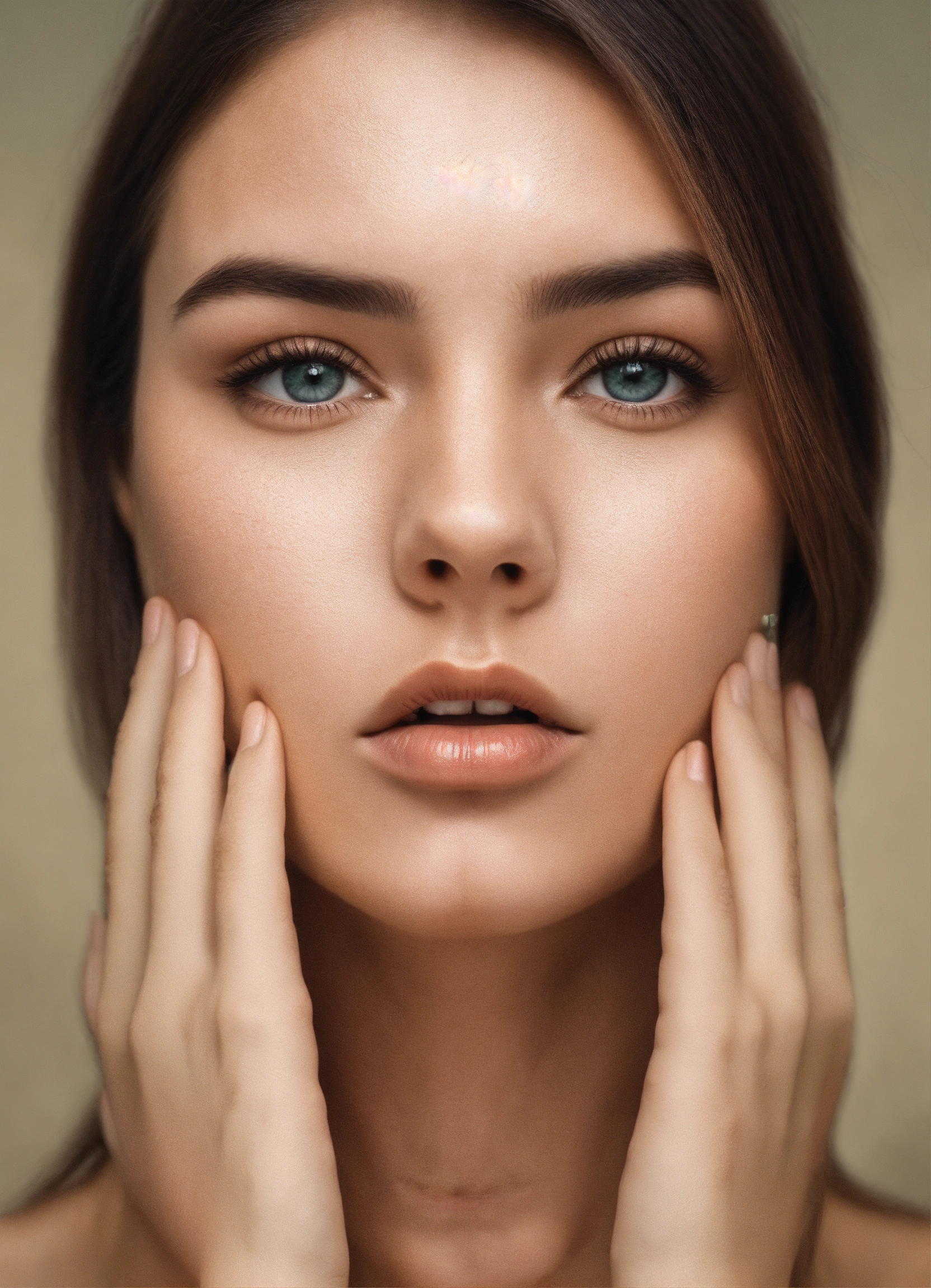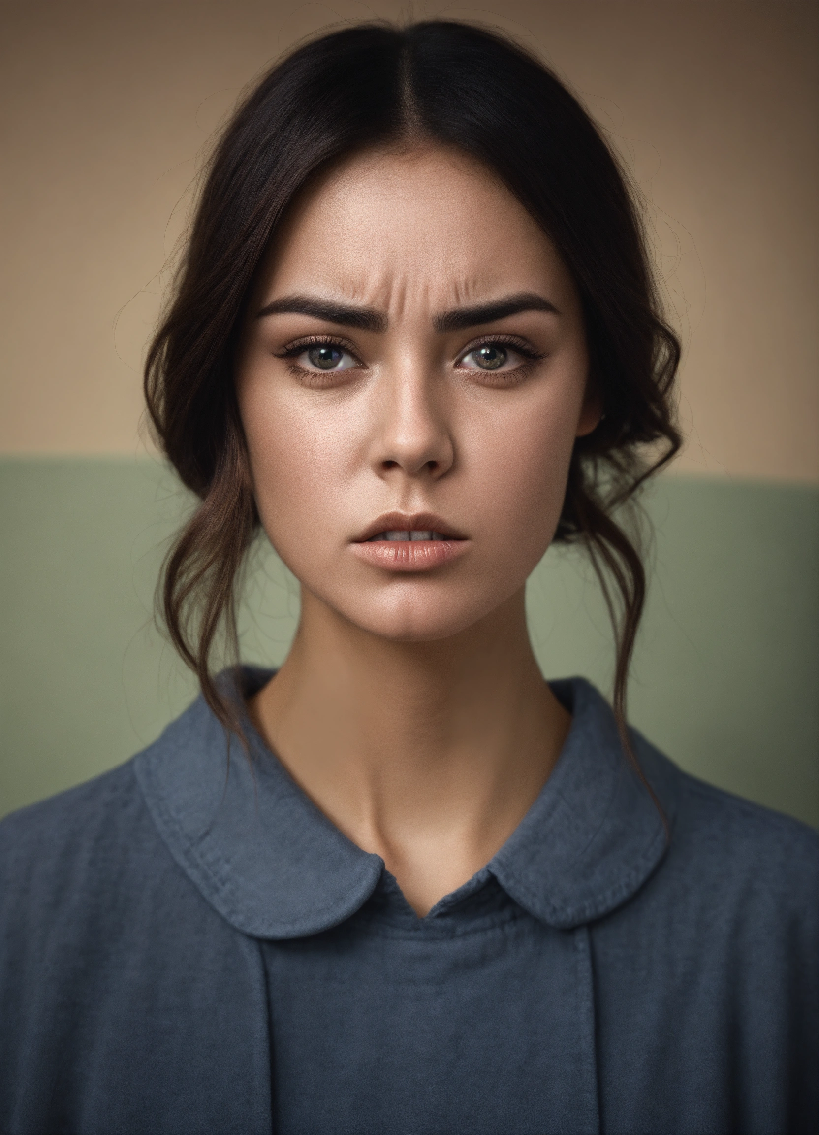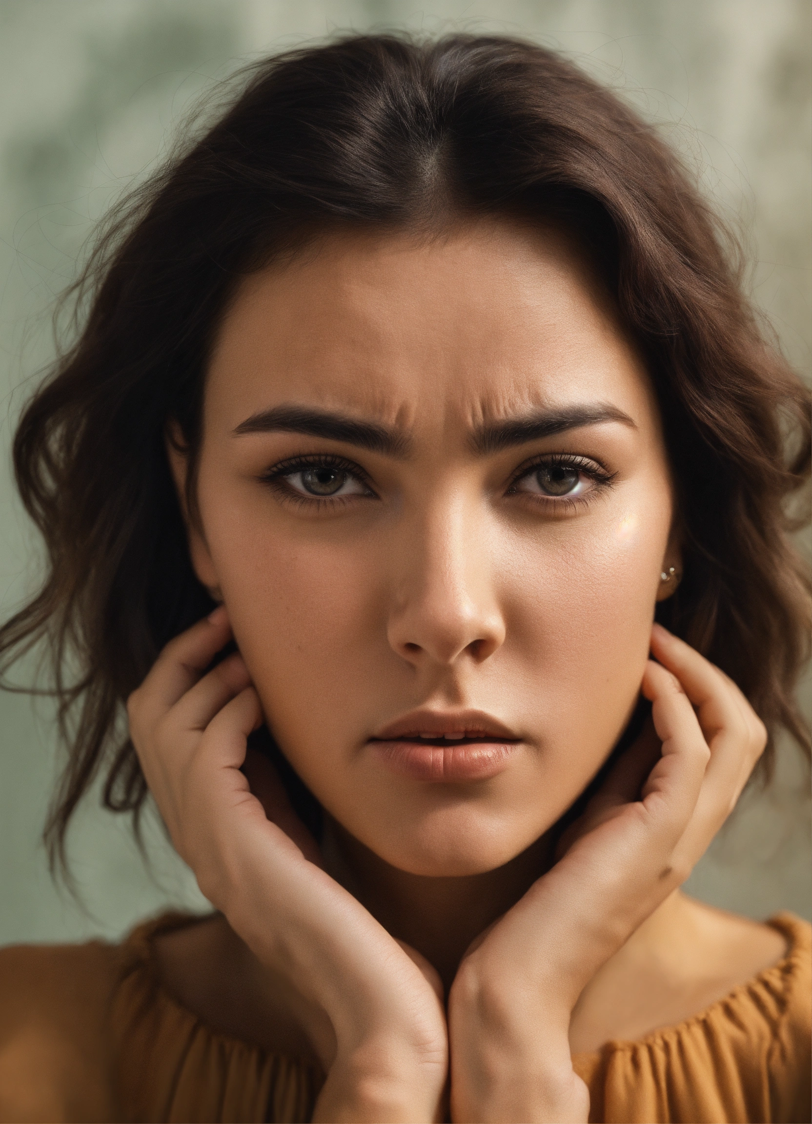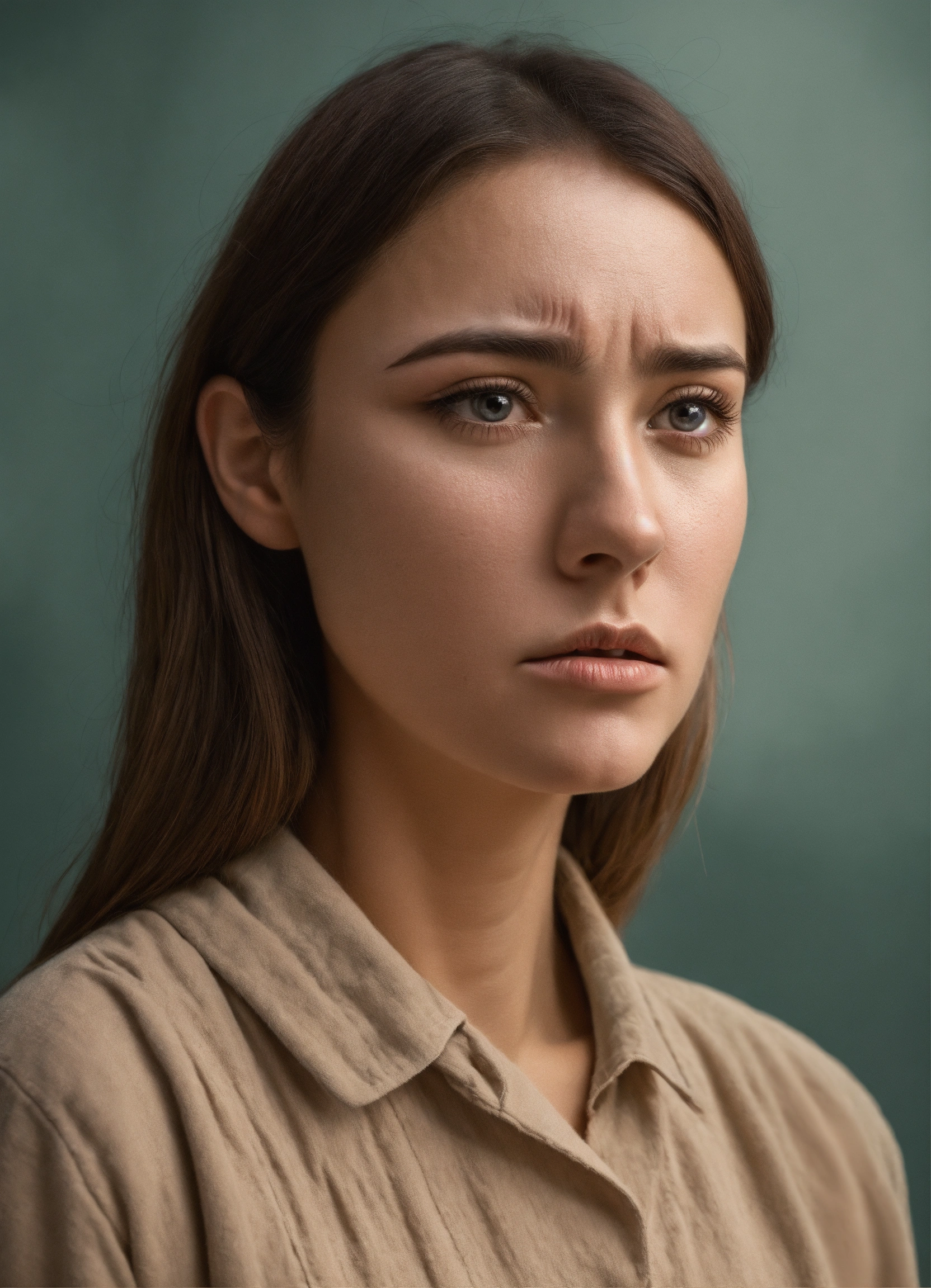 Front on woman face front on symmetrical confused expression frown hand touching face photo realistic