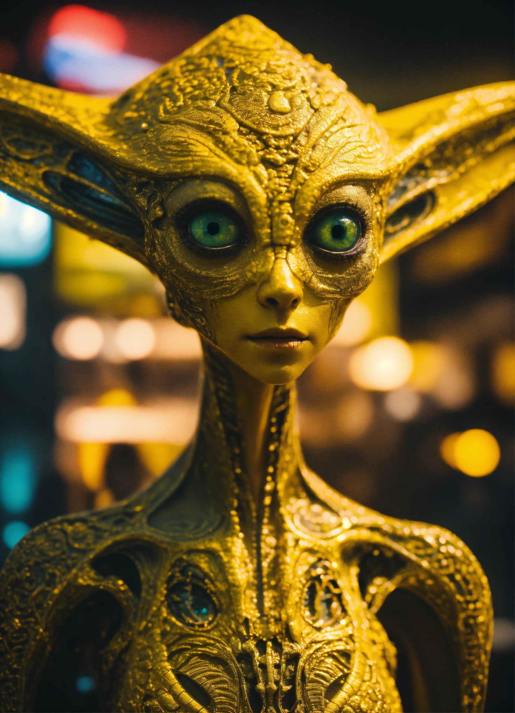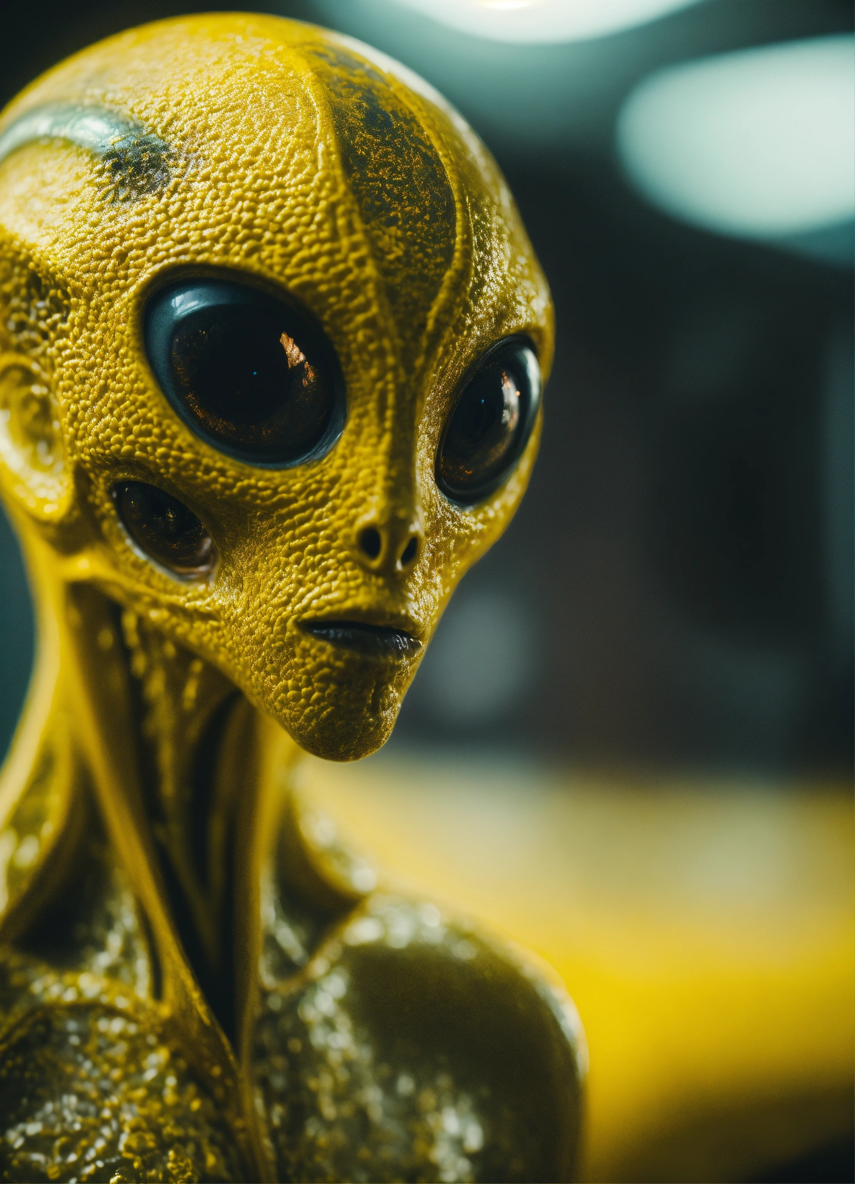 Wise realistic alien, yellow skin, big eyes, intricate, sharp focus, fantasy, cinematic lighting, otherworldly, surreal 8k photo, grunge aesthetic