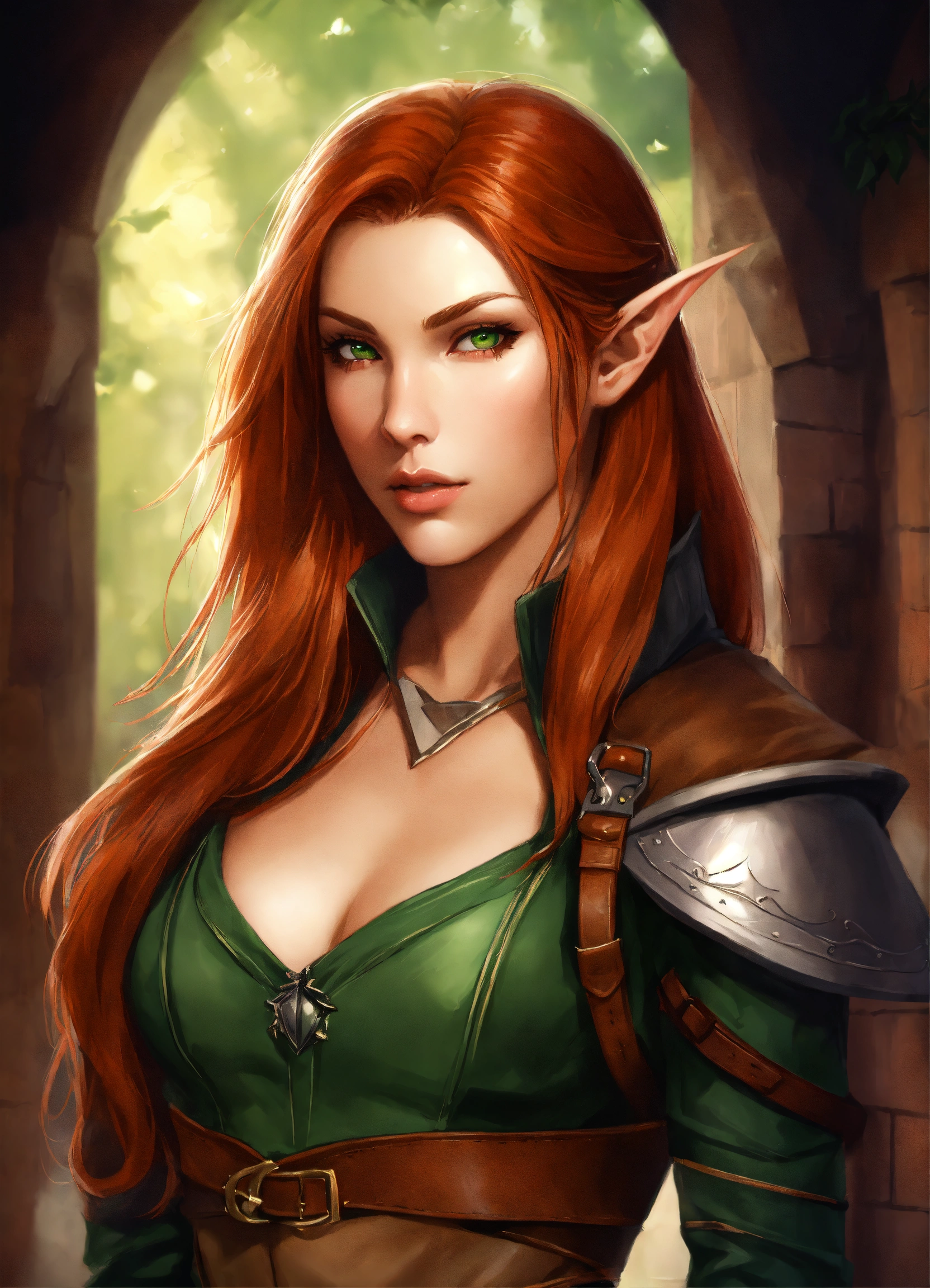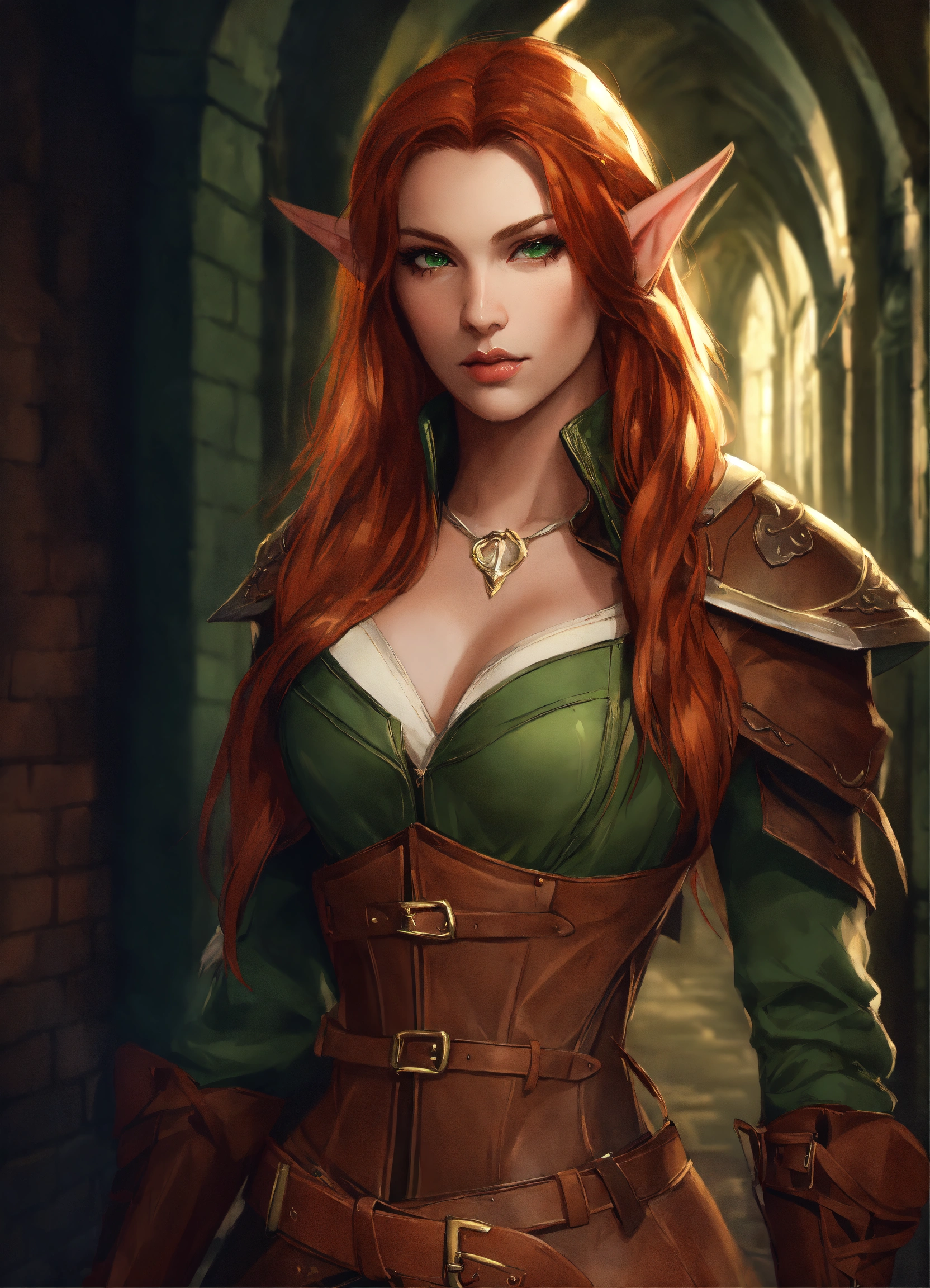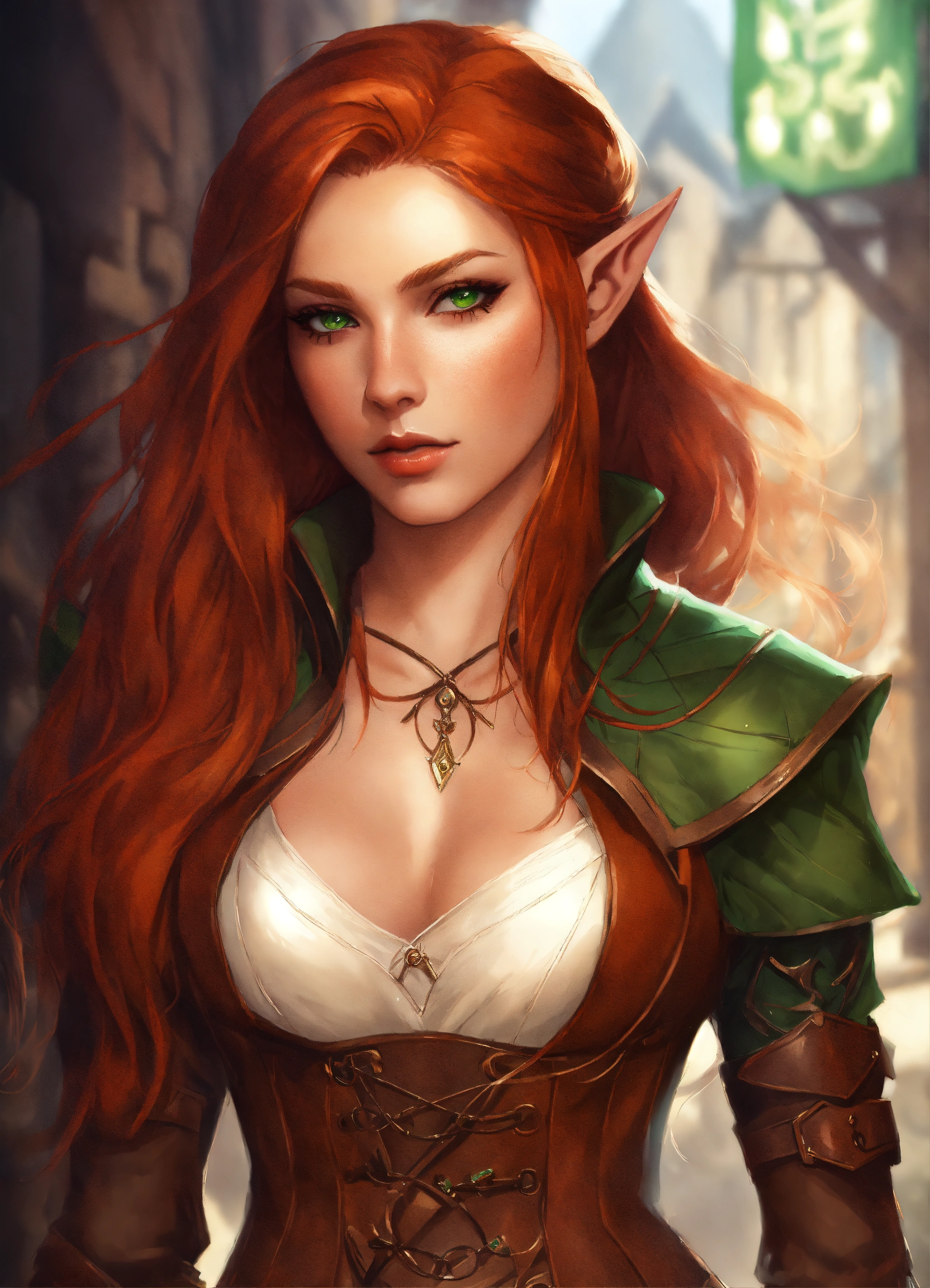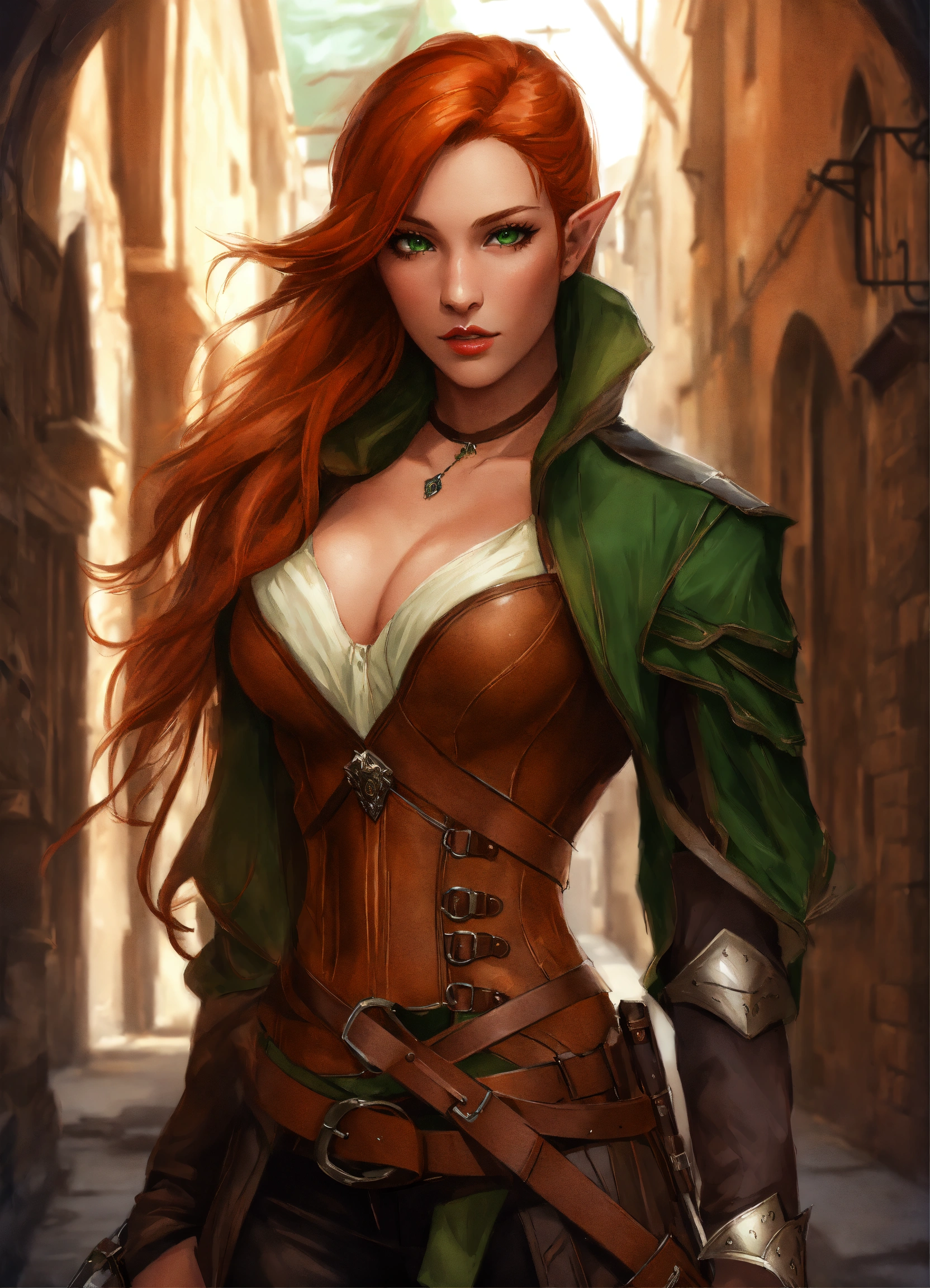 Portrait of a beautiful red haired elf rogue, long hair, concept art, in an alley, symmetrical face, attractive elf, soft green eyes, digital art, wearing brown leather corset, assassin, medieval fantasy, art by artgerm, brown leathers, long elf ears, no shoulder guards, thief, exquisite detail