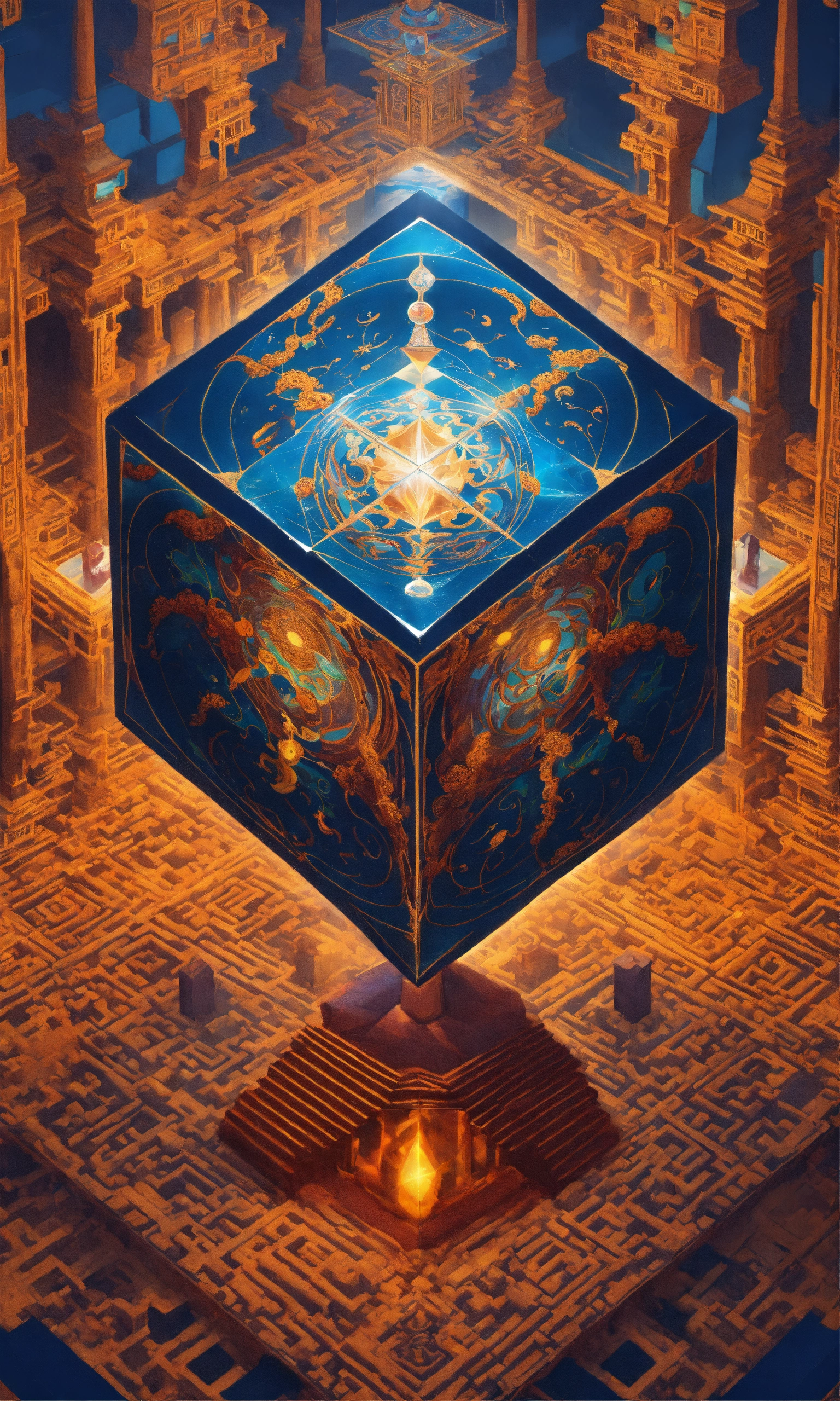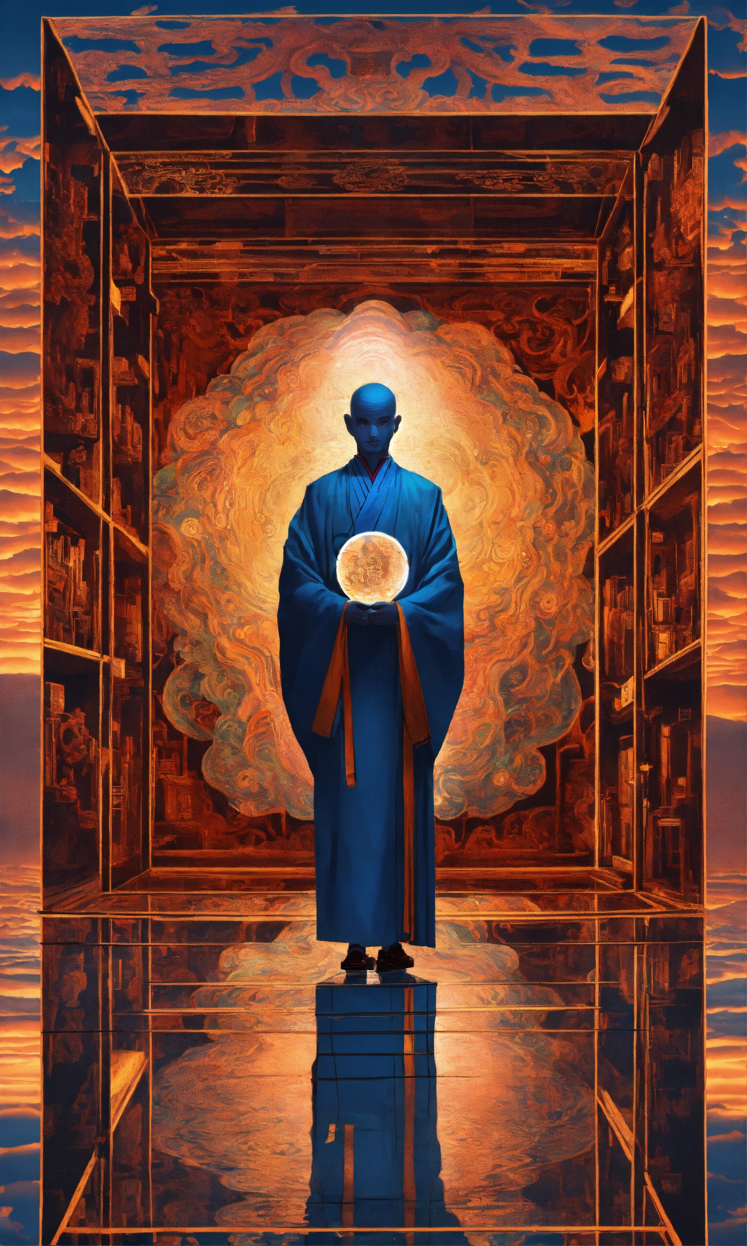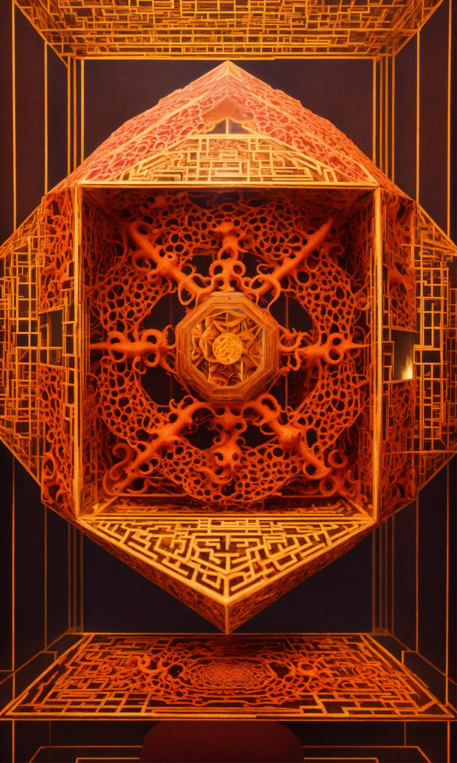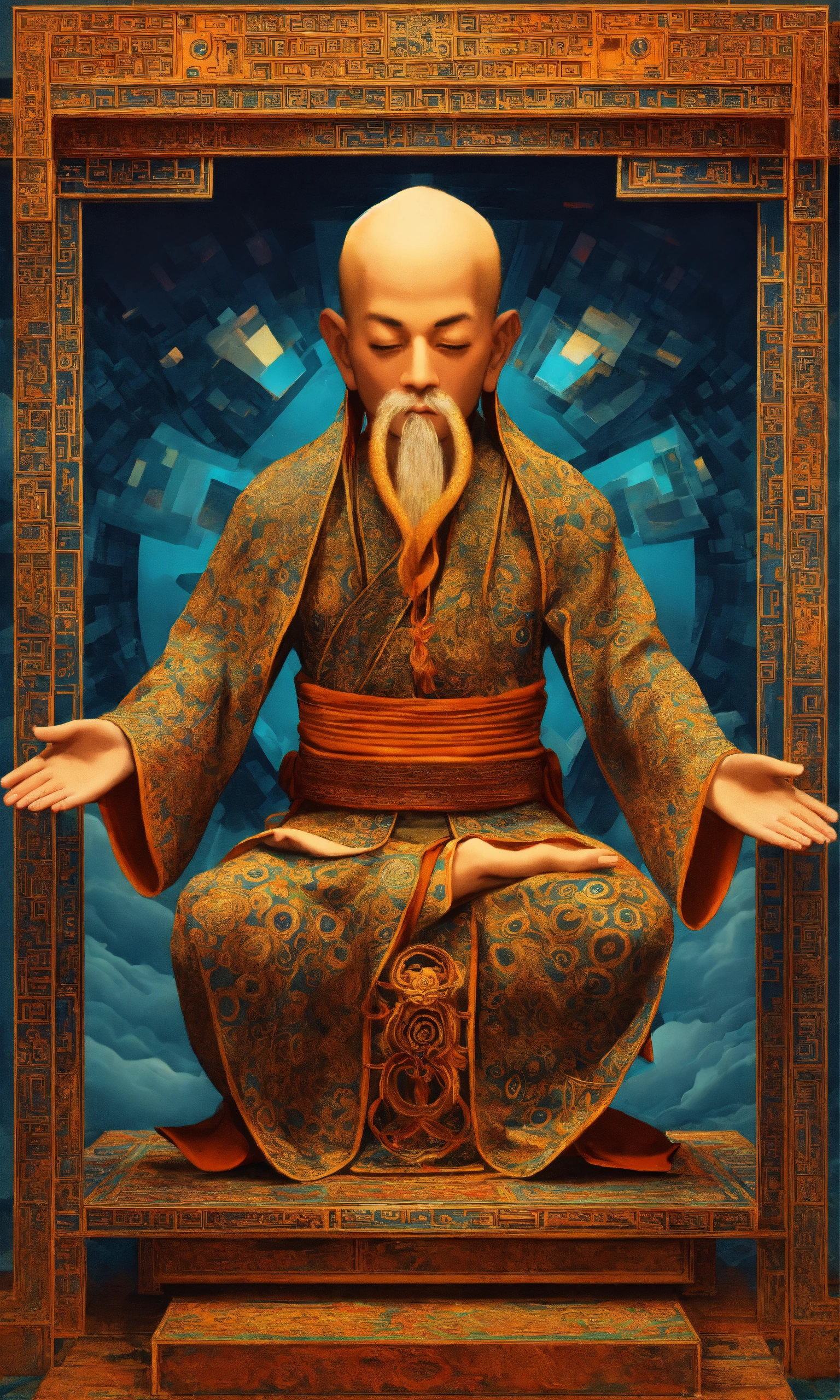 Taoist monk octopus tesseract body fractal three point perspective hypercube mirror zen face
