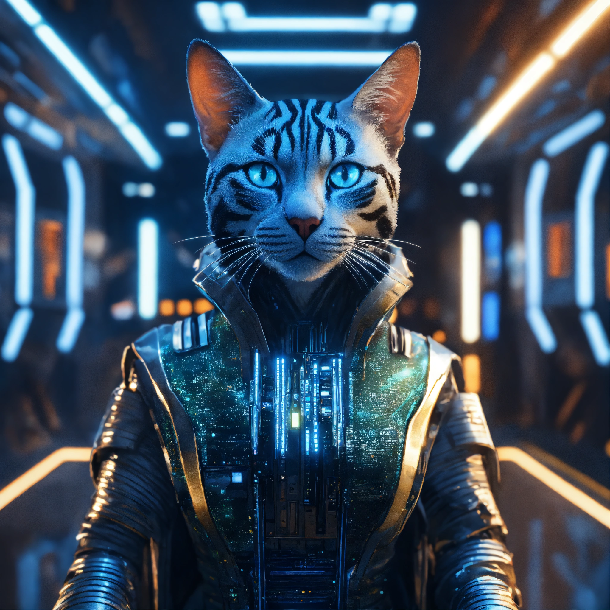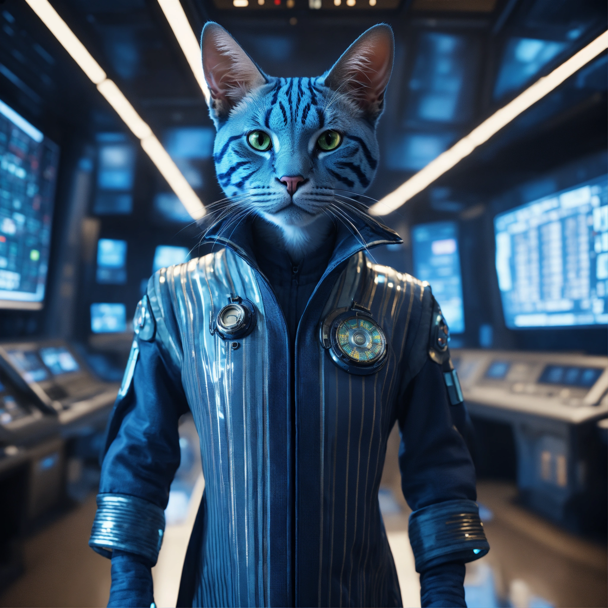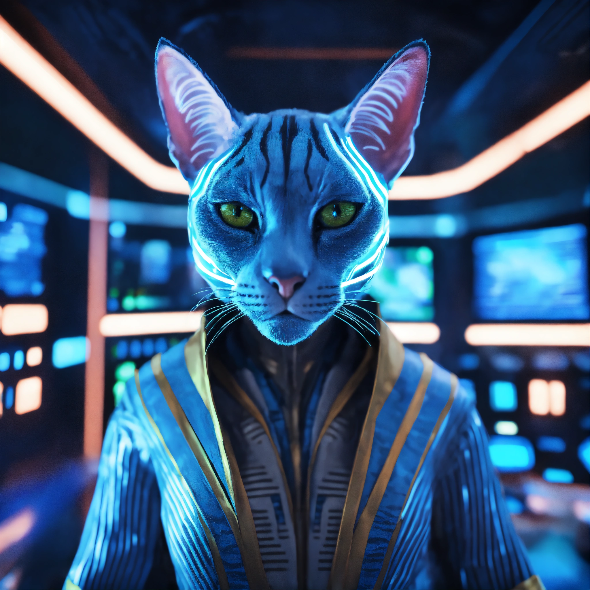 Zoom out from a sophisticated blue striped cat faced humanoid wearing a fancy space robe in a futuristic control room, realistic, futuristic, sci-fi, 8k, unreal engine