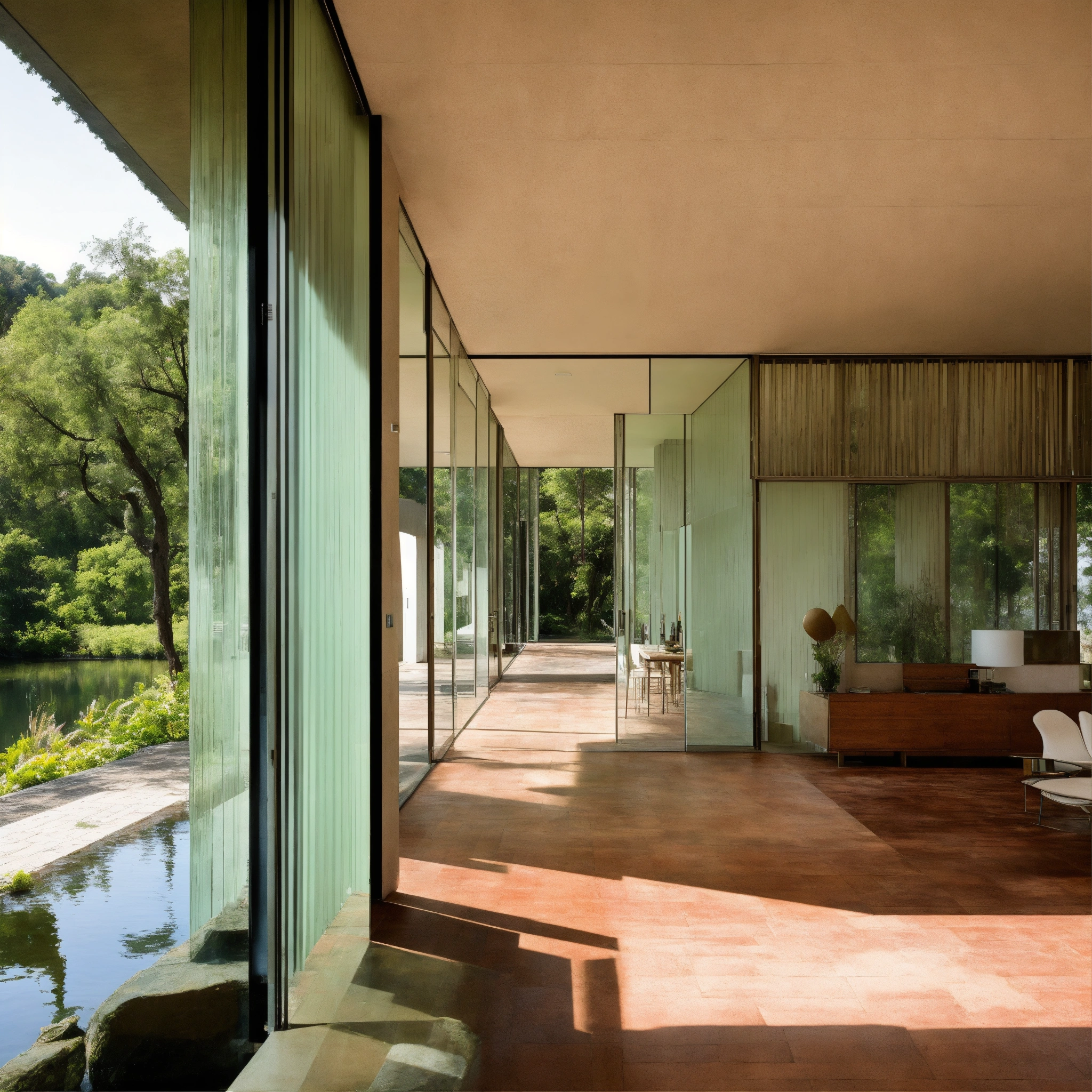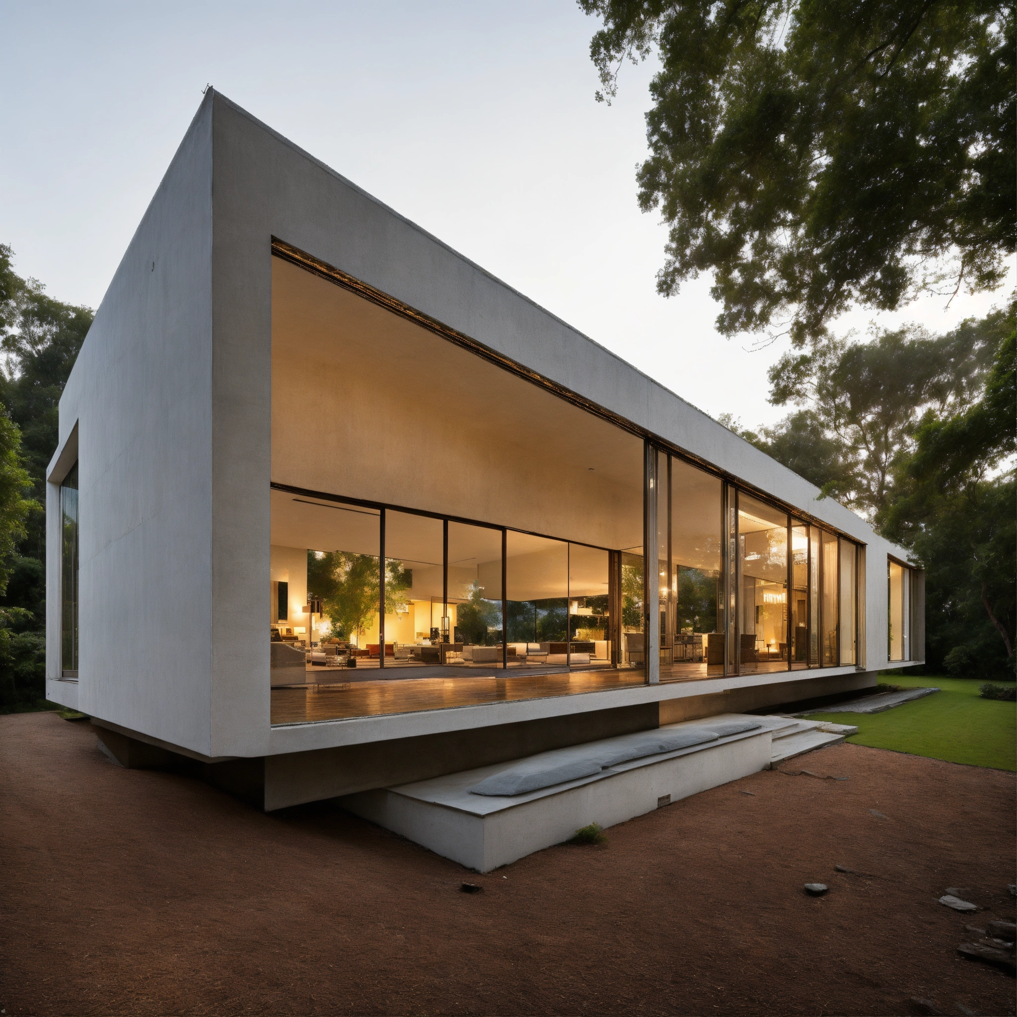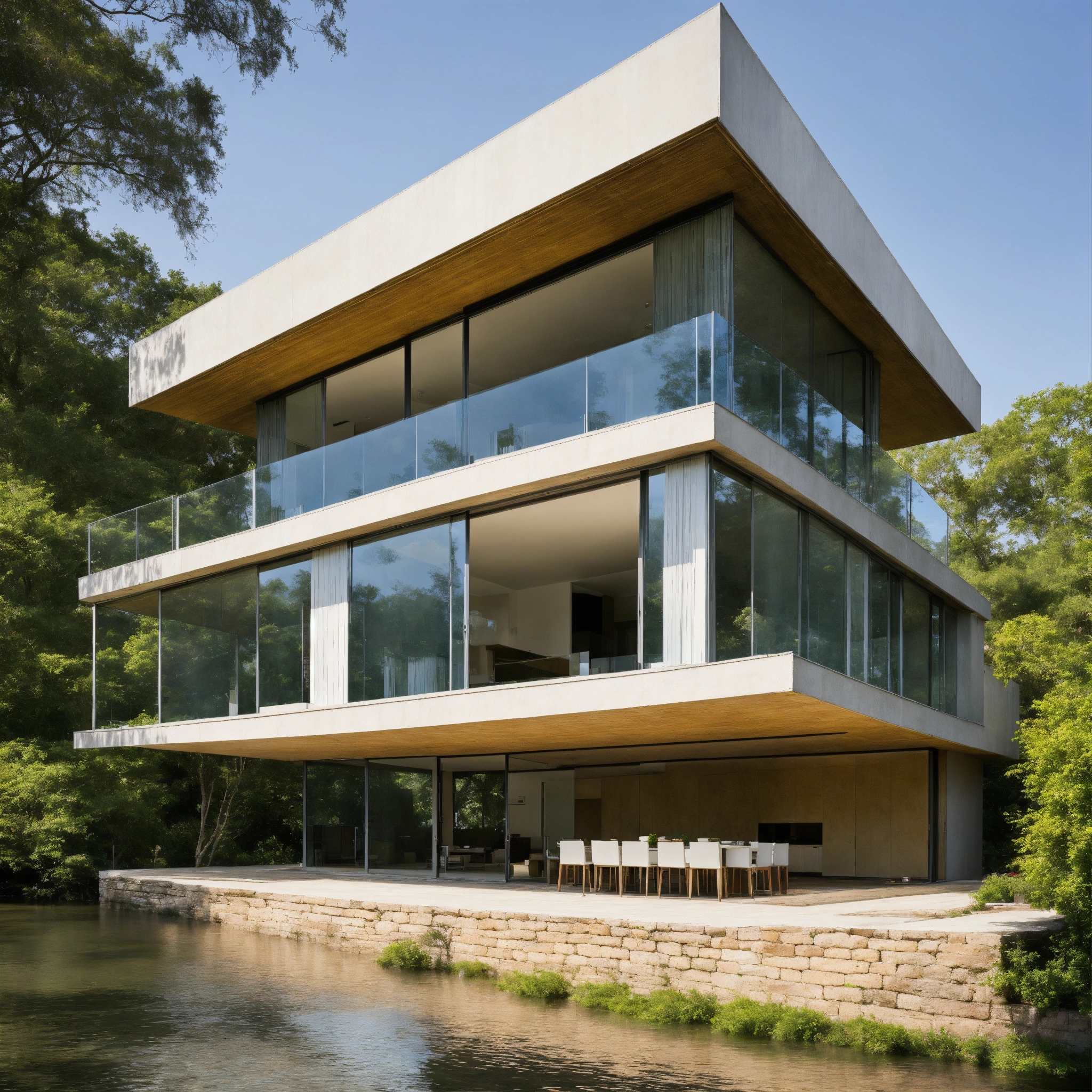 It is a large, graceful house, rectangular and well-proportioned, painted a faded white. the southern wall is almost entirely made of glass, with a view of the river; it is equipped with a steel shutter. the house is very modern and open