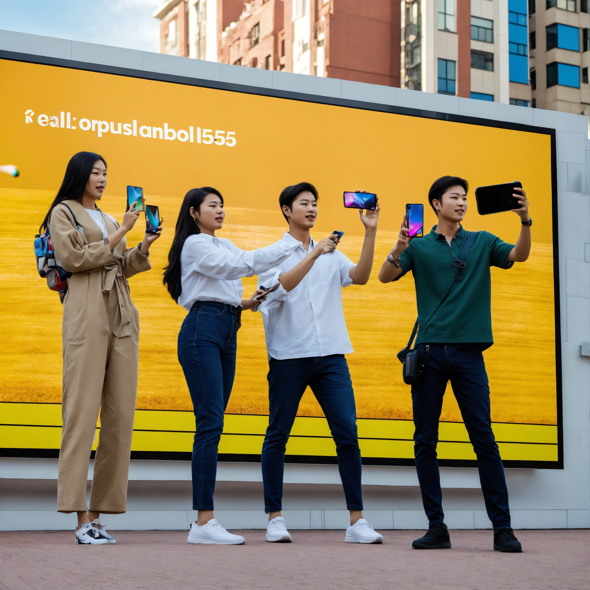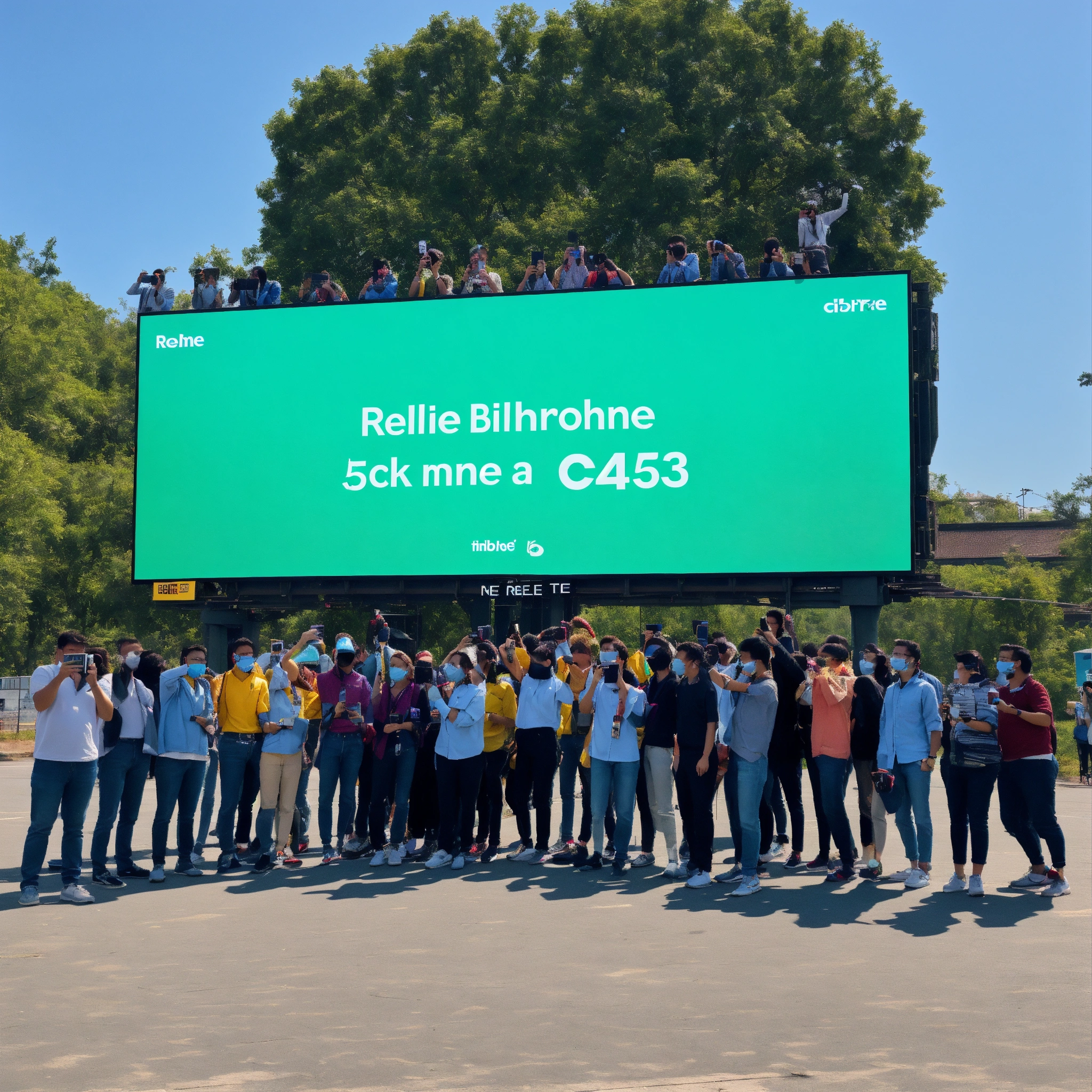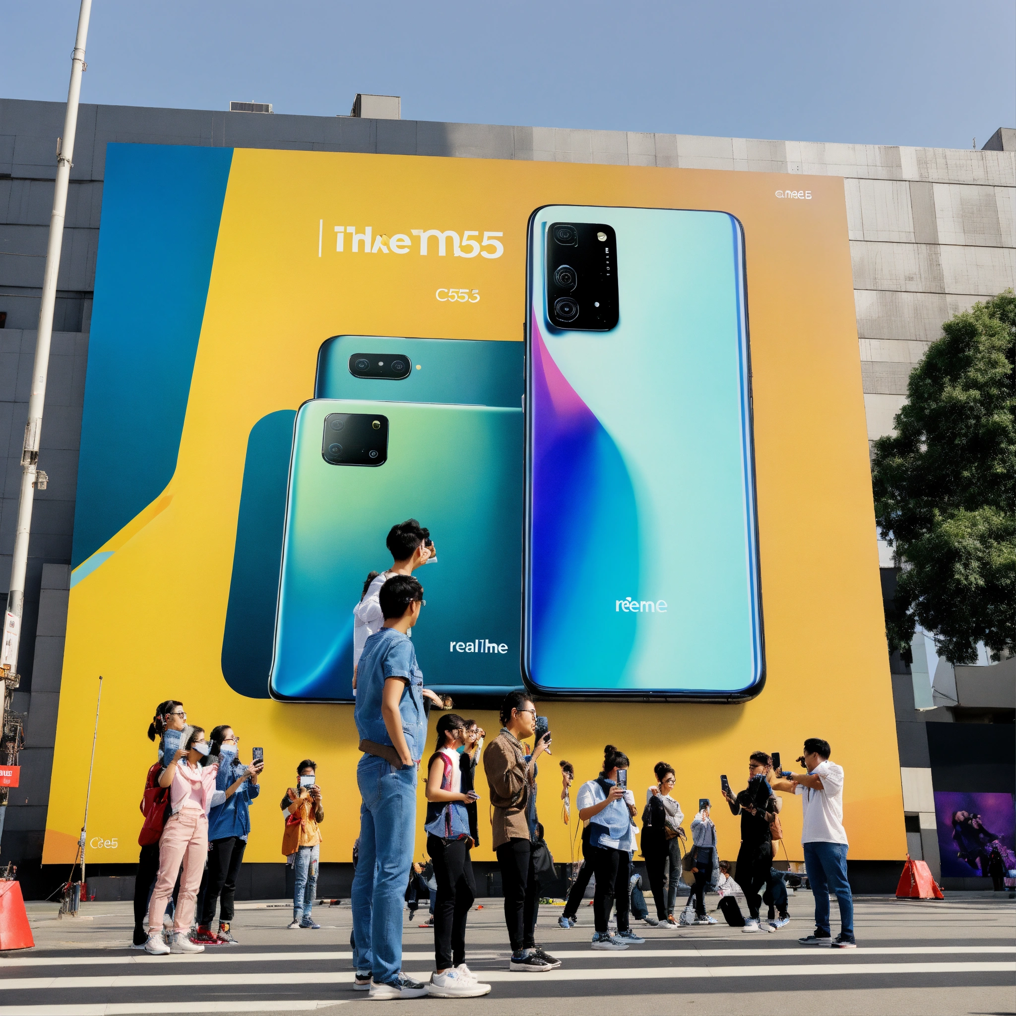 A photo of a group of people standing in front of a large billboard. the billboard is advertising a new smartphone, the realme c53. the people are all holding up their phones to take pictures of the billboard.
