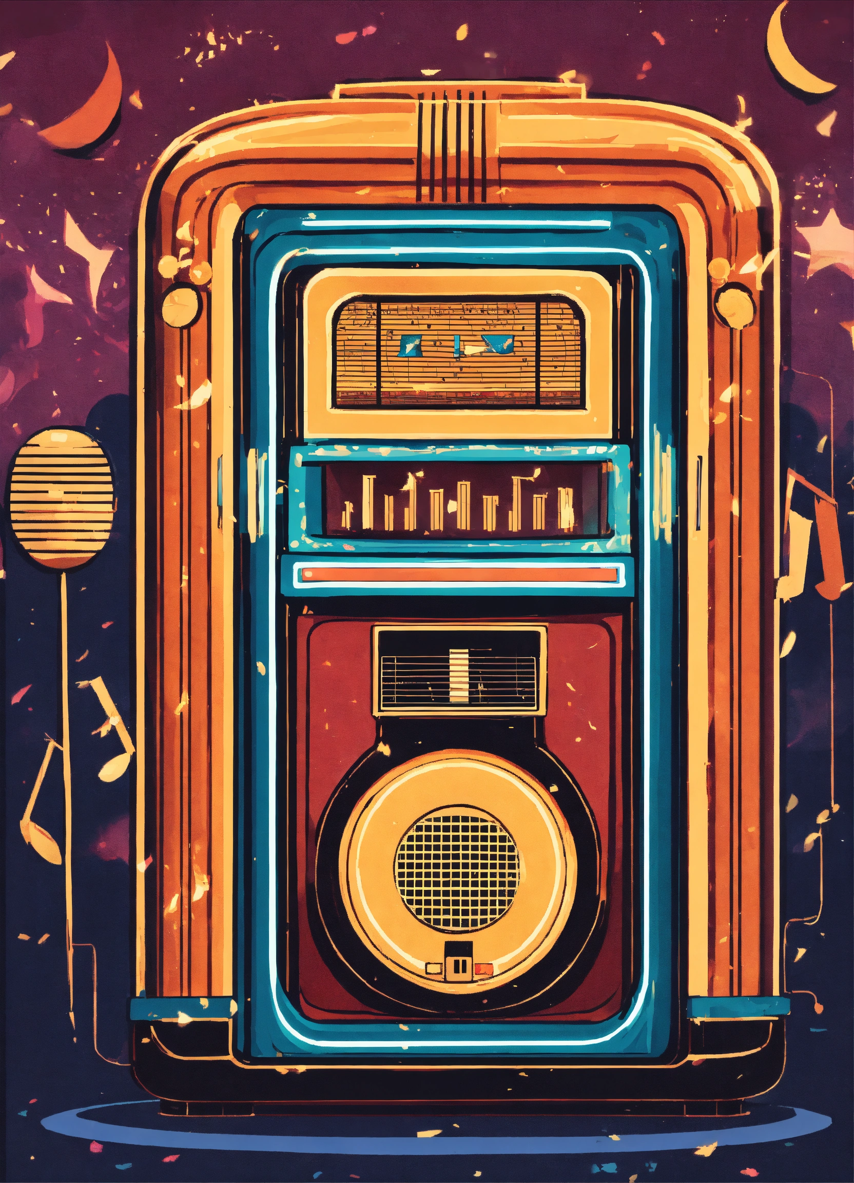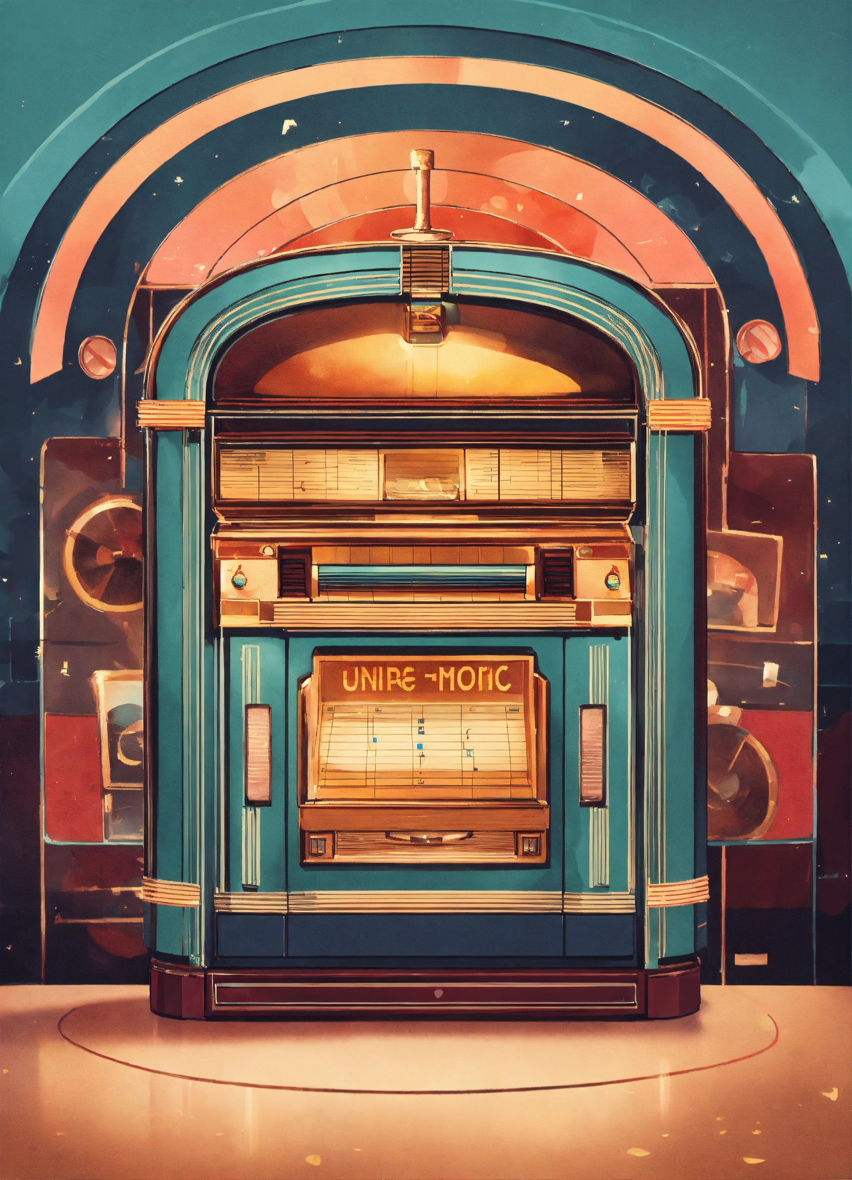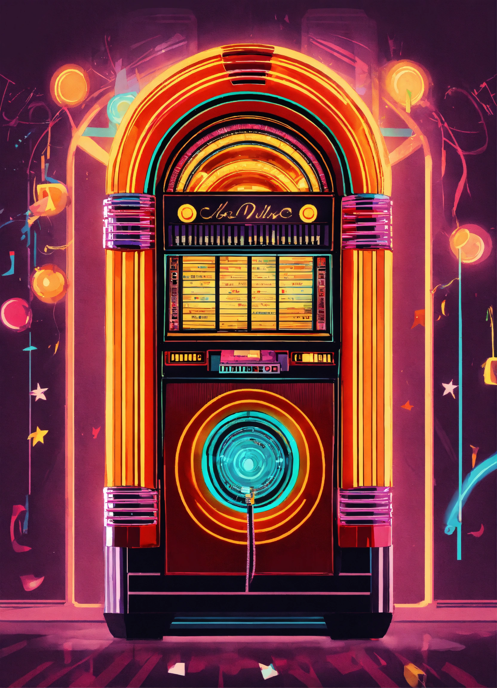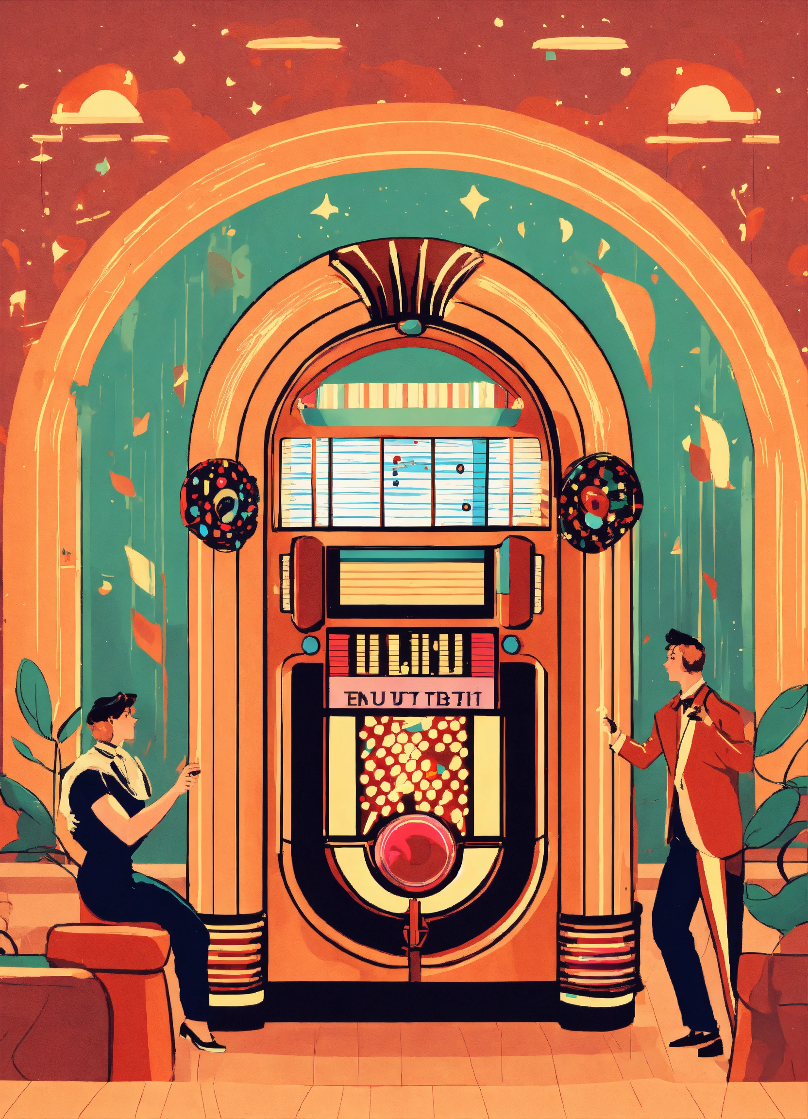 A retro-style jukebox emitting lively music, drawing people to dance and reminisce nostalgic tunes vintage aesthetics illustration.