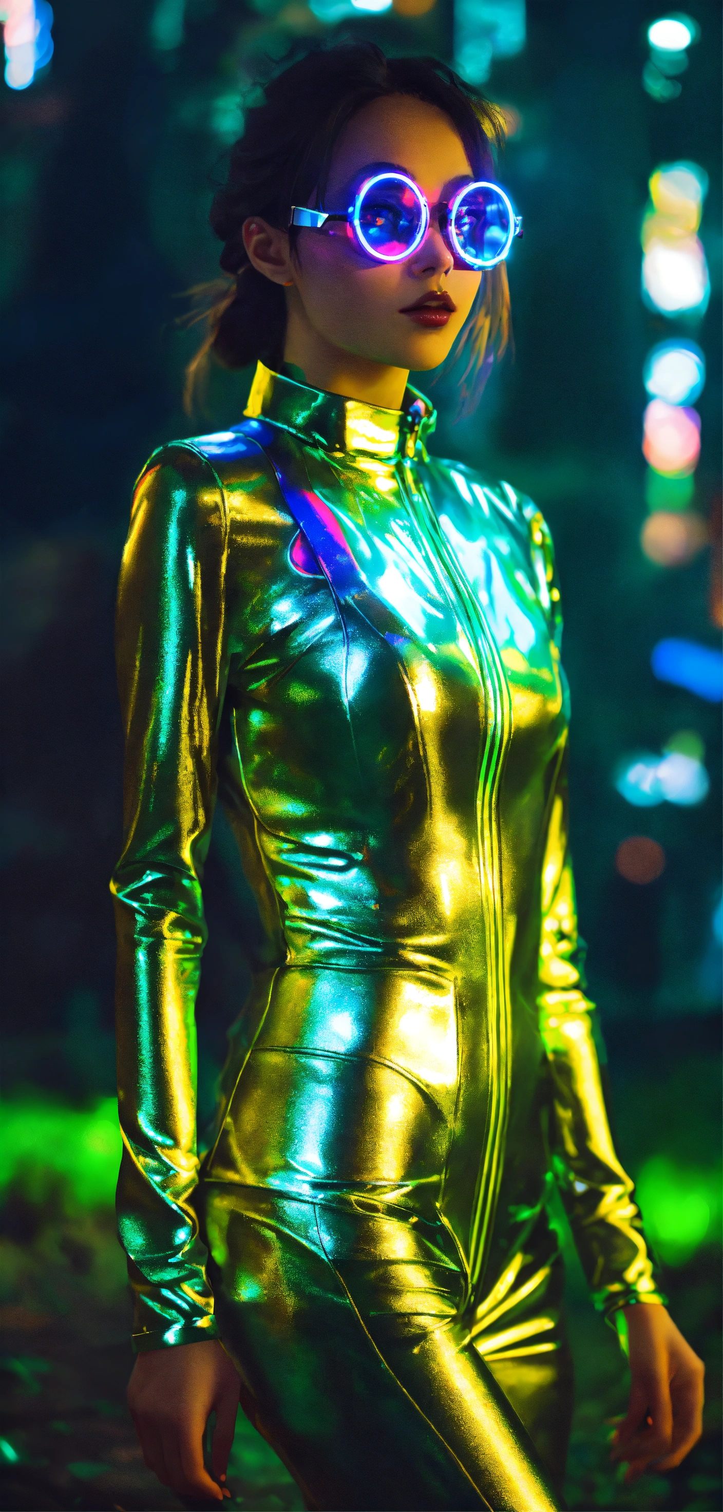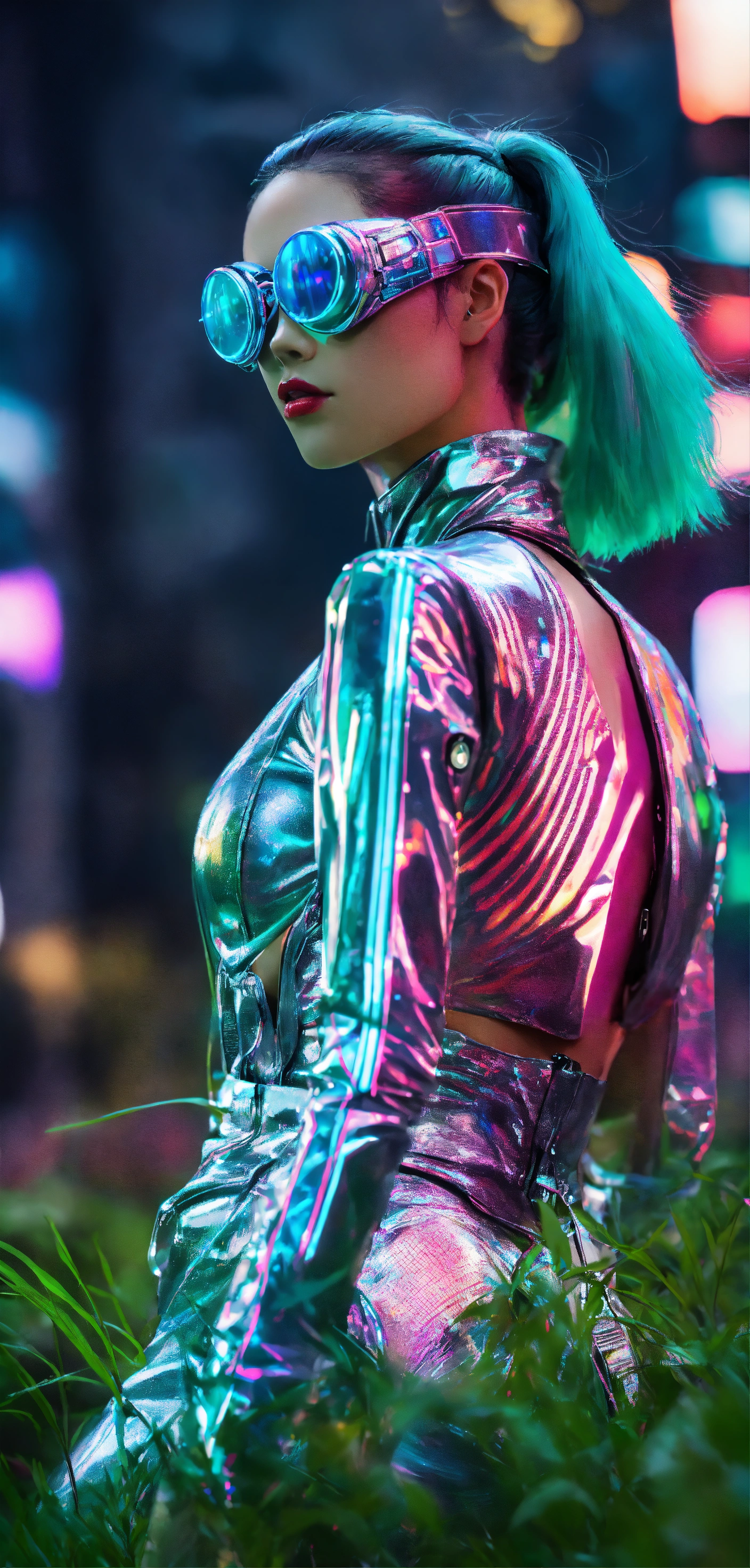Location a neighborhood park picnic model a chinese cyberpunk maven, exuding an aura of technological mystique. outfit a metallic silver catsuit with holographic accessories and led glasses, crafted from futuristic synthetic fabric. artistic style futuristic digital manipulation with neon glows and pixelated elements, inspired by the digital art movement of the modern era. artistic features holographic projections and glitch effects on a simple green grass background.