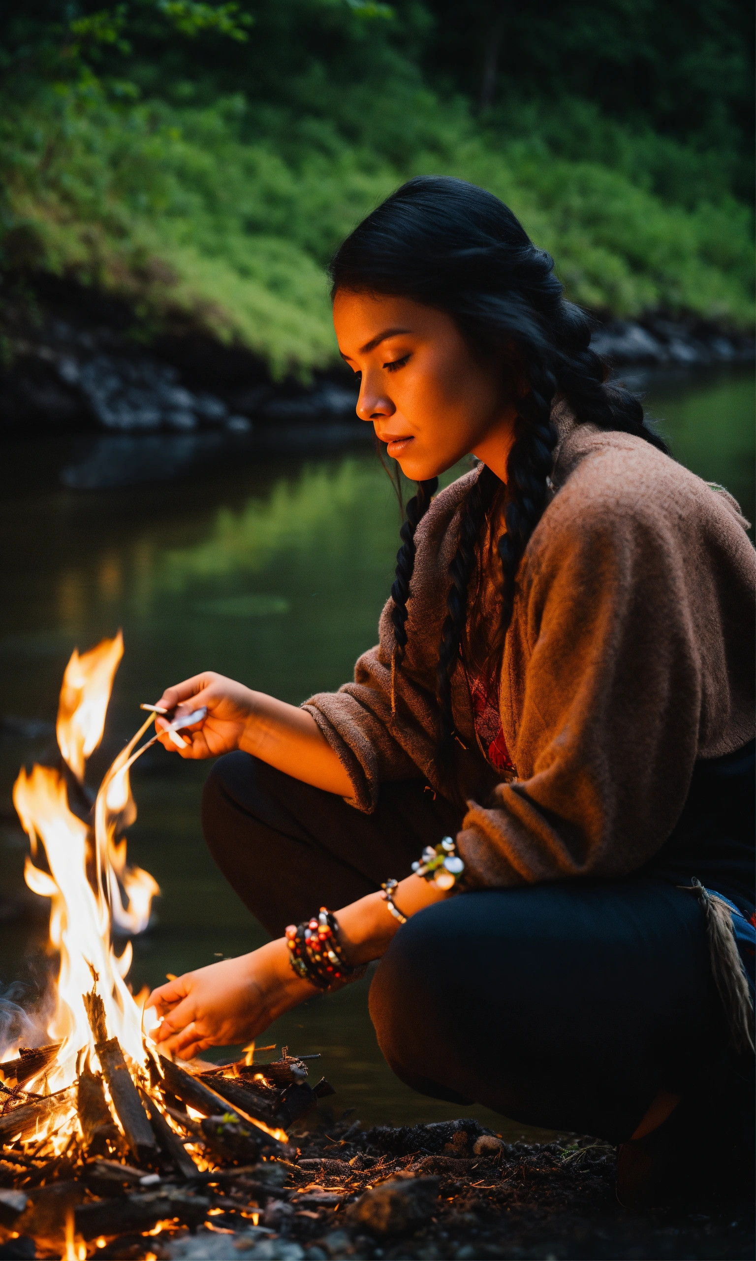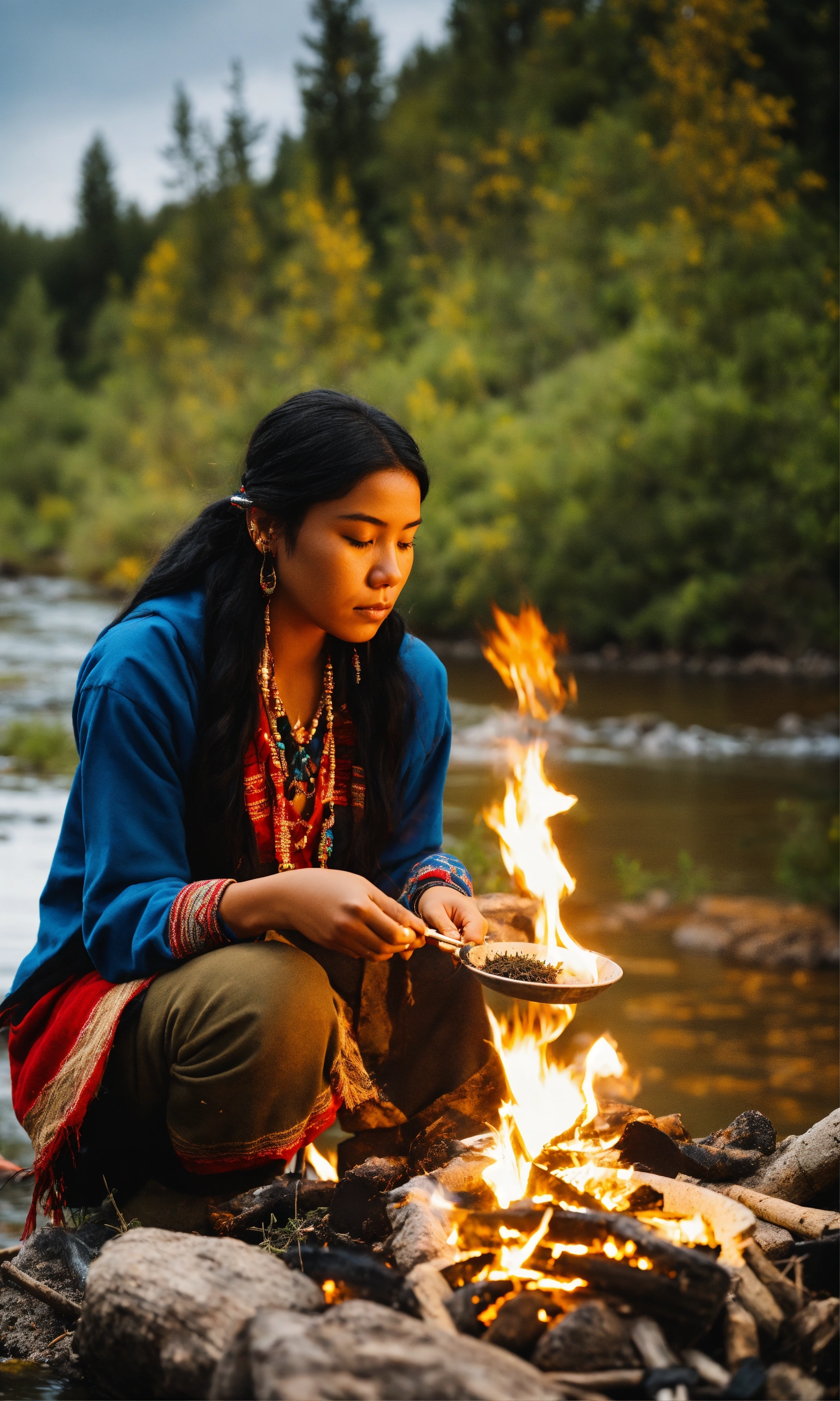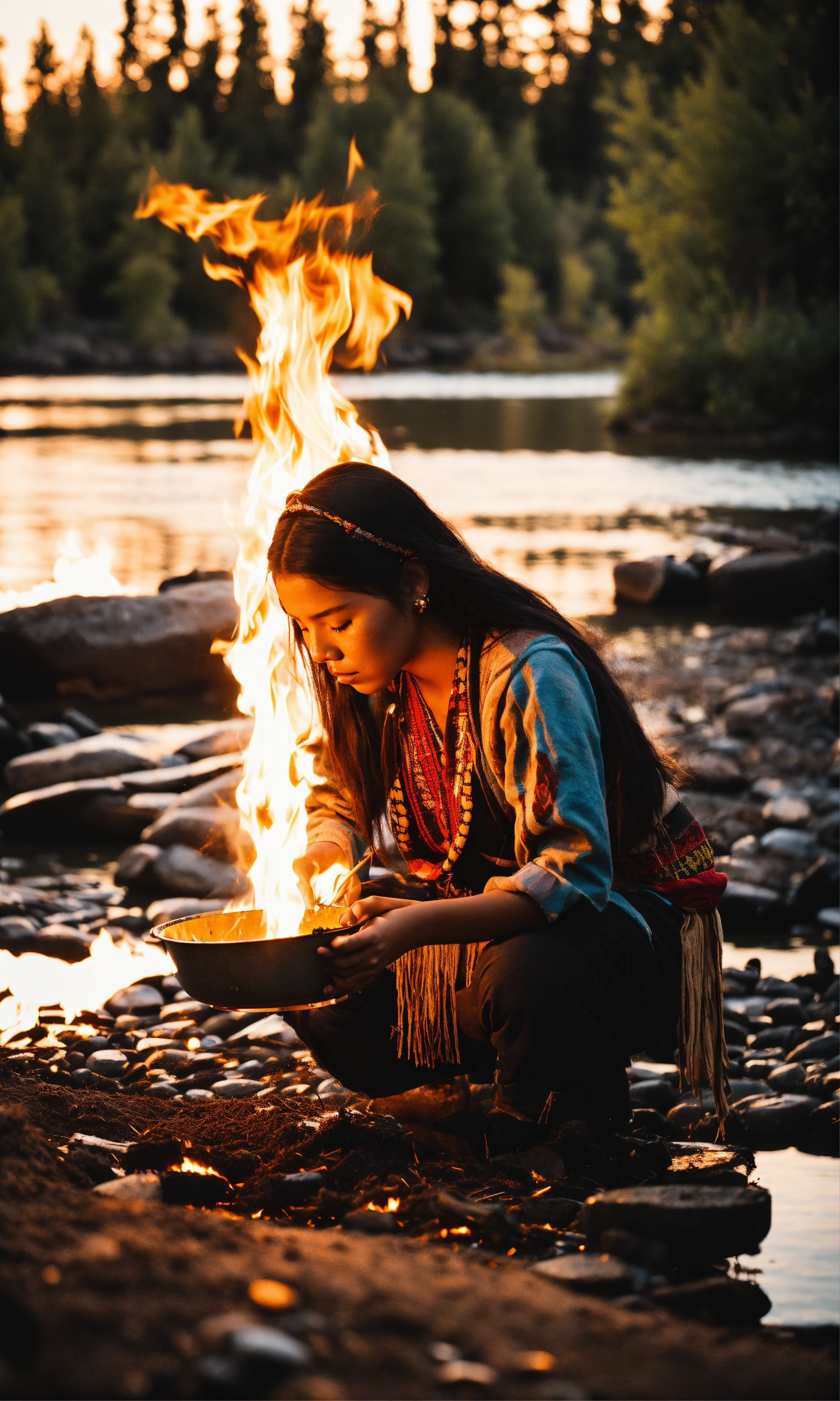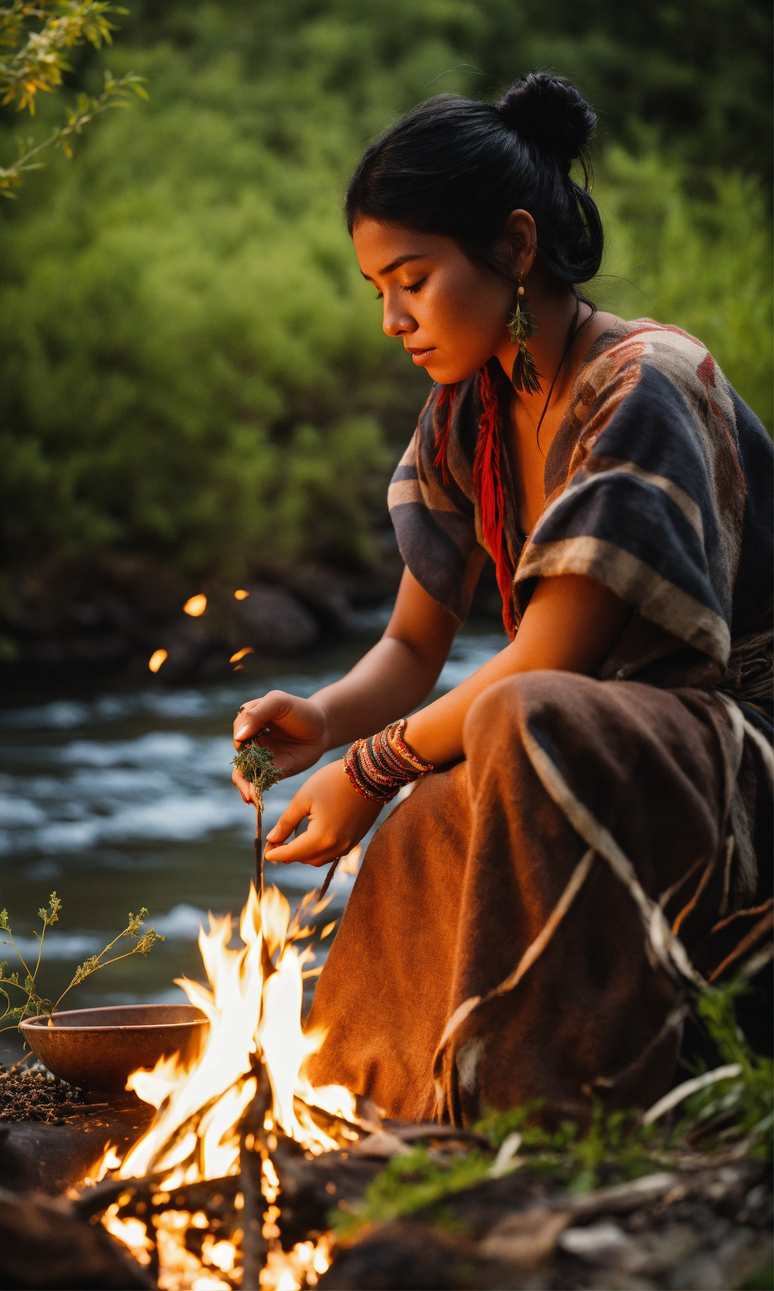Cinematic image of indigenous young woman of north america burning herbs by a river