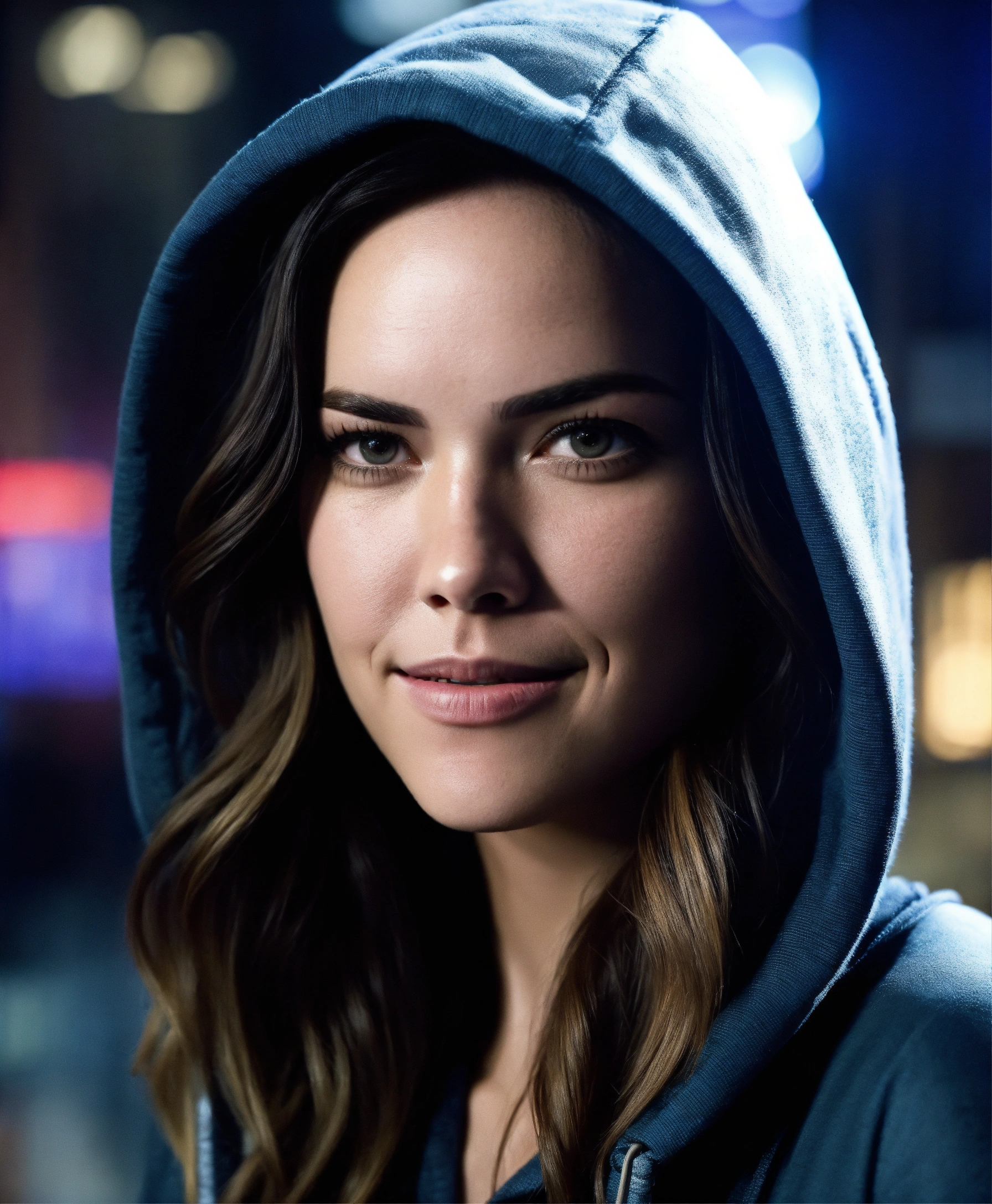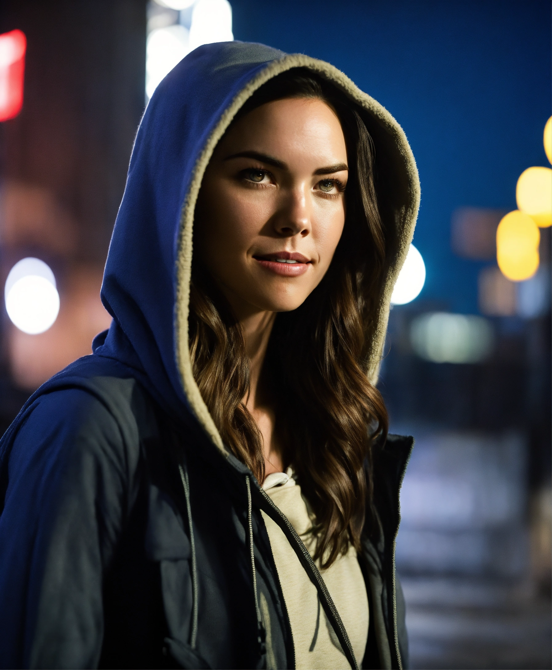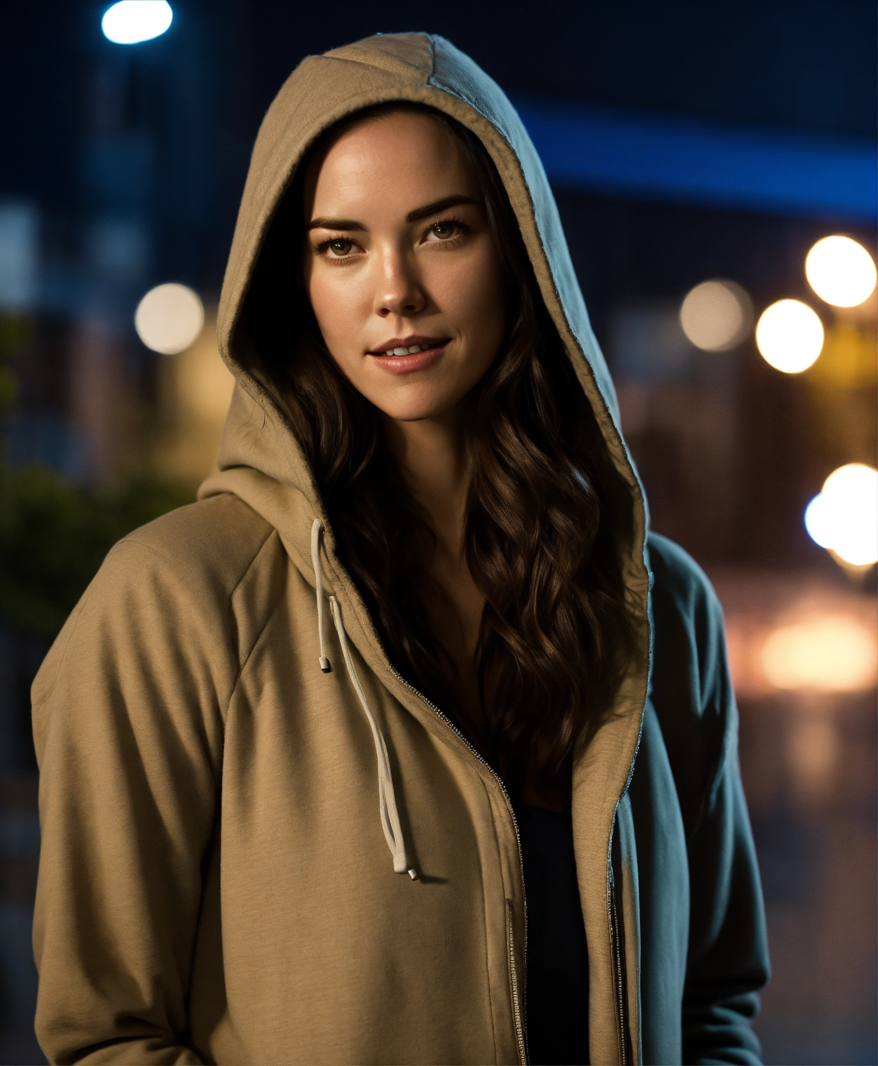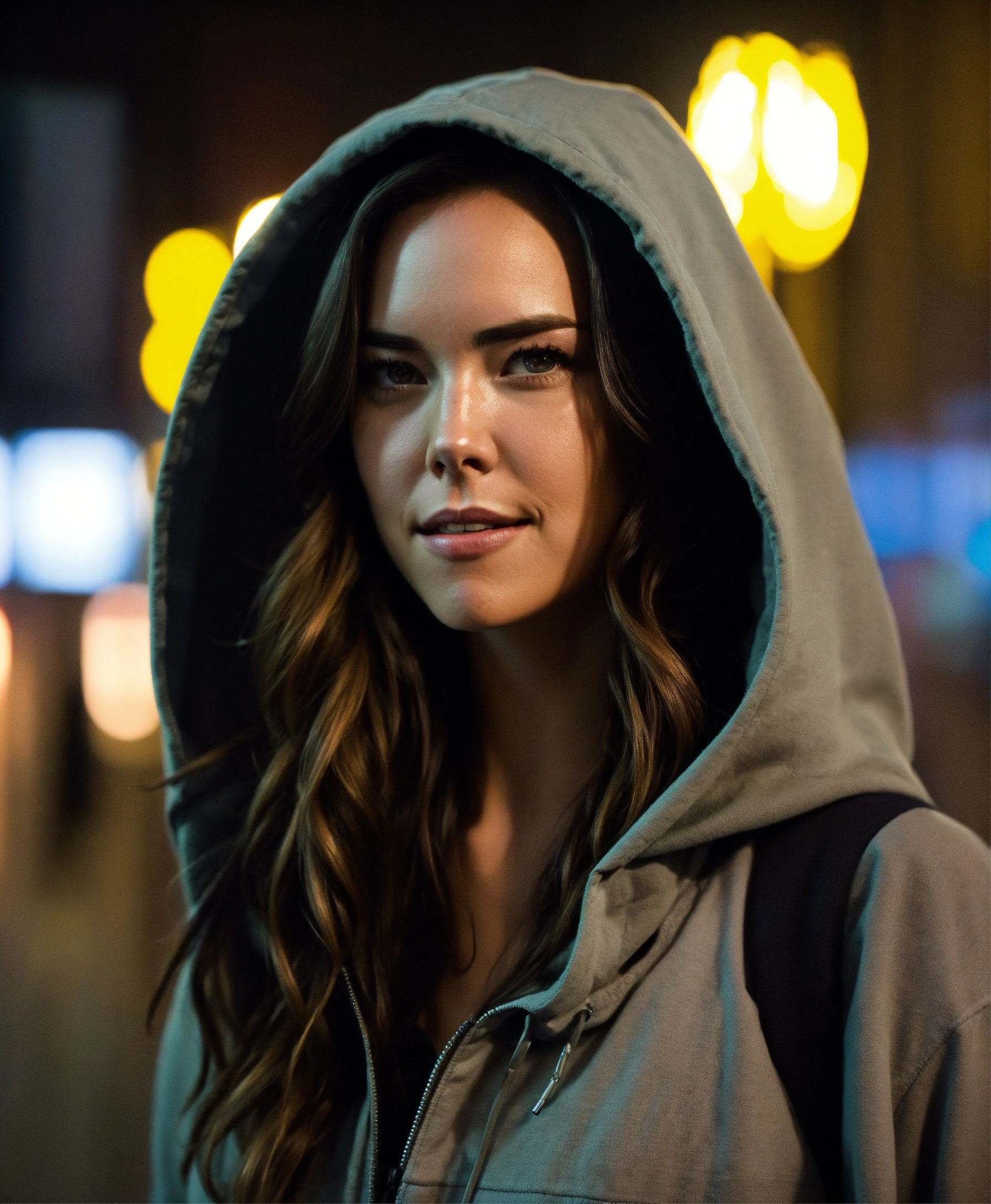 Very beautiful 30 years old odette annable, with cute big hazel eyes and long hair, confidently smirks in a night city life-or-death situation. she wears a hooded sweatshirt, adding a cinematic and realistic walk to her presence. this scene is reminiscent of the arrow tv show.