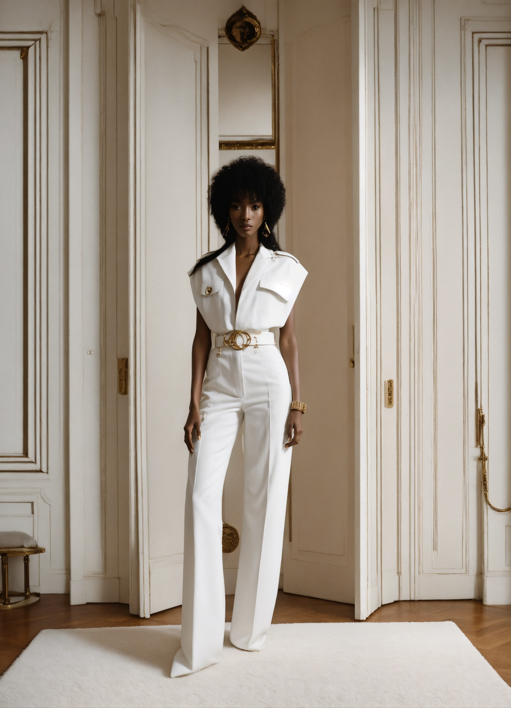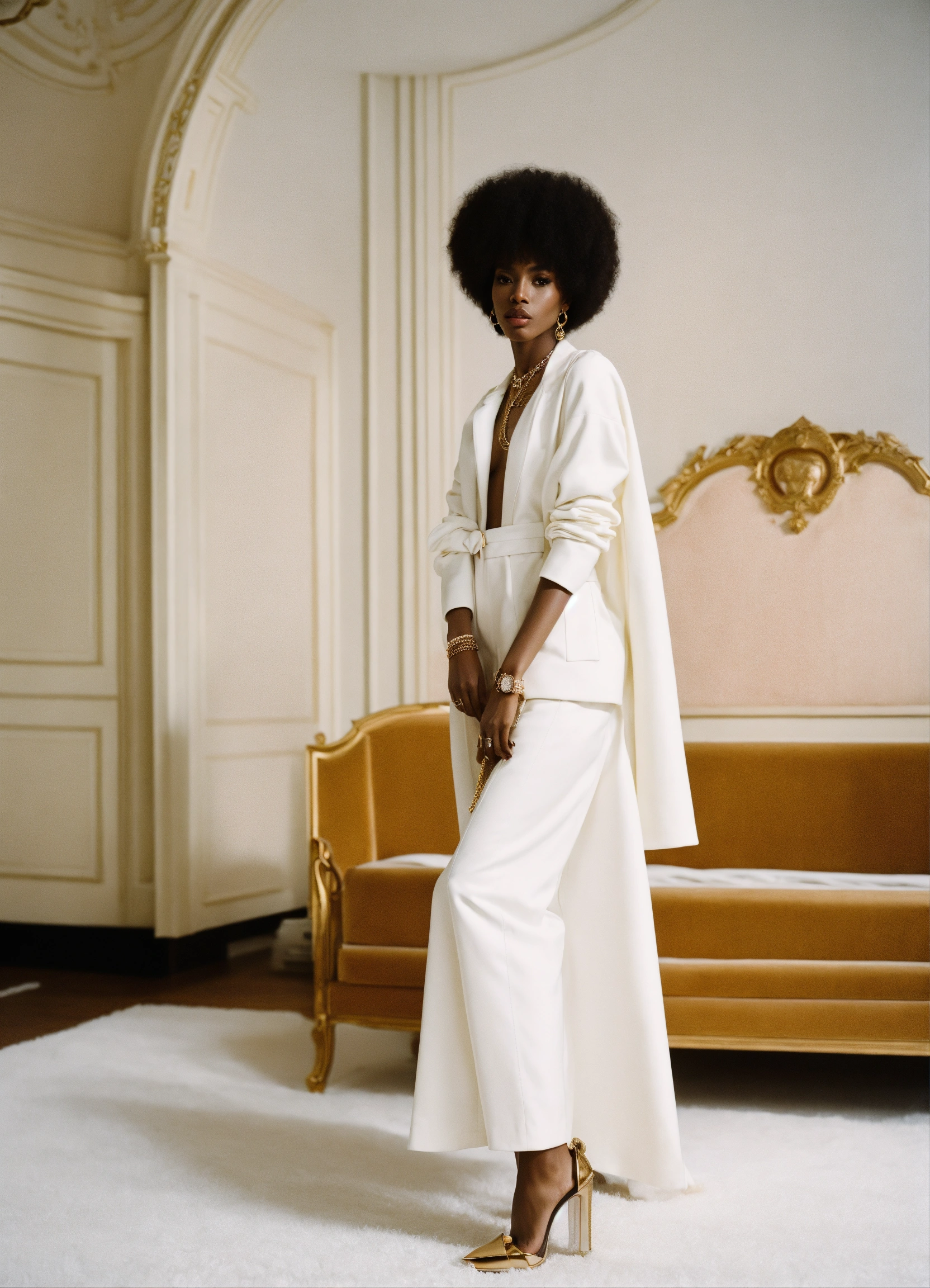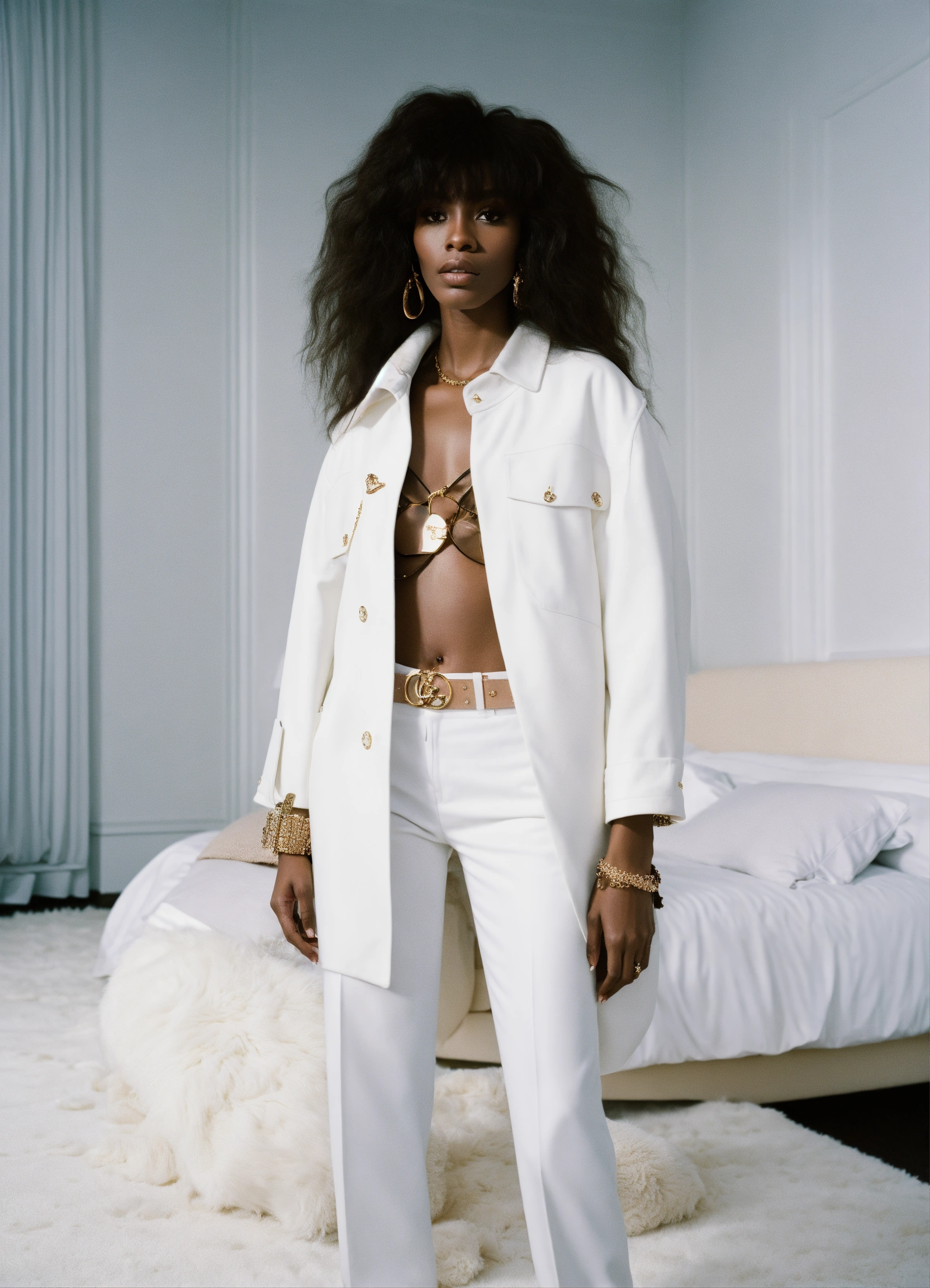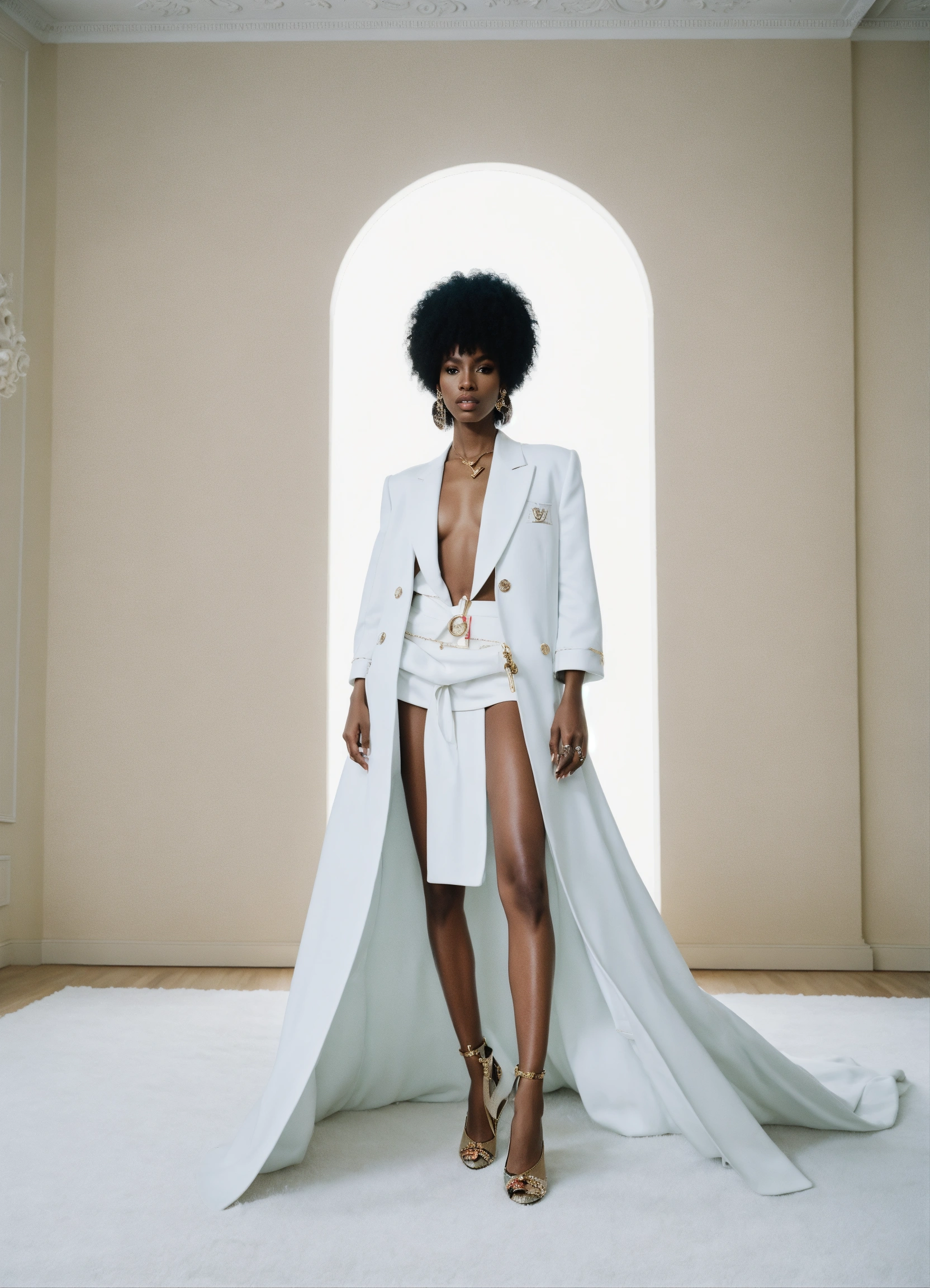 Donyale luna, standing on white carpet, inside of bedroom, all white room, minimalist 8k resolution, hyper realistic, mid day, 35mm film, editorial, high fashion, louis vuitton, by virgil abloh.