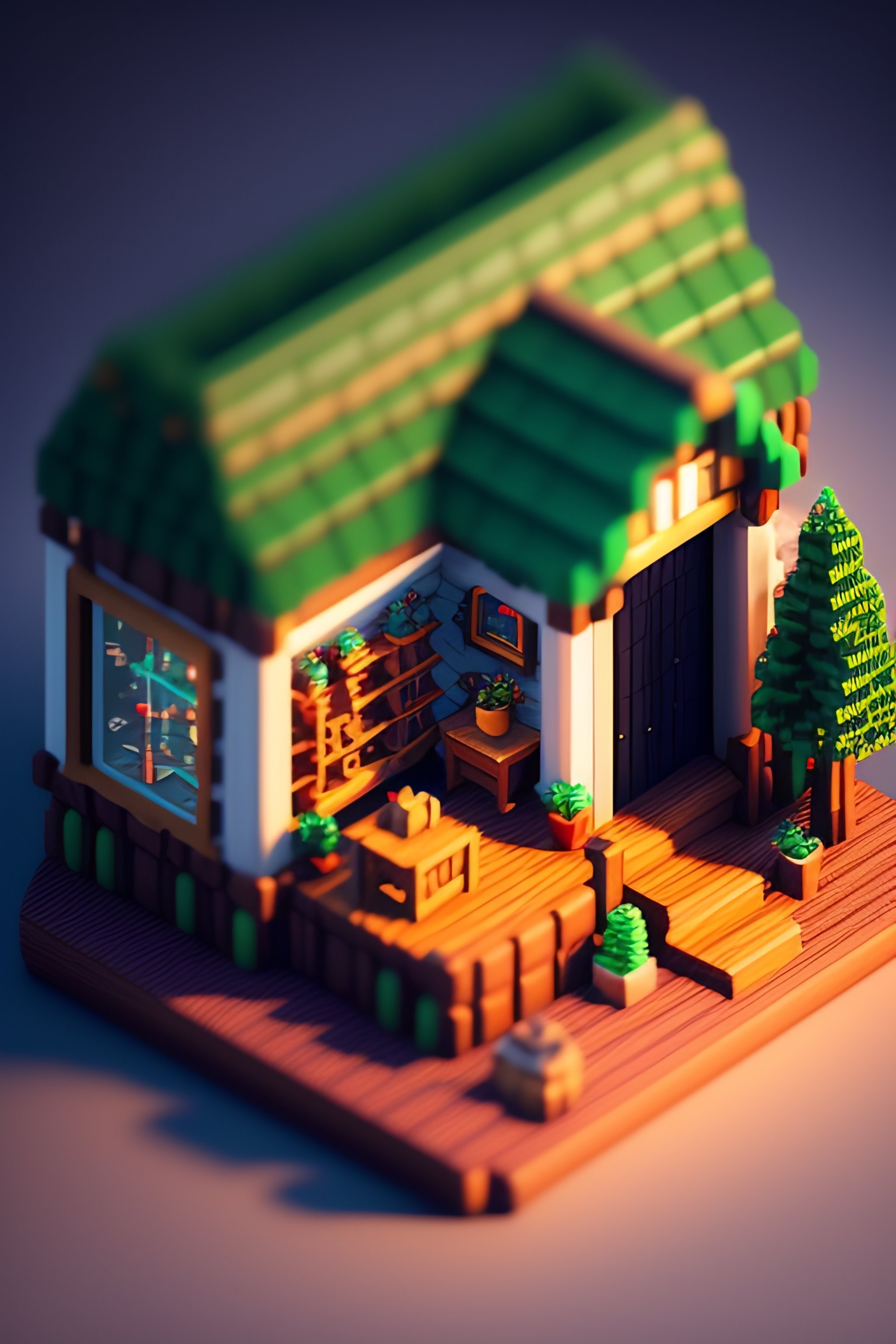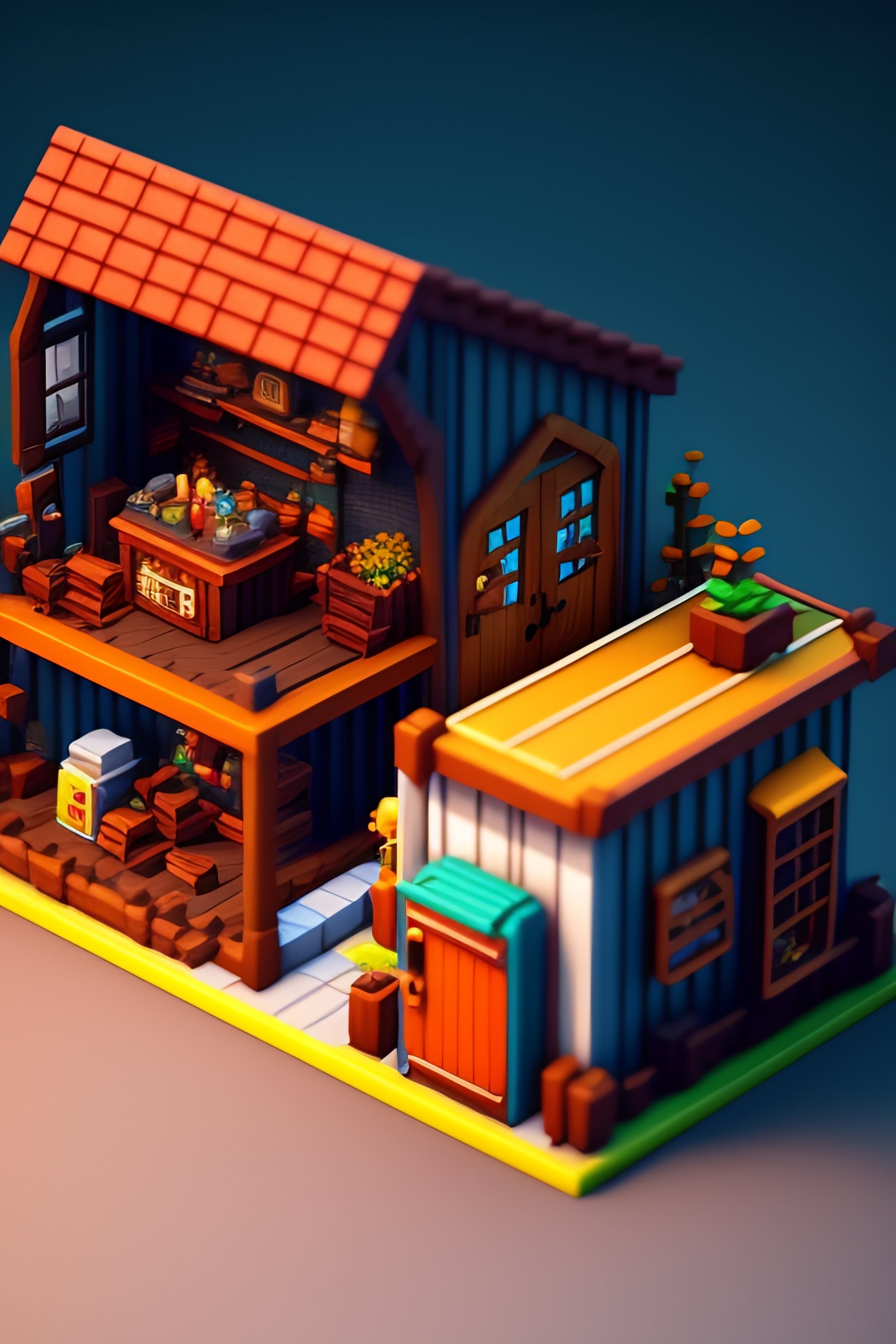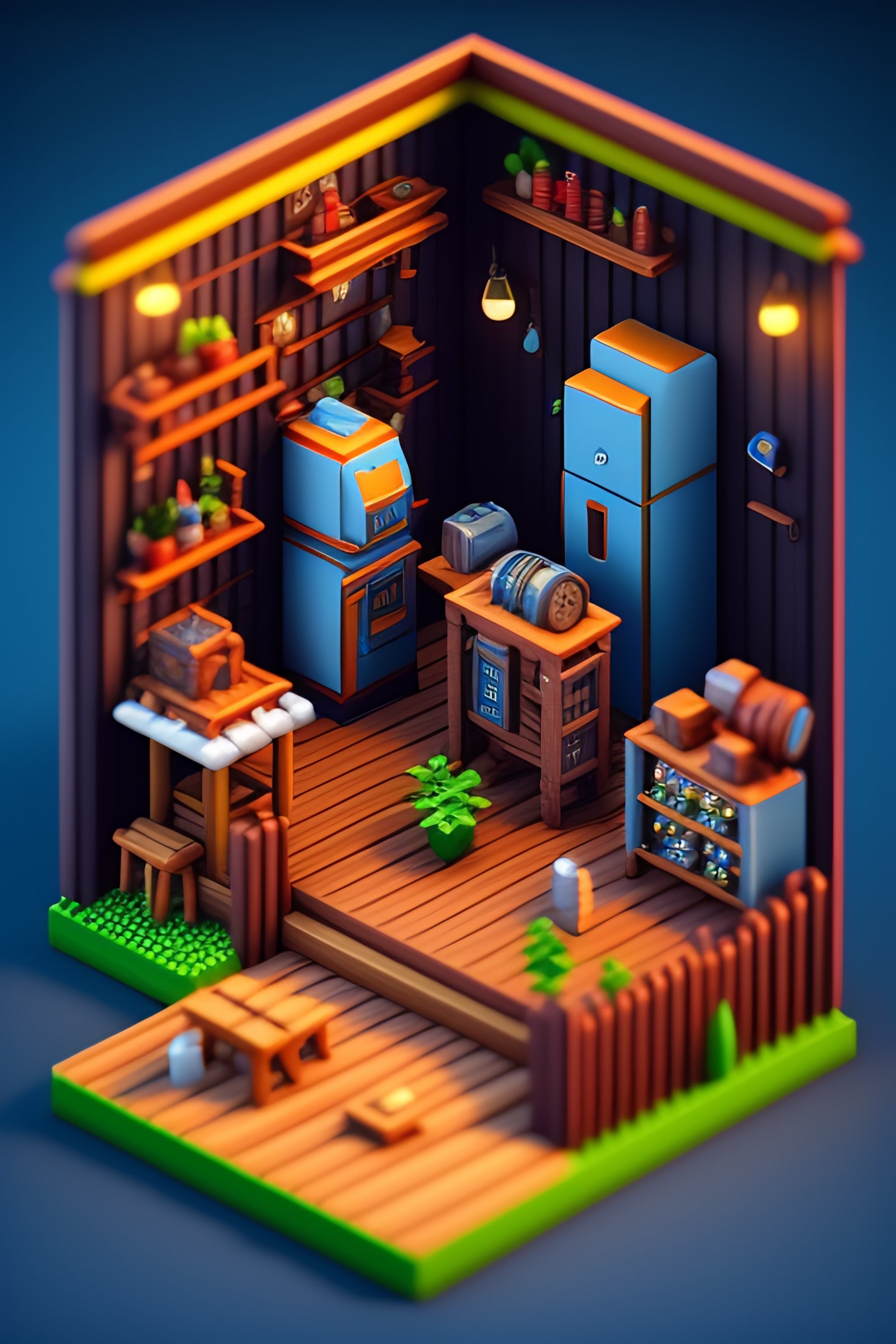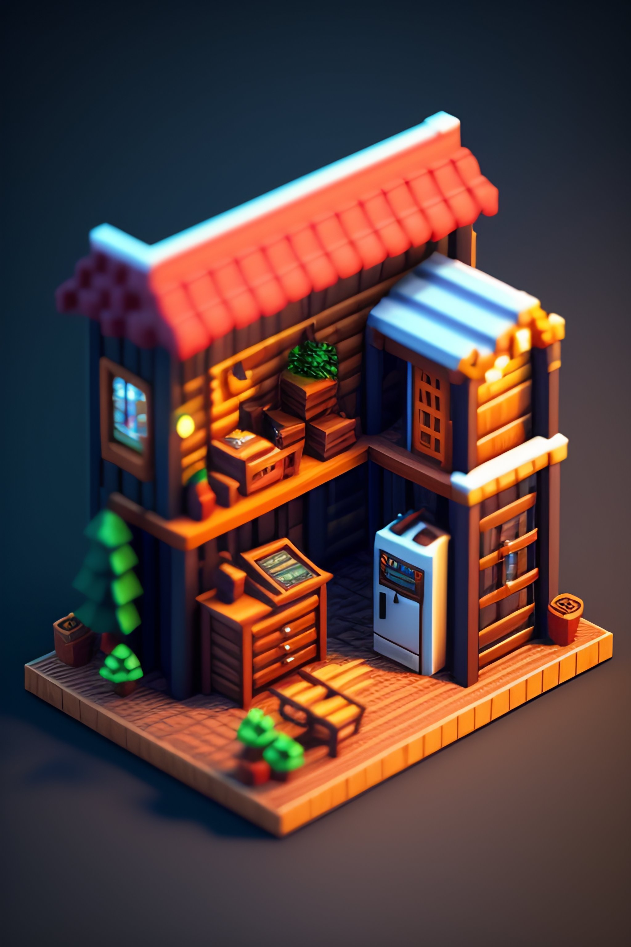 Detailed isometric woodworking shop, pixel art, unreal engine voxel render, video games, very cozy, nostalgia, man building furniture, tilt-shift, c4d render