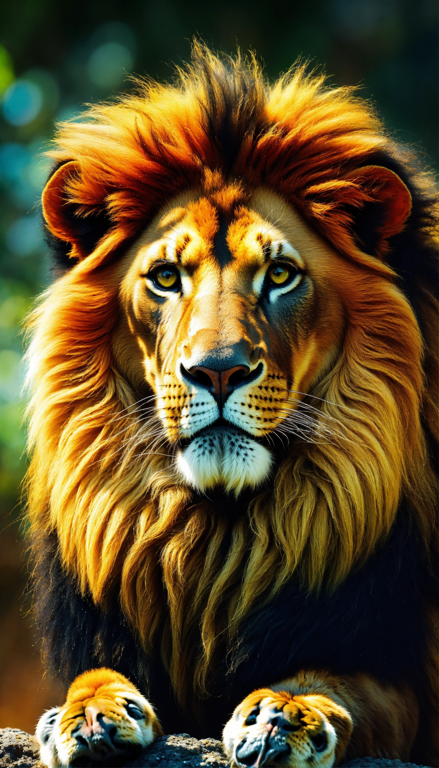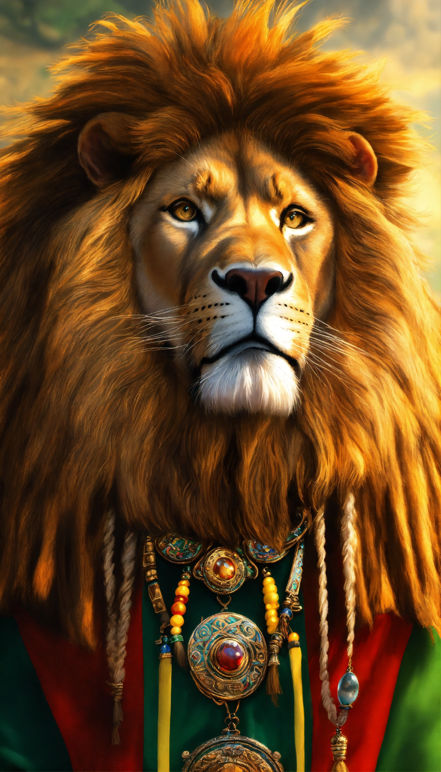 Eres un ilustrador digital y fotógrafo profesional, genera una imagen alta calidad, realista, de una cara ultra detallada león, enfócate en mantener las en ser muy detallista en todos los aspectos de la cara, el leon tiene estilo rastafari