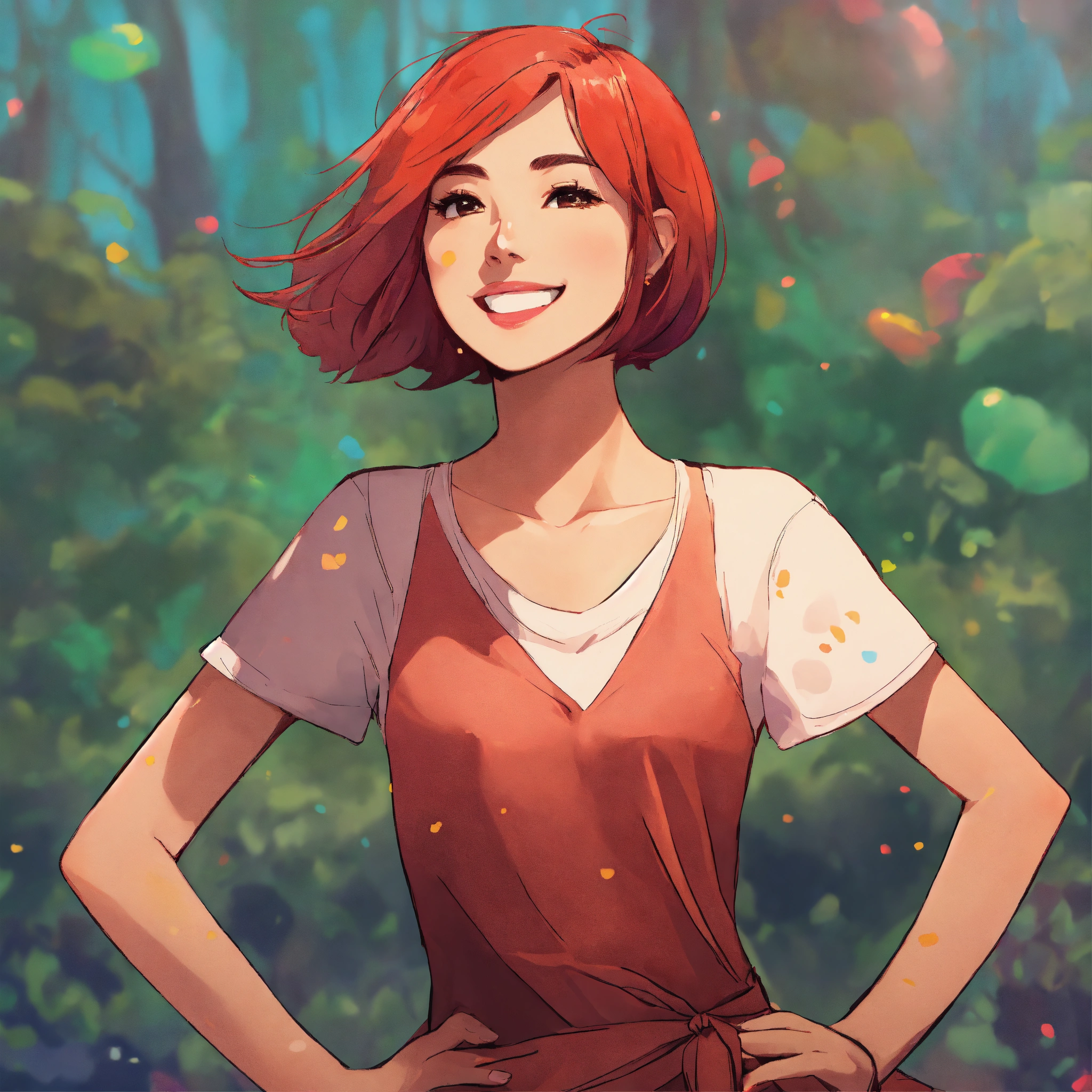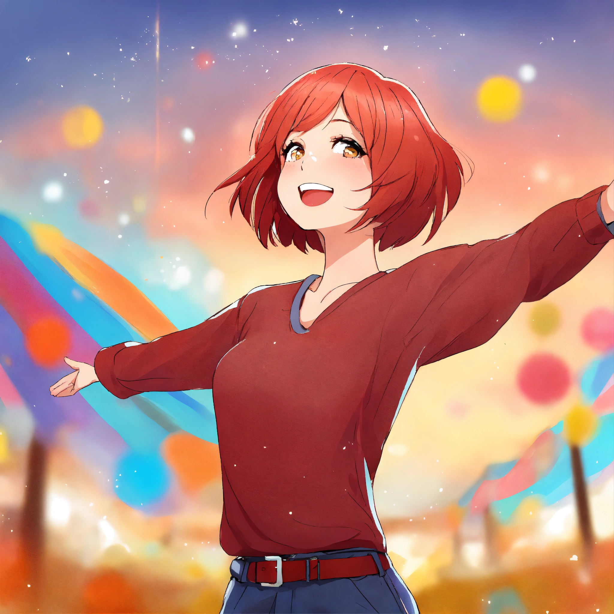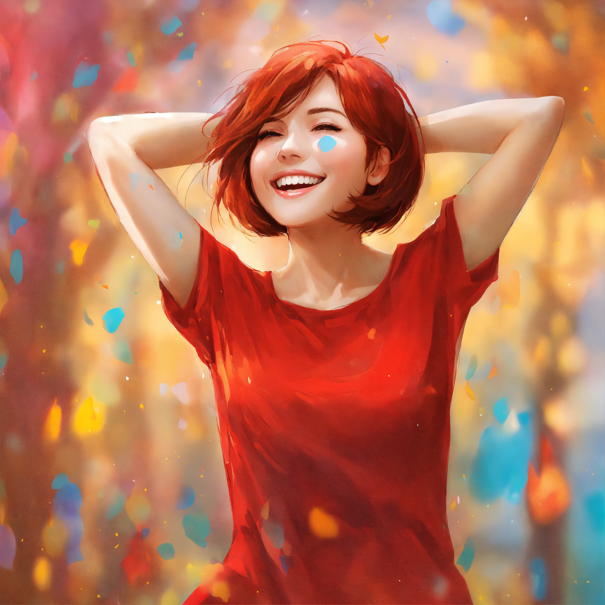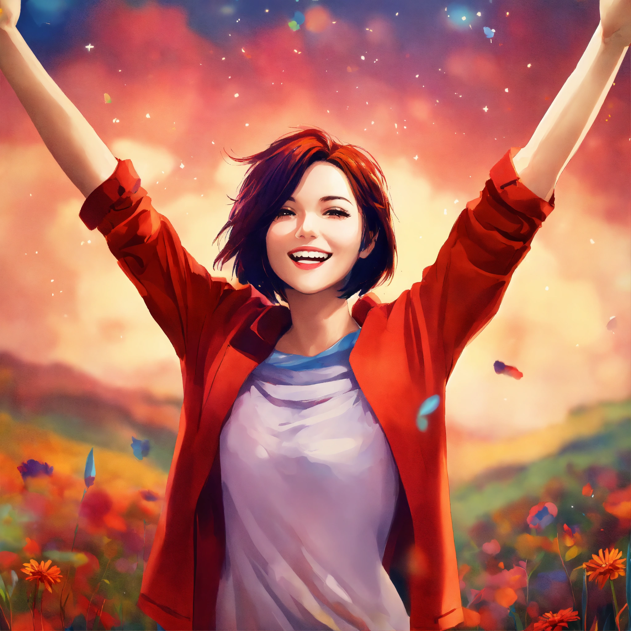 Woman with red-brown straight short hair, happiness, happy, dreamy, colorful, fantastic, 2d, she is happy with her arms open