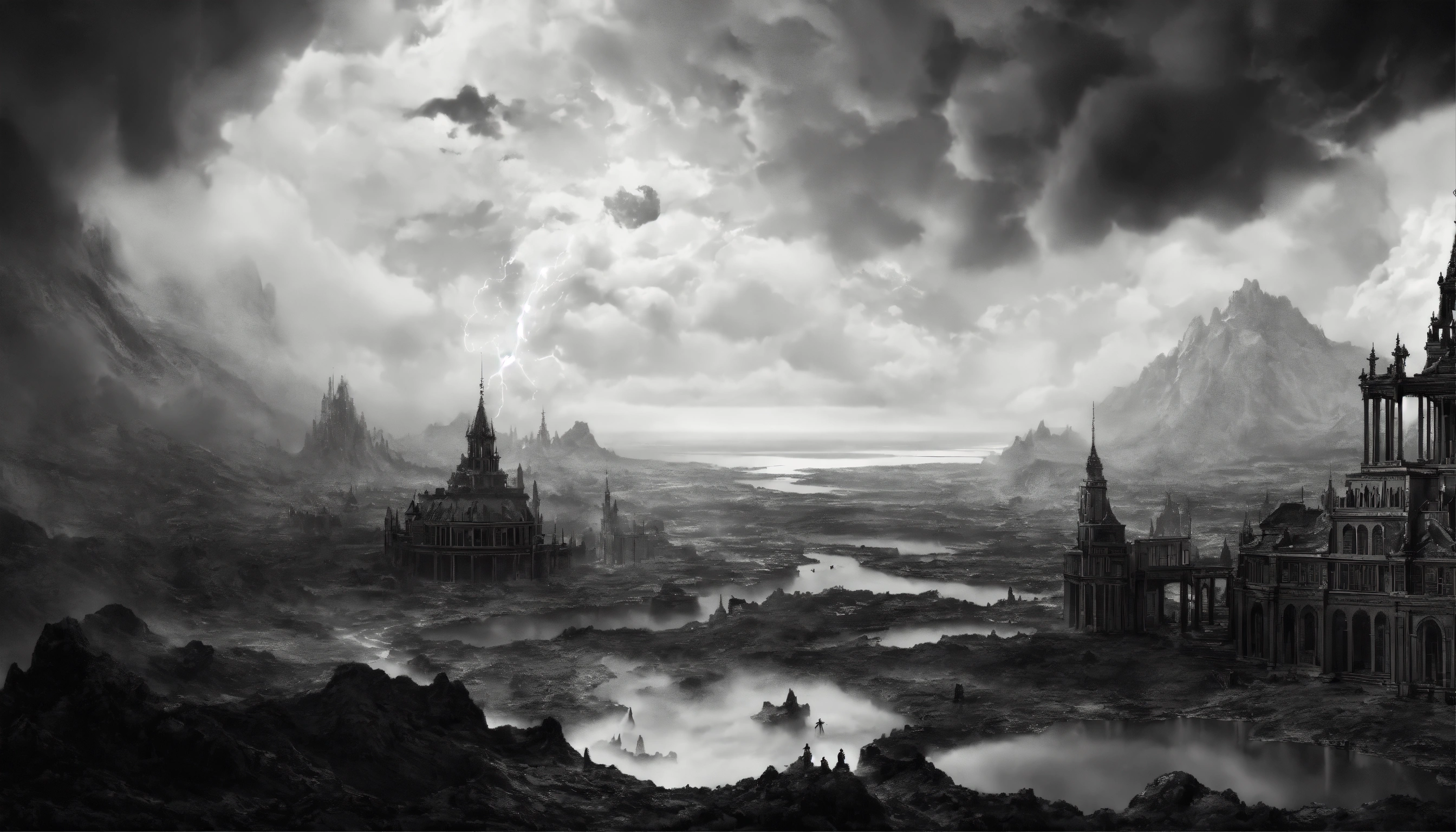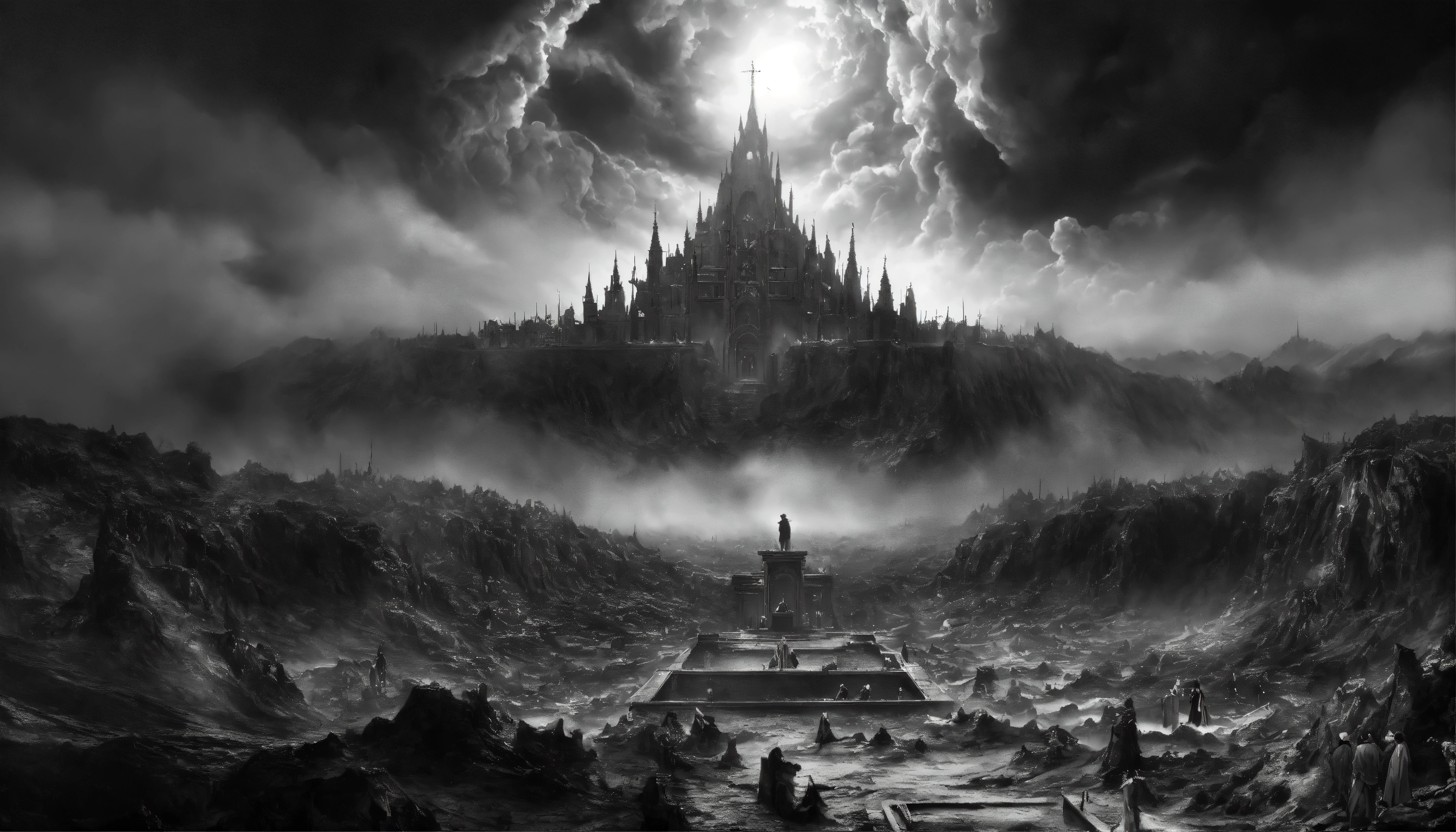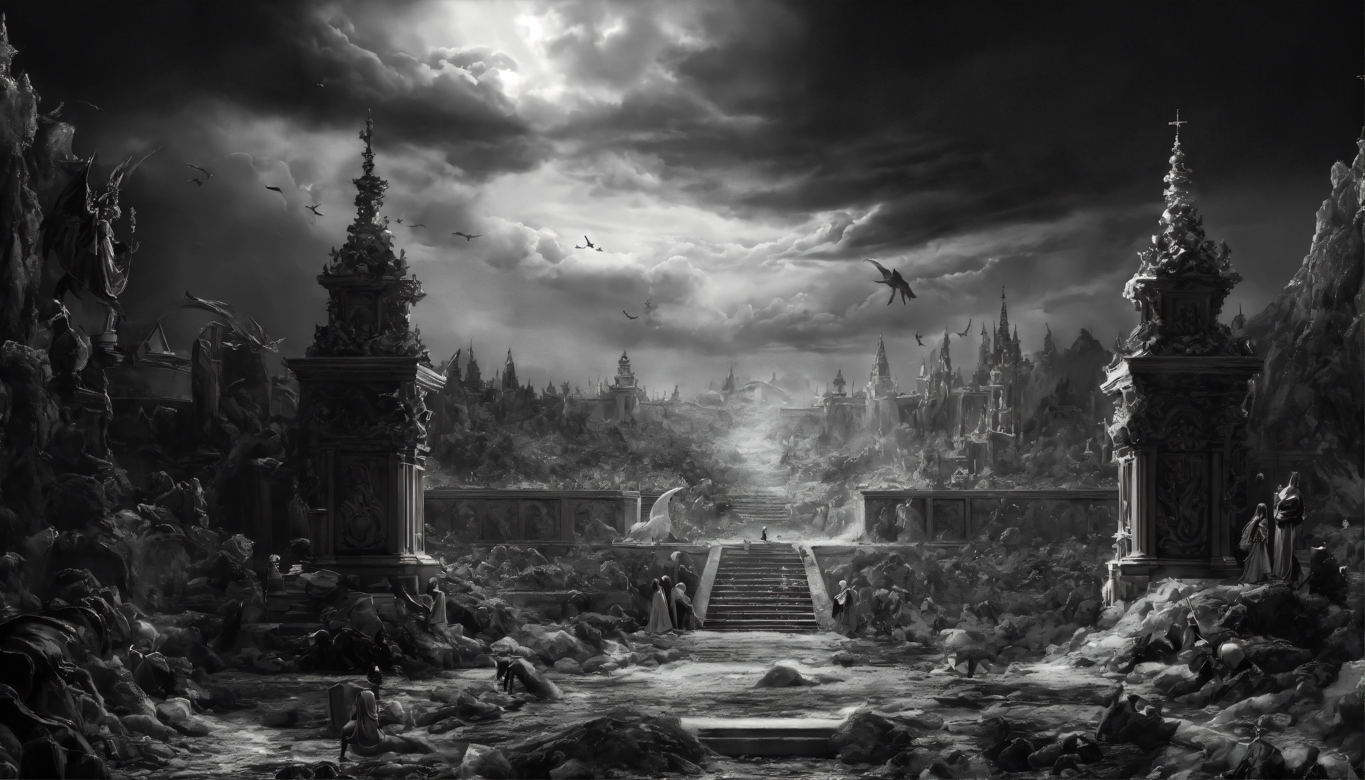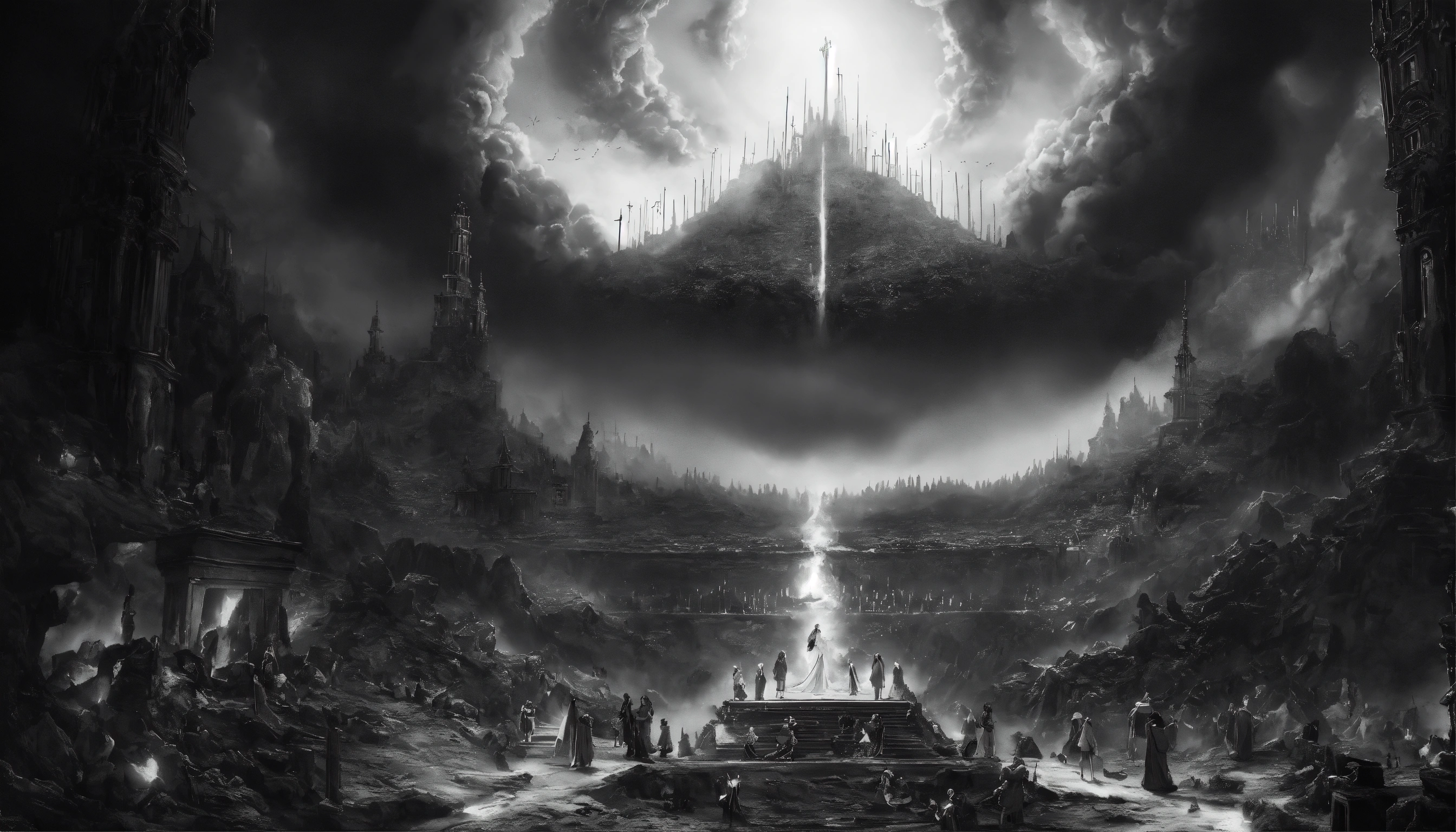 A representation of heaven and hell, mysterious, beautiful, magical, edgy art, highly detailed, 8k, hyper realistic, black and white, more focus on the black areas in hell and more focus on white areas in heaven