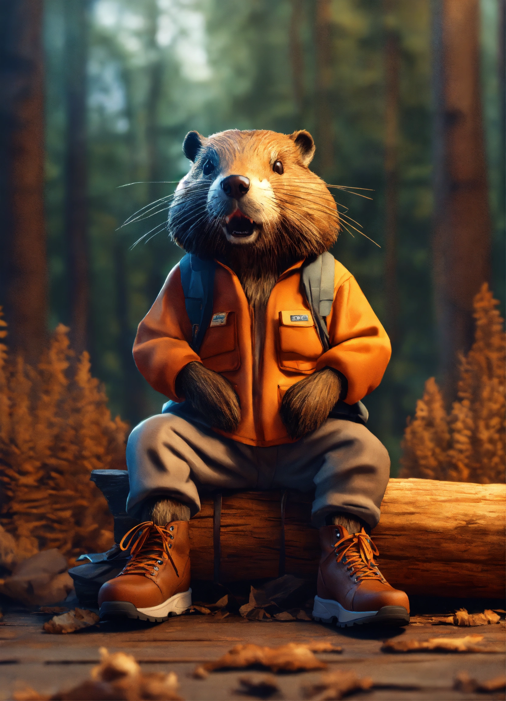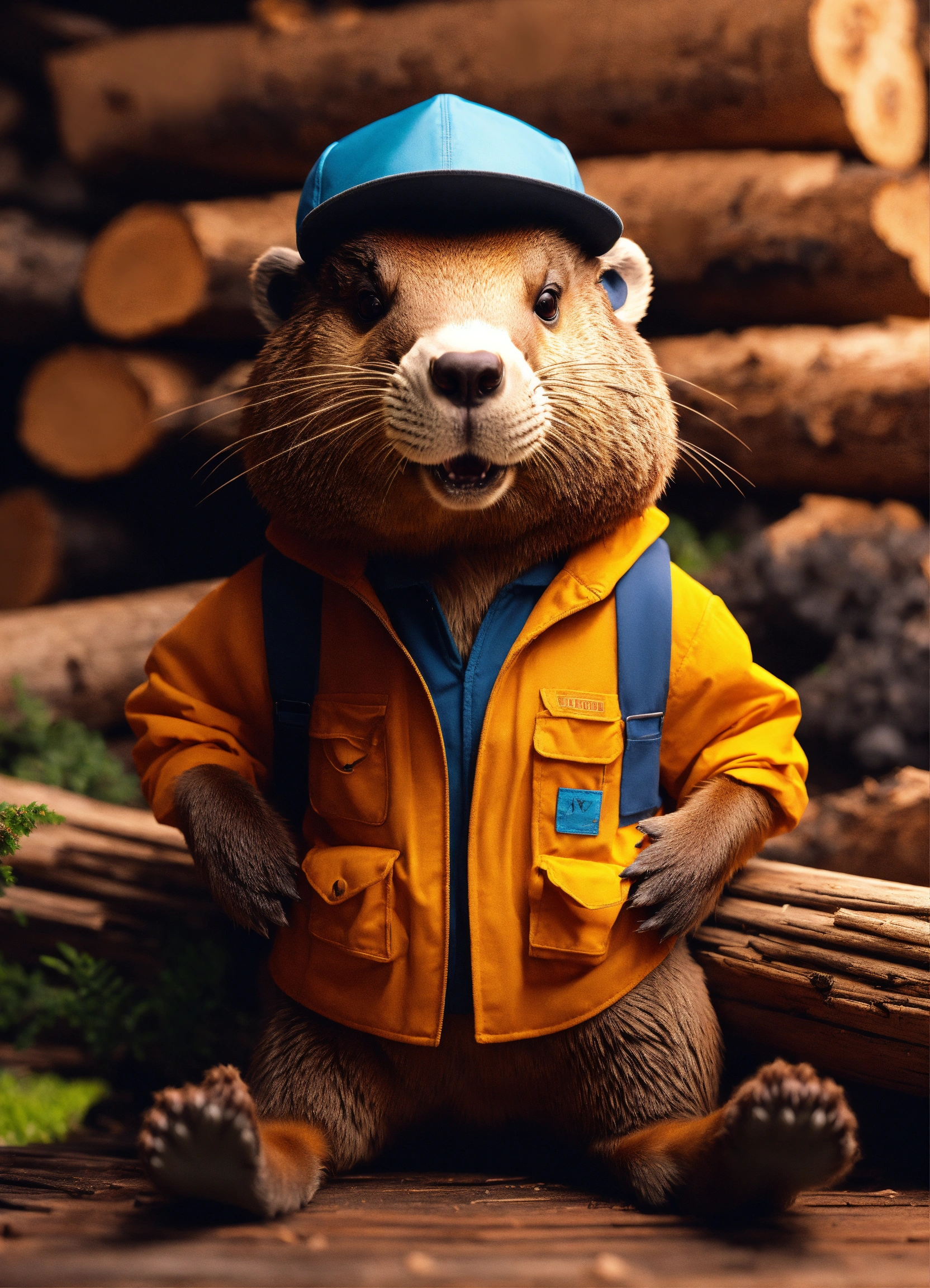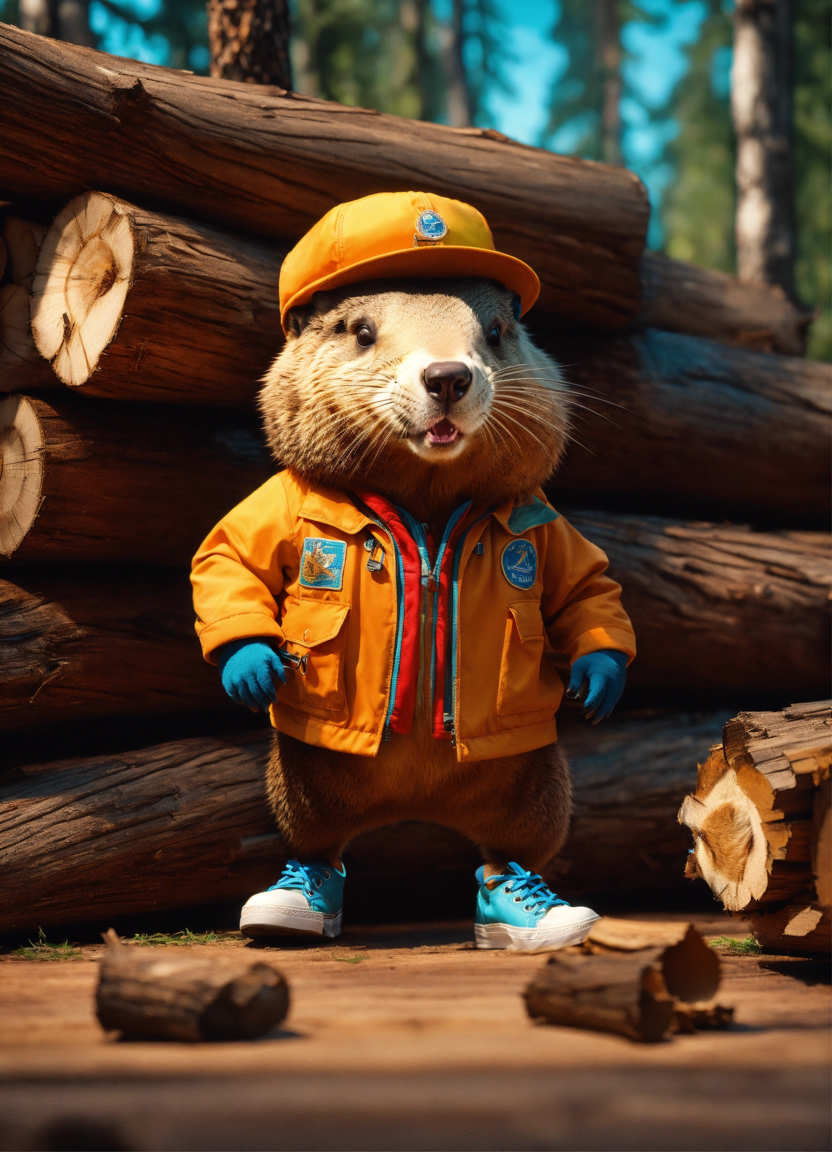 Extremely realistic beaver. in work clothes. in sneakers. against the background of sawn logs. volumetric lighting, maximalist photo illustrations, 8k concept art, meticulously detailed, complex, expansive, fantastical.