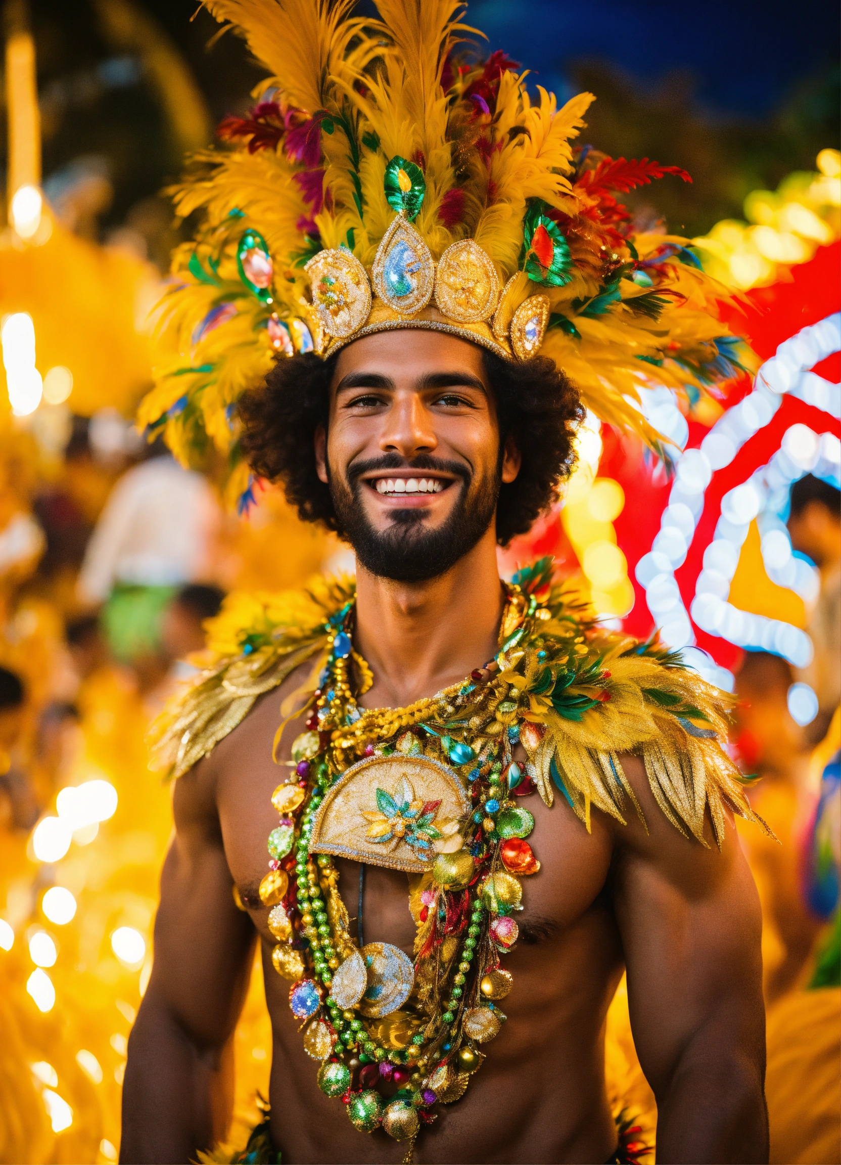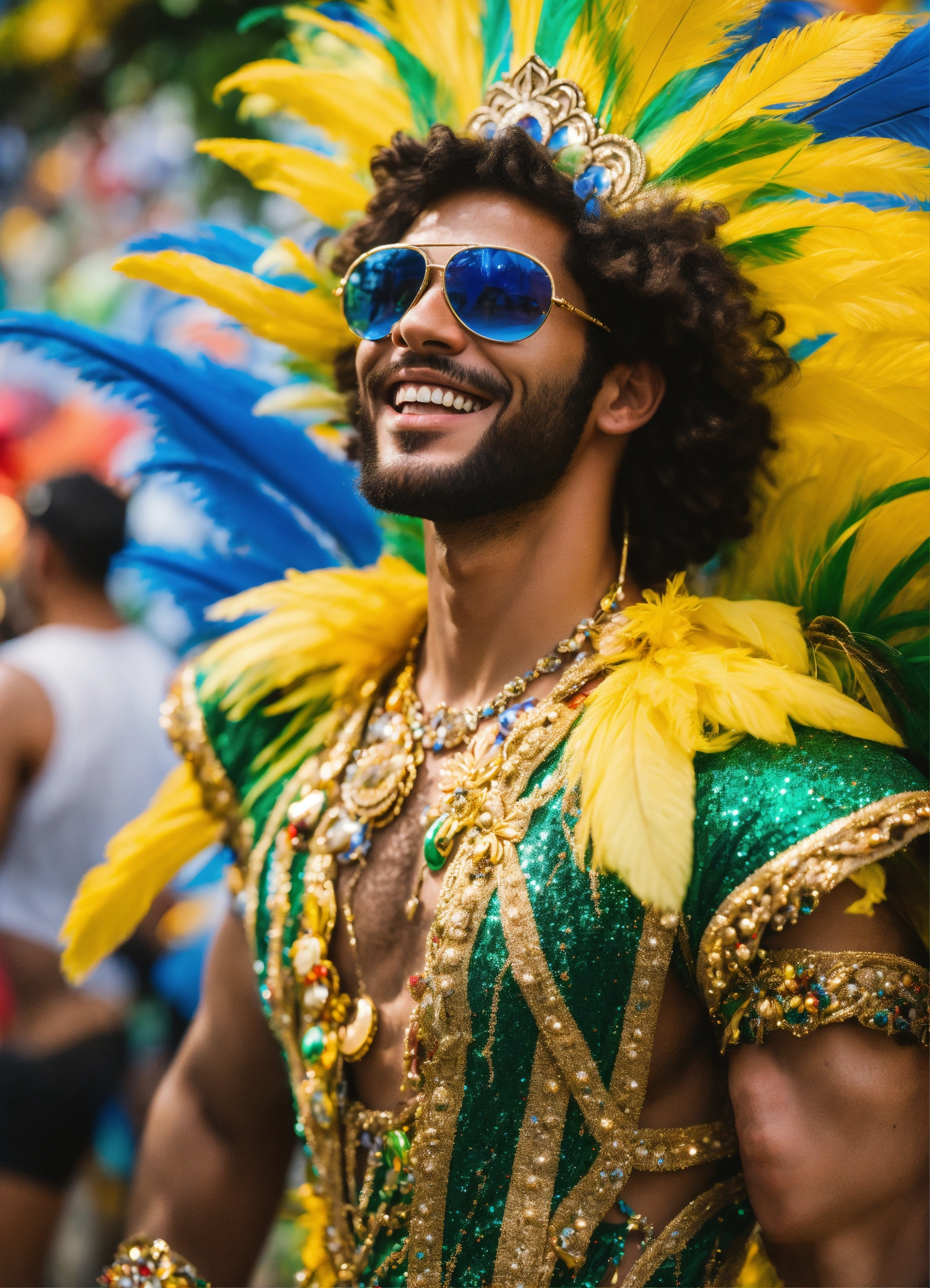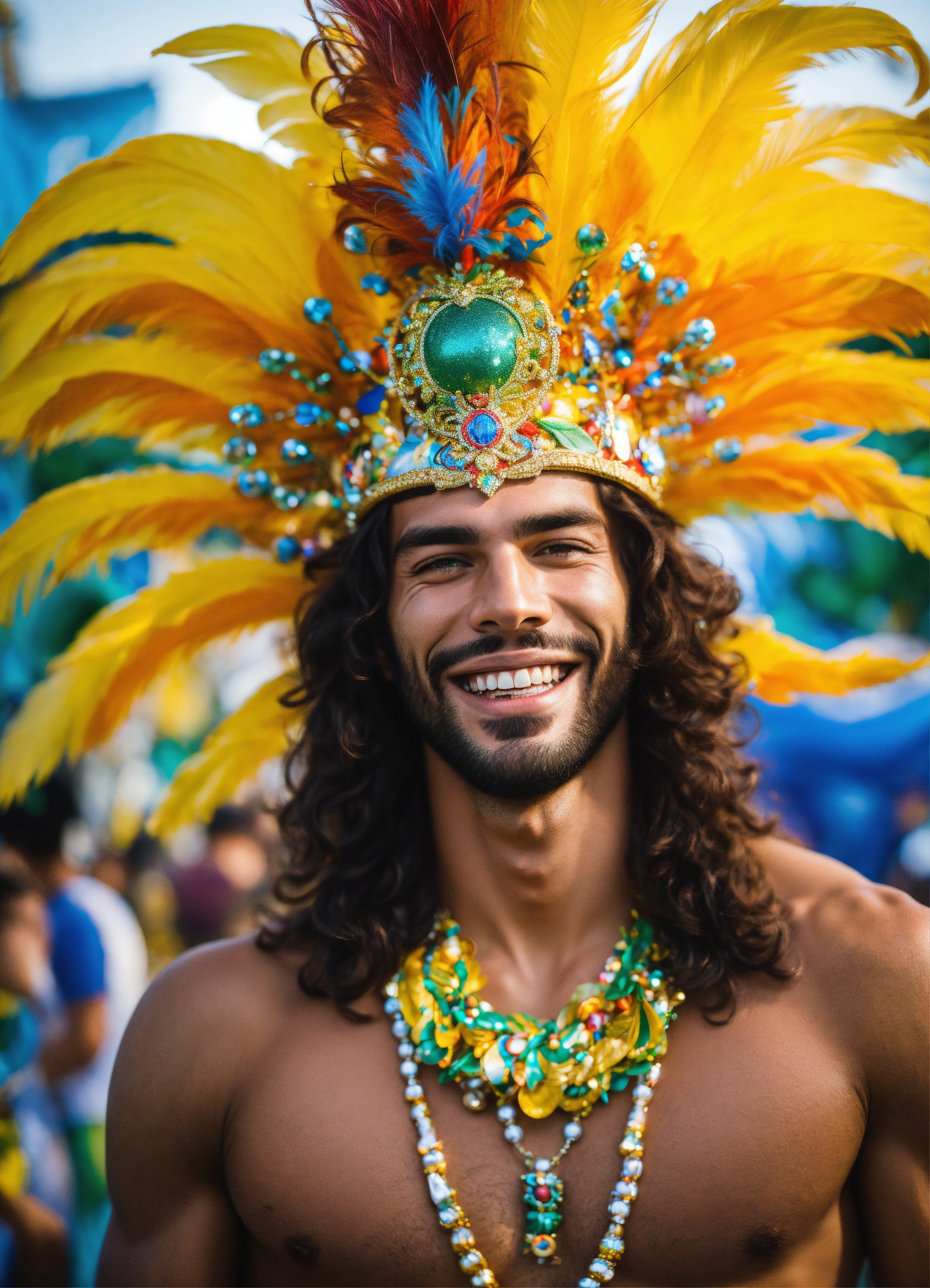 Photo essay of ver happy handsome male brazilian model, carnival background in rio de janeiro, professional photo, 8k, ultra detailed