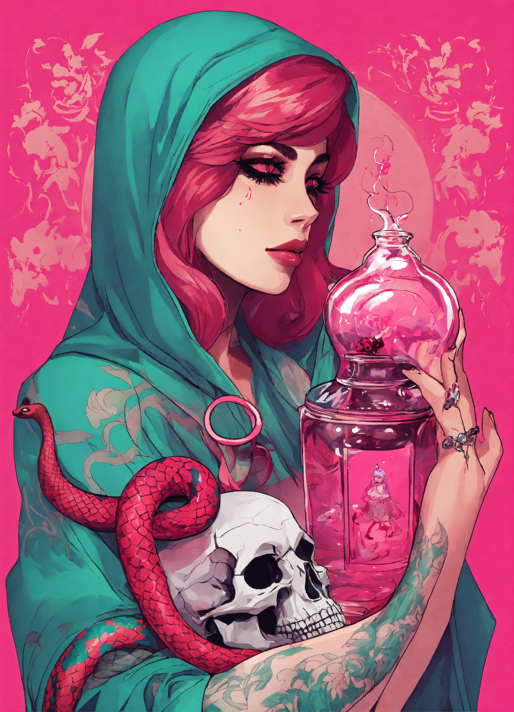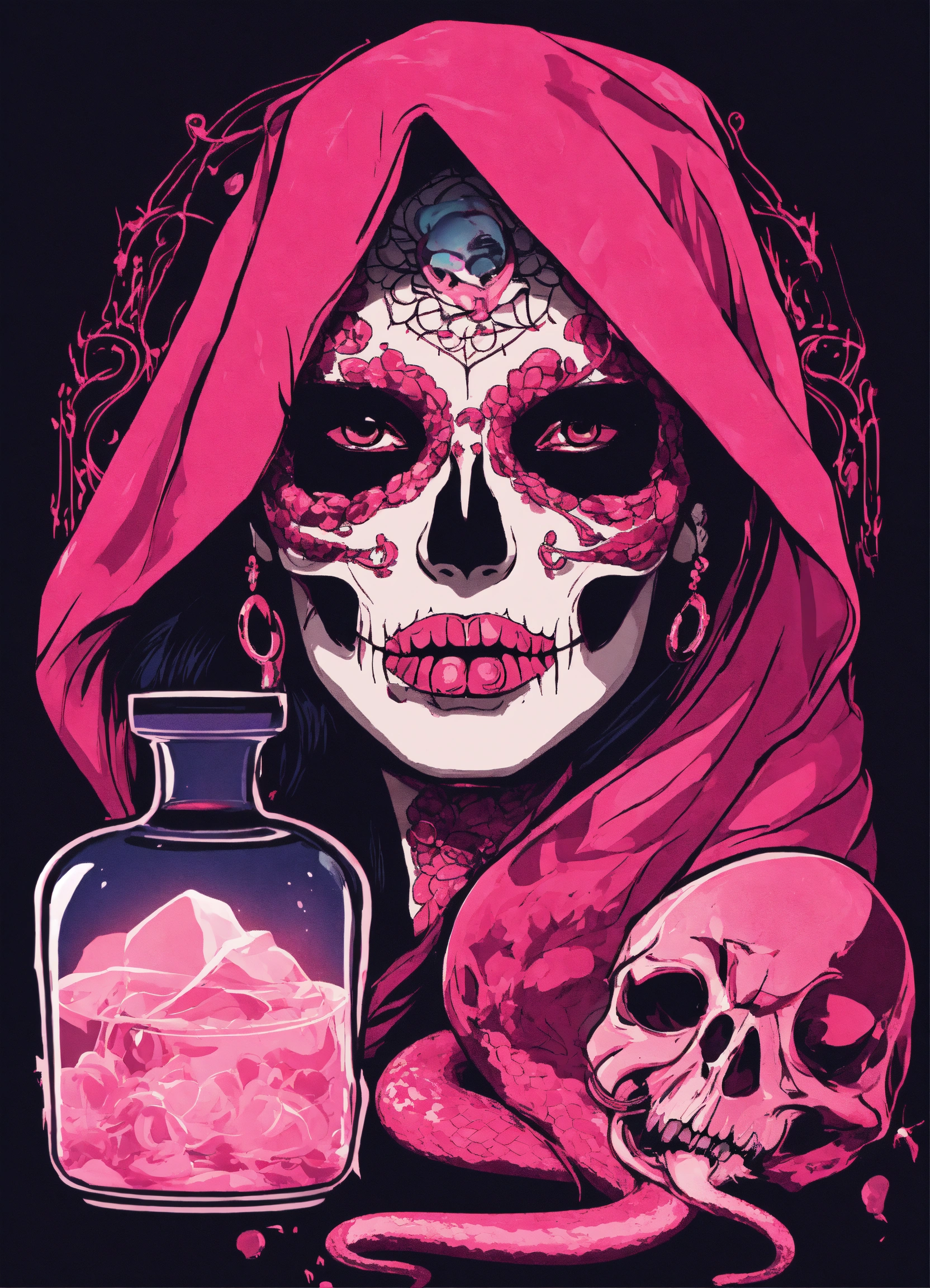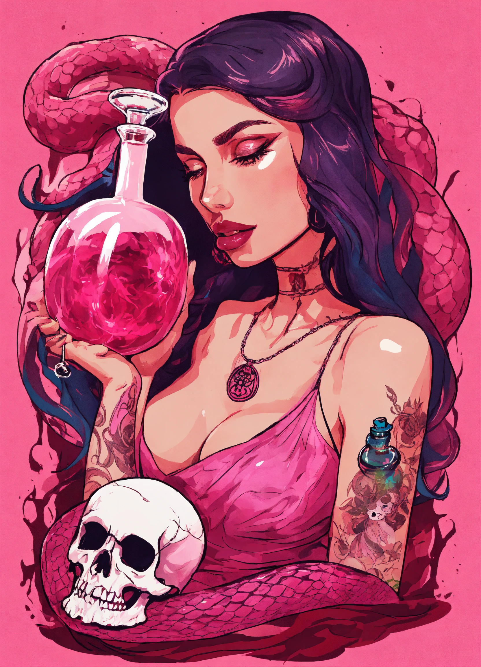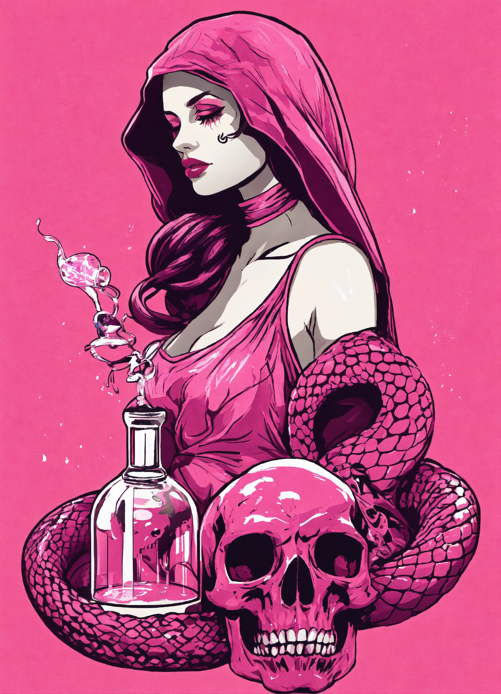 Snake inside a pink skull next to a woman with a white veil and a tattoo-style potion in her hand, vector