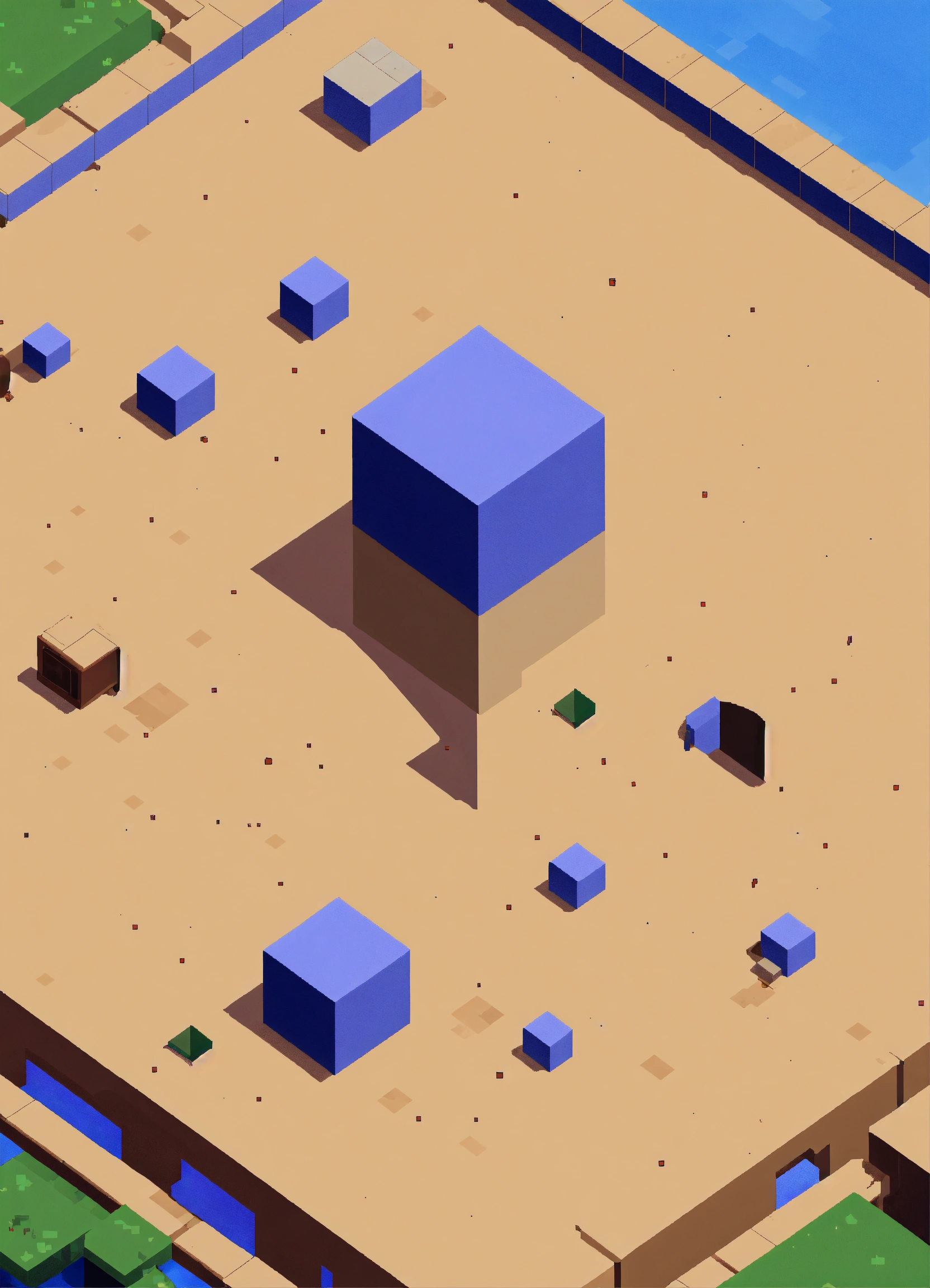 Simple blocky pixel image in a 3/4 top-down perspective with the central focus being a wide, barren slab of concrete, the center and majority of the image should be mostly devoid of objects.