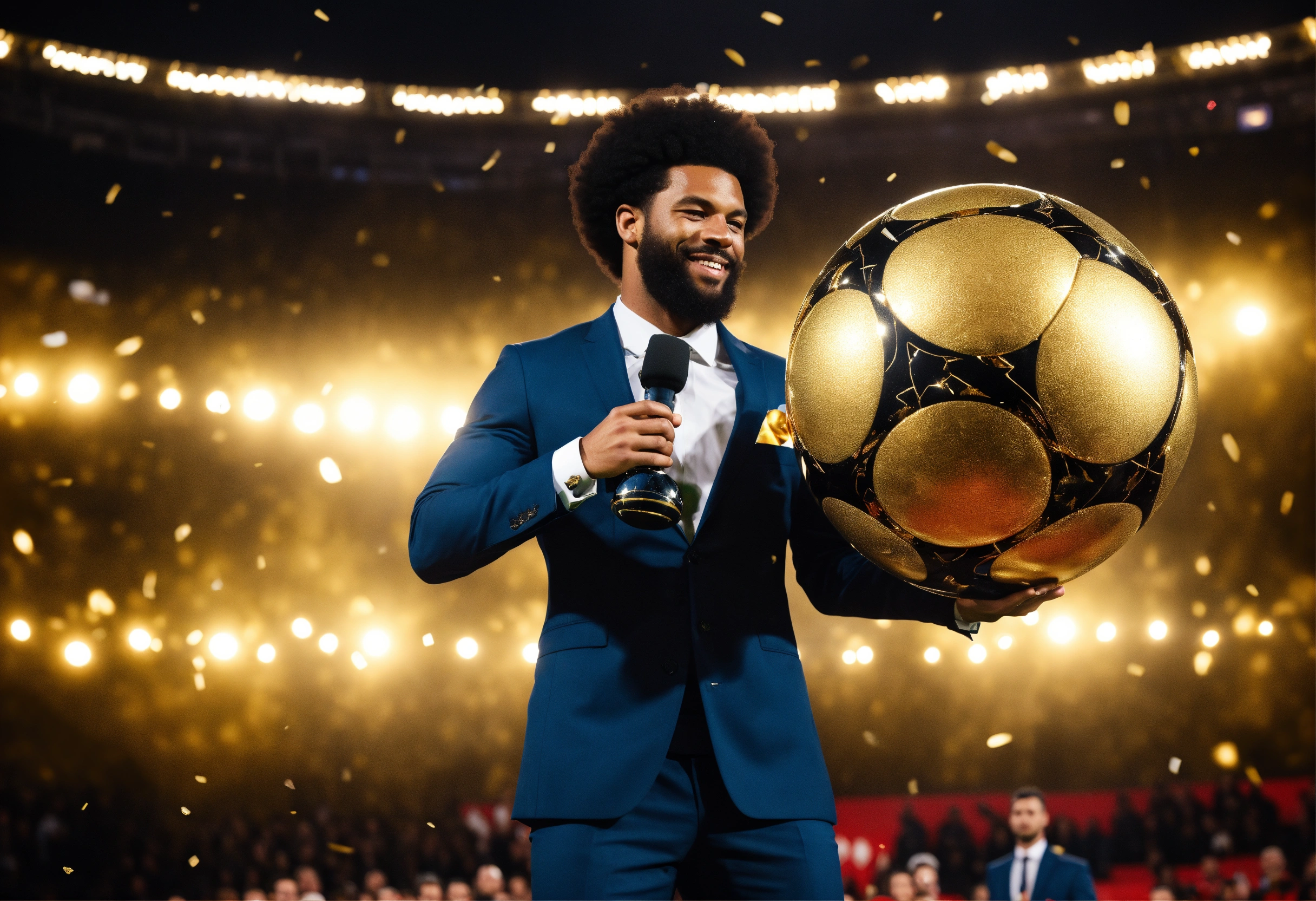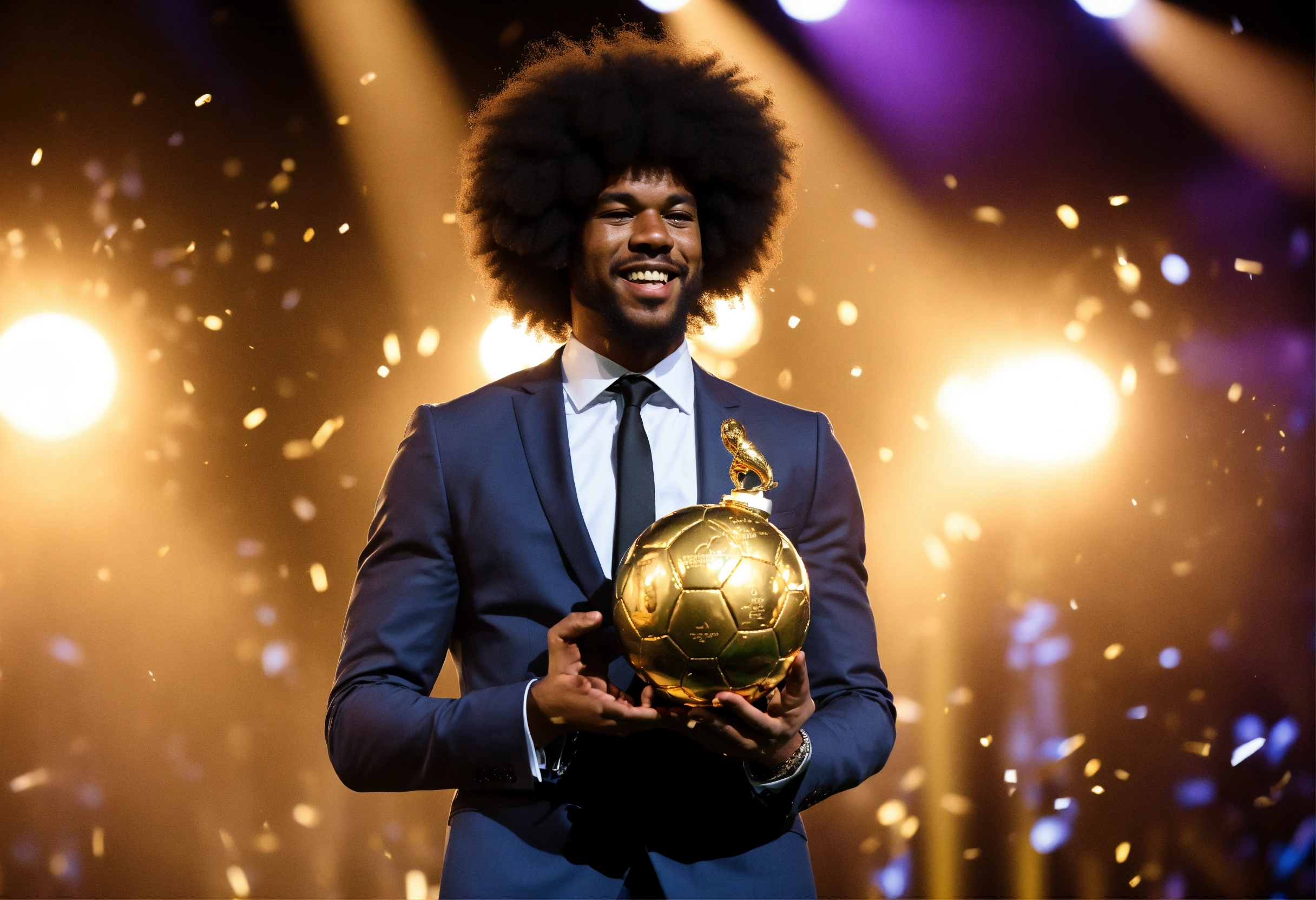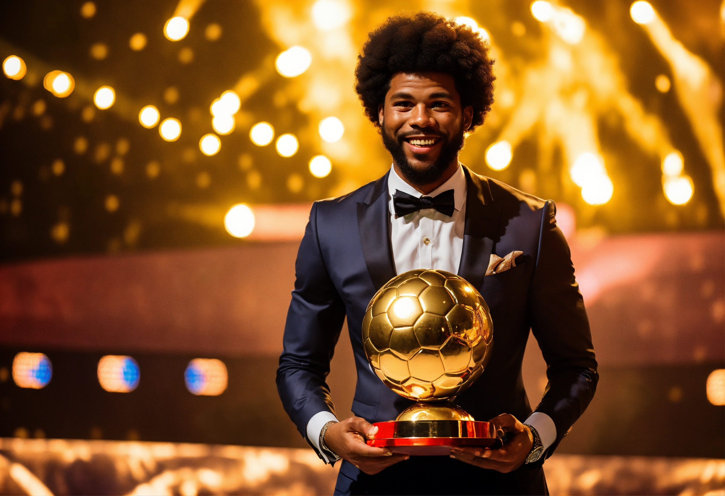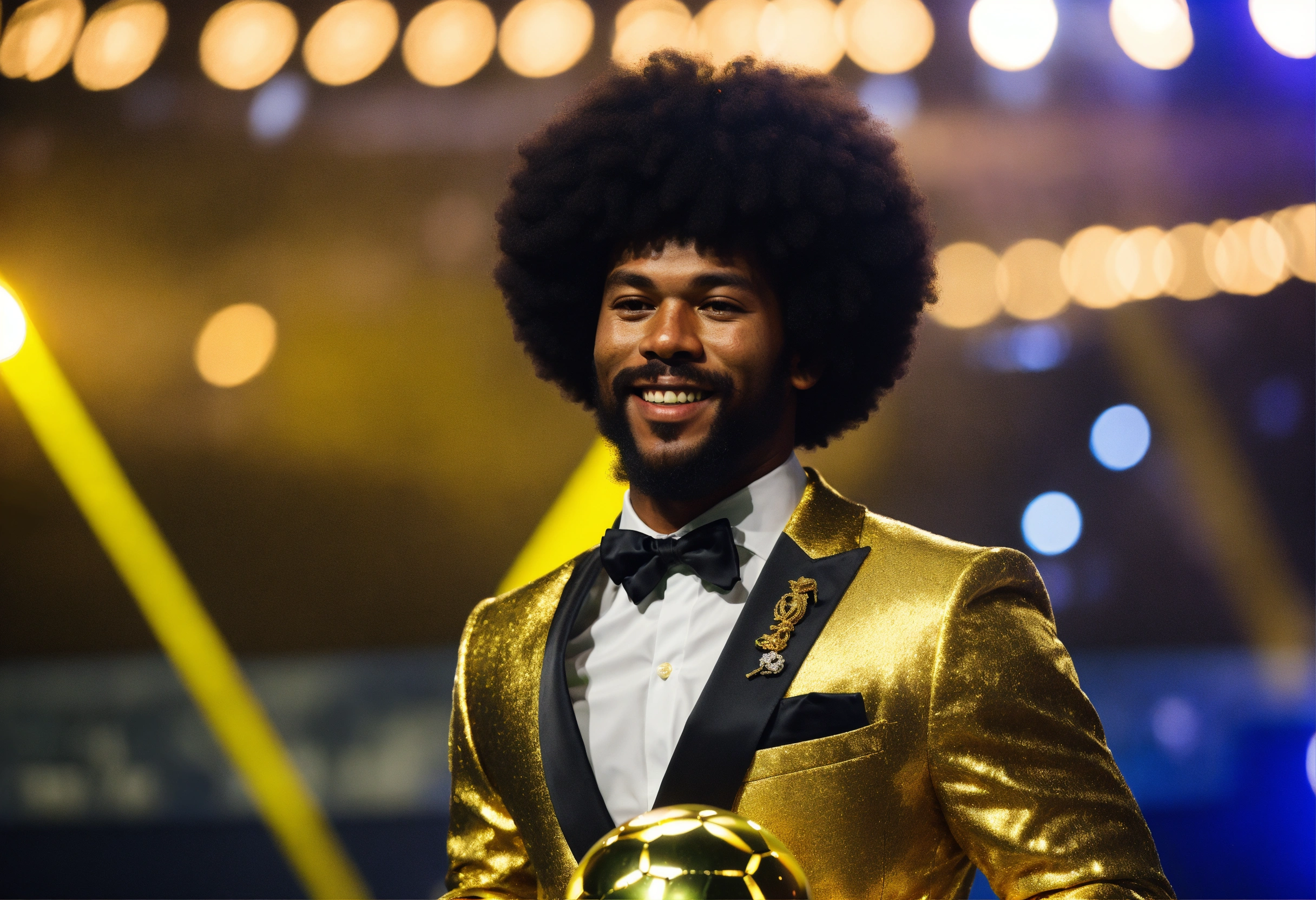 Awarding the golden ball to the best football player, on stage, half of the body is visible, a cute man in a suit, black hair, afro man