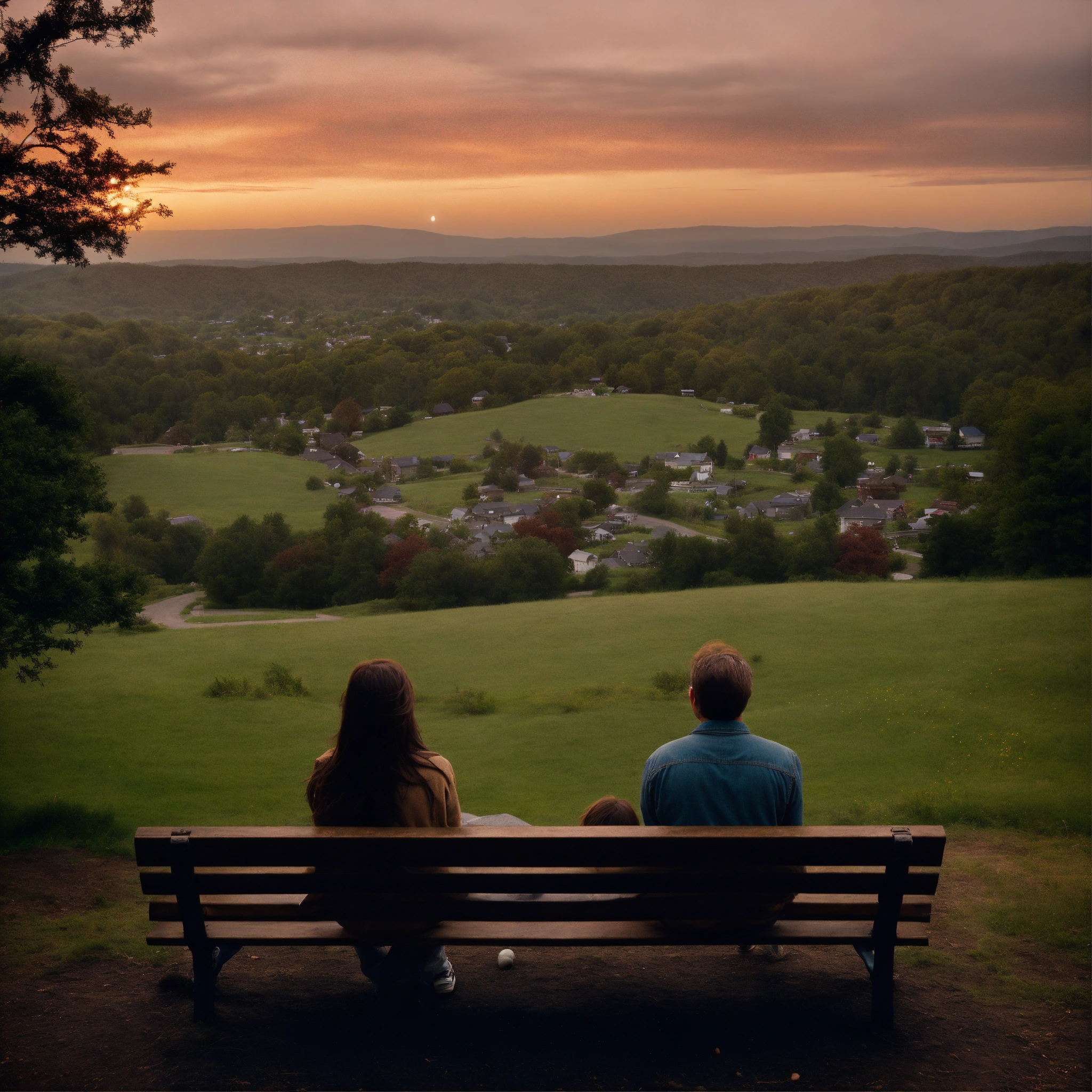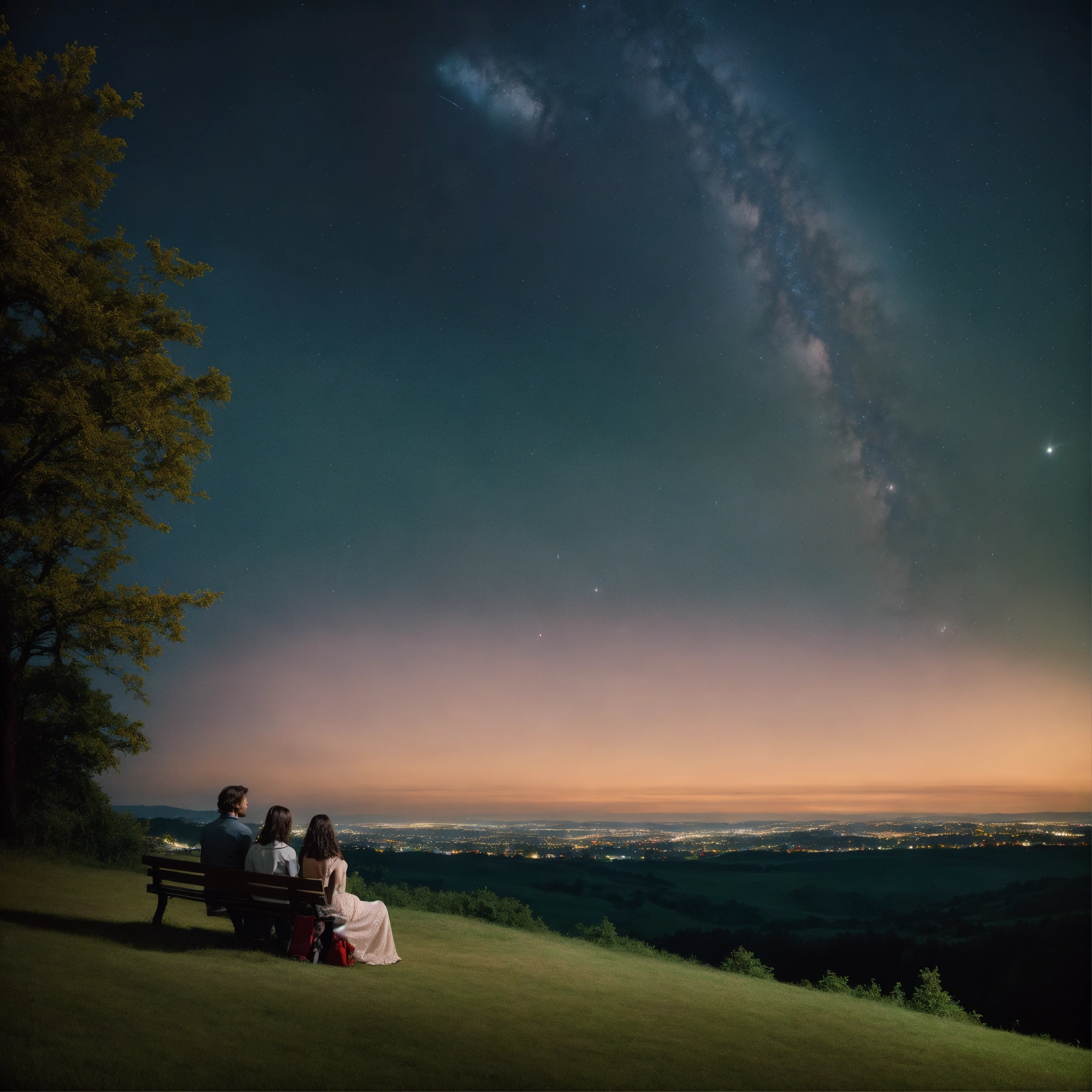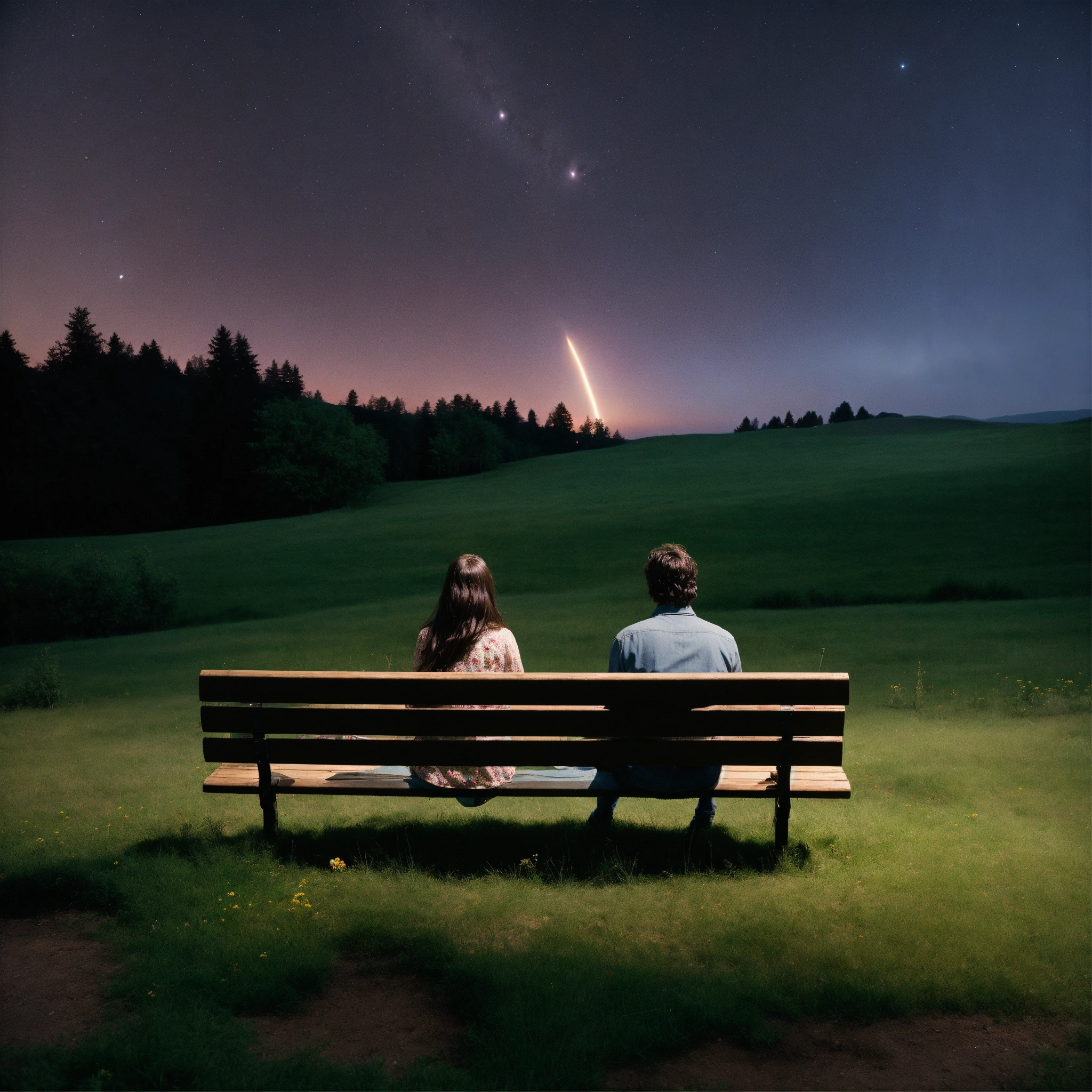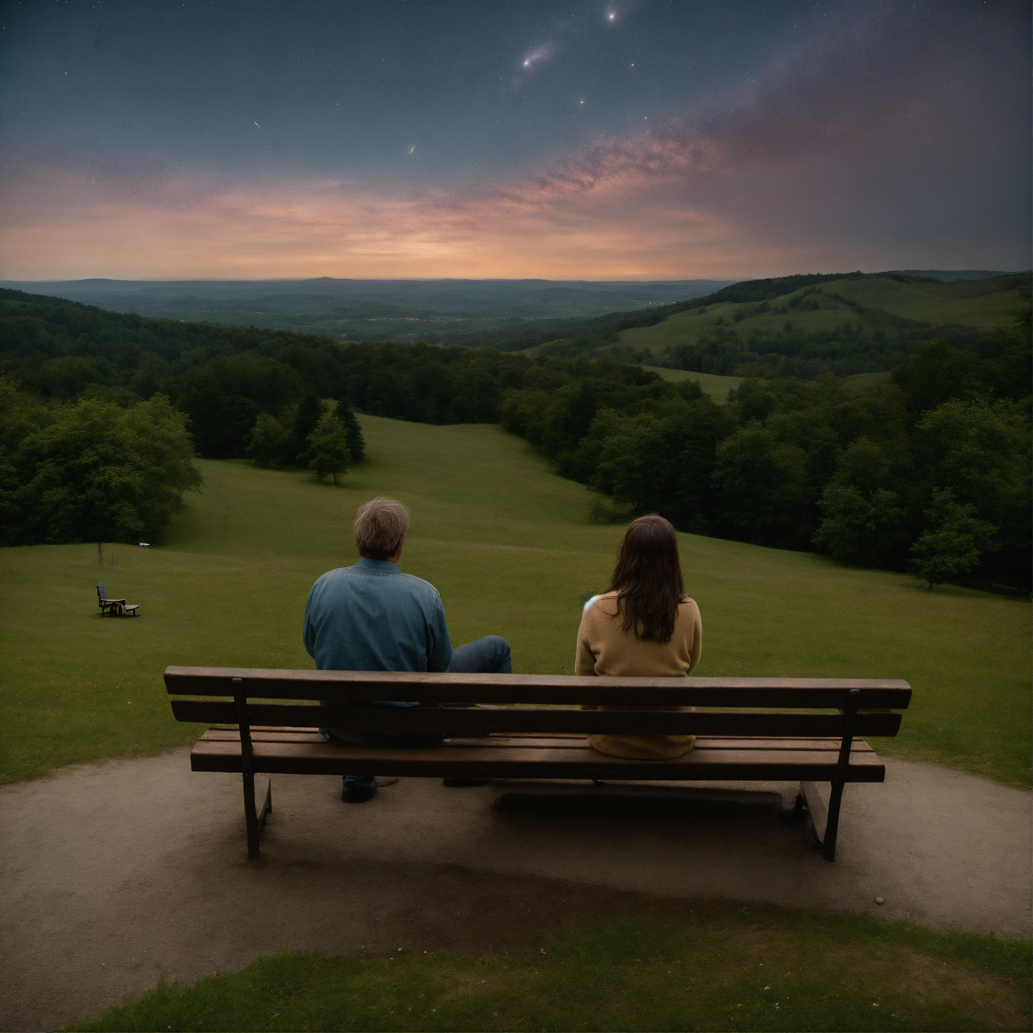 A woman with long brown hair and a man with short brown hair sitting in a bench seat on a hill looking out to outer space, wide format gregory crewdson style photography