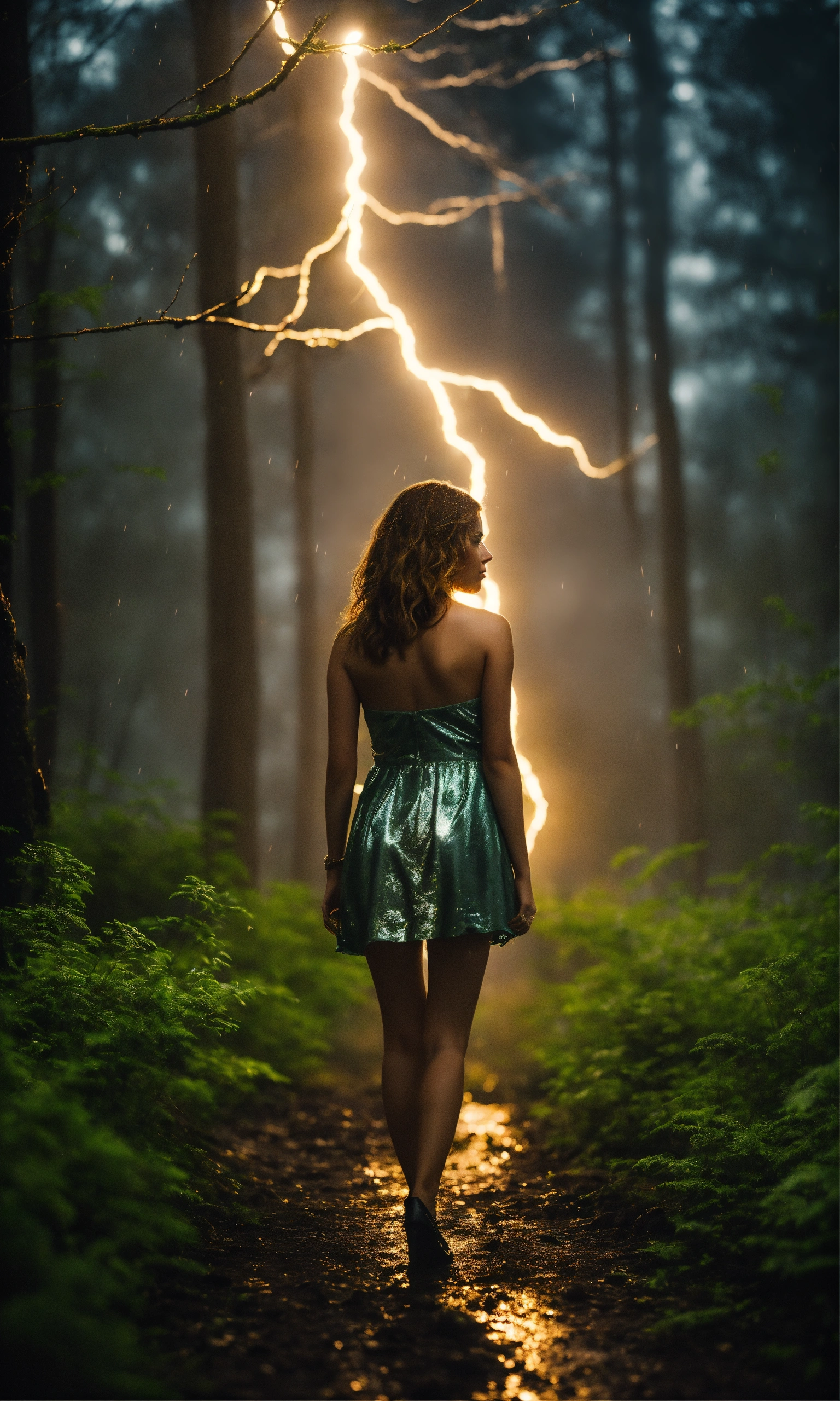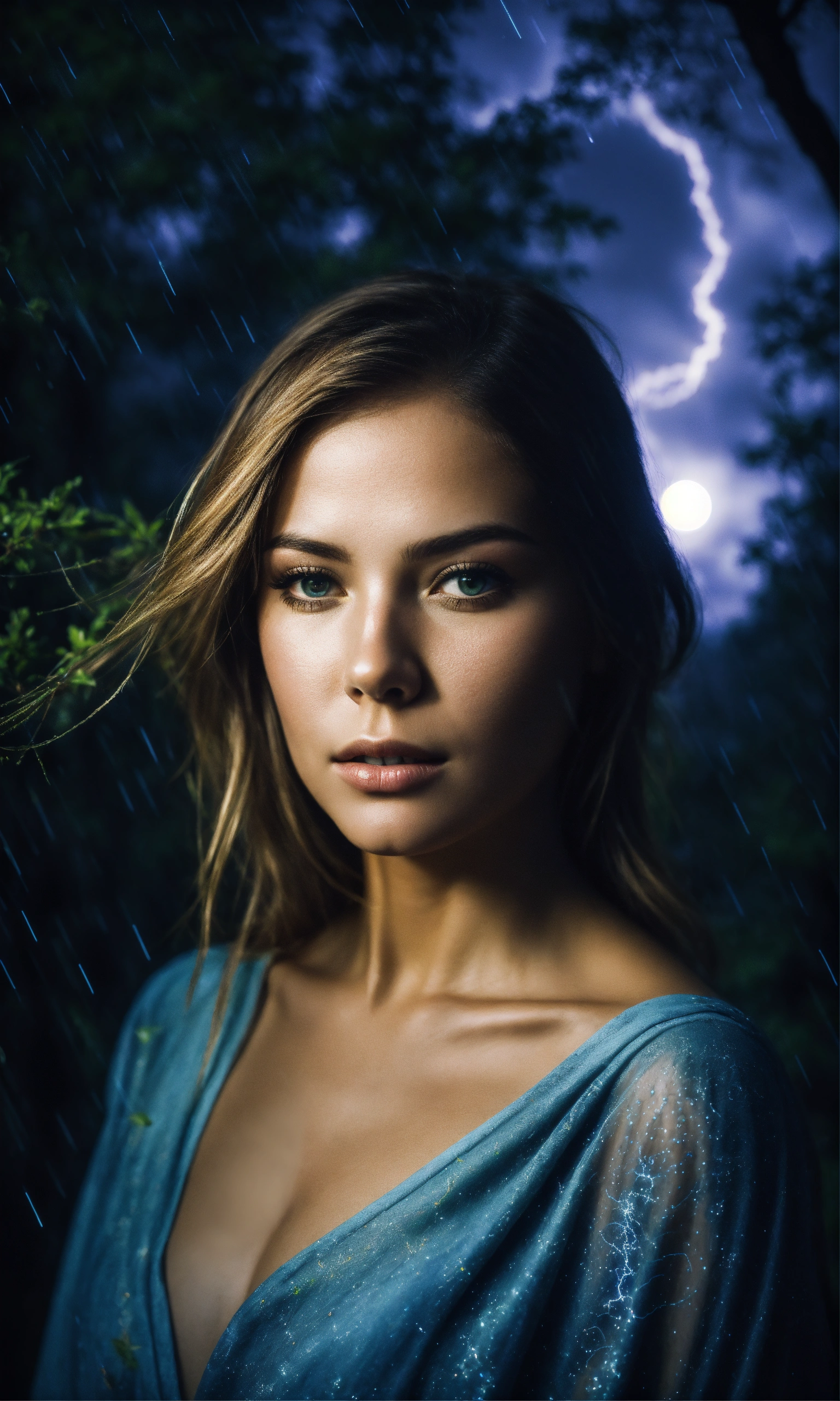 A photographic image close-up of a beautiful woman in a lightning storm, standing in a moonlit forest at midnight.