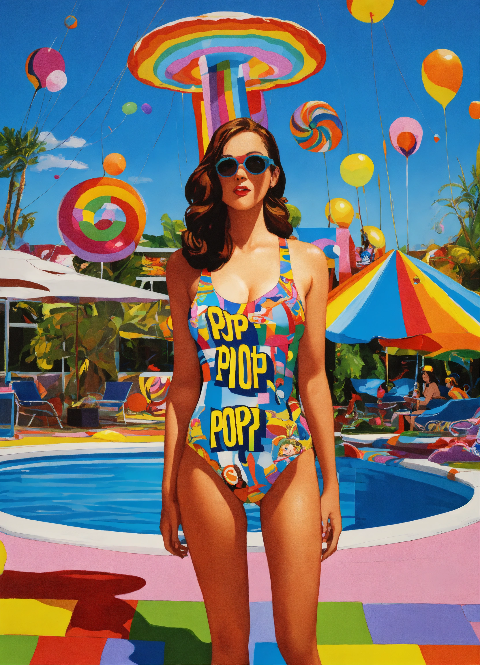Woman wearing a swimsuit with the text "pop" in a candyland, rainbow, surrealistic pop art, pin-up, synthwave, roy lichtenstein, john burgerman, andy warhol, carl barks, gil elvgren, ultra hd, john burgerman, larry carlson, dale chihuly, lisa frank. derek gores, oliver jeffers, bridget riley, robert oxley, georgia o’keeffe, eduardo kobra, lee quiñones, niki de saint phalle
