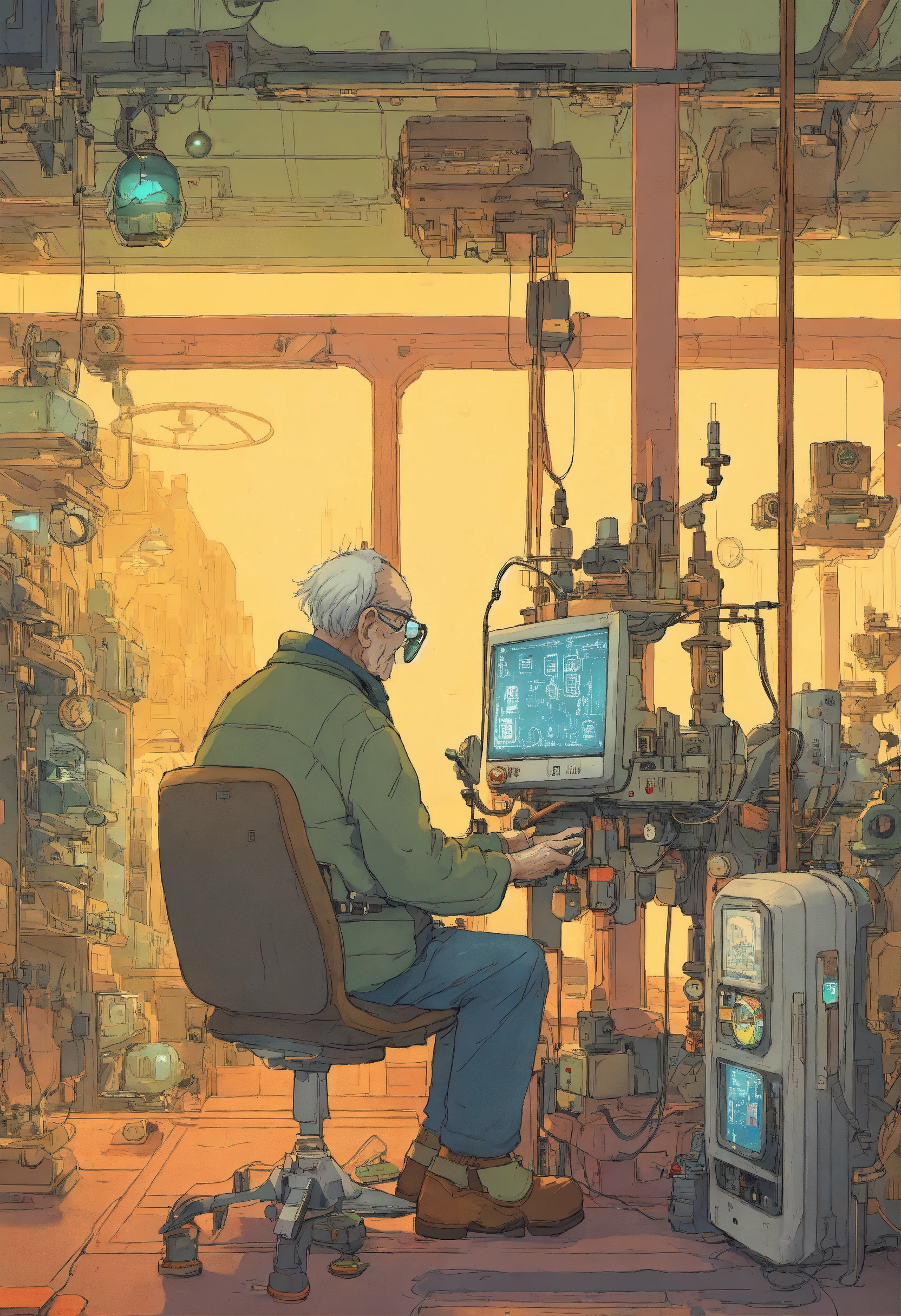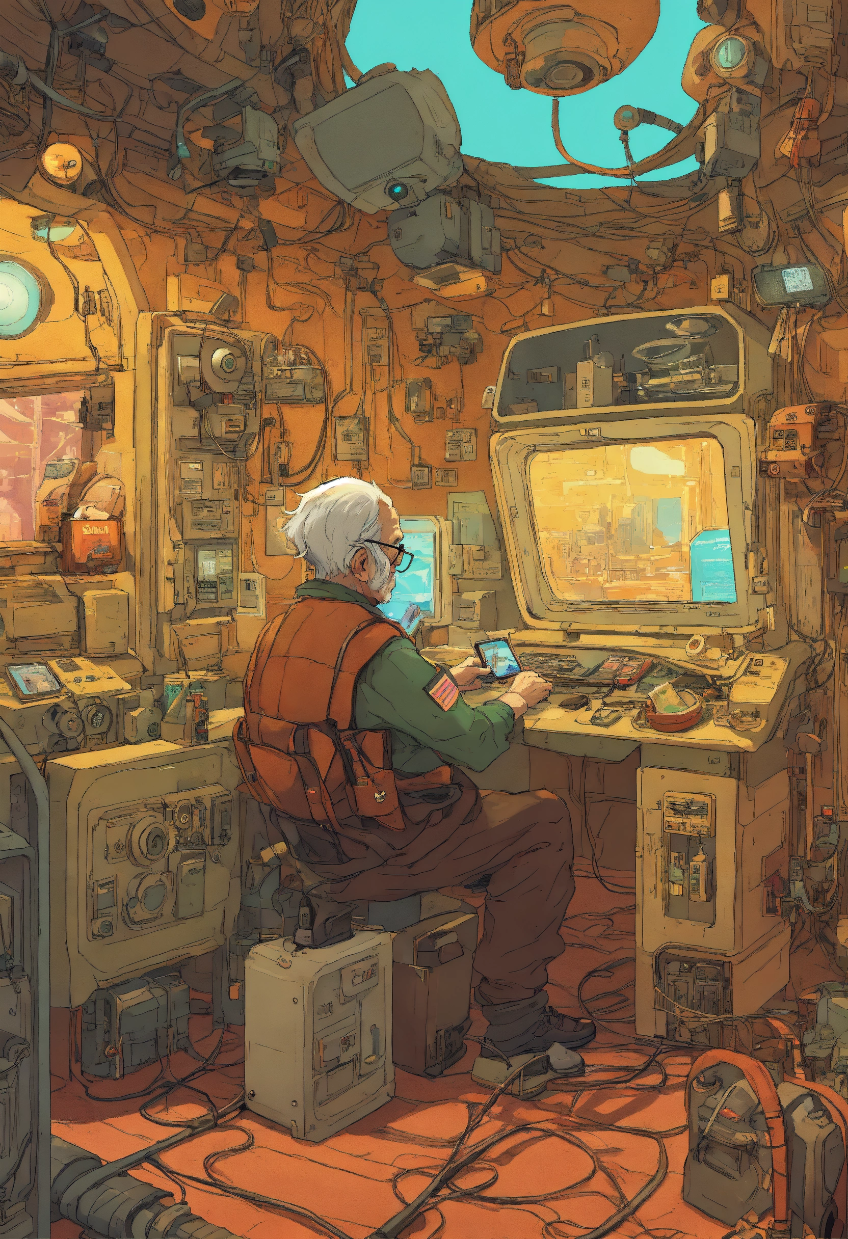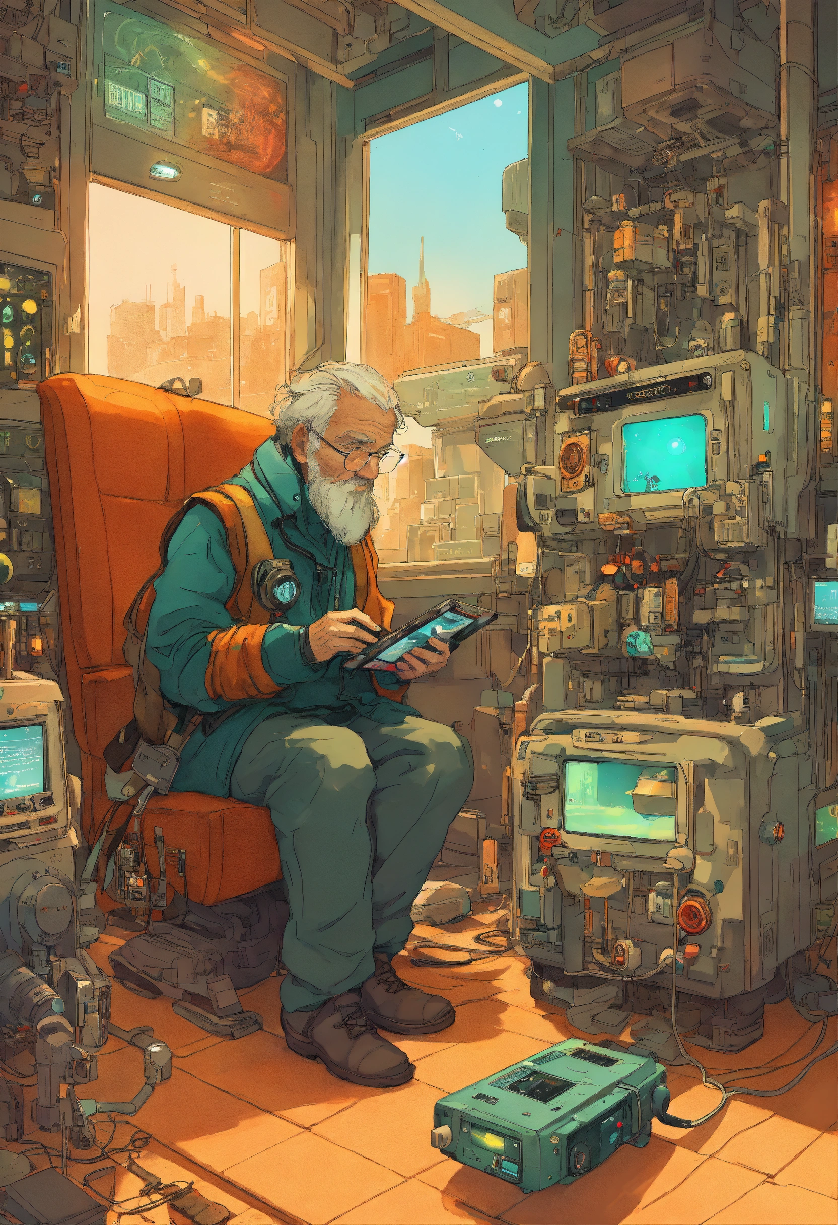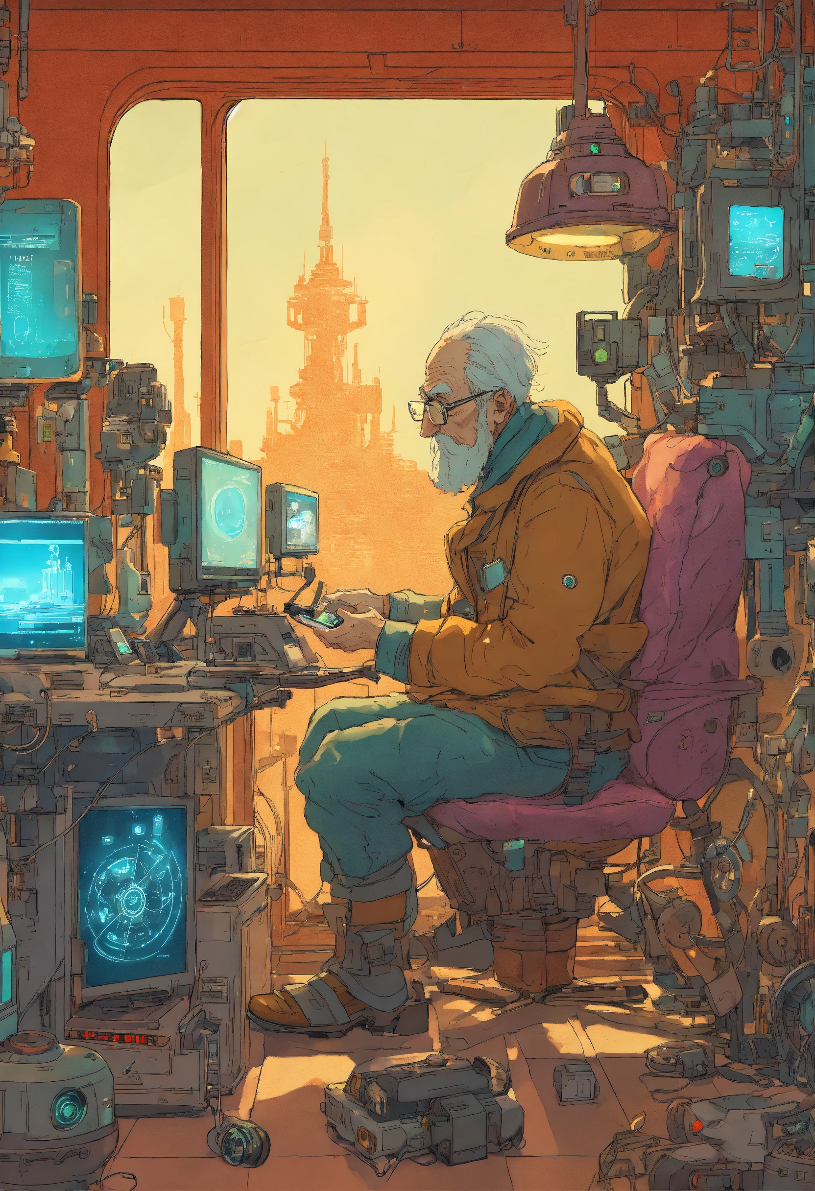 Futurepunk elderly man interacting with futuristic devices and gadgets that will change the way we interact with technology, the sci-fi ambiance should be filled with a colorful spectrum that creates an otherworldly feeling, the art style should be inspired by mattias adolfsson's work
