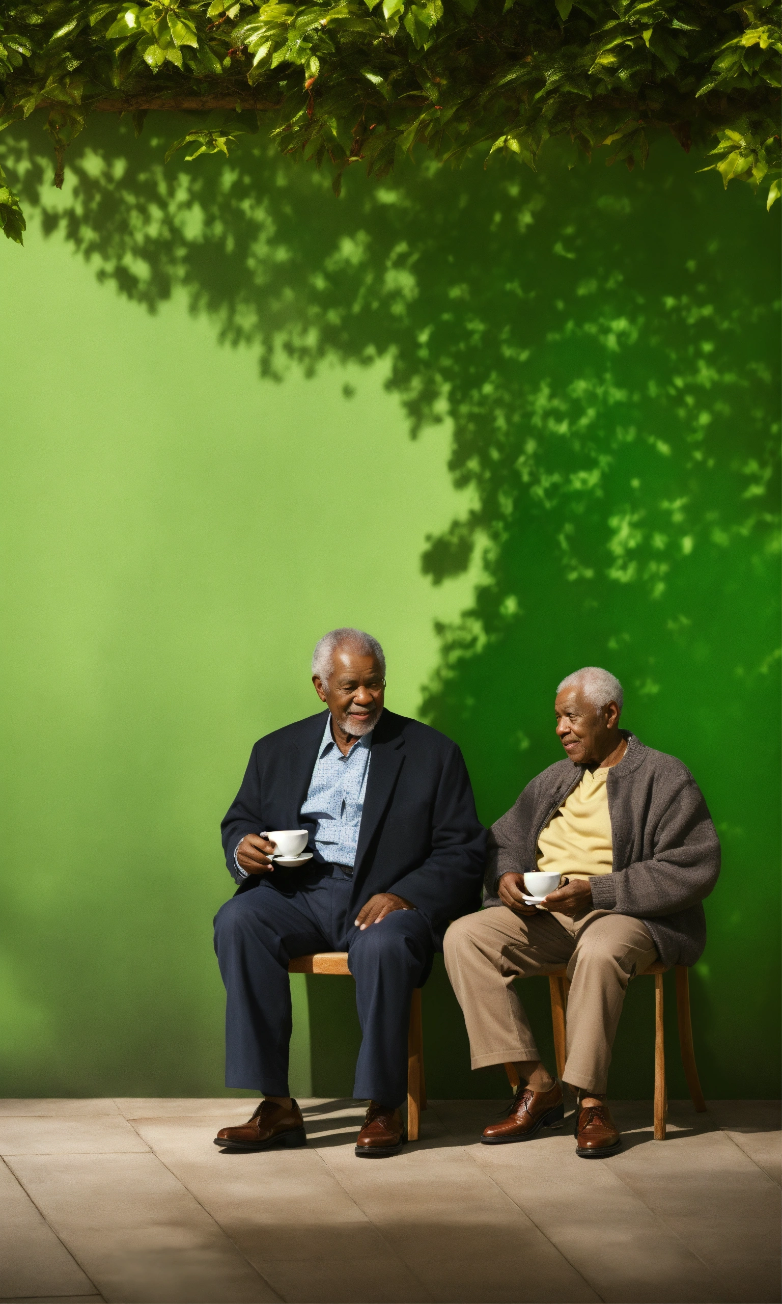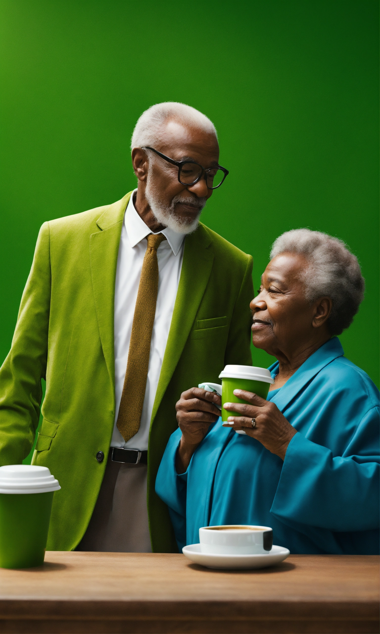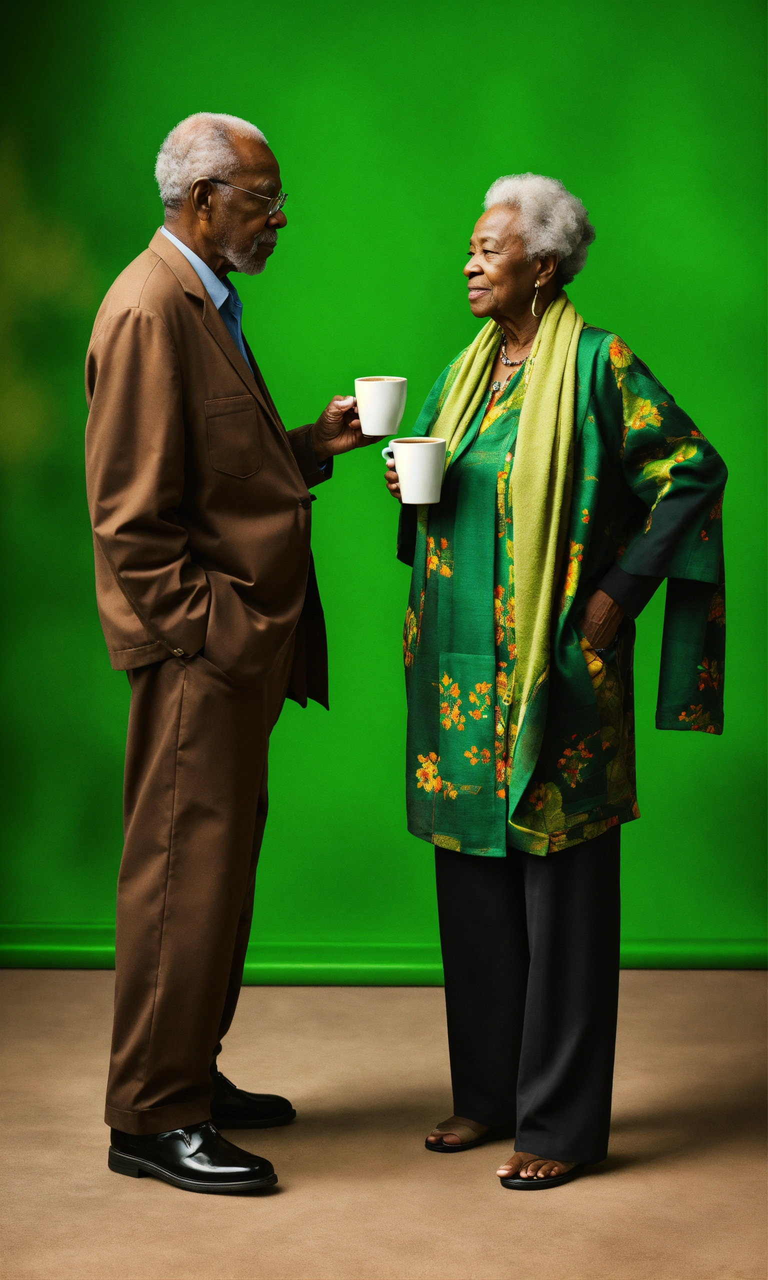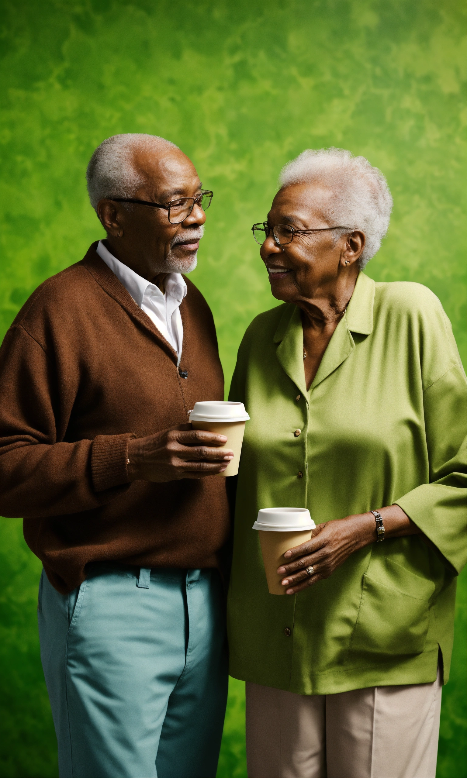 Two elderly black people standing drinking coffee hyper realistic green background
