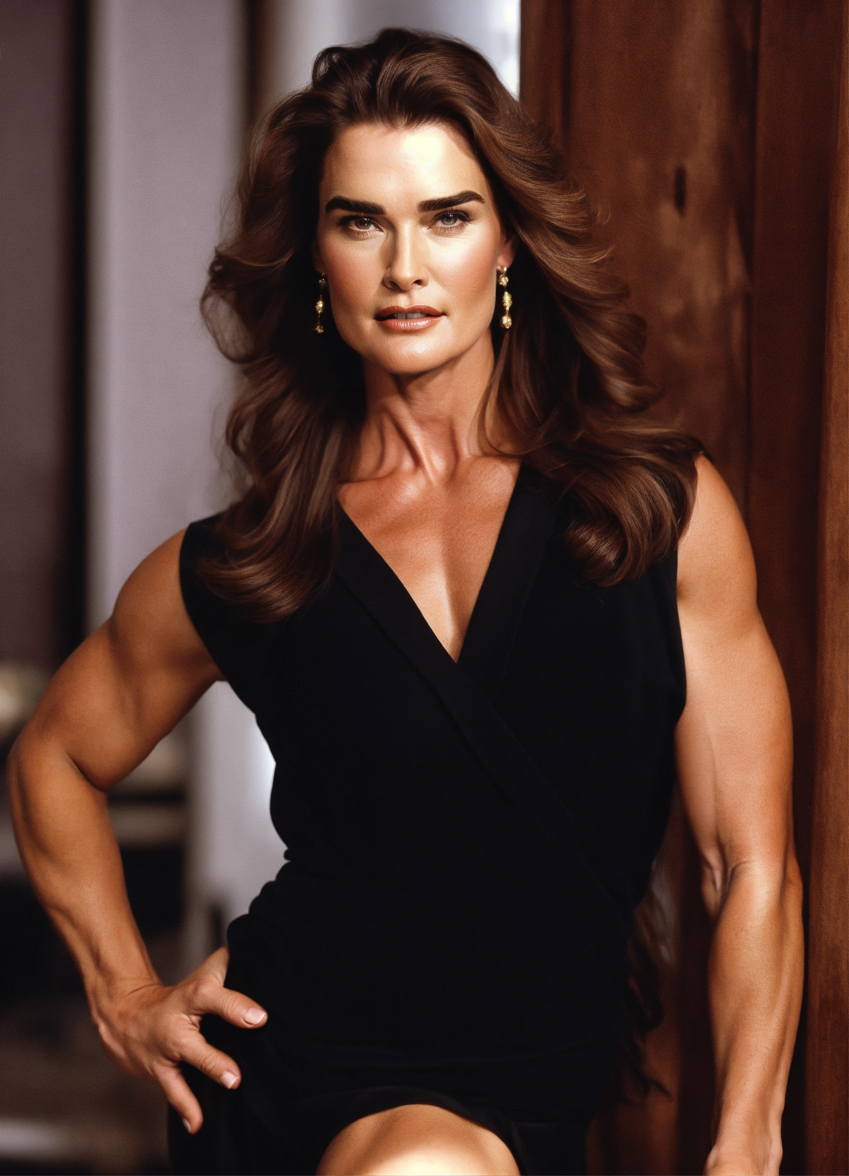 55 years old brooke shields dominant in heels, in a black skirt, towering height, 5 years of bodybuilding, powerful posture, lifting weights