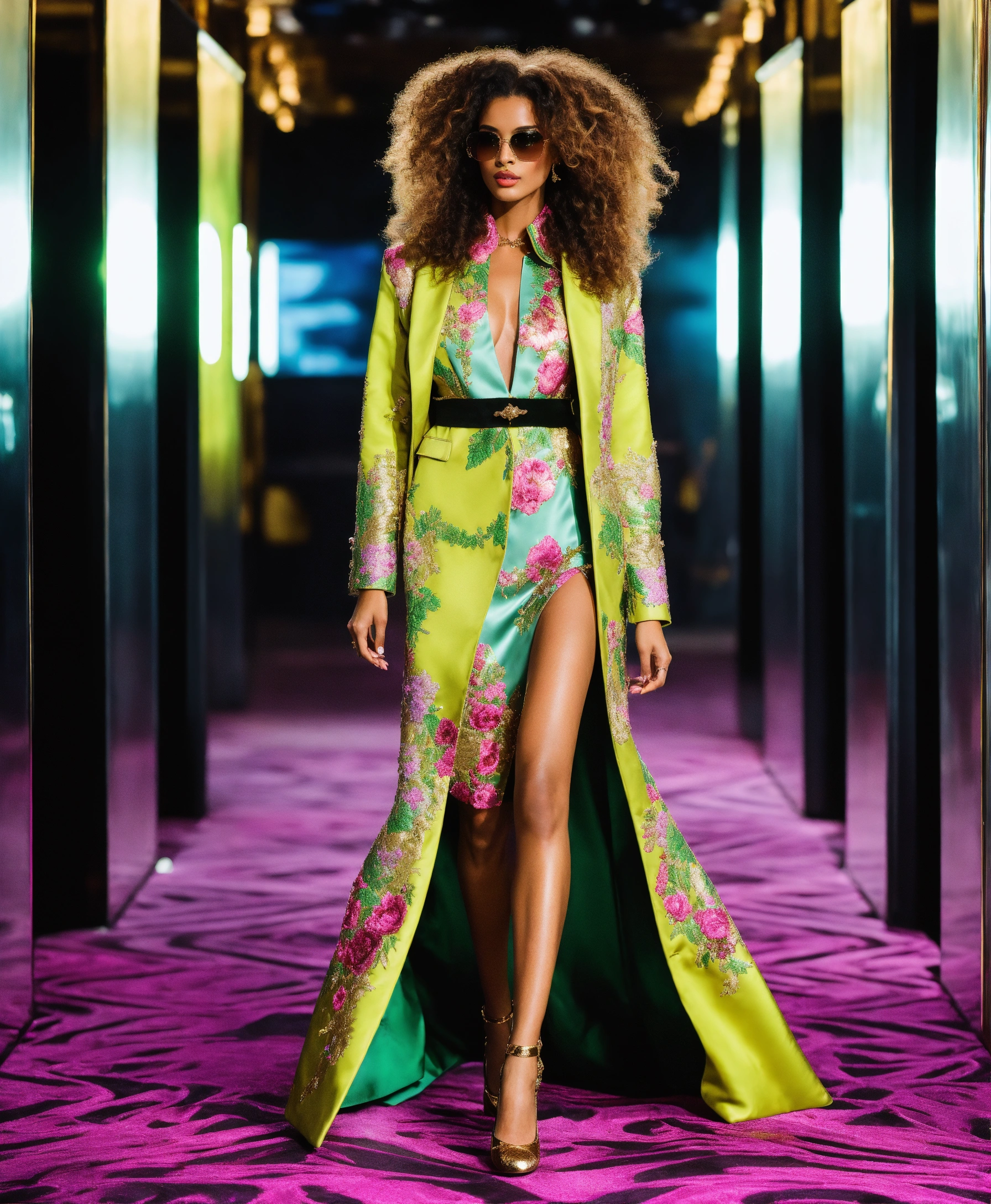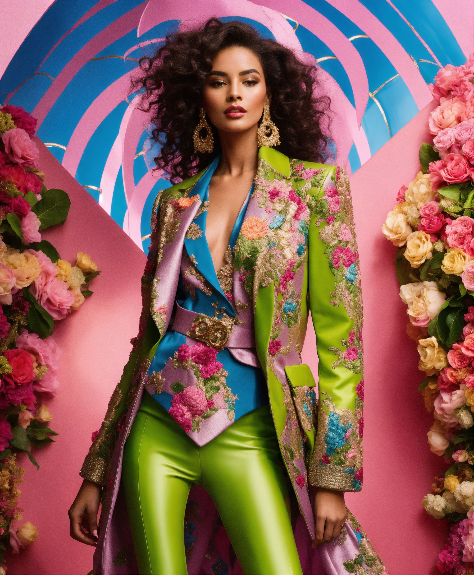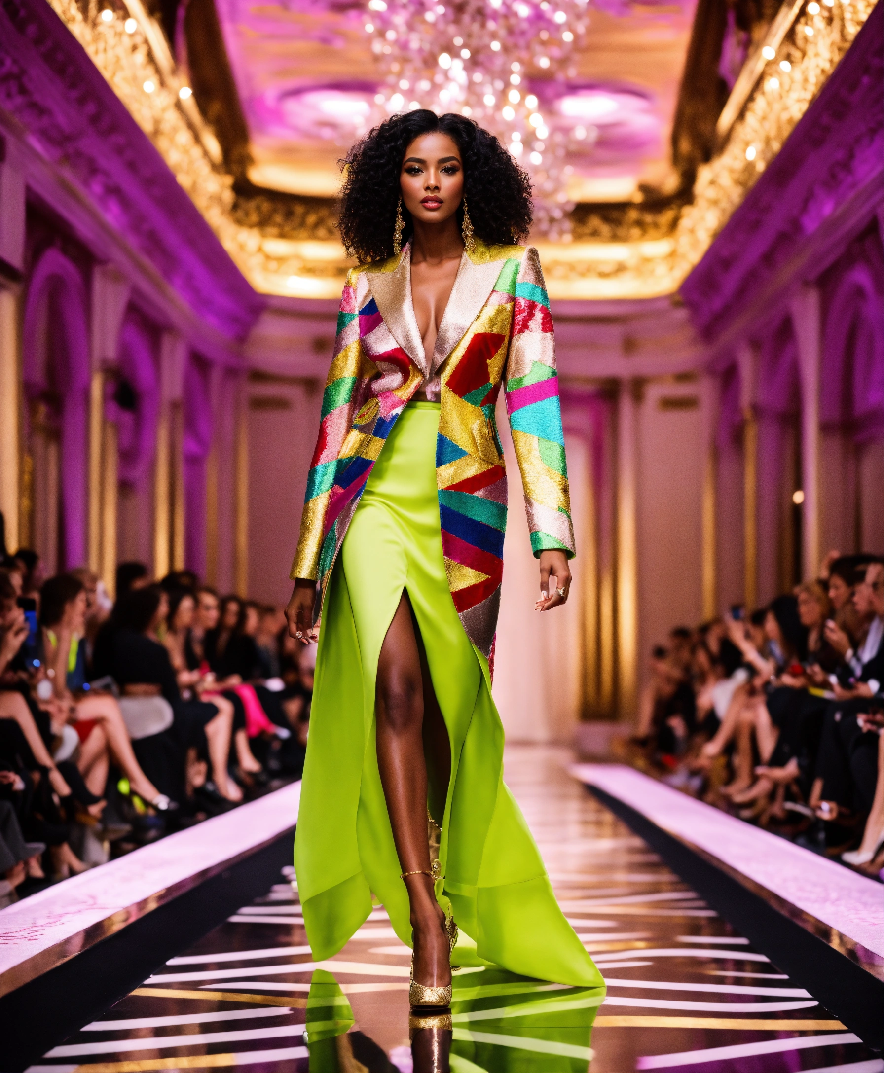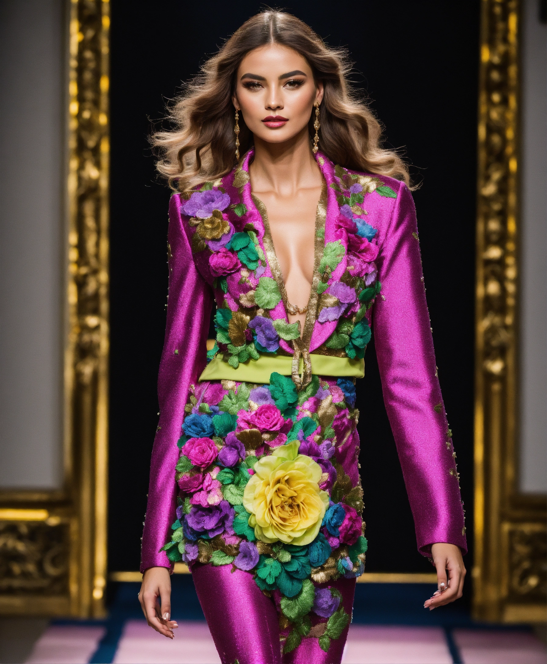 Ultra realistic full body photo of a stylish beautiful elegant supermodel voluminous wavy hair walking the runway modeling summer cruise designer wear brave, paris versailles details cutouts and gold geometric pattern floral structured tailored jacket pink gold green lilac peridot silver magenta lime fuchsia yellow blue black gray copper mauve bronze haute couture embroidered contrasting colors vivid intricate bold vibrant glamorous ultimate elegance beautiful luxurious awesome wealthy opulent exquisite resplendent metallic sheen magnificent sublime 12k