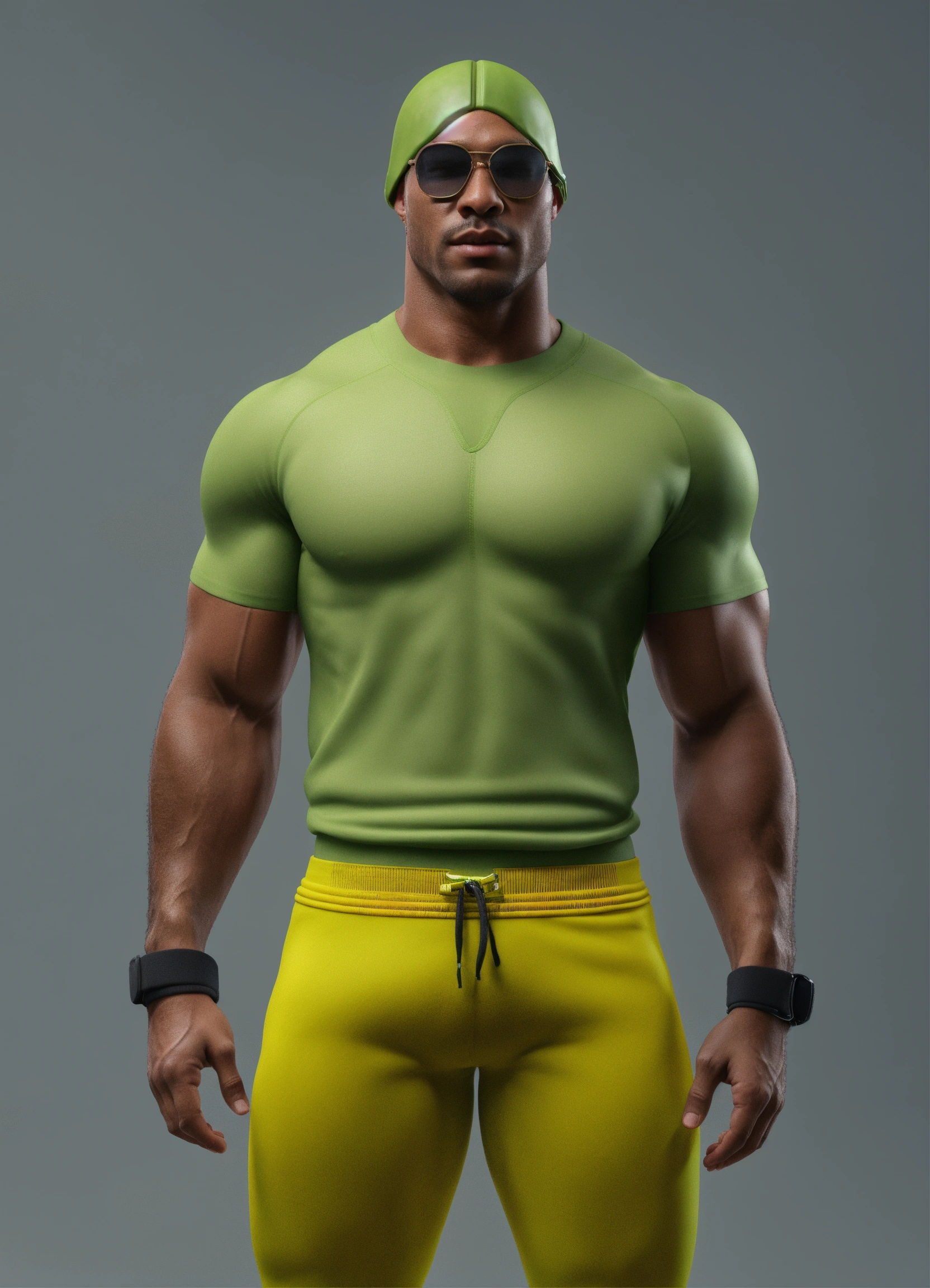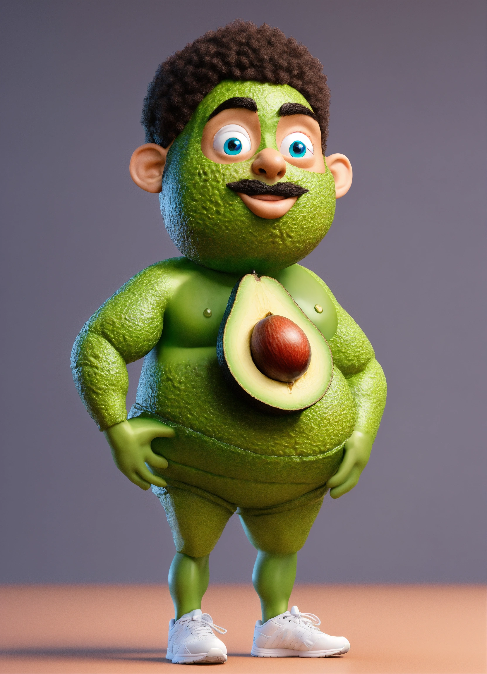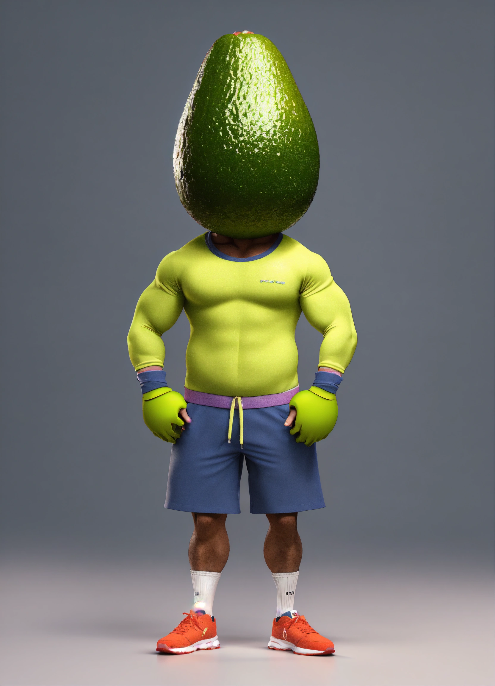 An avocado head man with fitness wear, like a man, front view, studio photo, hyper realistic, fashion, photorealistic, 3d render, disney style.