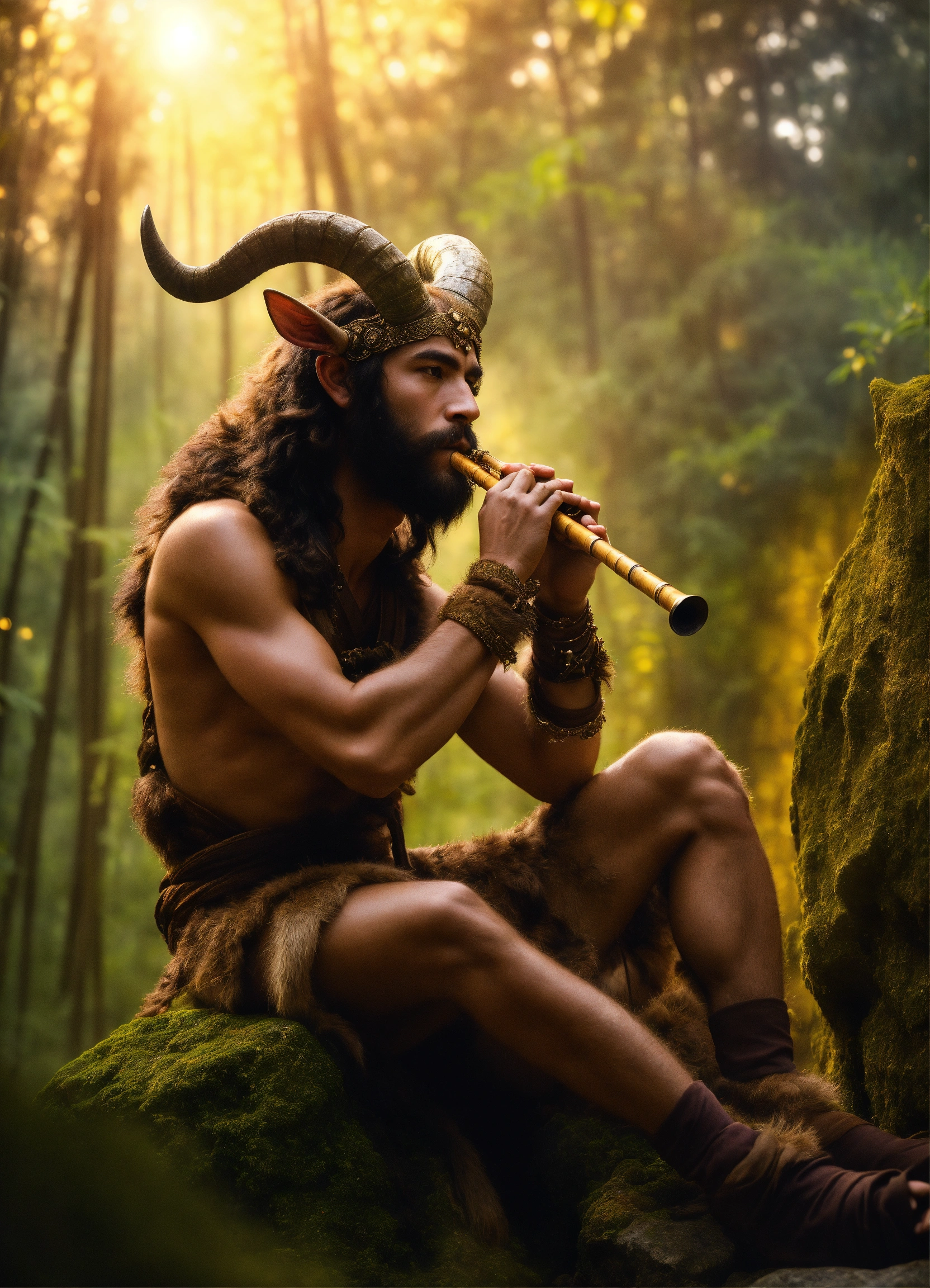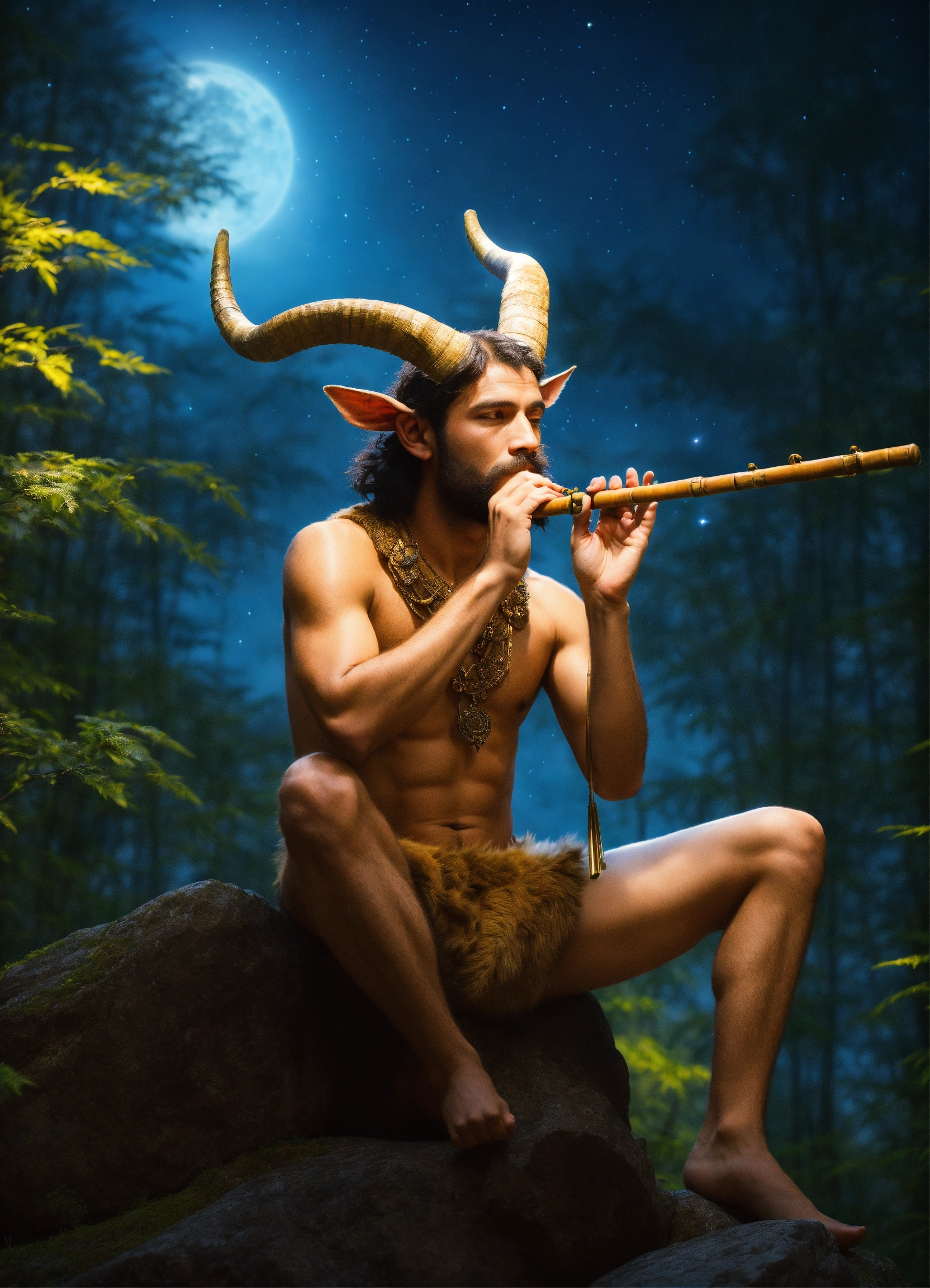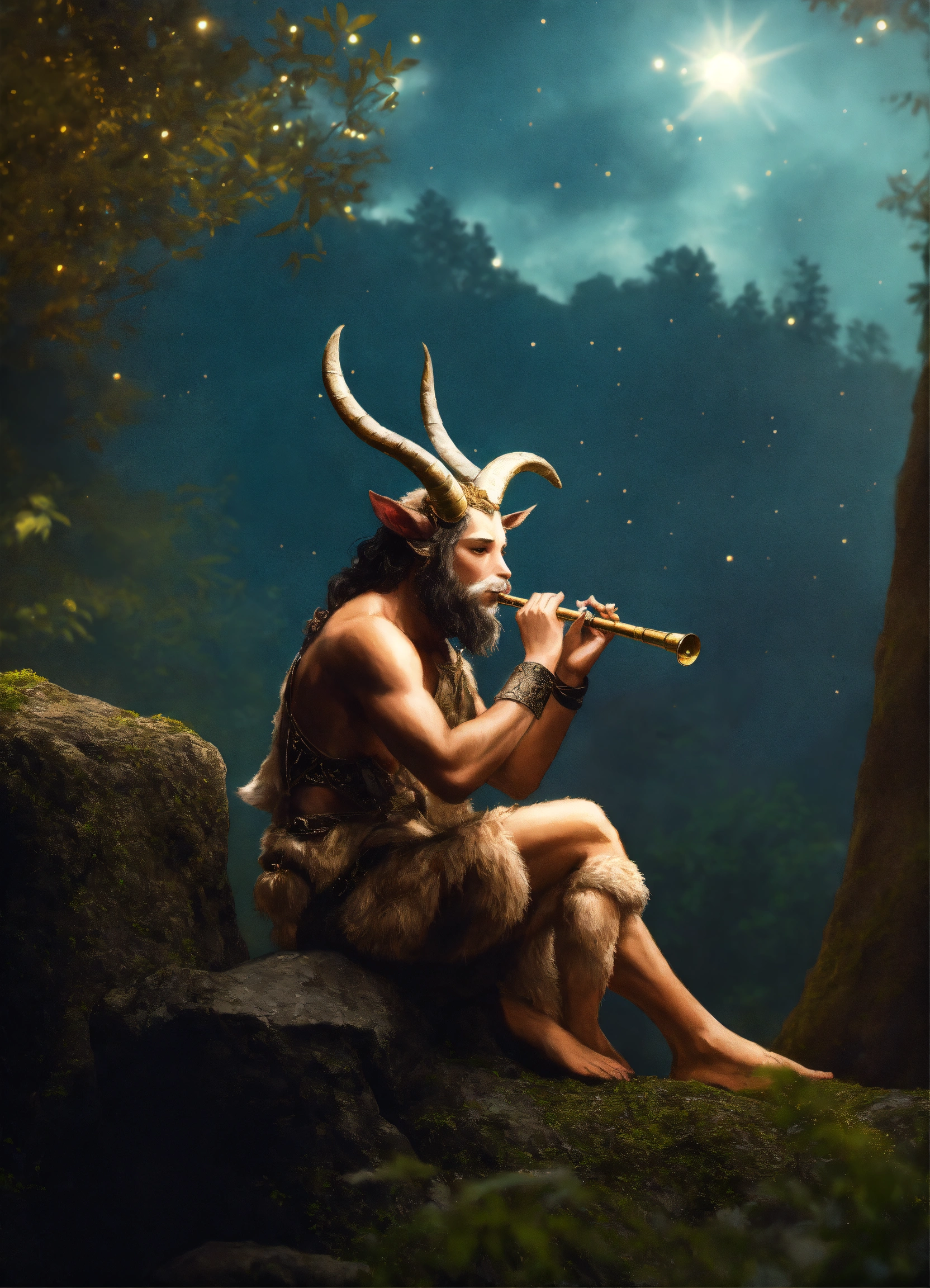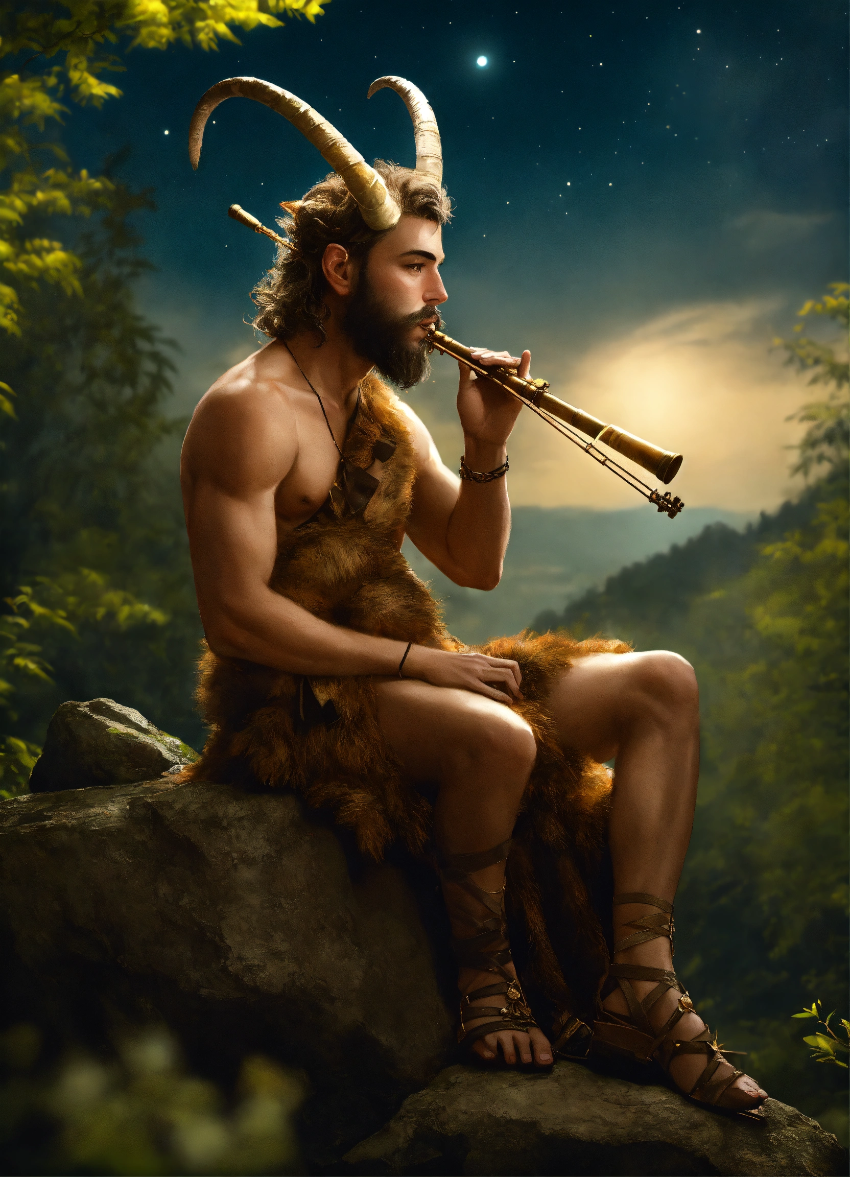 A faun with handsome male face, horns, and goat legs, hairy chest, playing a bamboo flute, looking at a bright star in the sky, medieval era, realistic photo, he is sitting on top of a rock in the forest