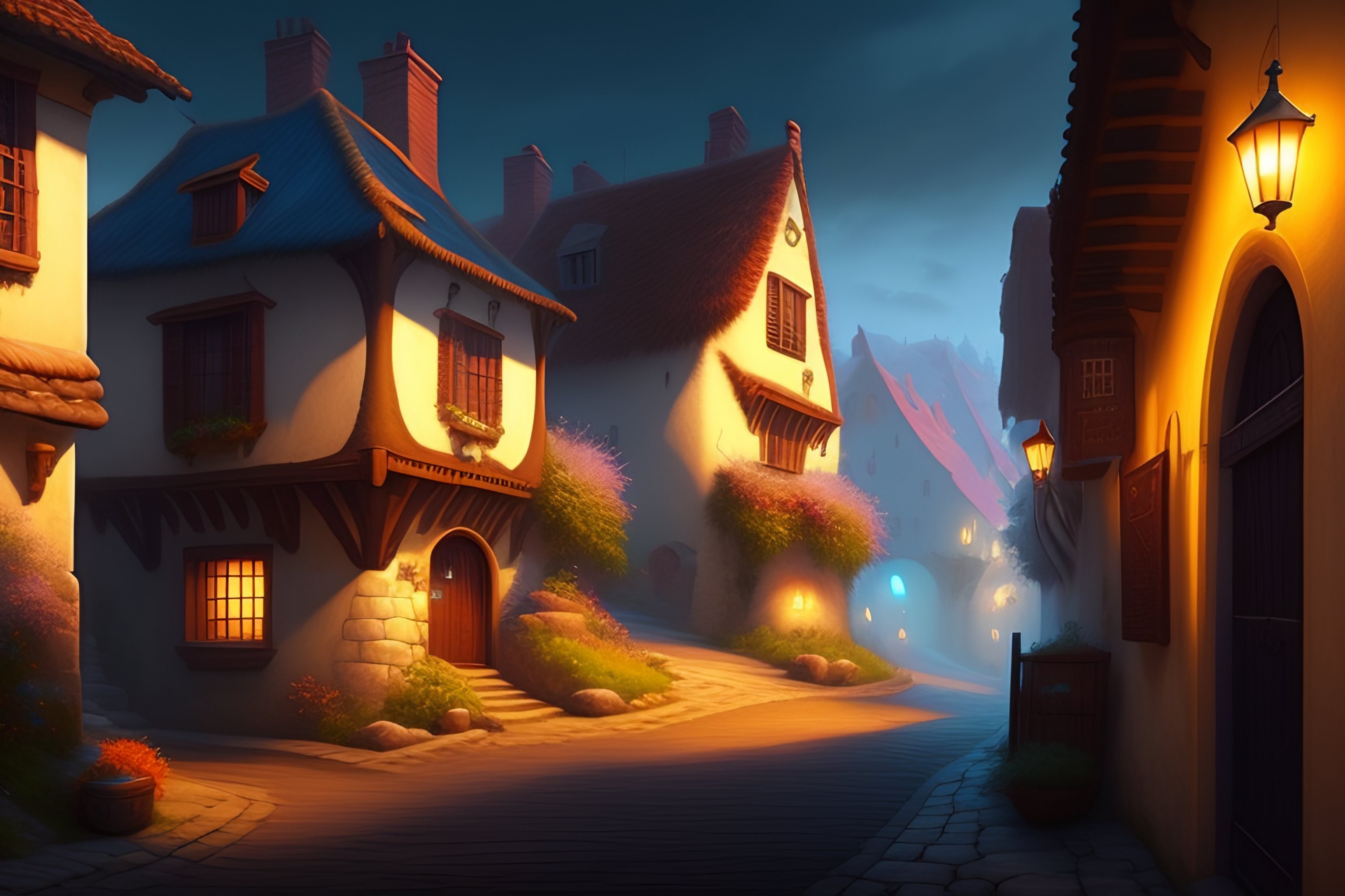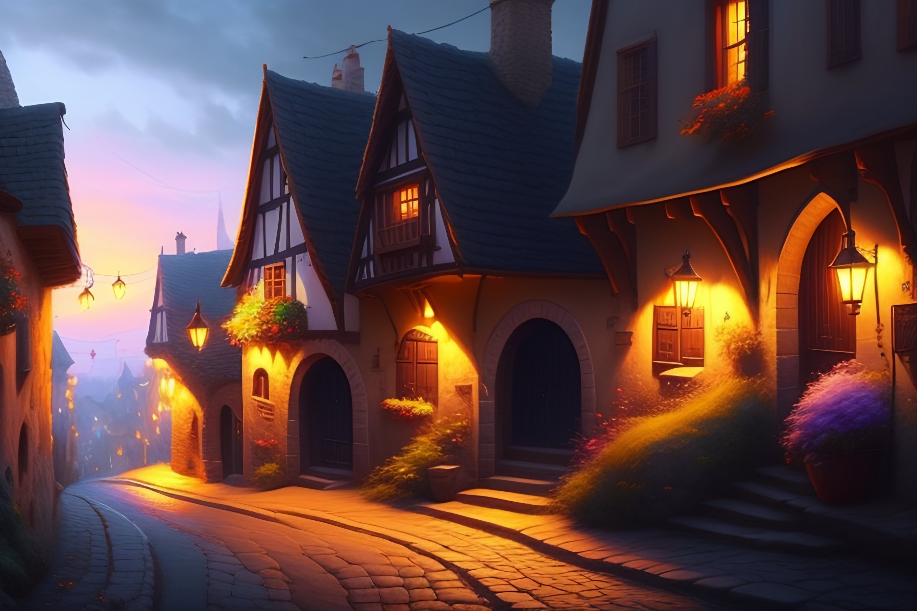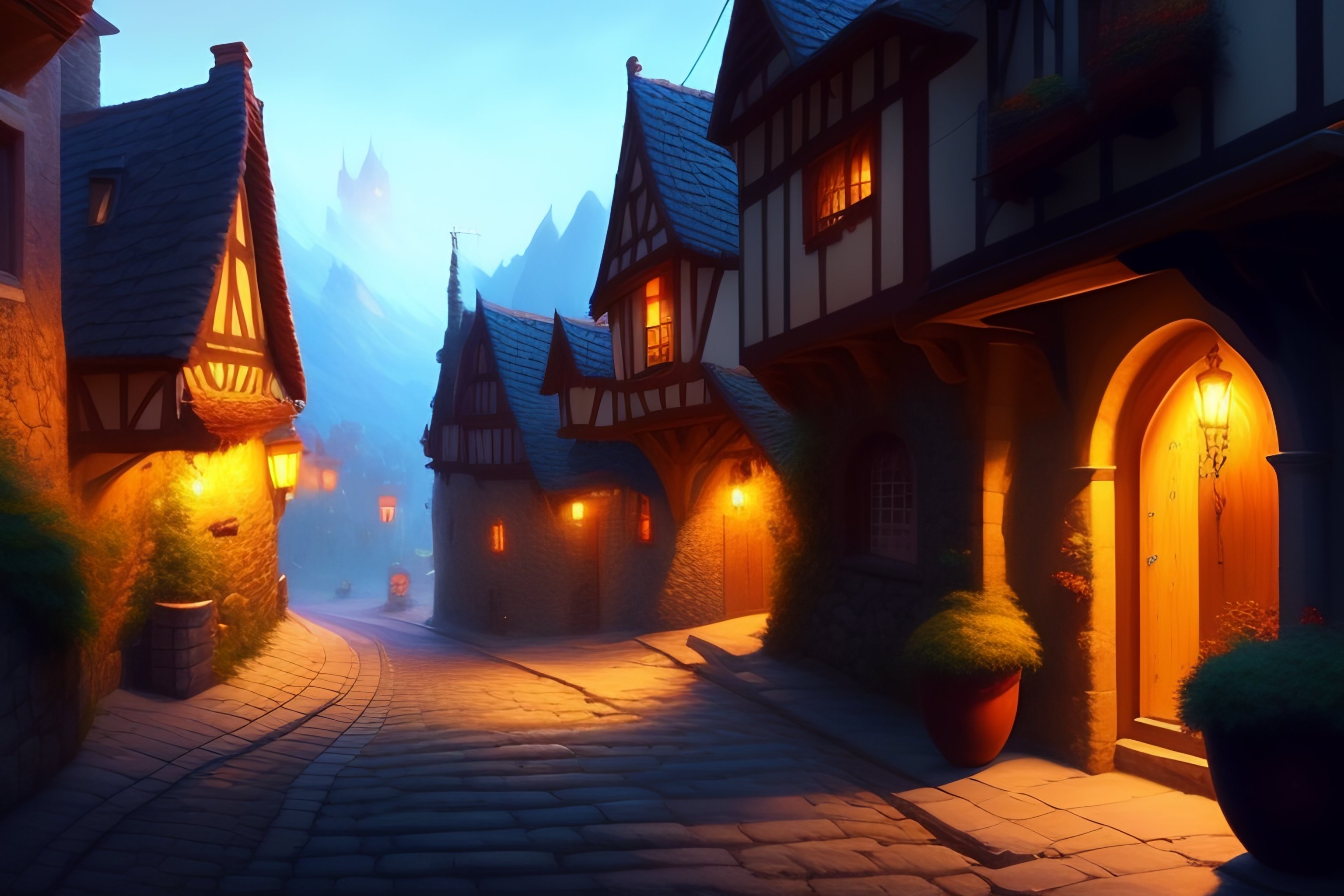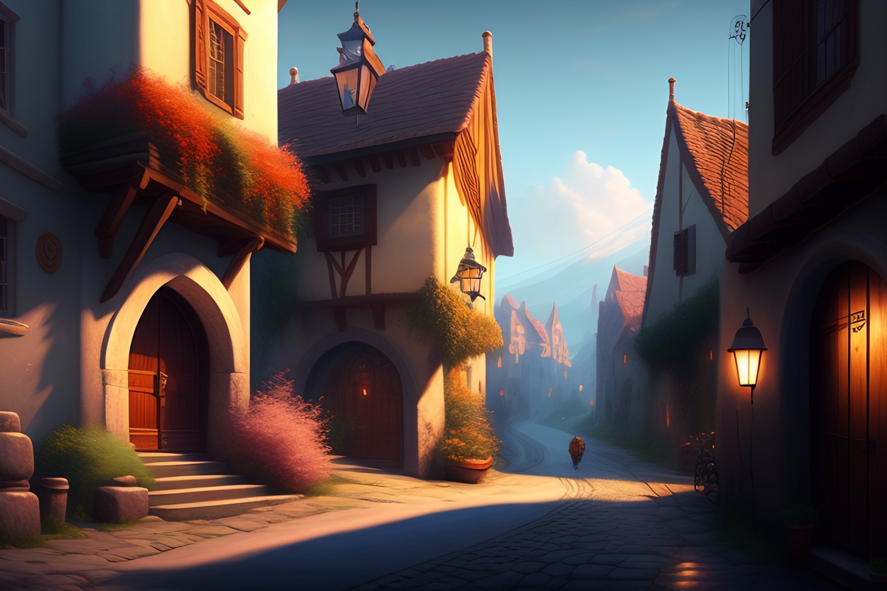 A downhill street of a medieval town, artstation, realistic concept art by evgeny lushpin, jim burns and greg rutkowski, splash screen, complementary colors, fantasy concept art, 8k resolution trending on art