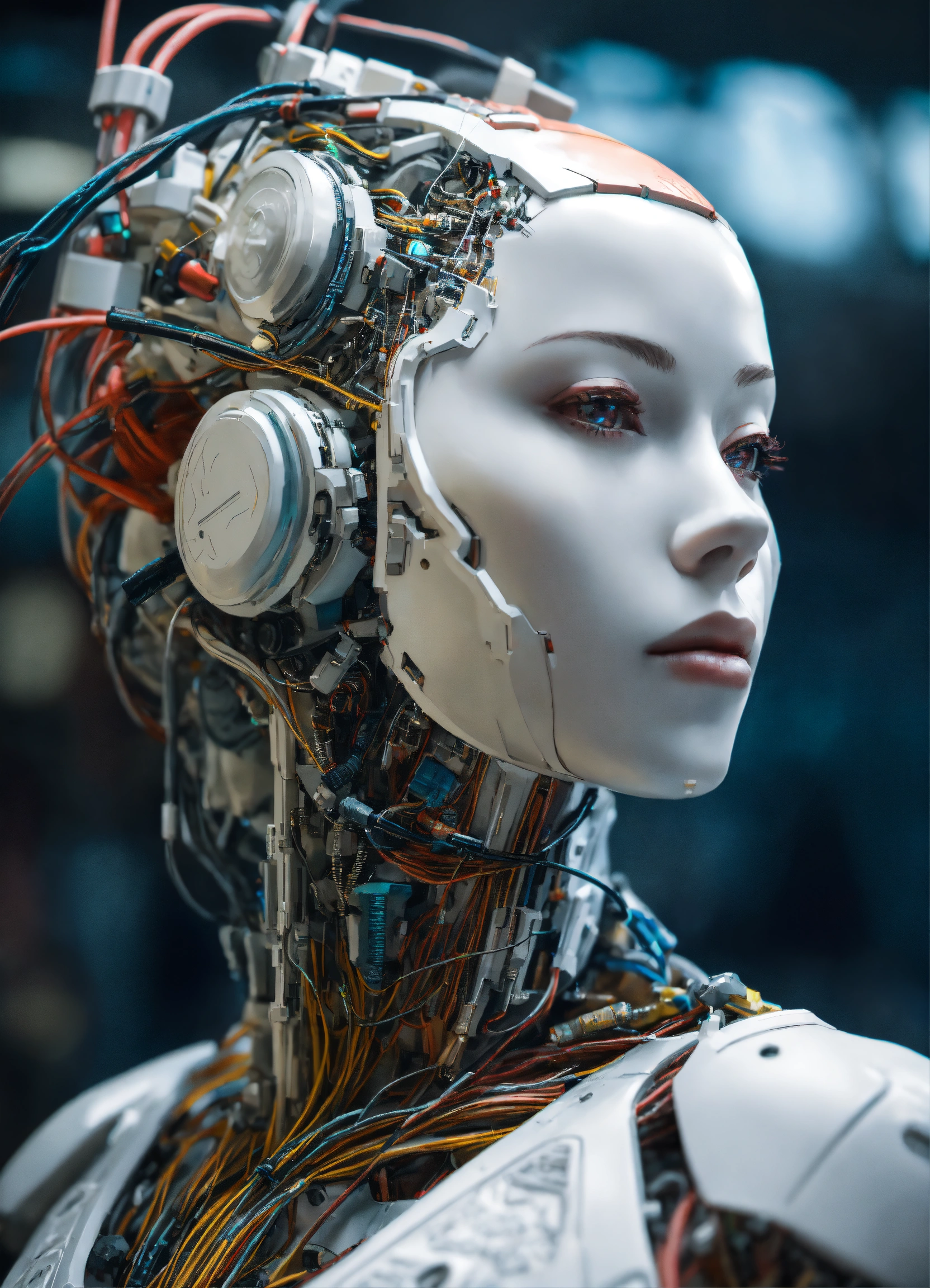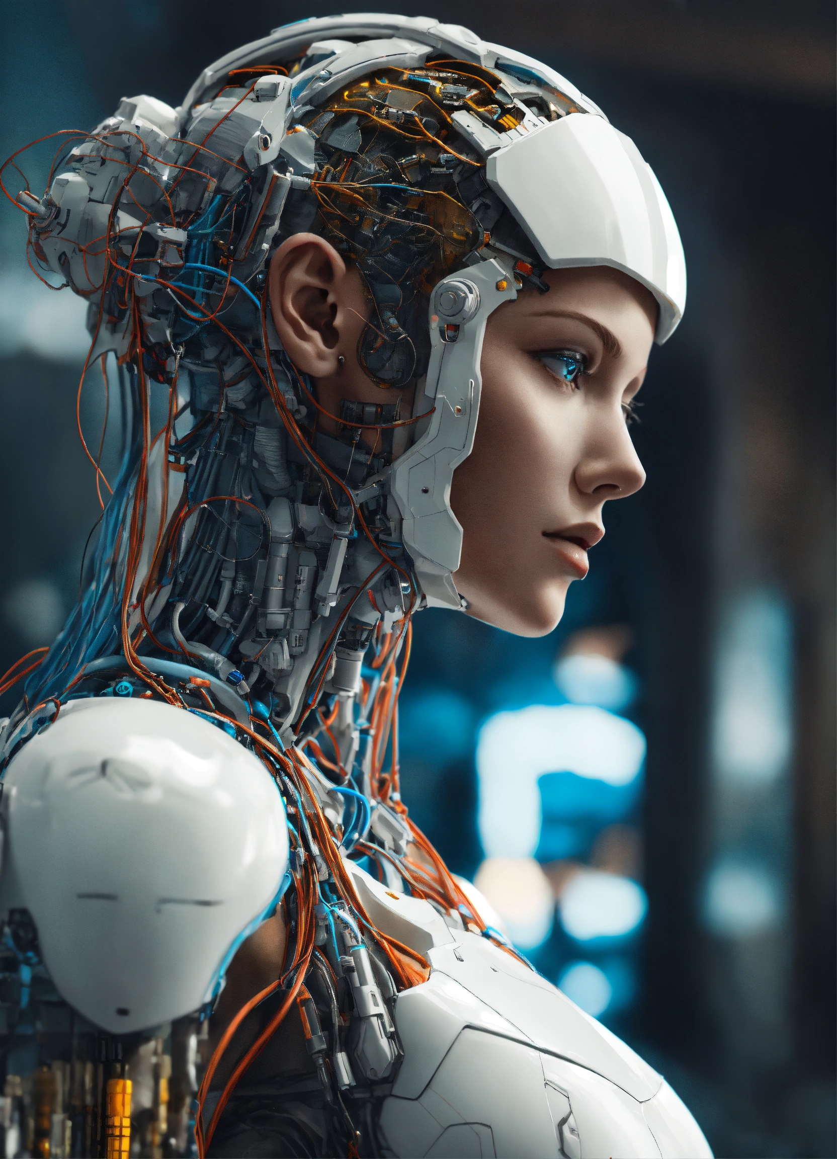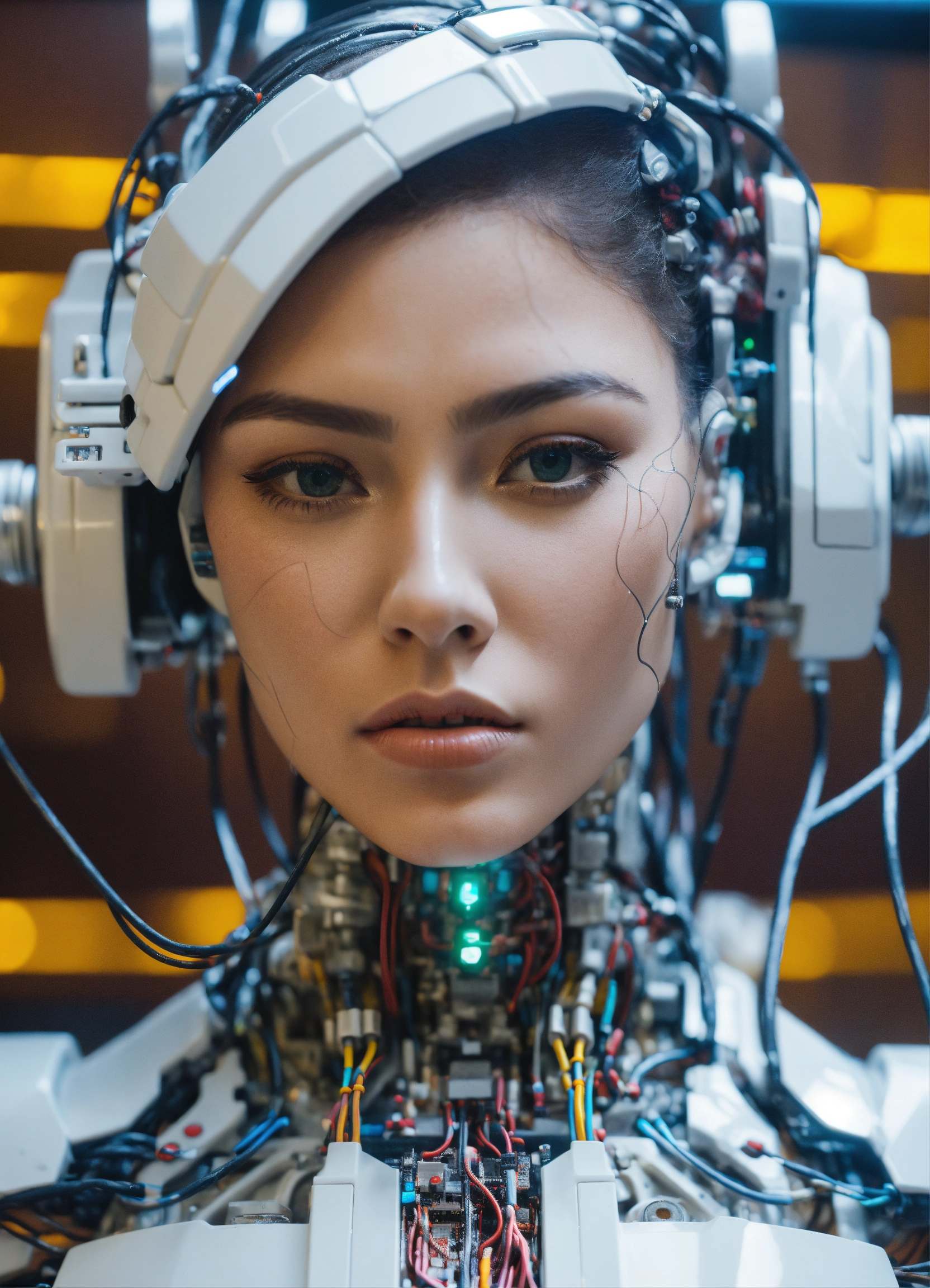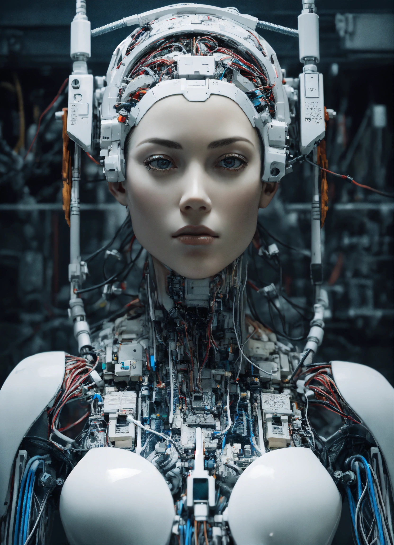 Electronic system on head humanoid |cyborg woman| with a visible detailed brain| with a visible detailed heart| muscles cable wires| biopunk| cybernetic| cyberpunk| white marble bust| canon m50| 100mm| sharp focus| smooth| hyperrealism| highly detailed| intricate details| carved by michelangelo