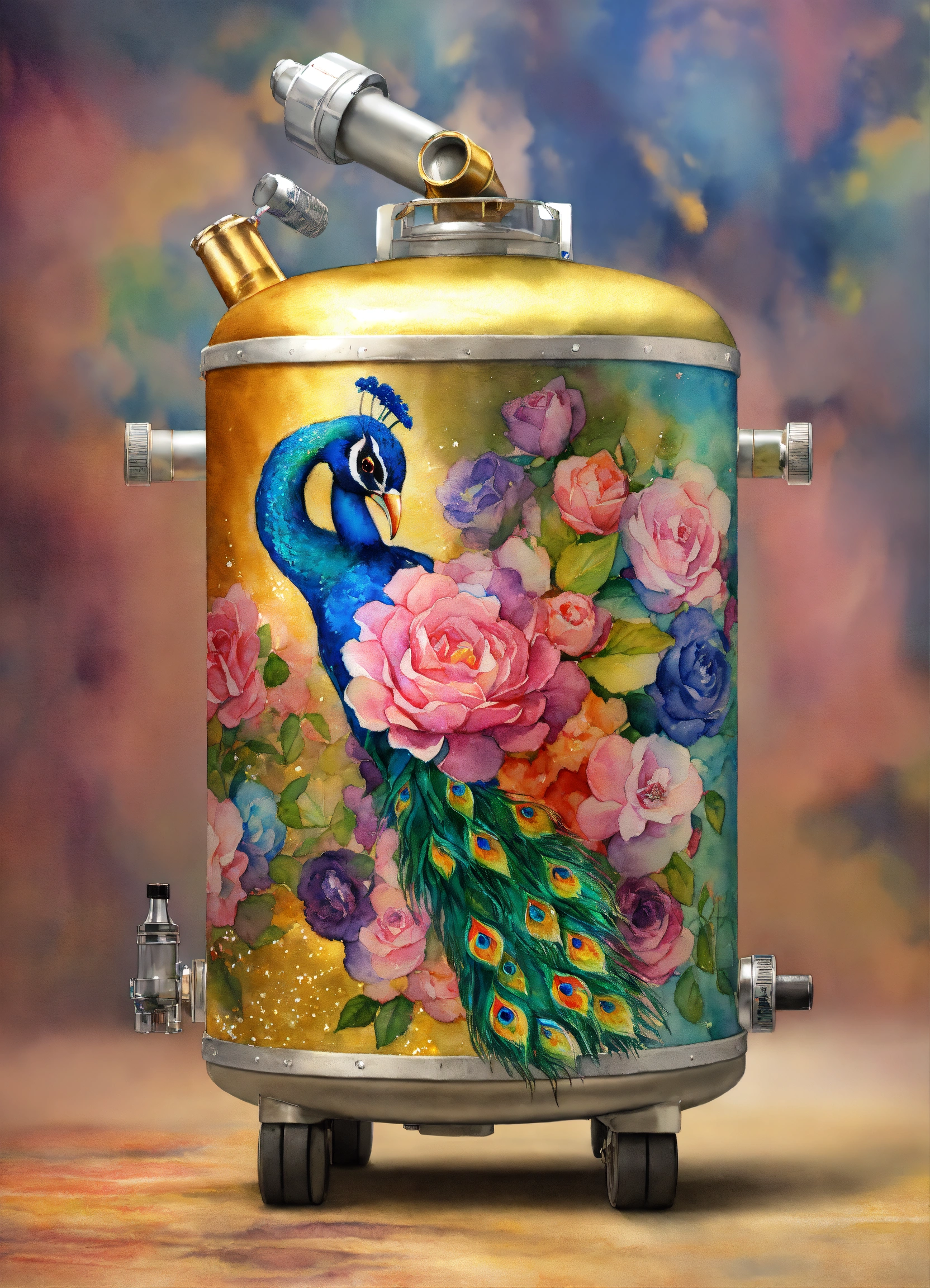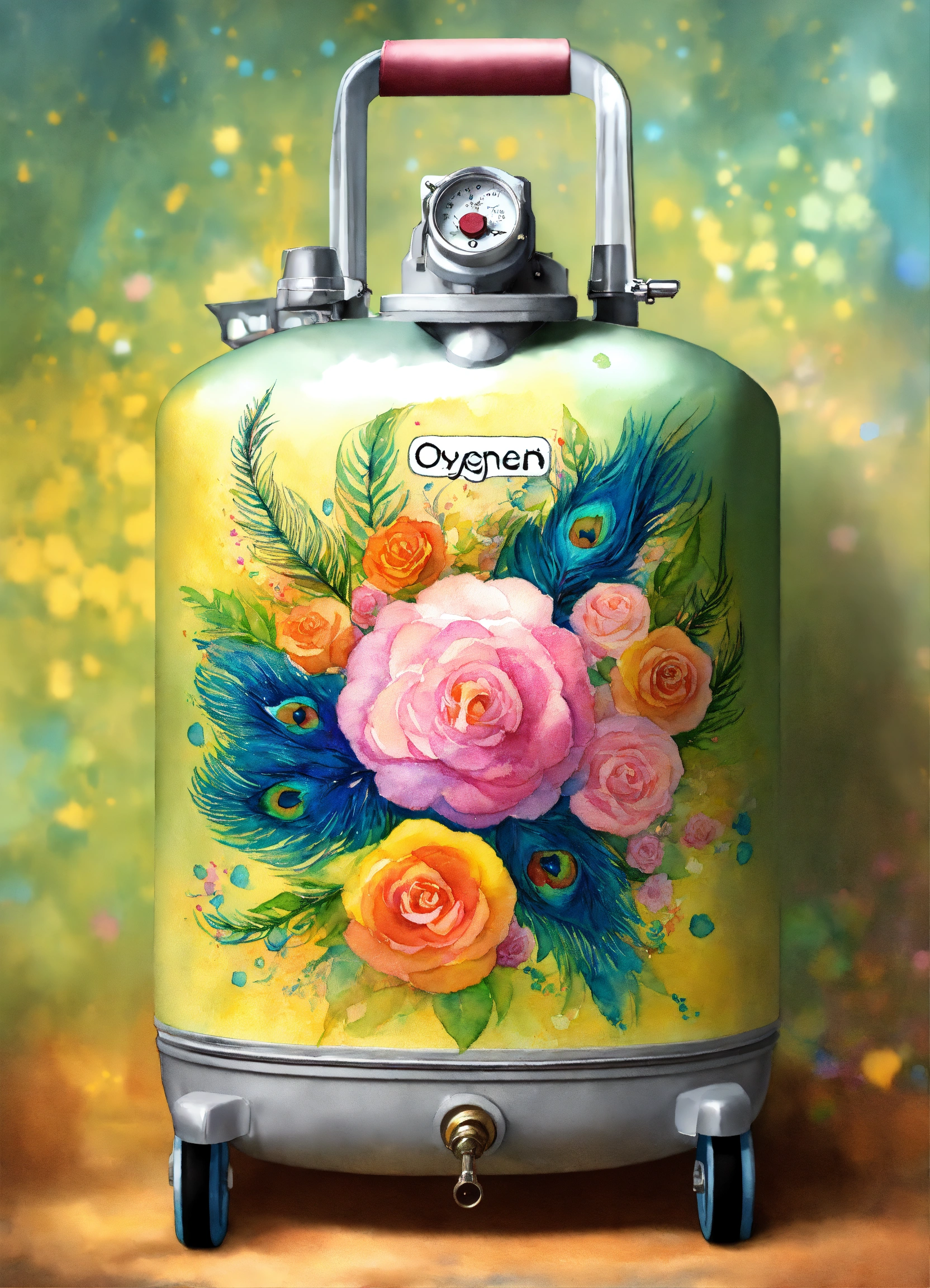Concept art of oxygen tank and nasogastric tubenose tube, portable, rolling wheels, small, blank background, handprinted painted artsy design, portable oxygen concentrators, sparkle peacock painted on the tank, medical, realistic, hyper realistic, portable, cute, artsy, decorated, thin tank, colorful girly handprinted designs on the tank, thin small portable tank, personalized decorated painted medical portable oxygen tank, respiratory, thin tank, watercolor paint, whimsical paint, super thin small narrow tank, watercolor abstract paint, clear thin tube attached, watercolor roses, boho paint, small wheels, colorful painted sequins glitter watercolor, narrow tank, very narrow thin oxygen tank, glitter, realistic, colorful, feminine blank background