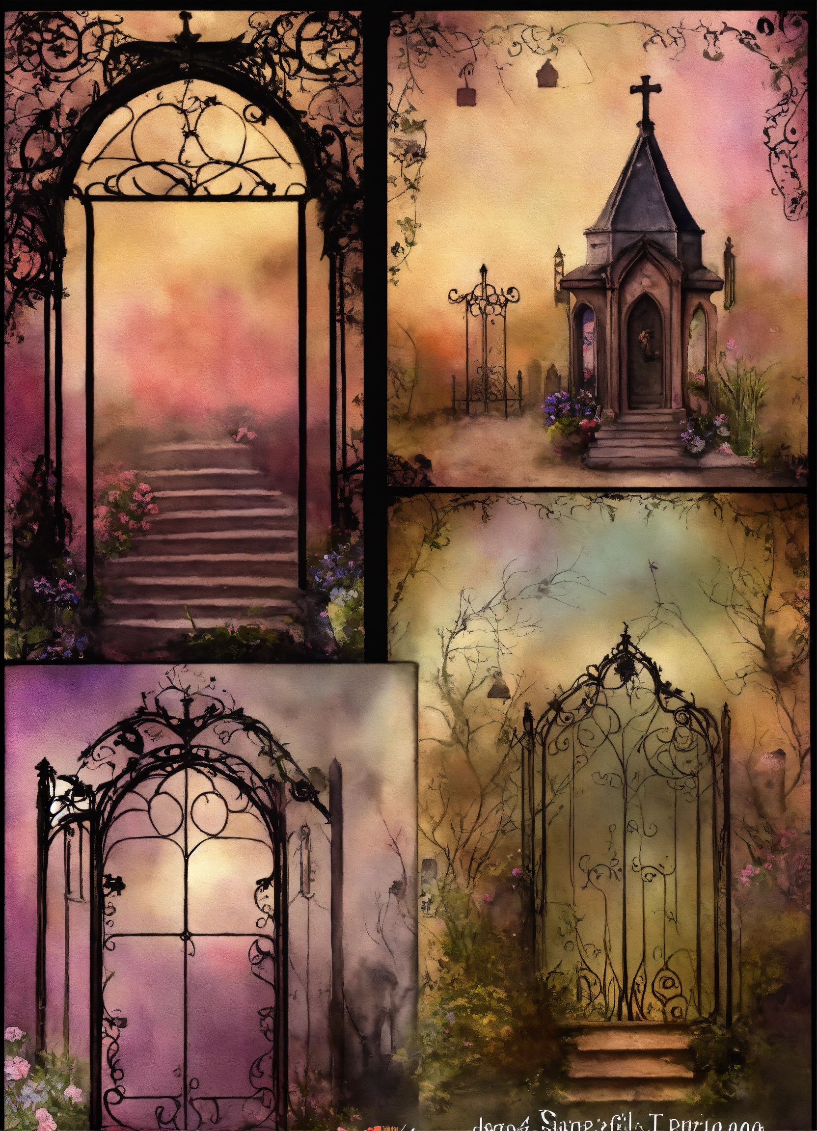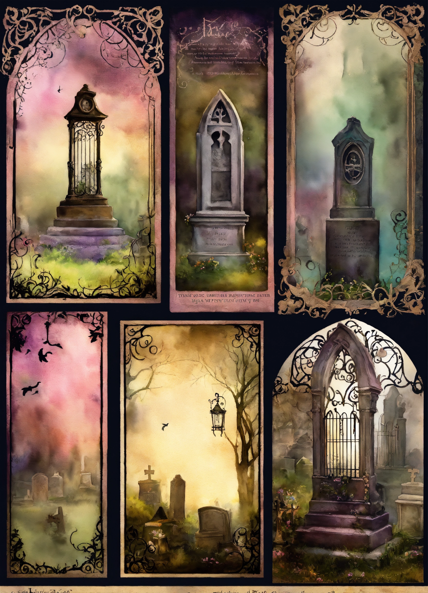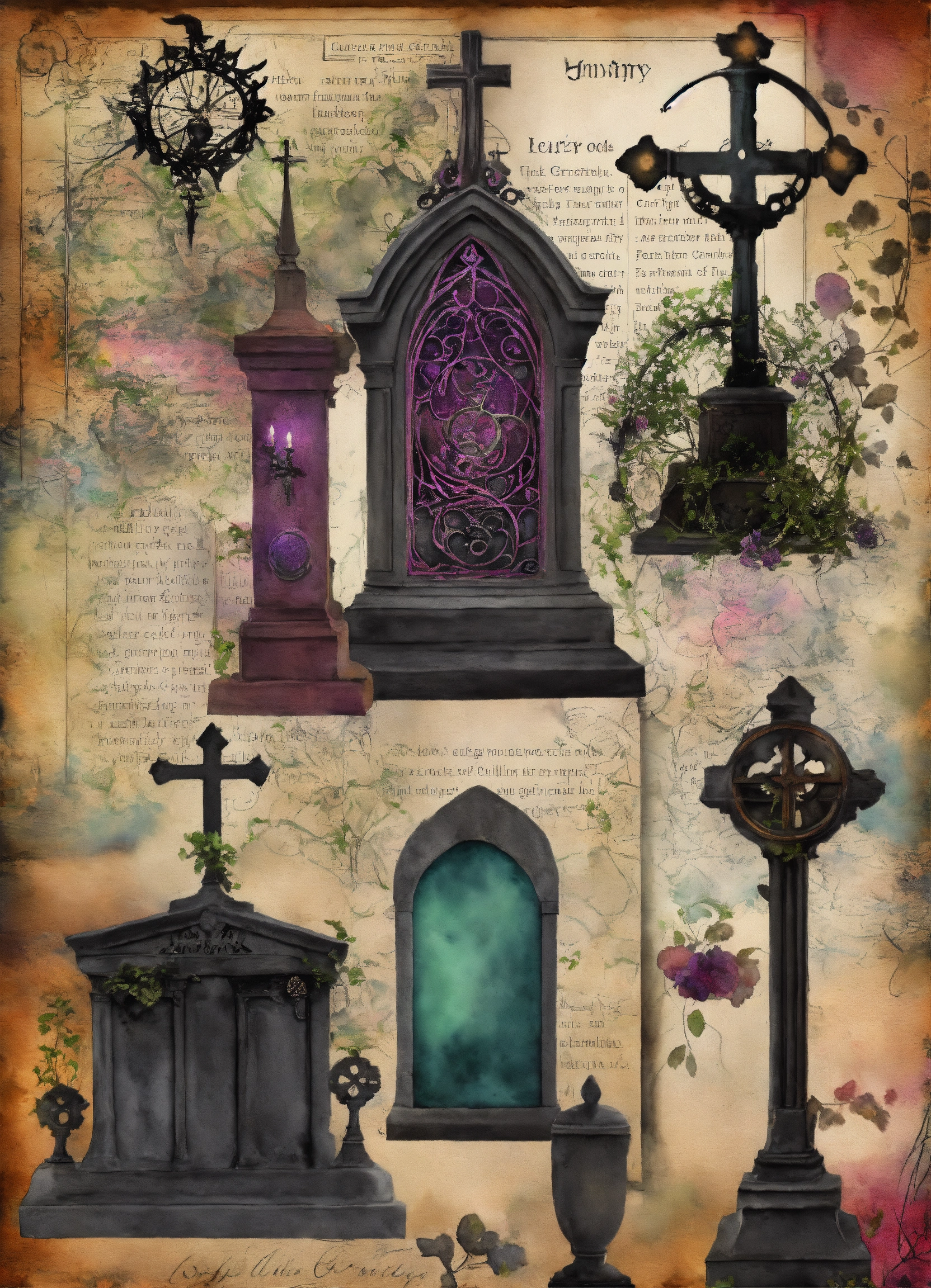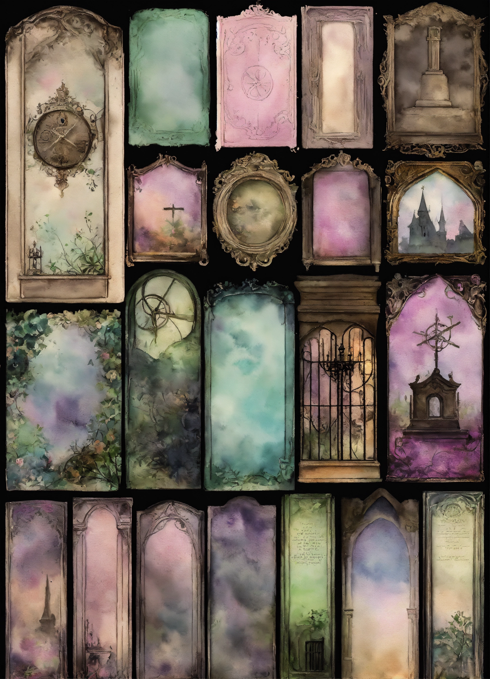 Shabby chic dreamy mist pastel junk journals create detailed watercolor illustrations of goth steampunk cemetery graveyards and tombstones hold a particular fascination for many goths., each as separate png images suitable for cutting out and using in various paper crafts such as card making, scrapbooking, junk journaling, and more. the digital clipart should capture the essence of gothic fantasy and steampunk aesthetics, offering a versatile resource for creative projects. each cemetery graveyards and tombstones hold a particular fascination for many goths. should be uniquely designed and easily adaptable to a range of crafting styles. swirling magical fairytale abstract art style