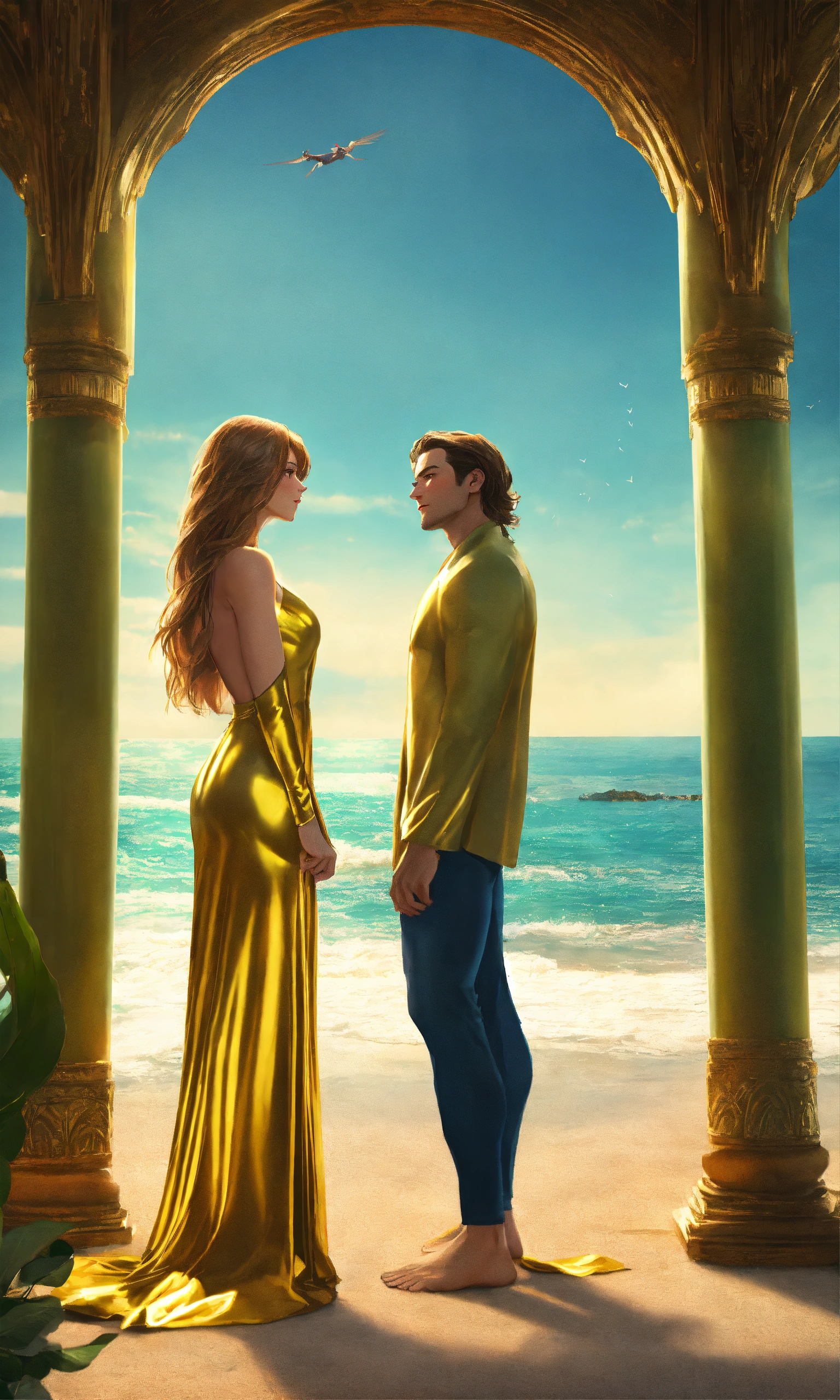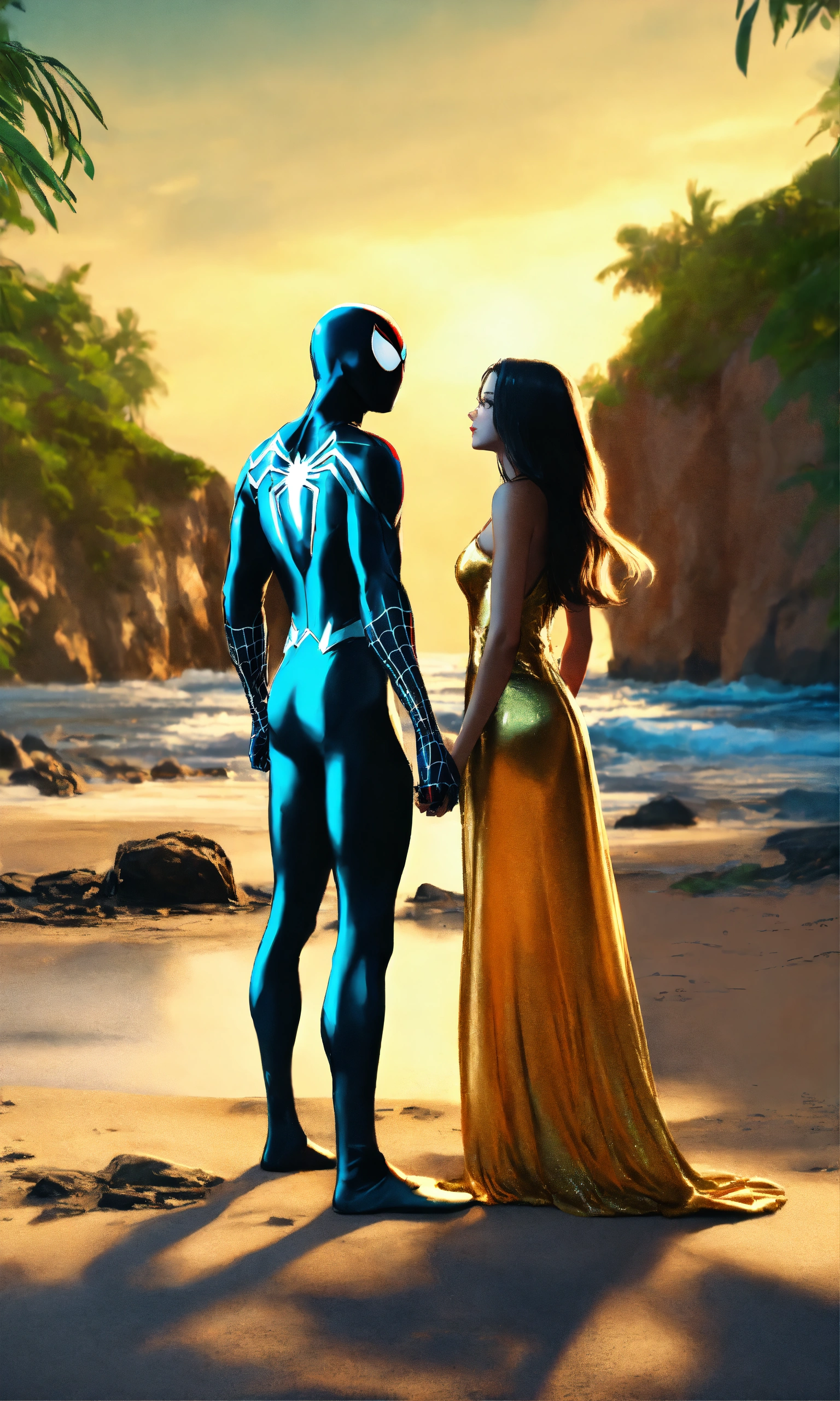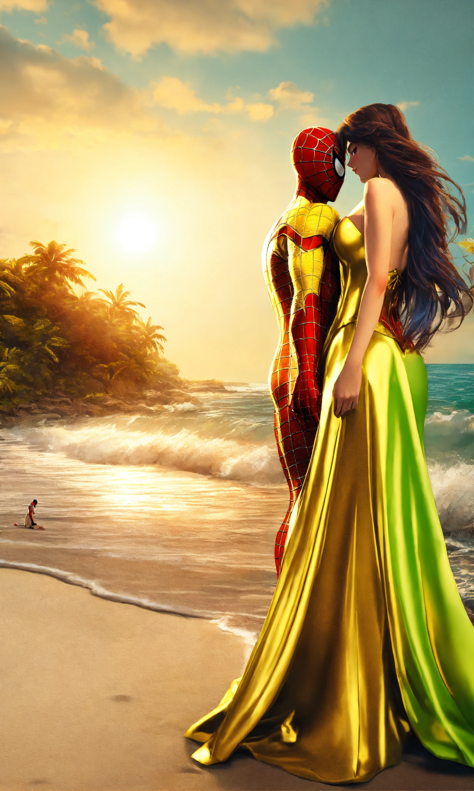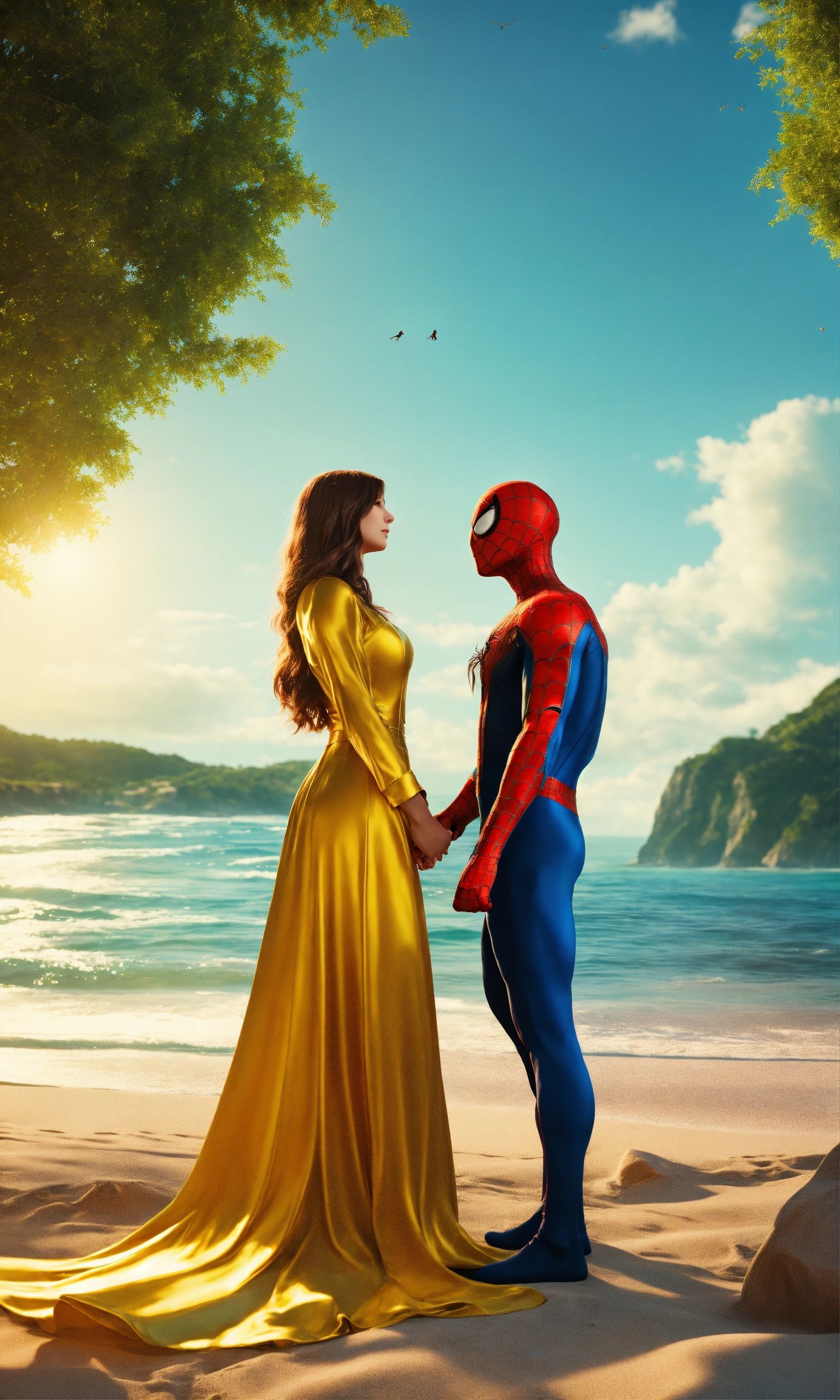 Spiderman with his hot girlfriend with long hair wearing golden drees looking at each other on the beach, green nature background and blue sky, 2d render