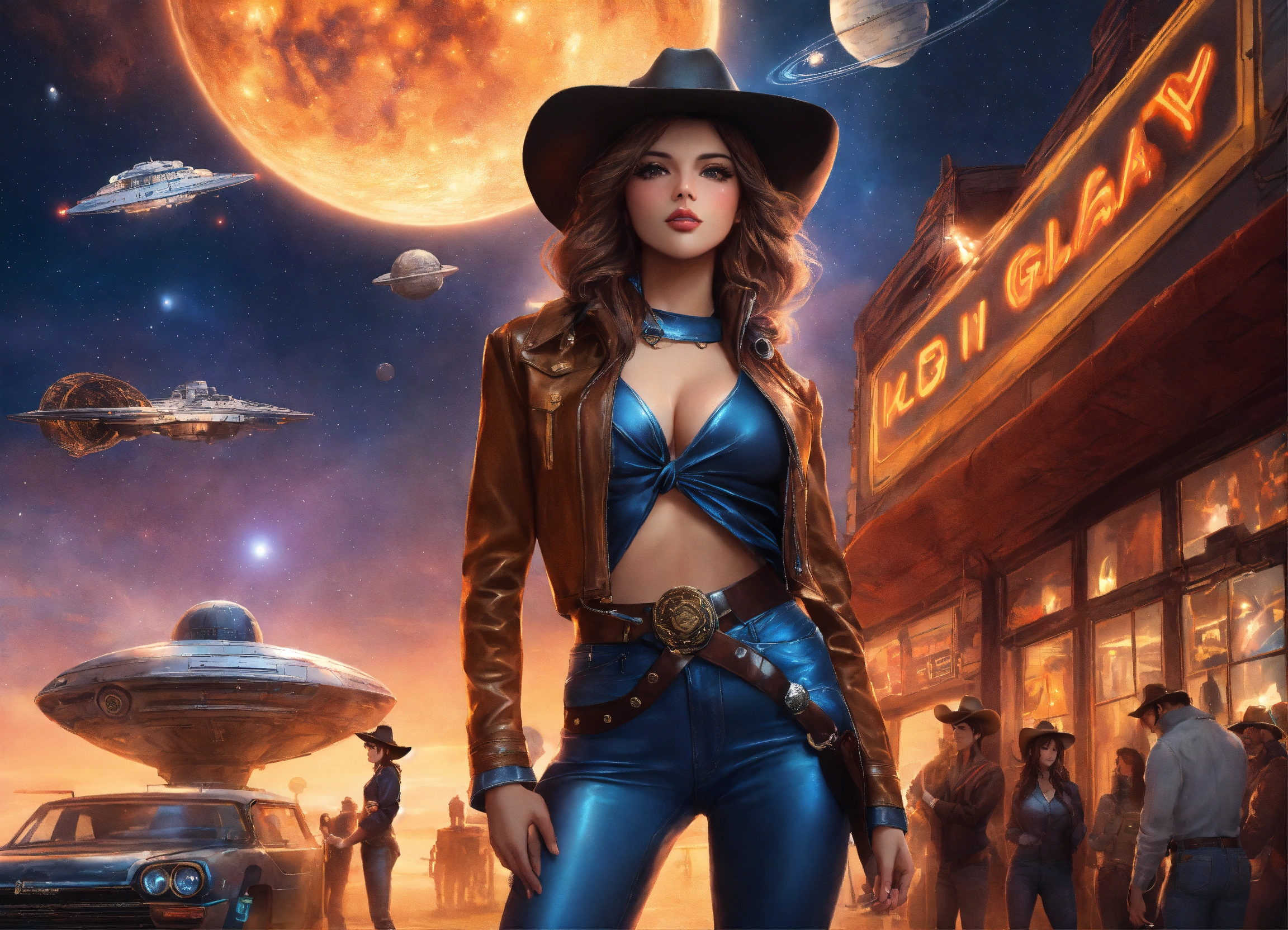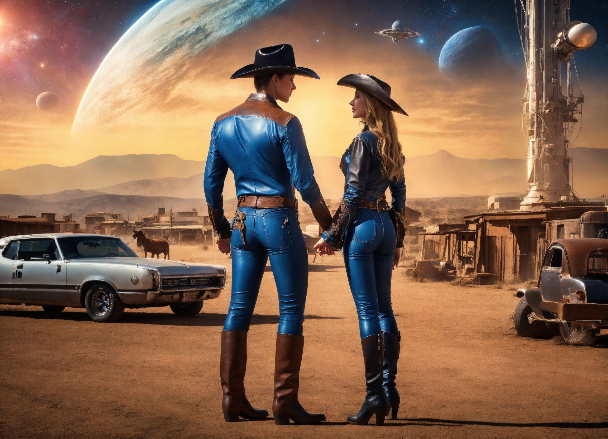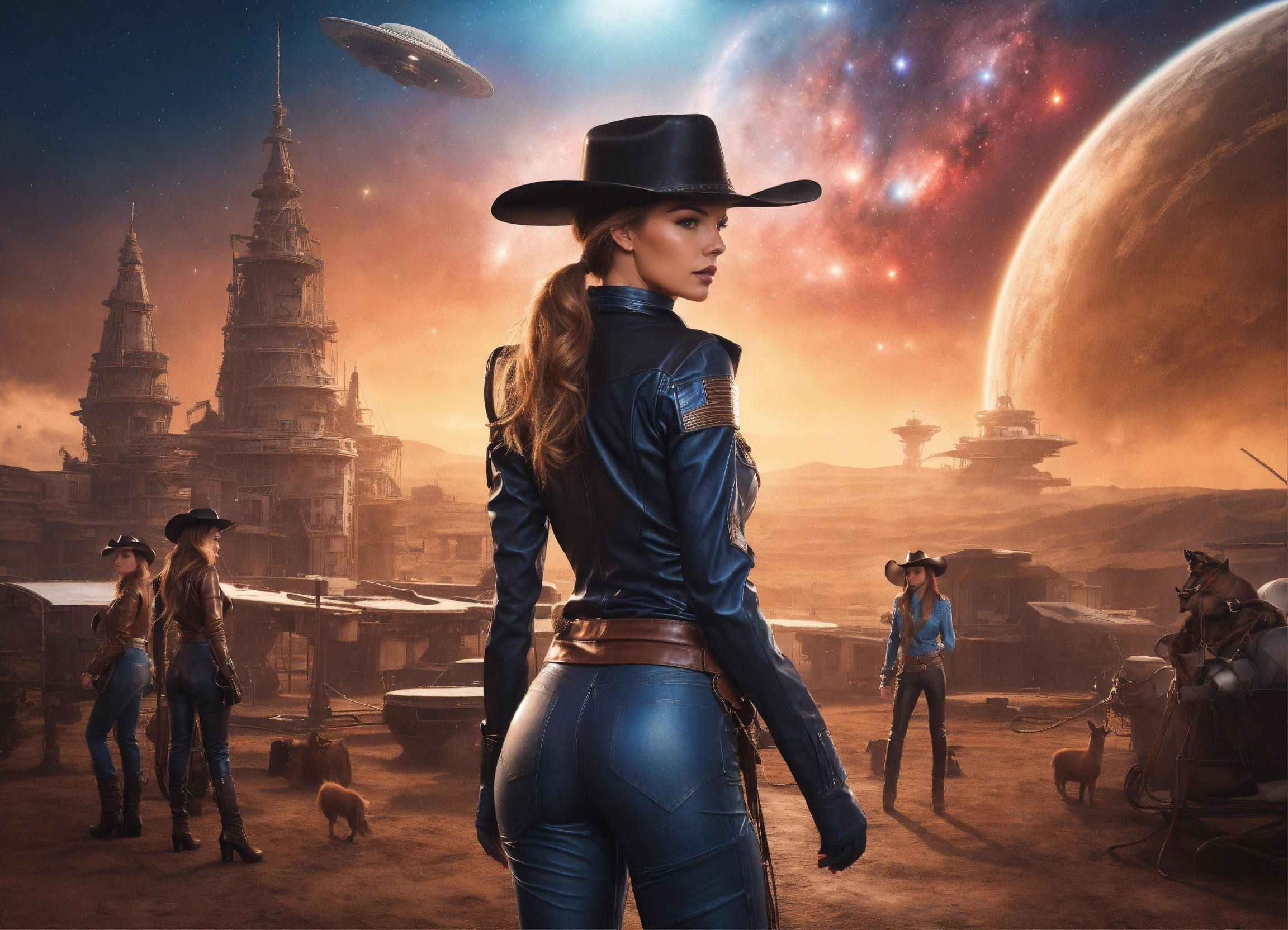 A real photo of a hot spacegirl in leather catsuit shakes hands with a hot cowgirl in knotted silk blouse and denim pants and cowboy-hat. in the background we see a old wester-town, and a spaceship. in the sky the galaxy