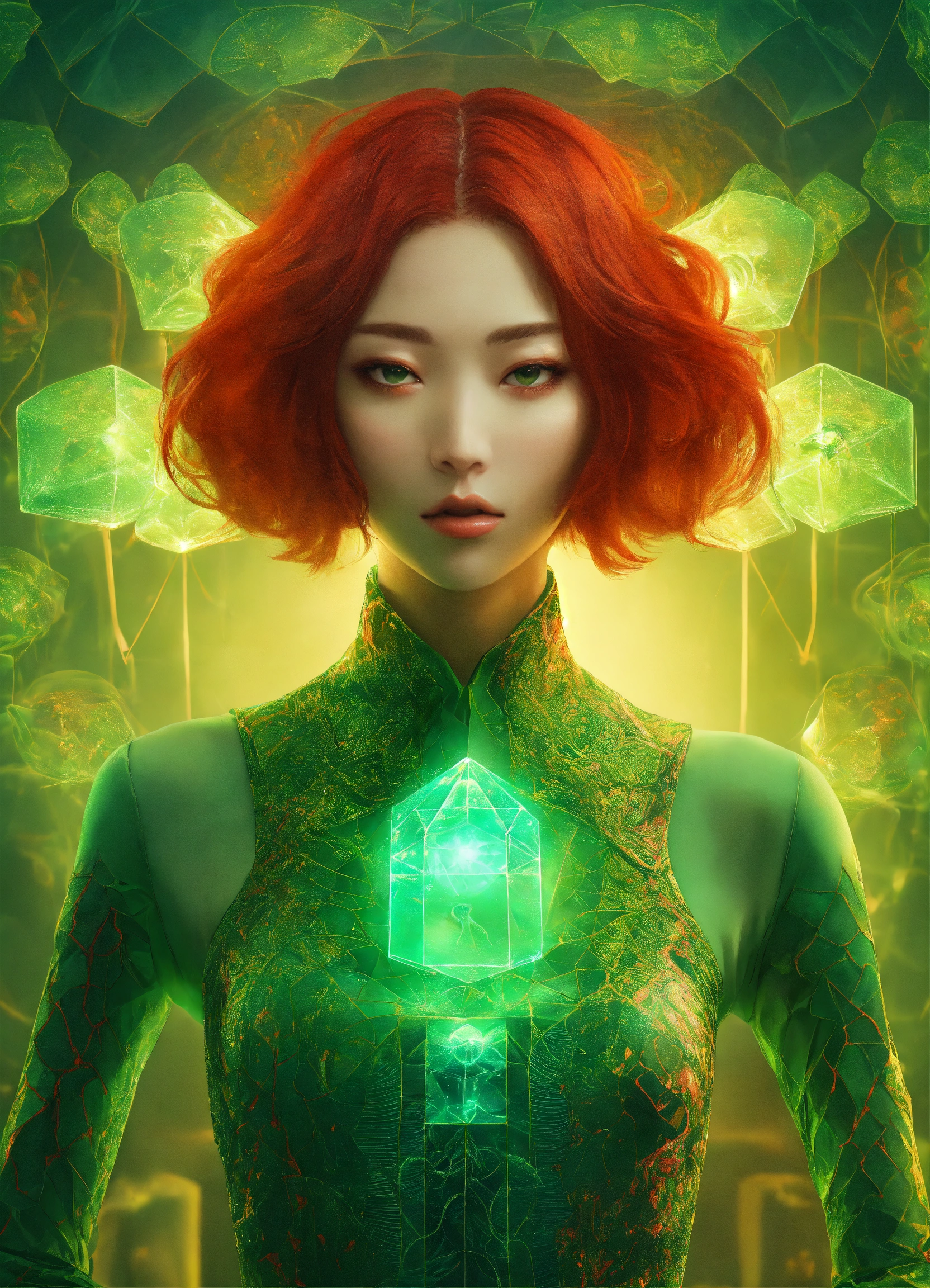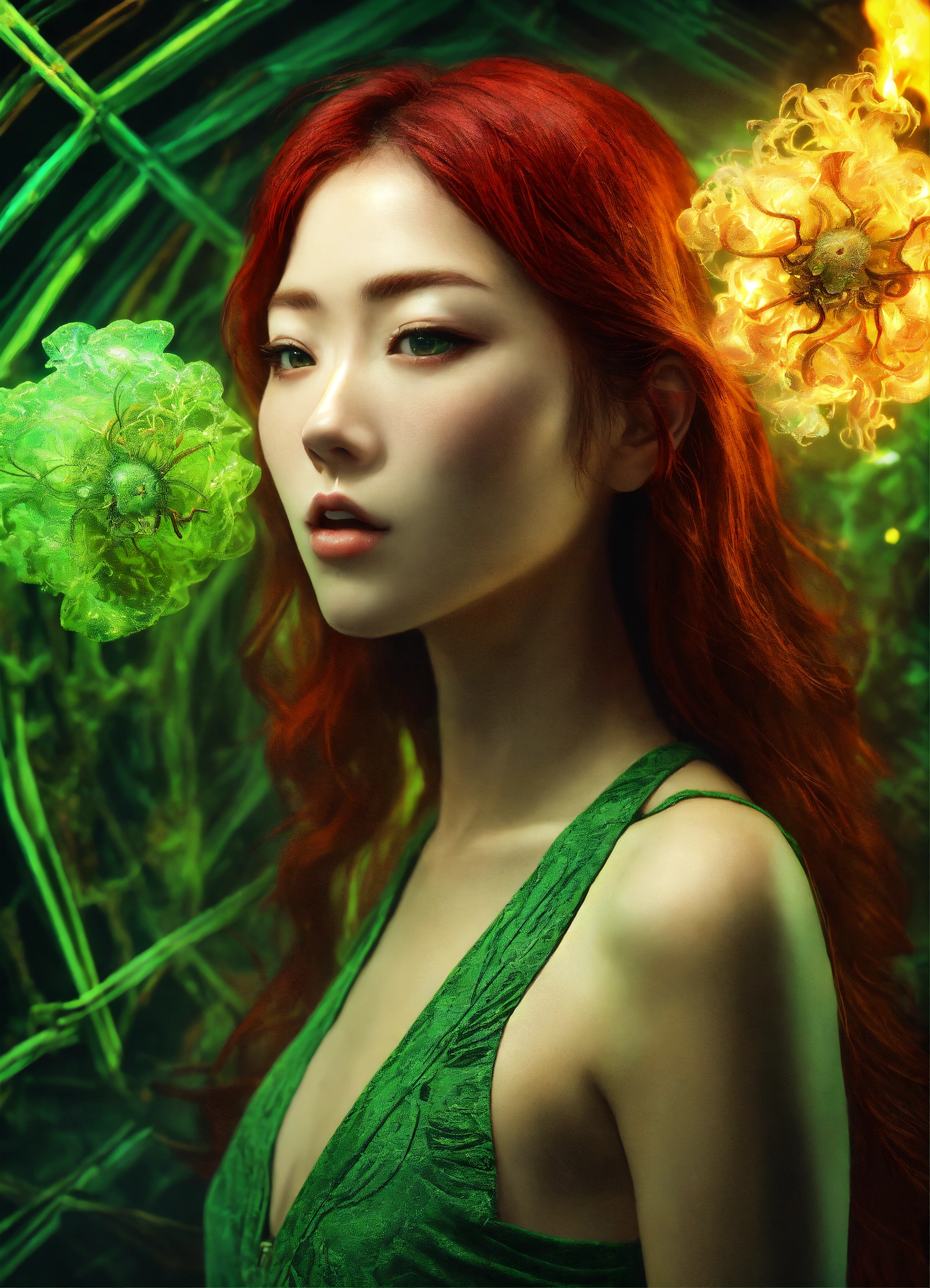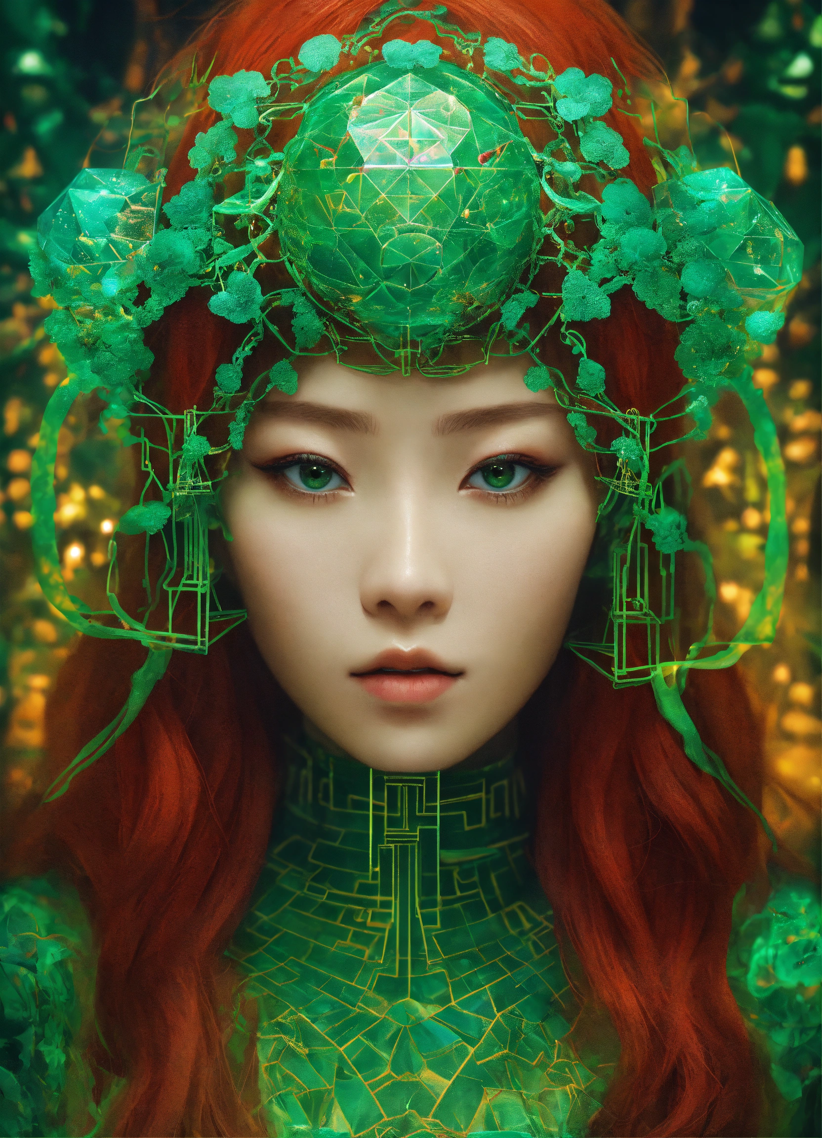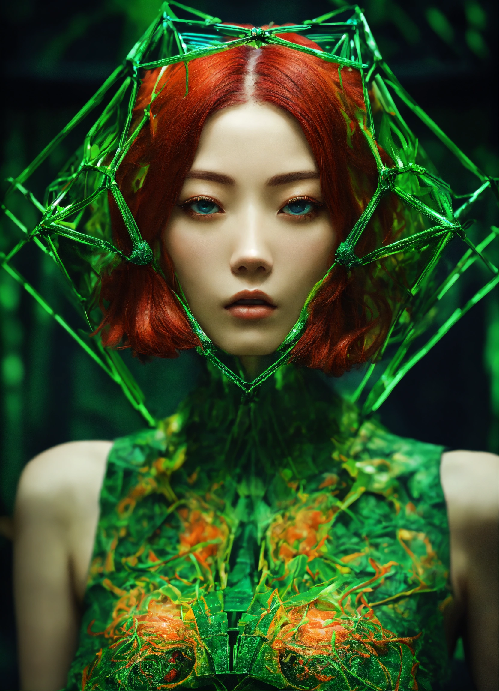 Beautiful woman, korean features, red hair, green colours, model, tesseract body fractal three point perspective hypercube mirror zen face brain mayan mantis jellyfish face, smoke, fire