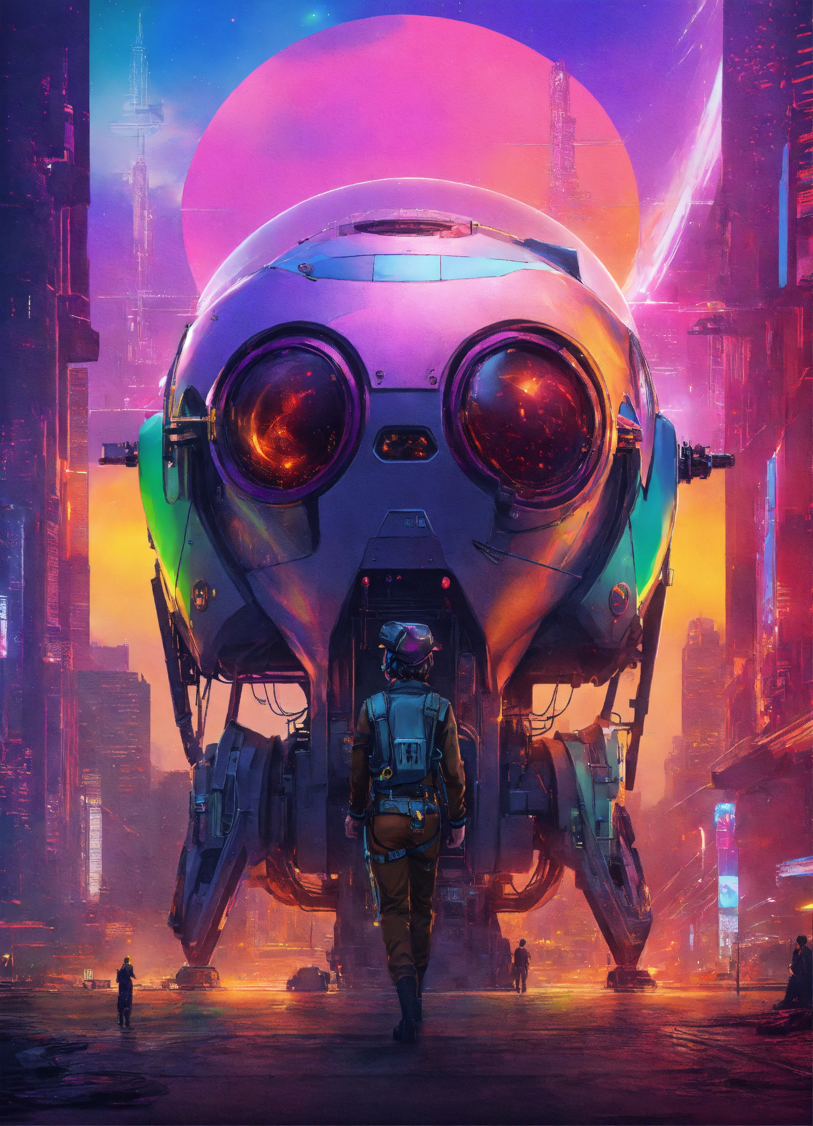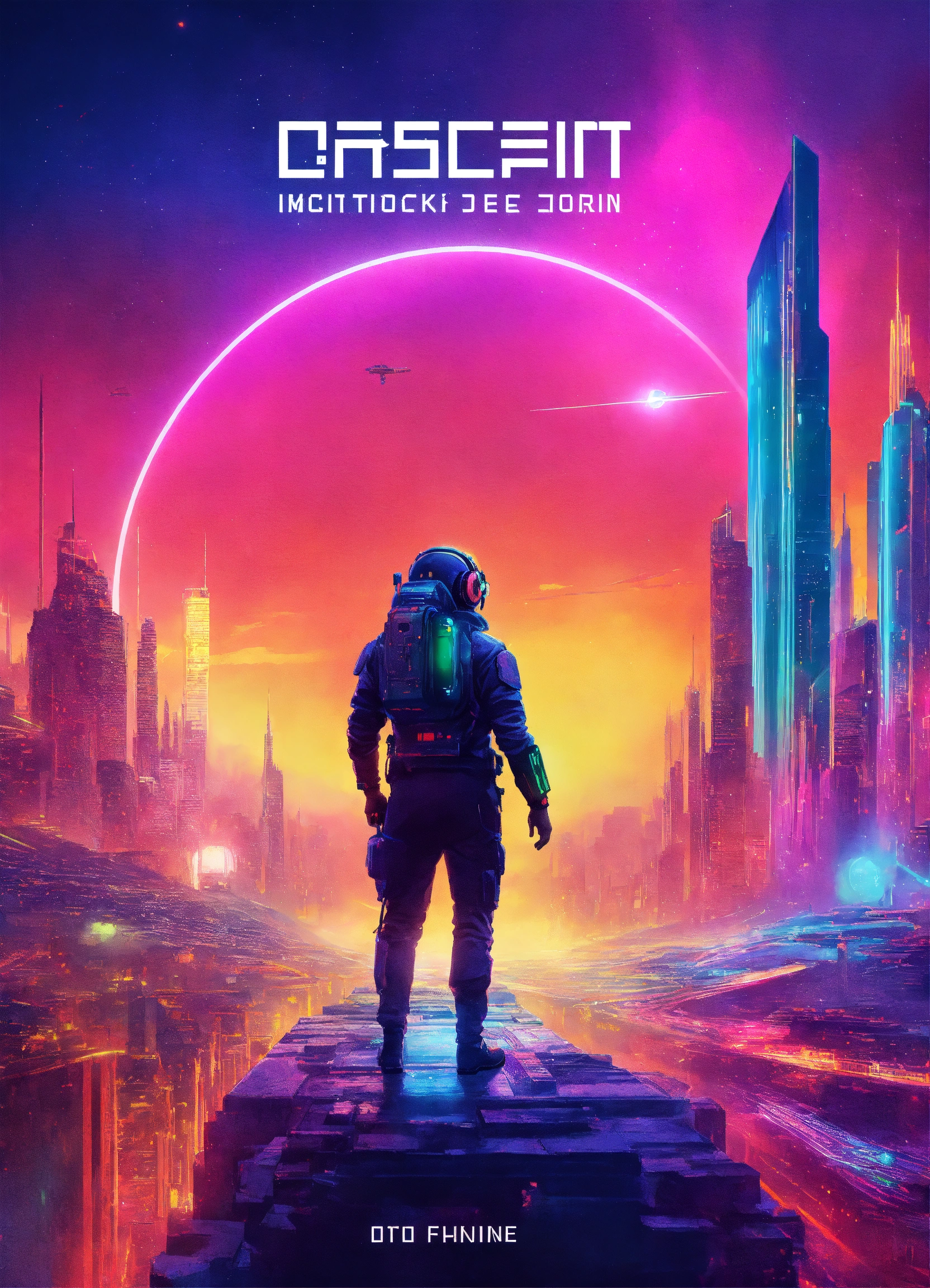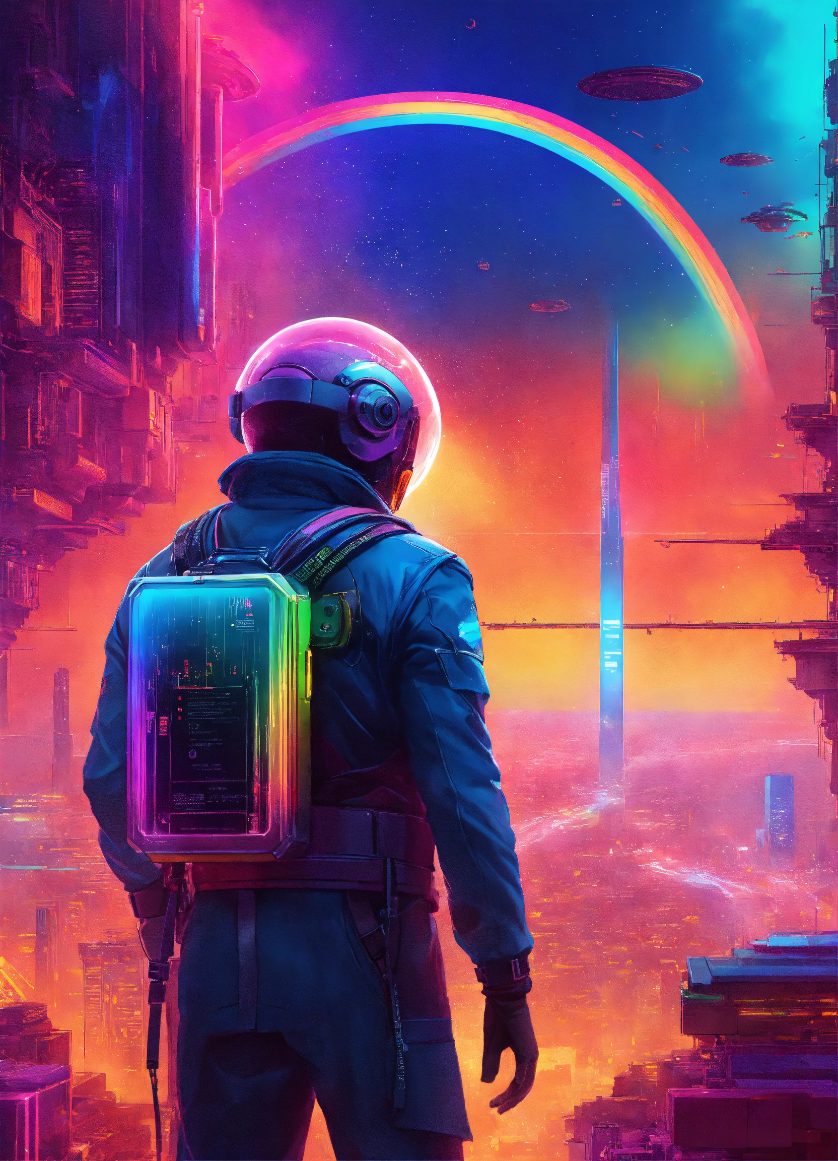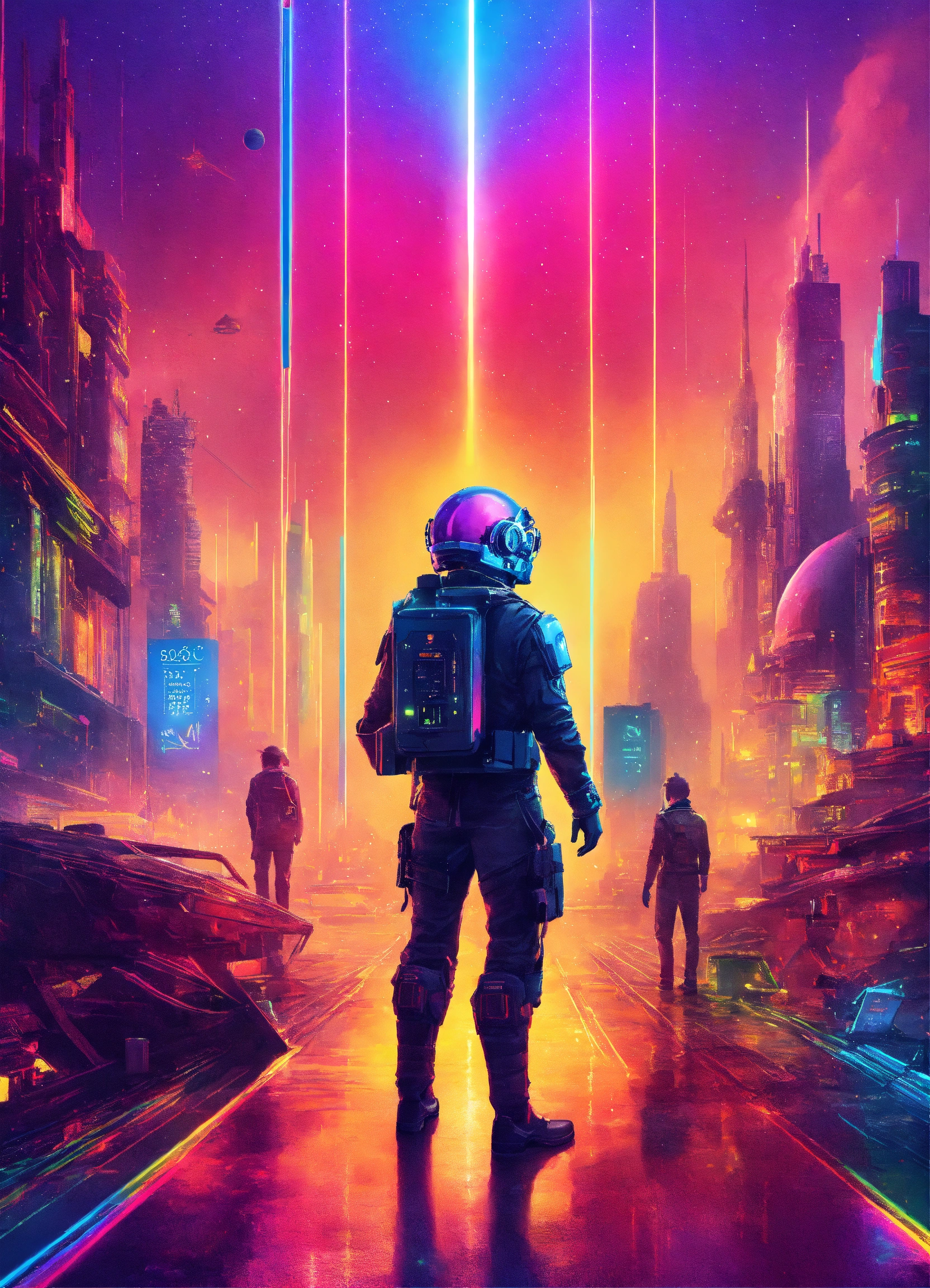 Design a captivating book cover in a futurepunk style that portrays the future of work, the cover should have a sci-fi ambiance with rainbow spectrum that create an otherworldly feeling, the cover should be in 8k quality and the dimensions should be 100cm by 100cm, let your creativity shine and create a visually stunning representation of the future of work