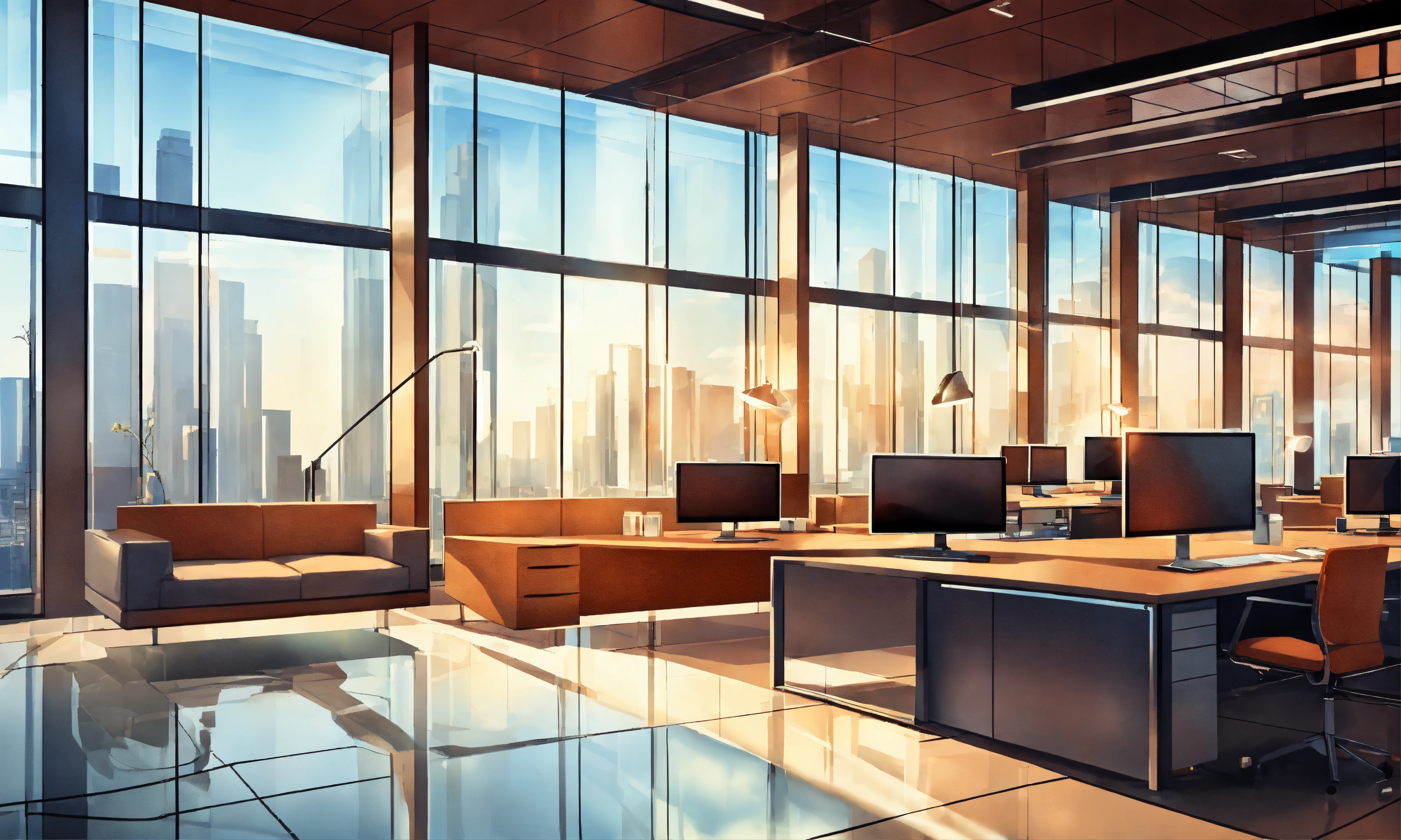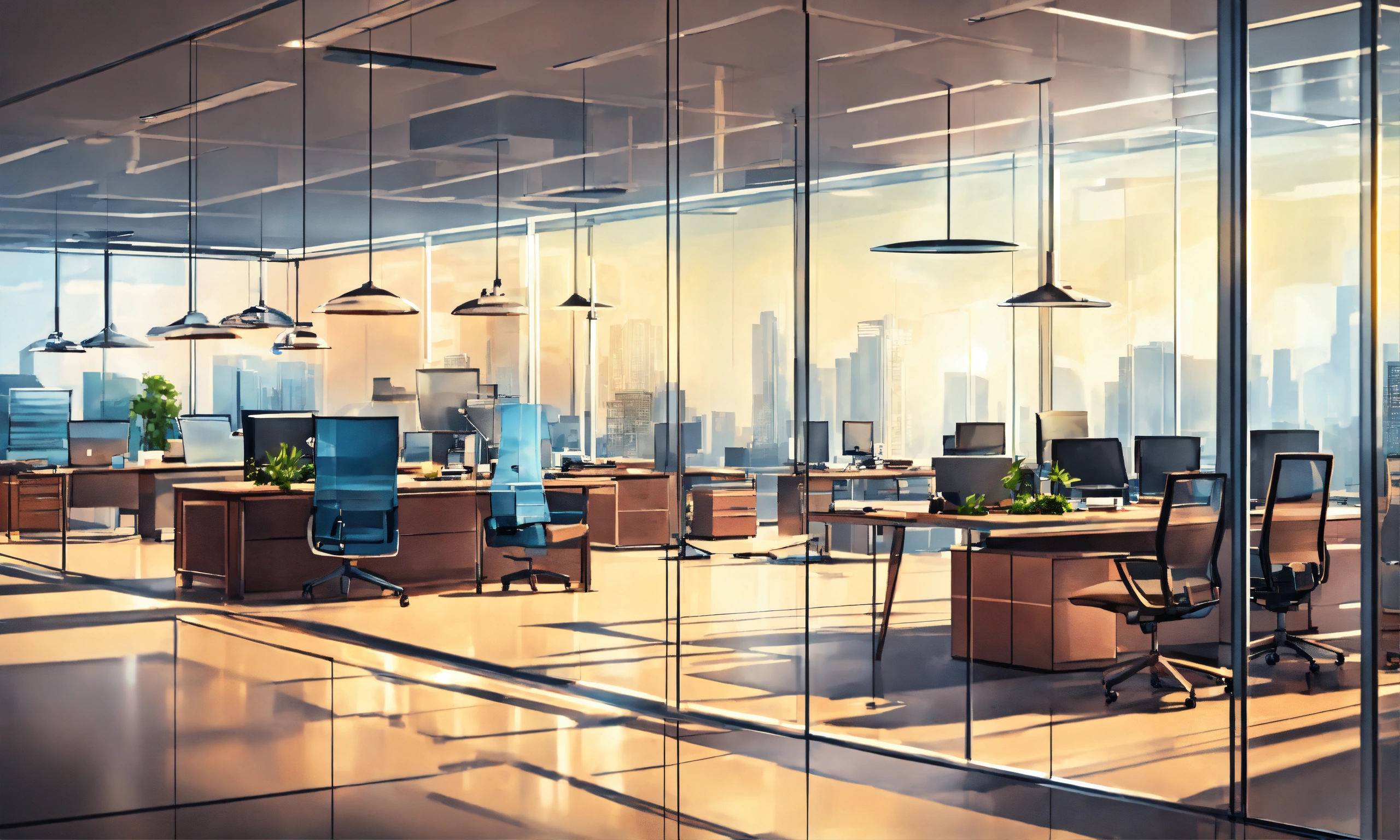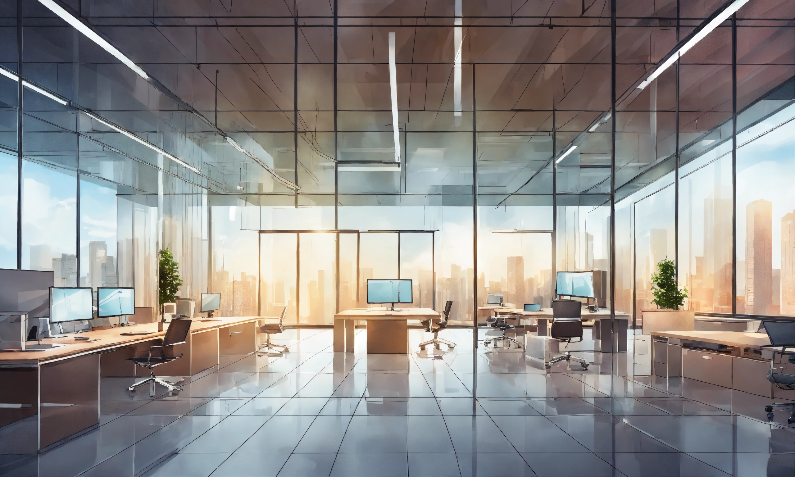 Create an illustration of empty modern corporate office background with glass walls and modern infrastructure and furniture