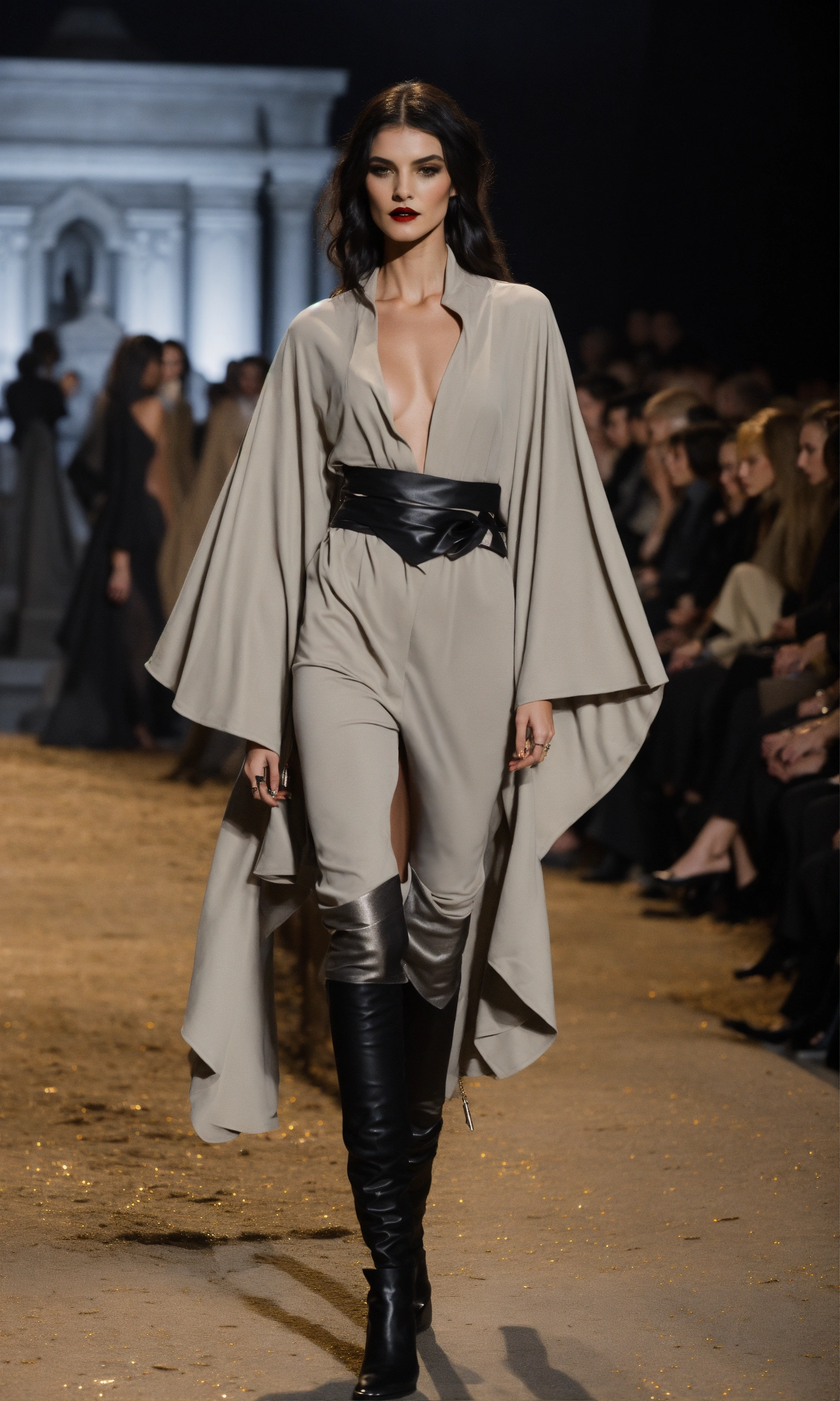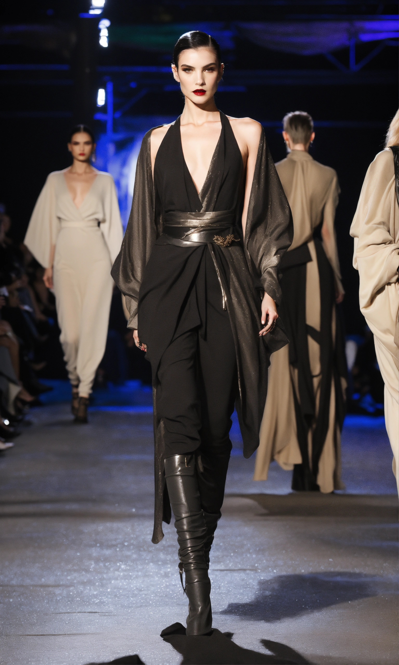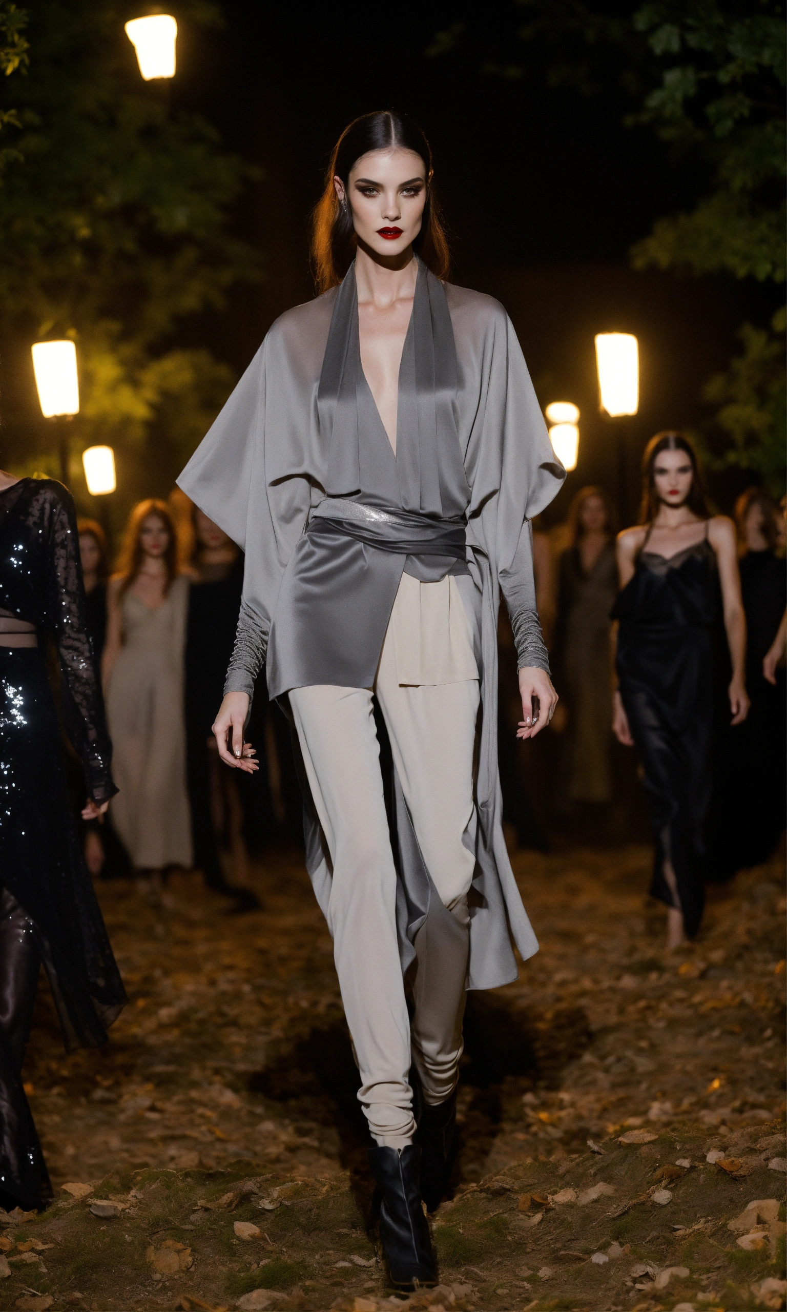 Lothlorien androgynous vampires walking runway during vamp fashion week wearing dolman sleeve dark donna karan fashion in black, white, grey, beige, stone, metallics, shimmer at a cemetery runway at bright nighttime
