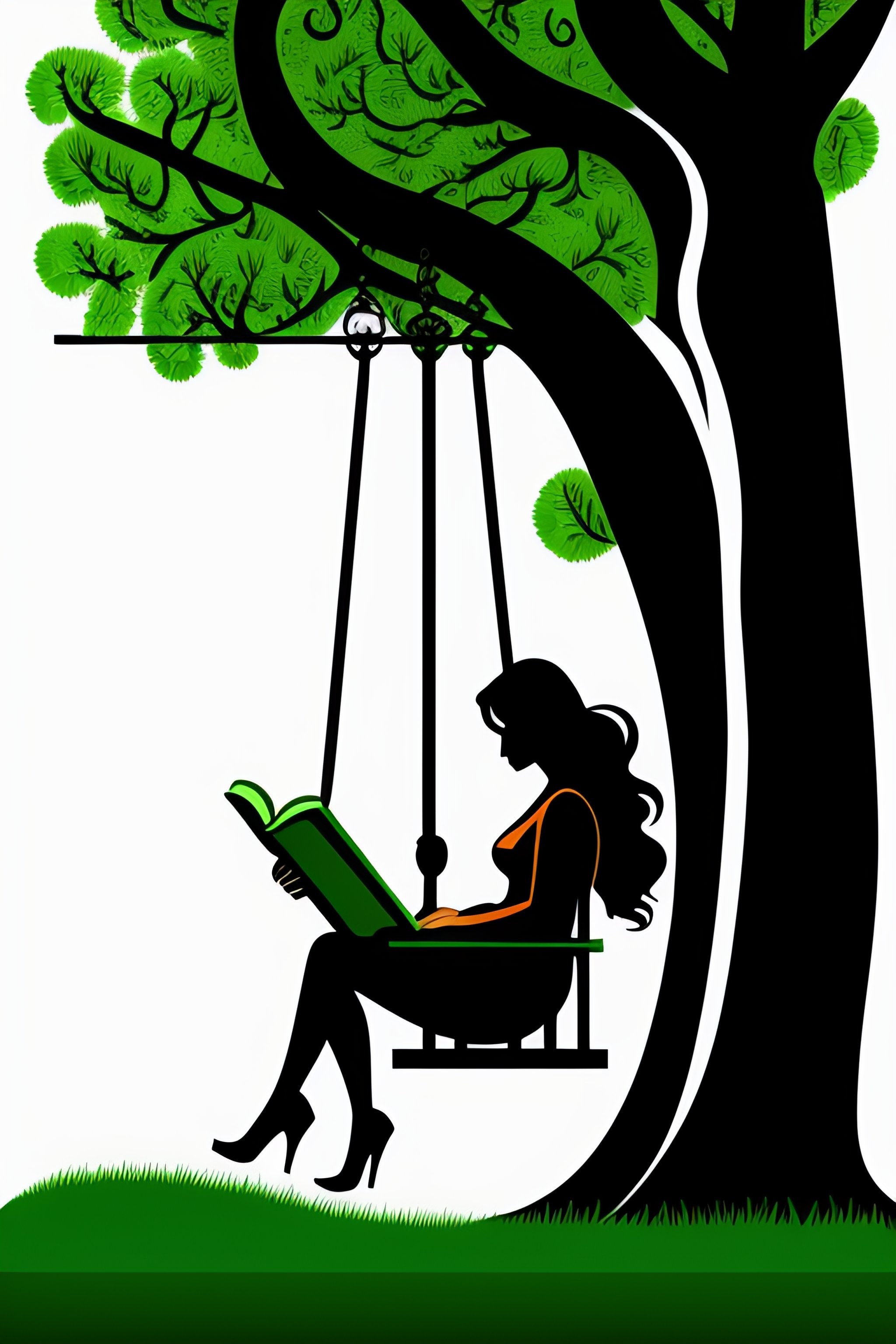Simple vector line drawing, outline of a woman sitting on a swing reading a book, clean vector daytime, tree, illustration, 6 colors