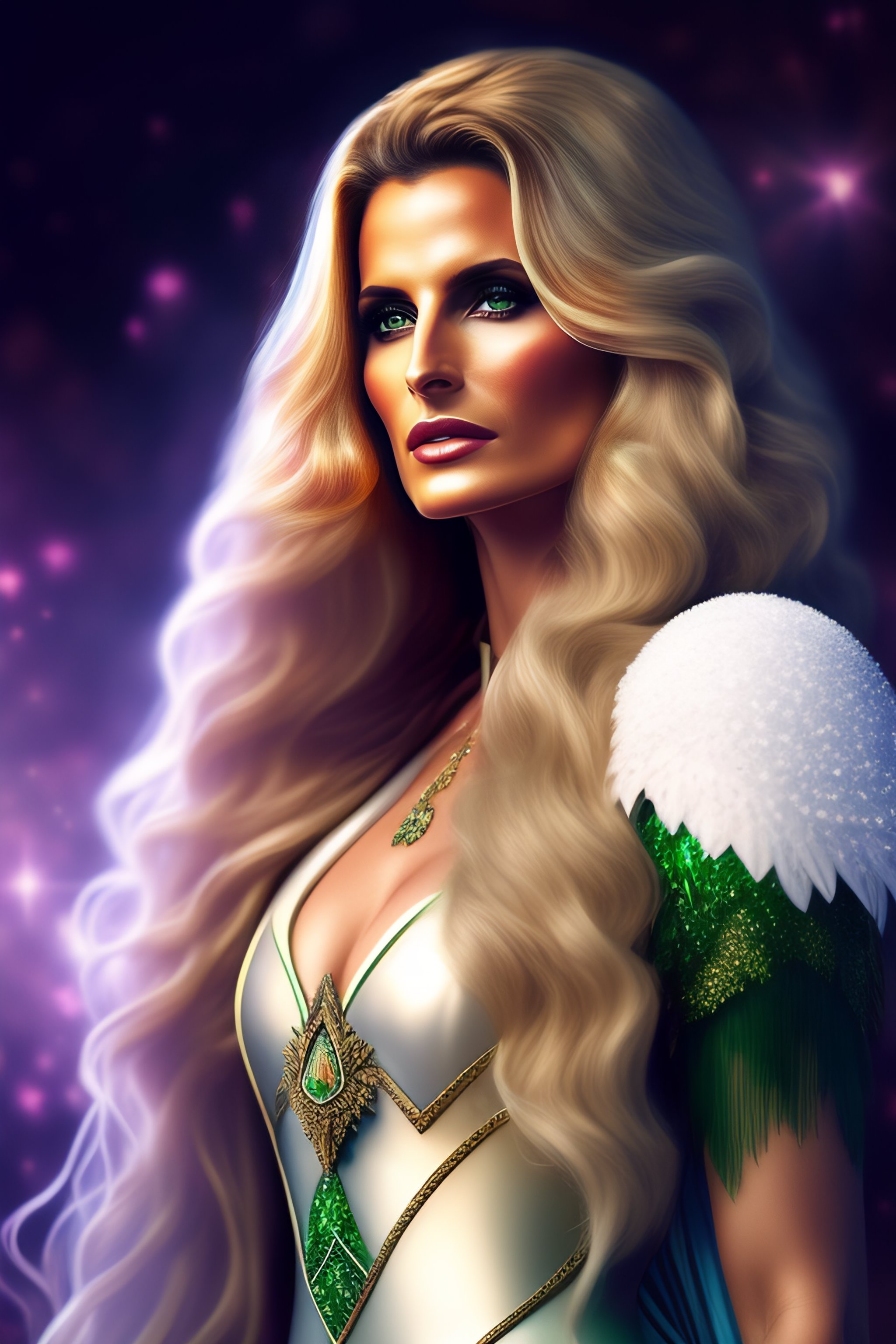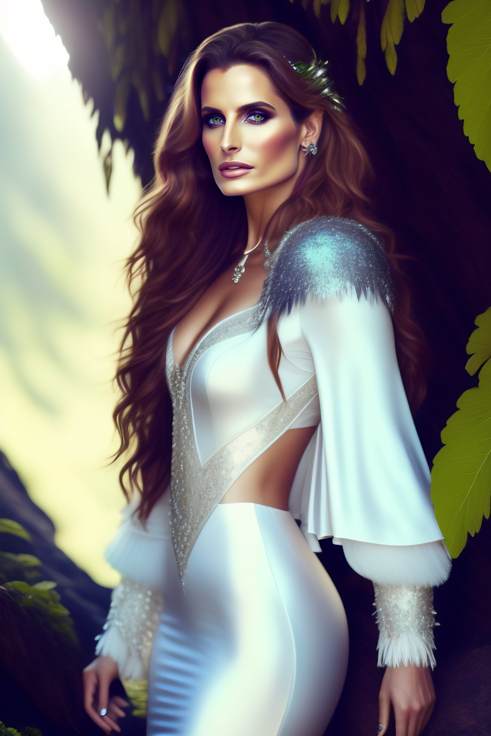 Stana katic, fairy queen, full body portrait, high fantasy style, 6 feet tall, long white hair flowing down her back, green eyes, very pale skin, lips the color of frozen mulberries, tight white miniskirt dress, high heels, long legs, triumphant, towering over a fallen foe
