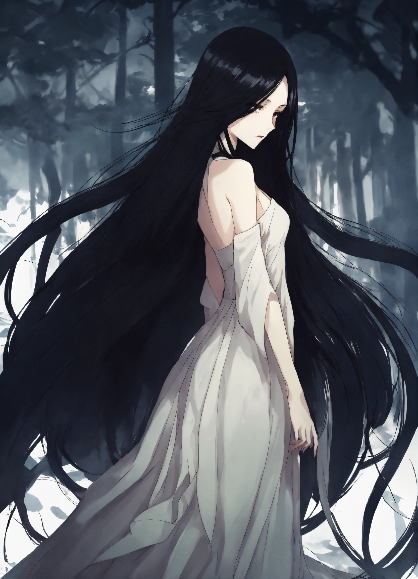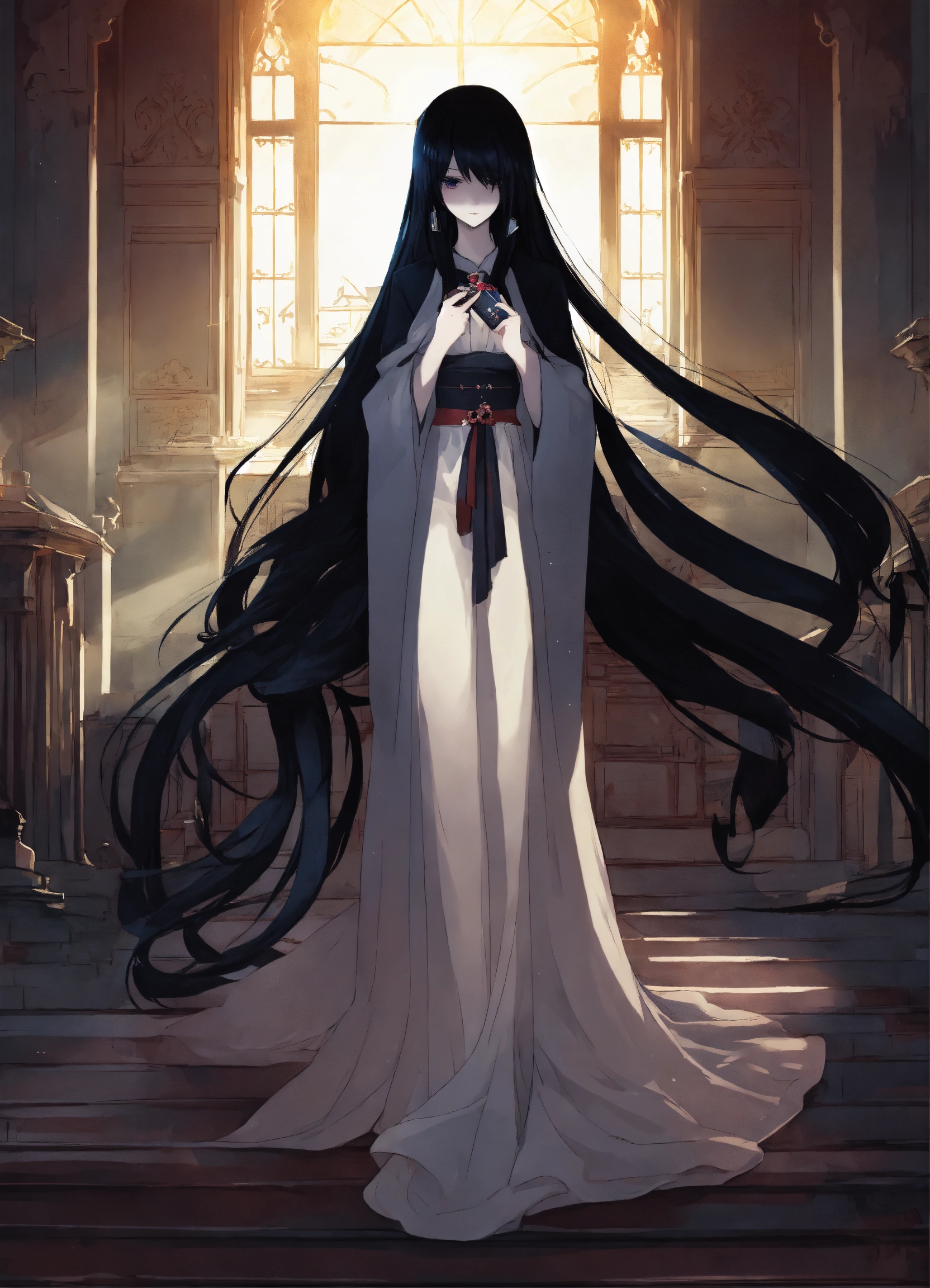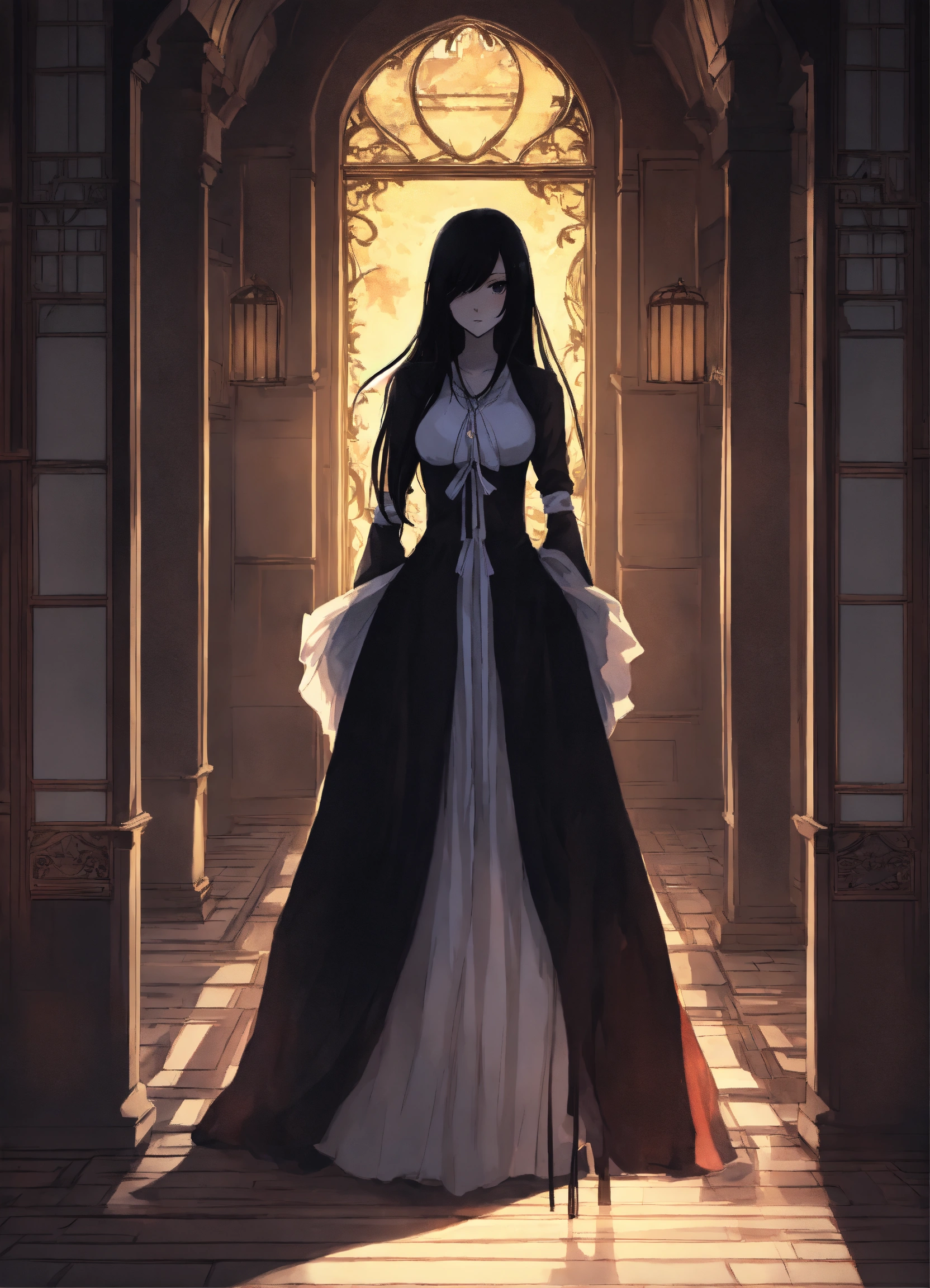 2d epic anime manga style, evil woman, faceless persona, long dress, long black hair, white pale skin, in the shadows