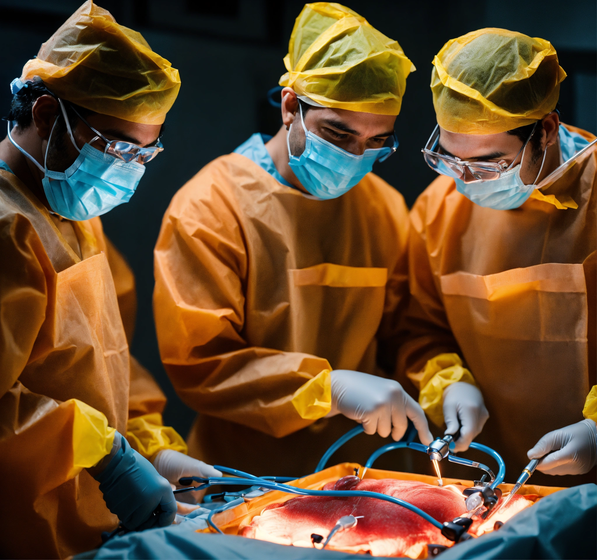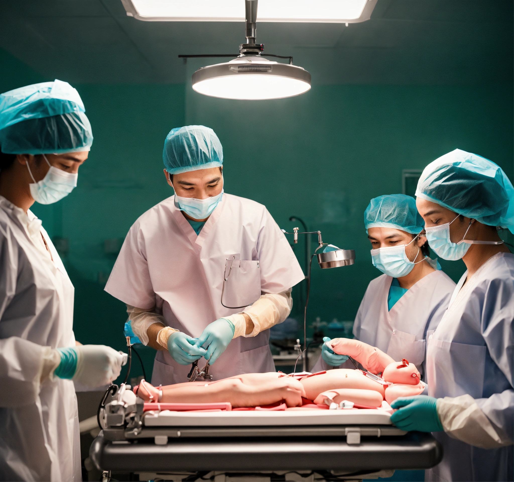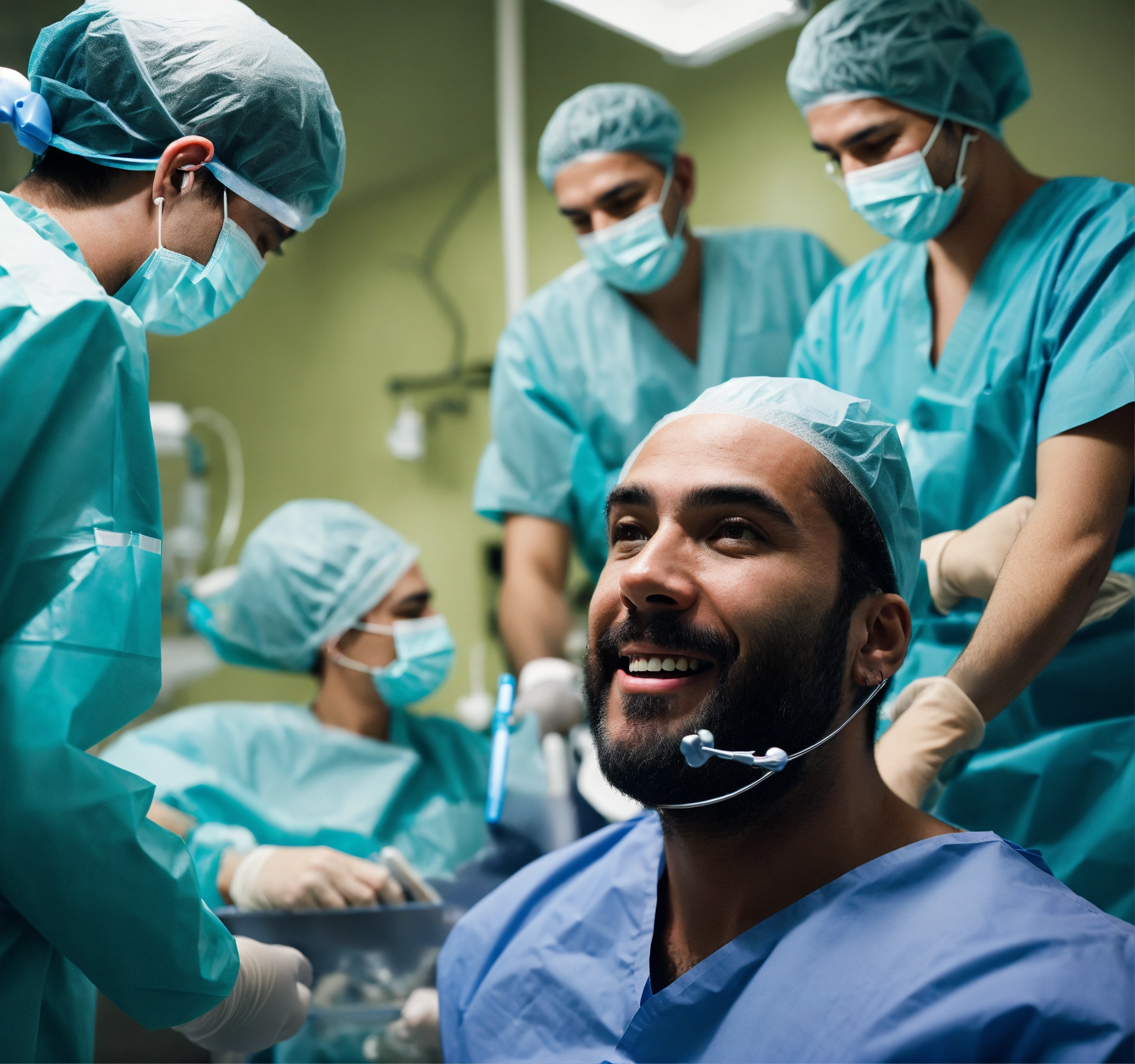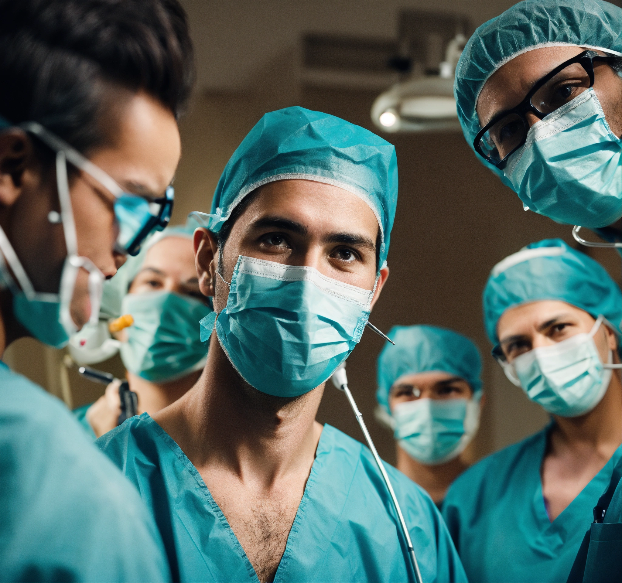 A surgeon and his team made an operation, still shot, side angle, joyful expression, highly detailed, intricate details